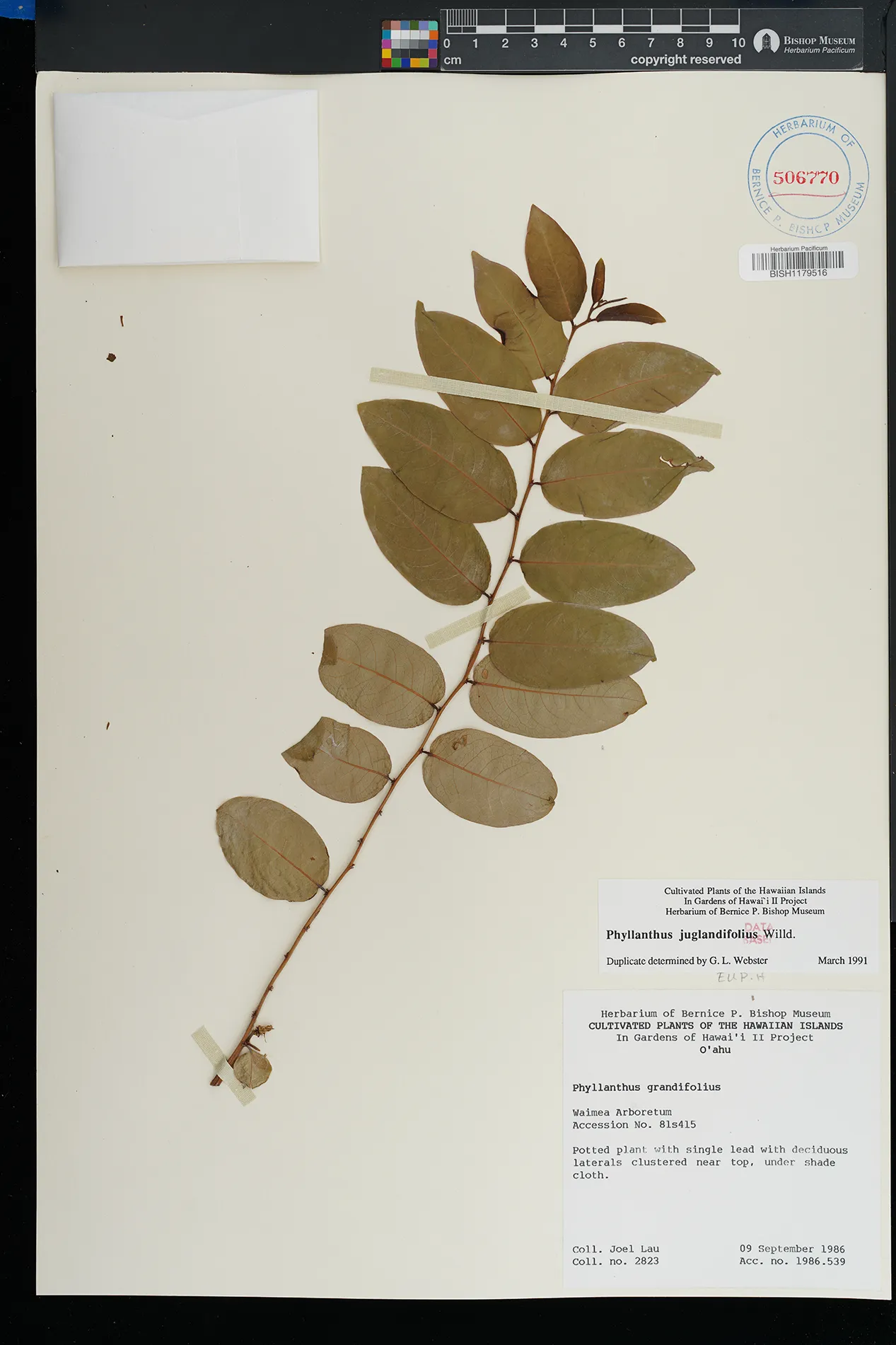 | 5 | Phyllanthus juglandifolius | Waimea Arboretum | potted, under shade cloth | Preserved_Specimen | with single lead with deciduous laterals clustered near top | Lau, J. | 2823 | Oahu | BISH | 1986-09-09 |