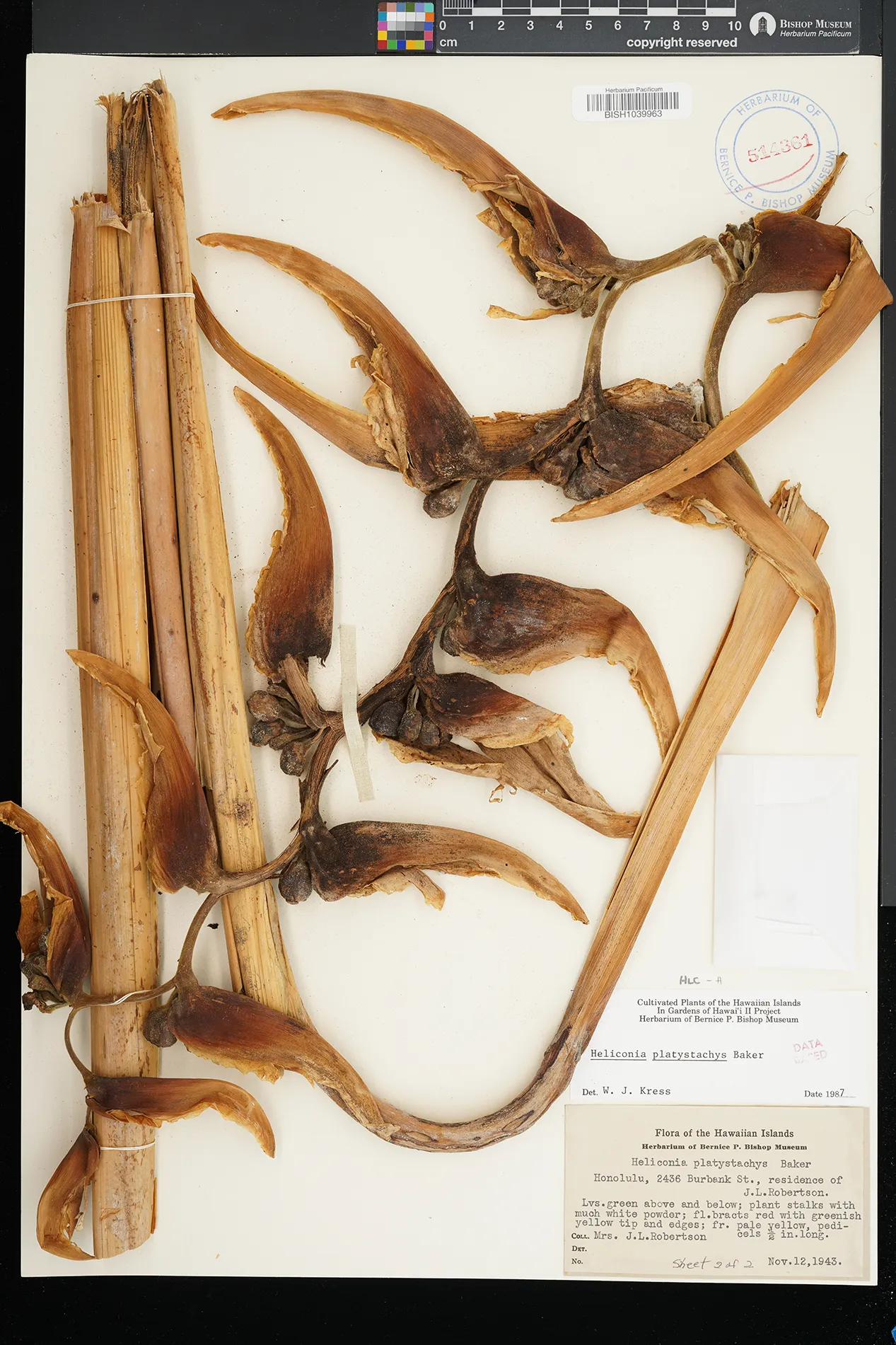 | 2 | Heliconia platystachys | Honolulu, 2436 Burbank St, residence of J. L. Robertson | Preserved_Specimen | Lvs grn above 7 below; plant stalks w. much white powder; fl bracts red 2. greenish yellow tip & edges; fr pale yellow, pedicels .5 in long. | Robertson, Mrs.J.L. | Oahu | BISH | 1943-11-12 | ||