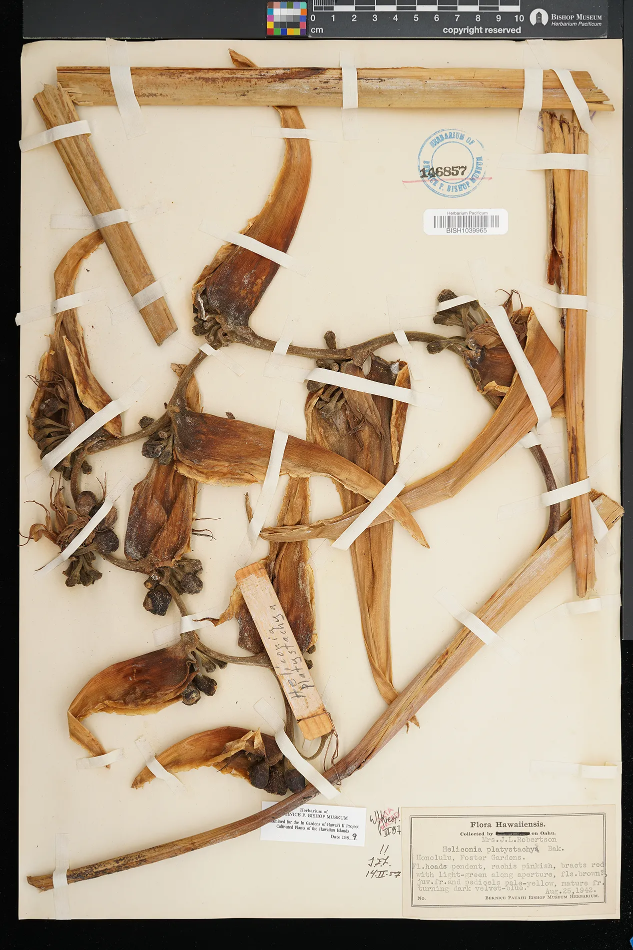 | 3 | Heliconia platystachys | Honolulu, 2436 Burbank St, residence of J. L. Robertson | Preserved_Specimen | Lvs grn above 7 below; plant stalks w. much white powder; fl bracts red 2. greenish yellow tip & edges; fr pale yellow, pedicels .5 in long. | Robertson, Mrs.J.L. | Oahu | BISH | 1943-11-12 |