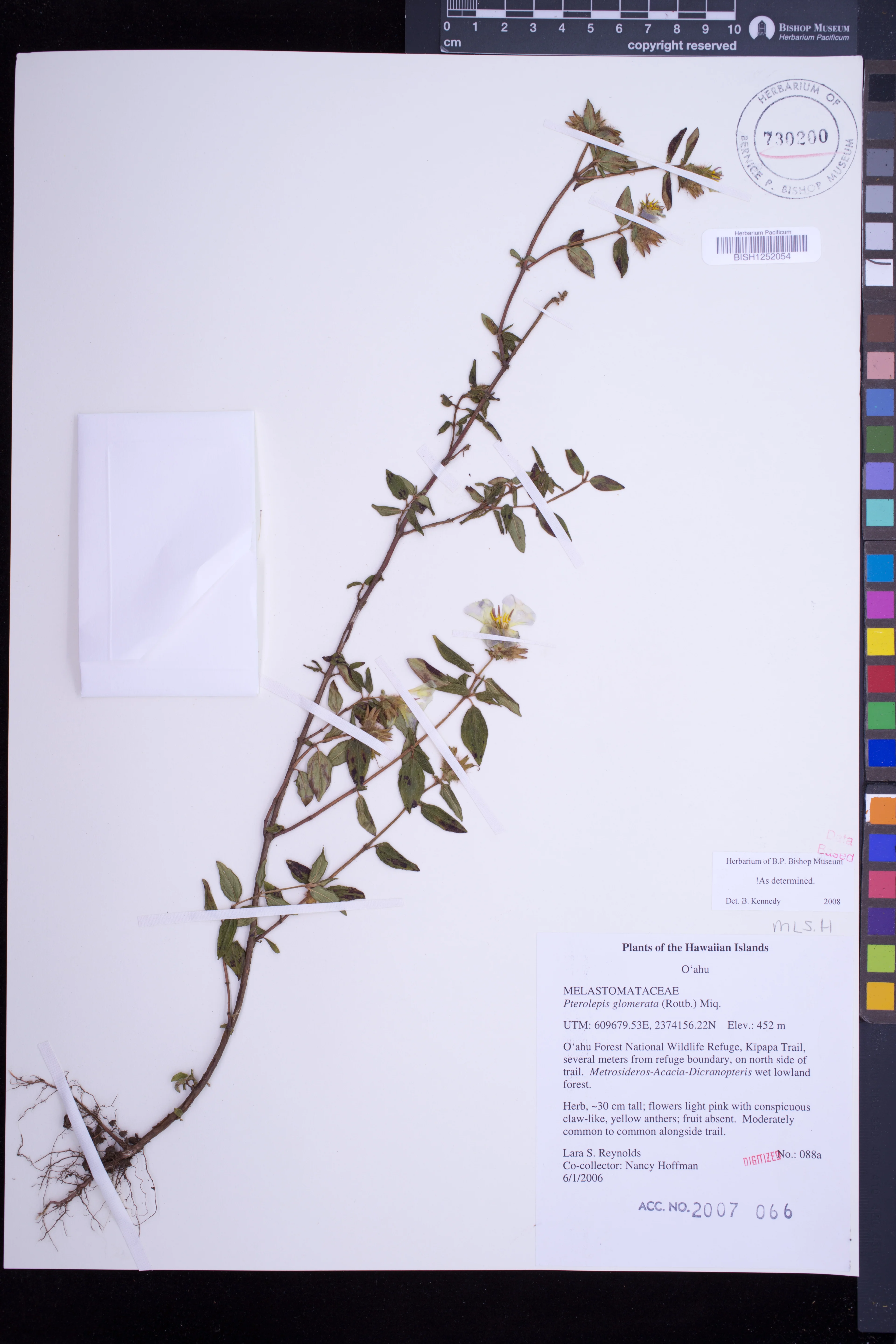 Observed along perennial stream. Vegetation: Metrosideros, Cheirodendron, Dicranopteris, Diplopterygium, Broussaisia, Clermontia, Kadua, Coprosma, Pipturus, Cibotium, Sadleria, Labordia, Dryopteris, Diplazium, Asplenium, Isachne, Deschampsia, Pilea, Peperomia, Blechnum, Adiantum, Selaginella, Psidium, Clidemia, Tibouchina, Rubus, Axonopus, Sacciolepis, Hedychium, Paspalum. |