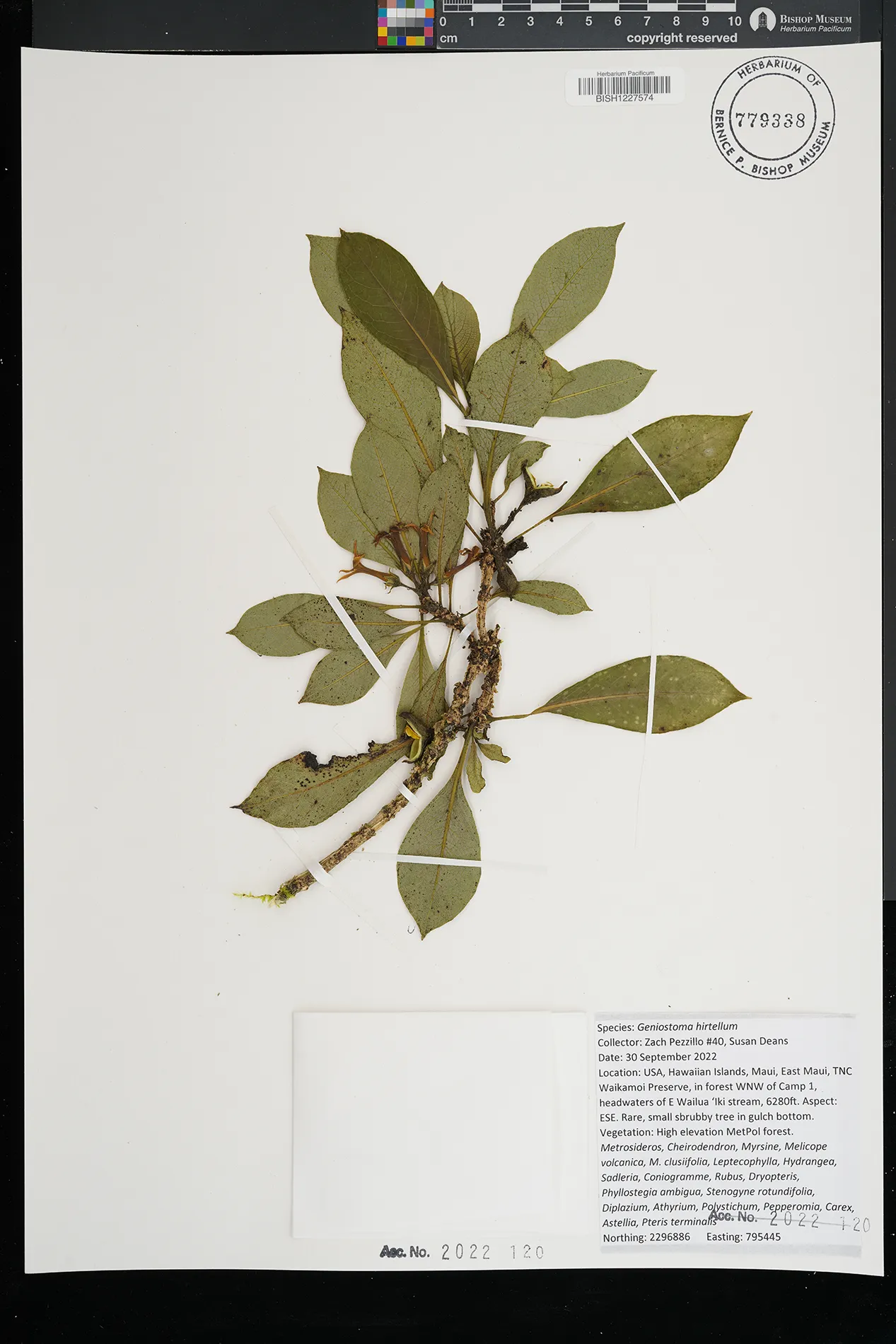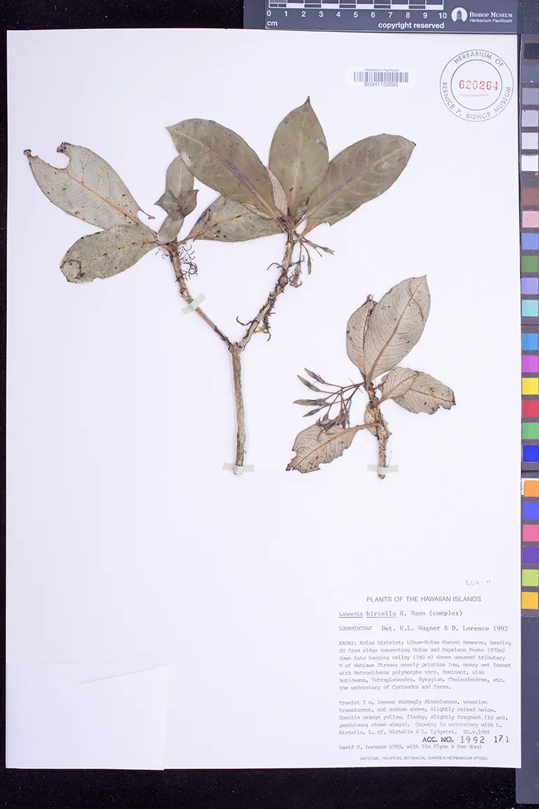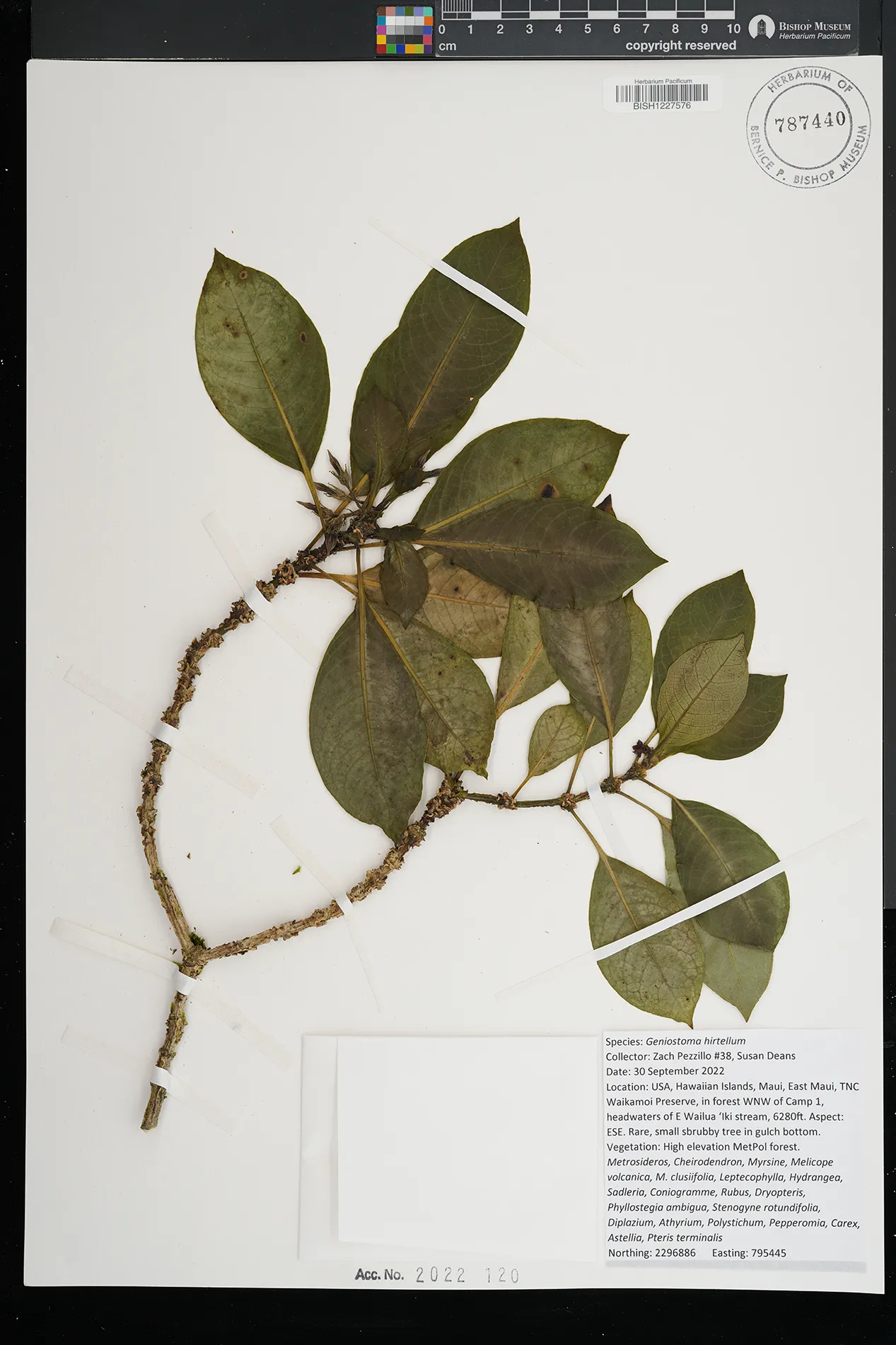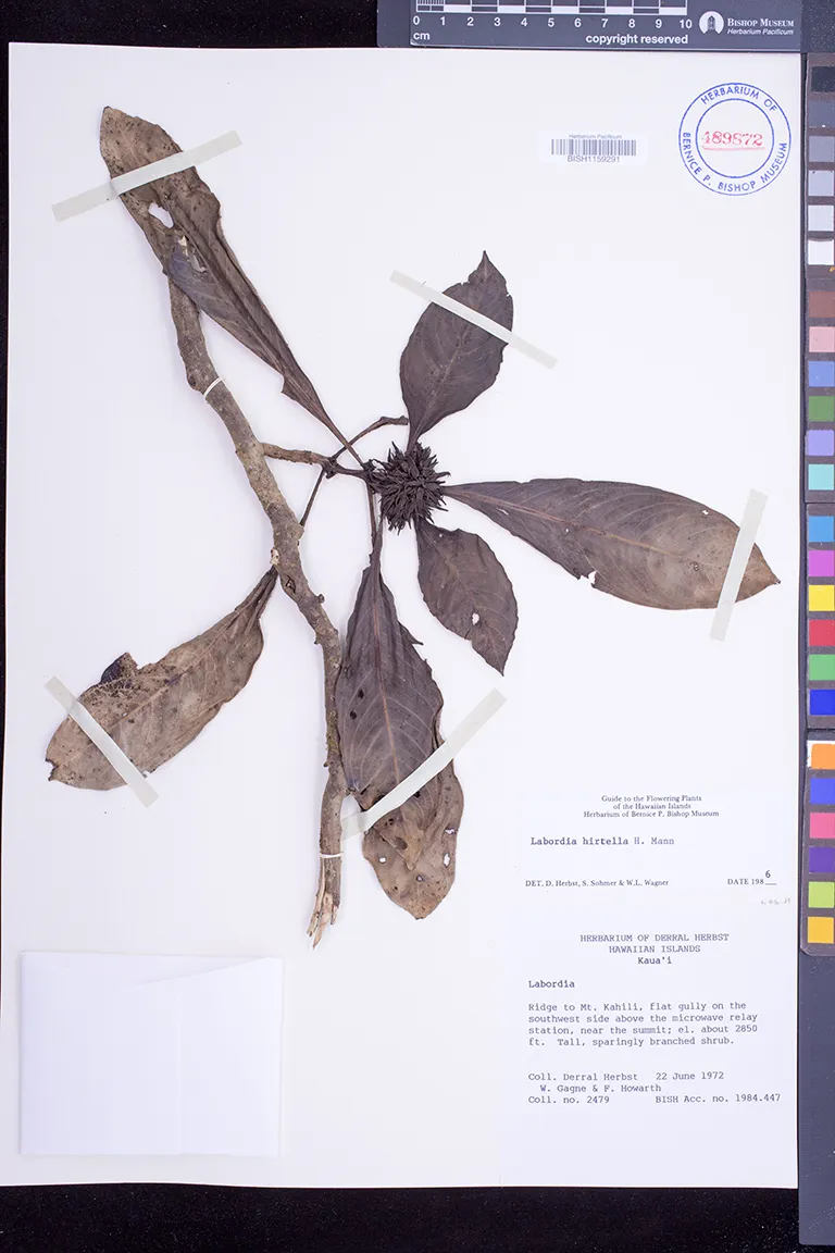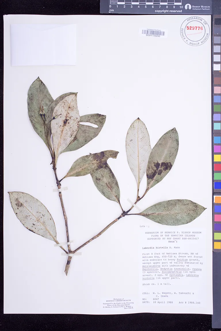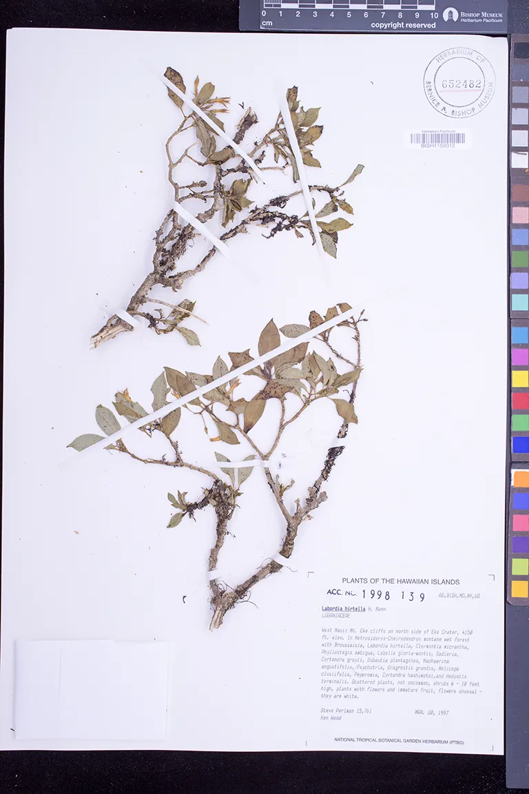 In Metrosideros-Cheirodendron montane wet forest with Broussaisia, Labordia hirtella, Clermontia micrantha, Phyllostegia ambigua, Lobelia gloria-montis, Sadleria, Cyrtandra grayi, Dubautia plantaginea, Machaerina angustifolia, Psychotria, Eragrostis grandis, Melicope |