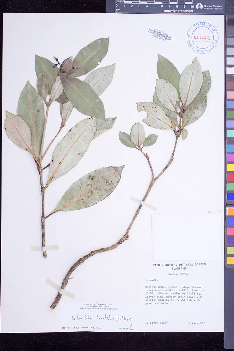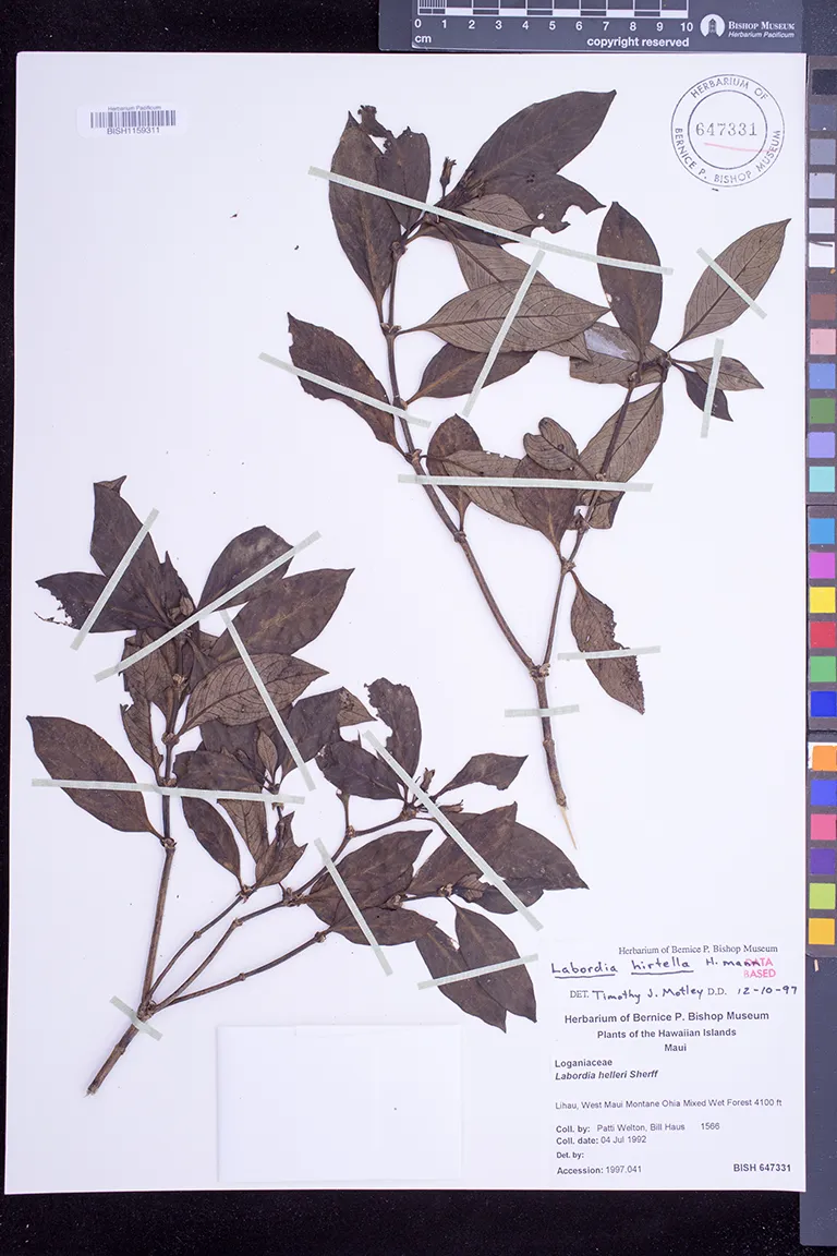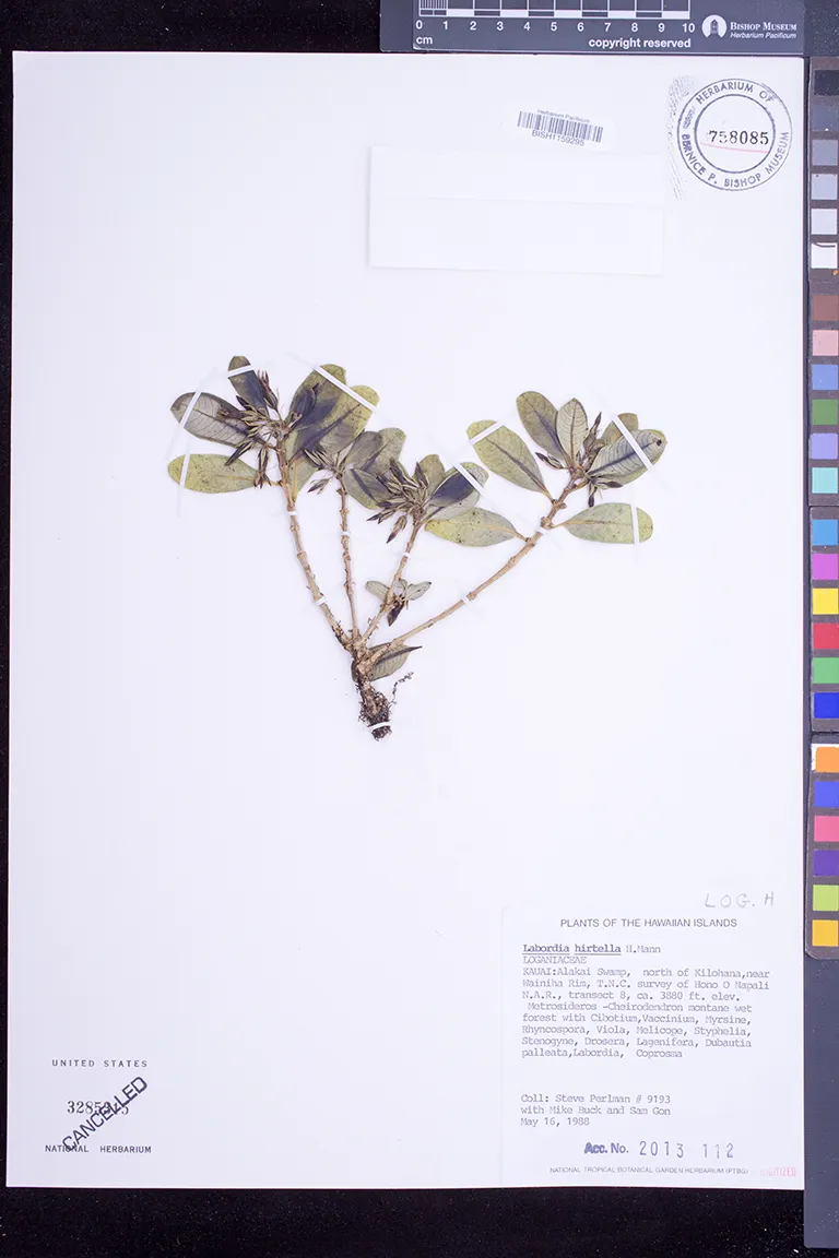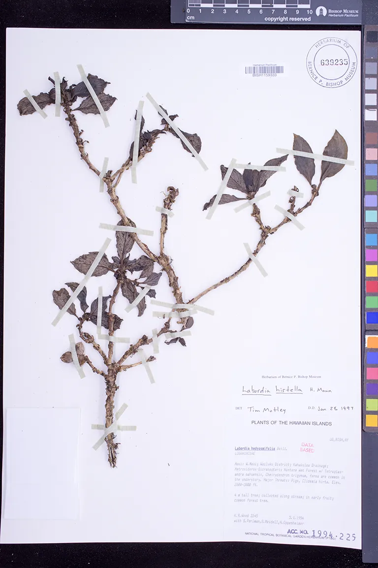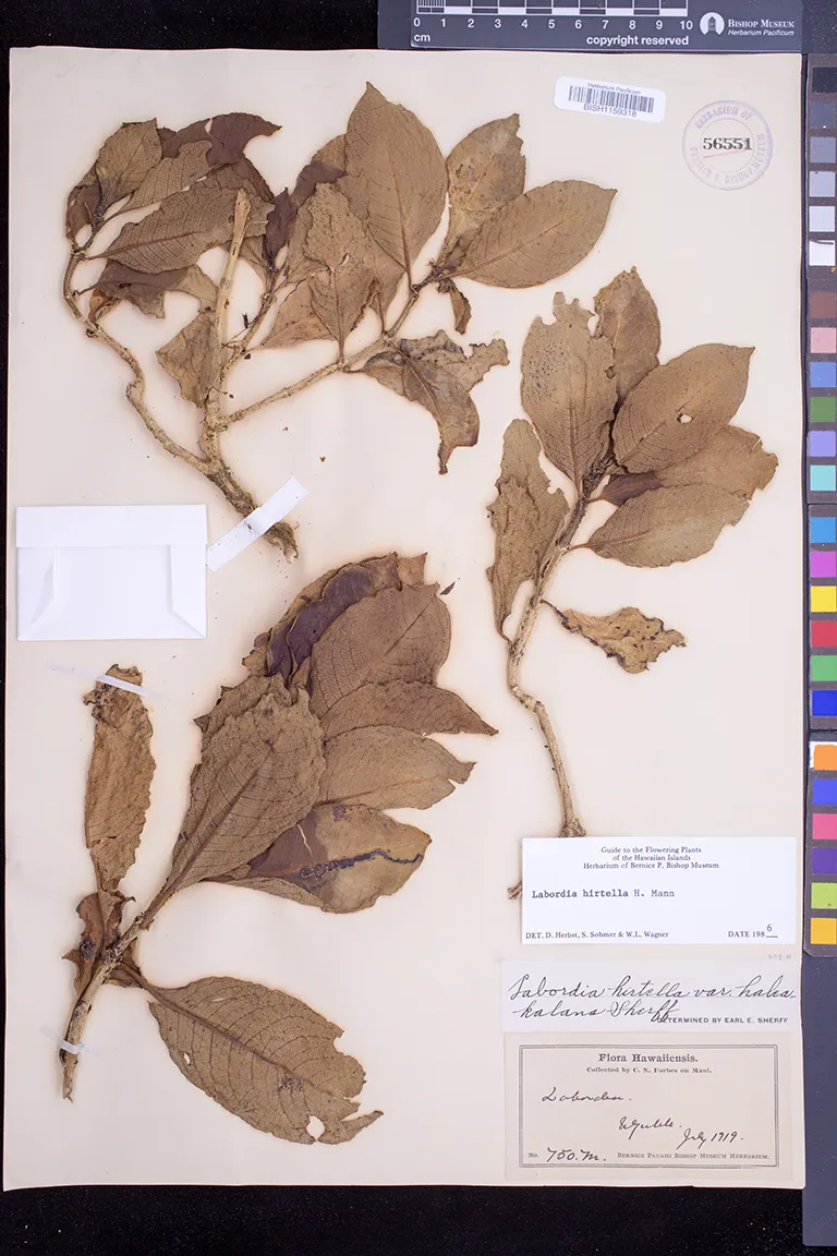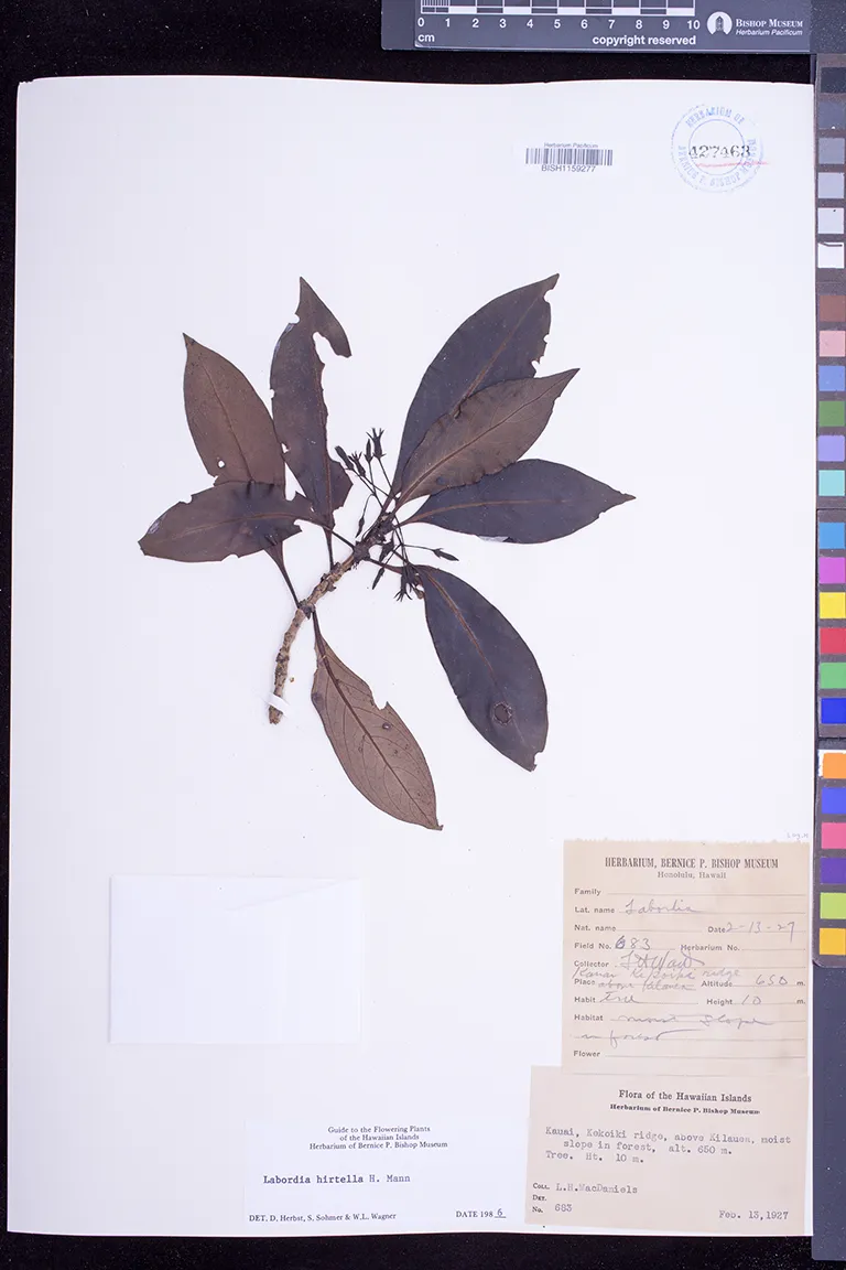 In Metrosideros-Cheirodendron montane wet forest with Broussaisia, Labordia hirtella, Clermontia micrantha, Phyllostegia ambigua, Lobelia gloria-montis, Sadleria, Cyrtandra grayi, Dubautia plantaginea, Machaerina angustifolia, Psychotria, Eragrostis grandis, Melicope |
