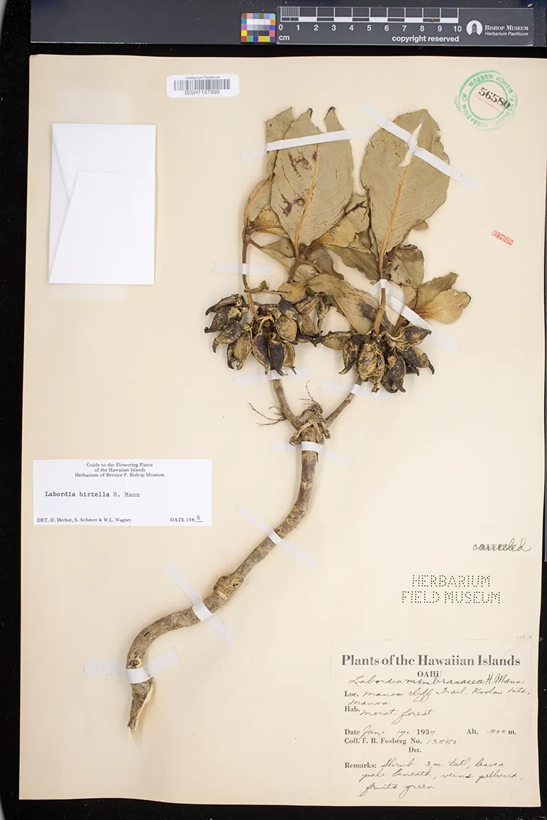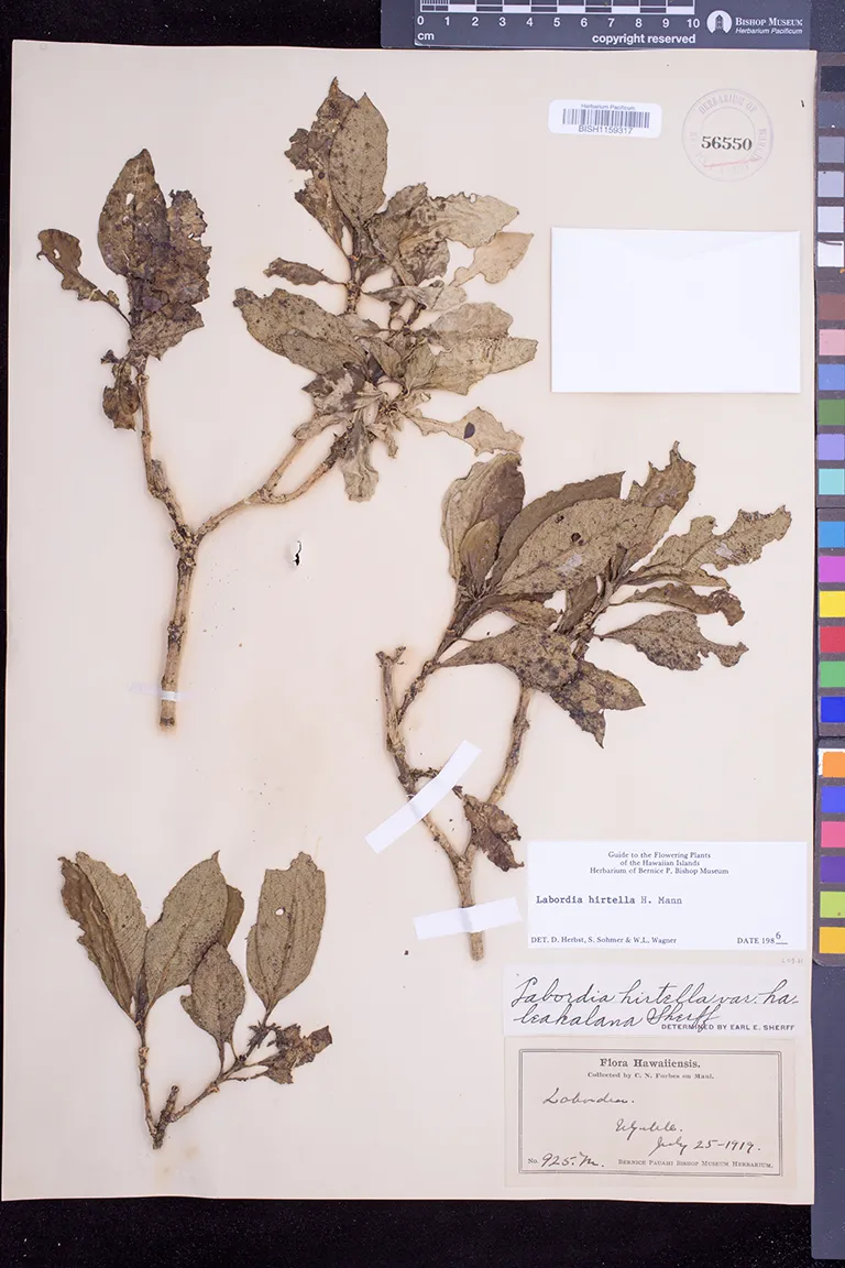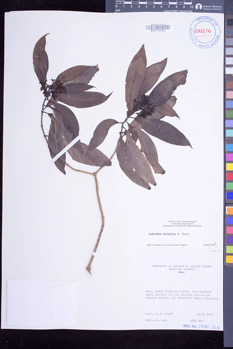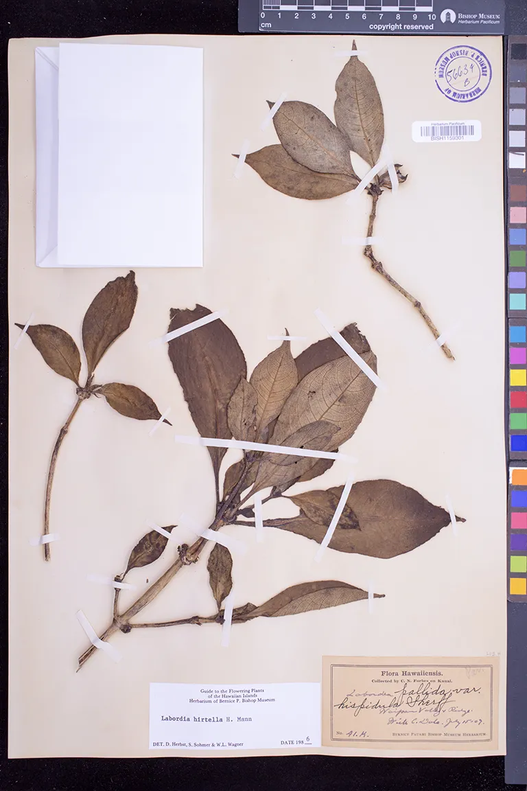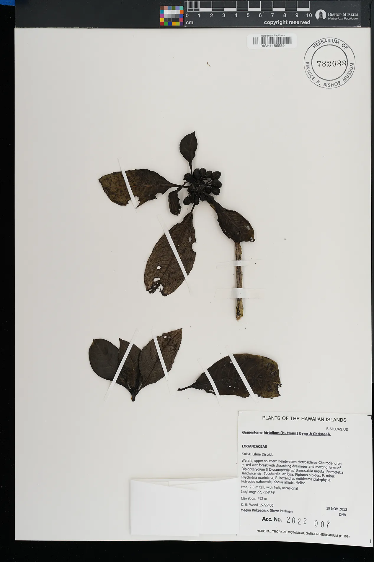 In Metrosideros-Cheirodendron montane wet forest with Broussaisia, Labordia hirtella, Clermontia micrantha, Phyllostegia ambigua, Lobelia gloria-montis, Sadleria, Cyrtandra grayi, Dubautia plantaginea, Machaerina angustifolia, Psychotria, Eragrostis grandis, Melicope |