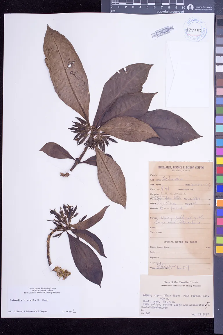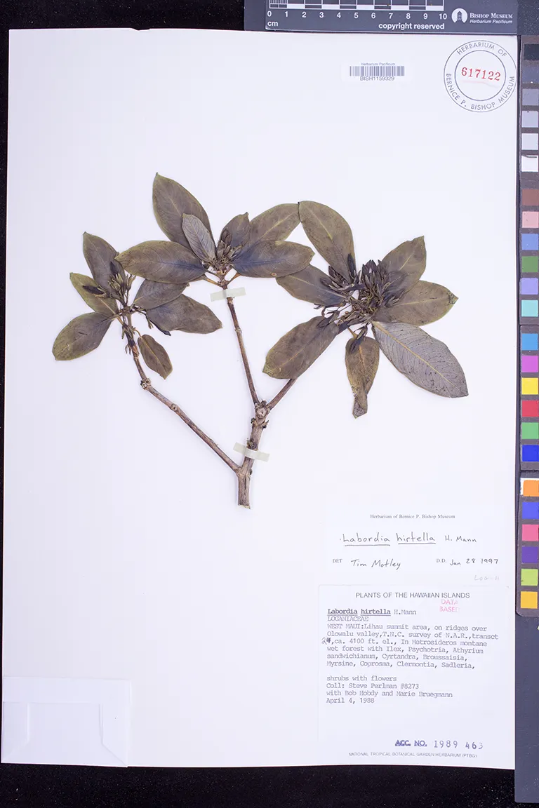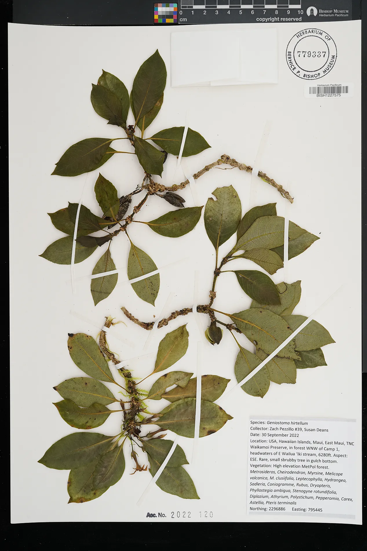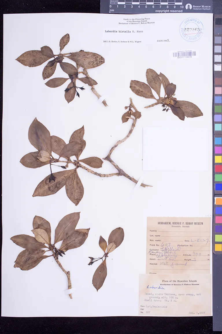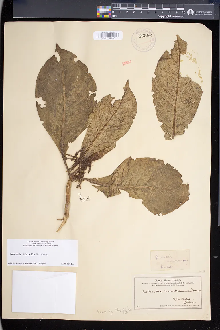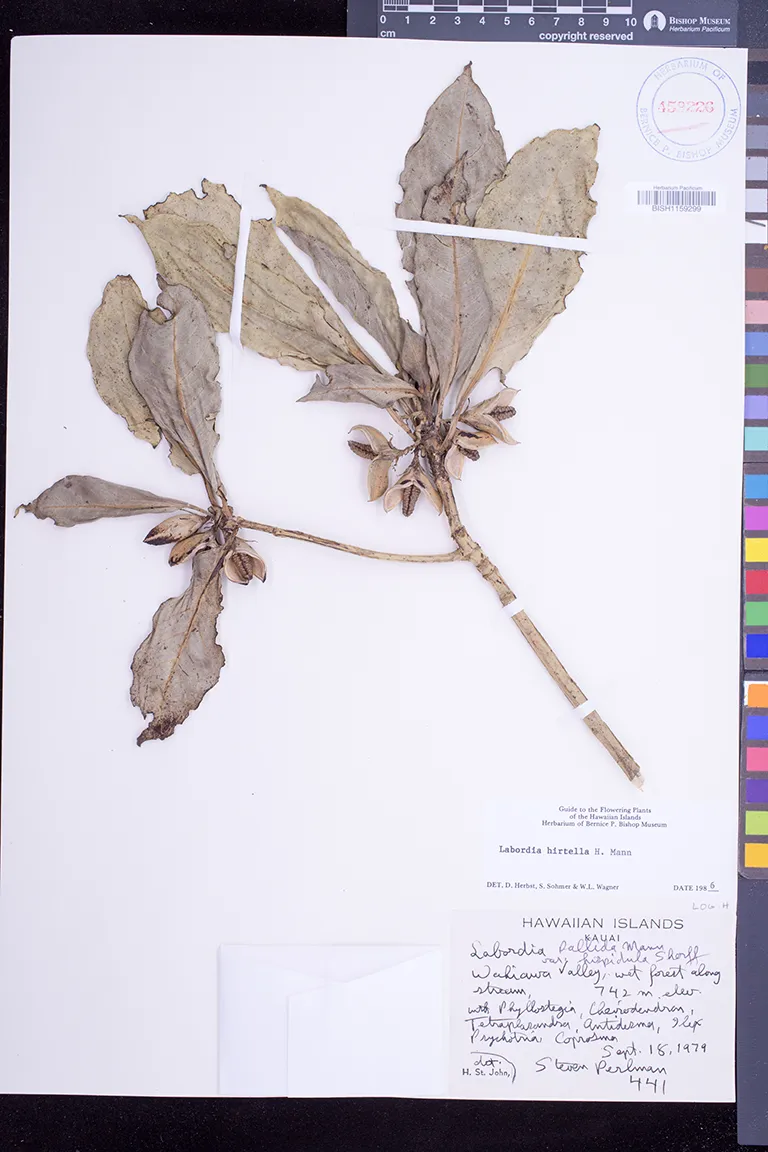 In Metrosideros-Cheirodendron montane wet forest with Broussaisia, Labordia hirtella, Clermontia micrantha, Phyllostegia ambigua, Lobelia gloria-montis, Sadleria, Cyrtandra grayi, Dubautia plantaginea, Machaerina angustifolia, Psychotria, Eragrostis grandis, Melicope |