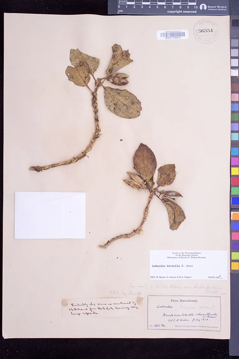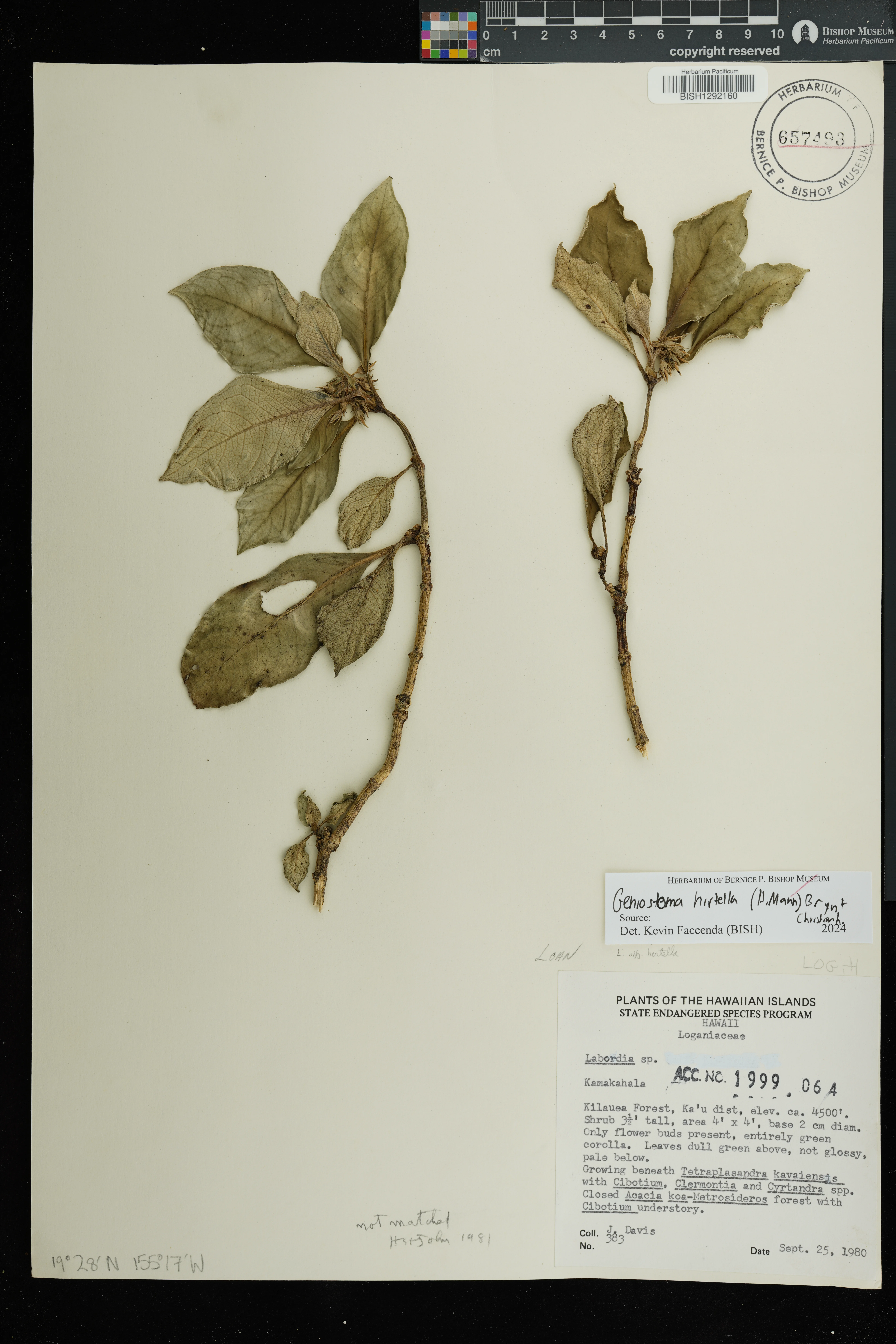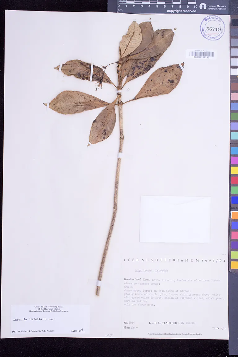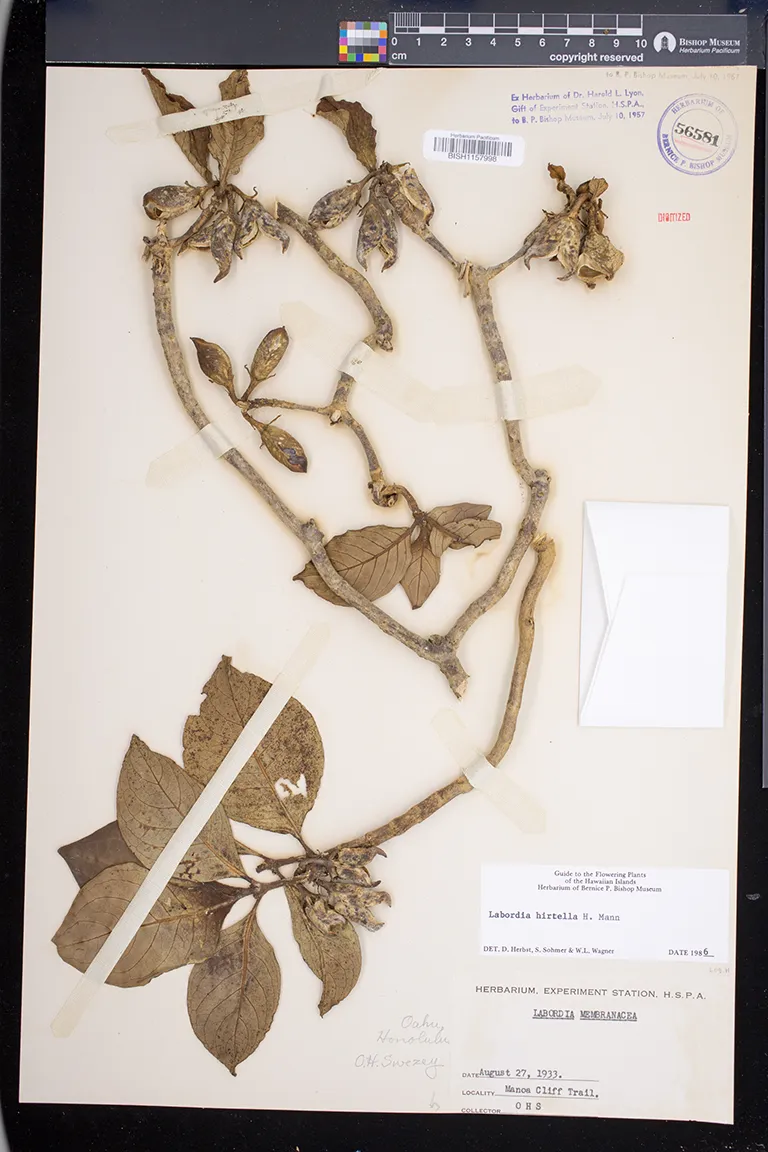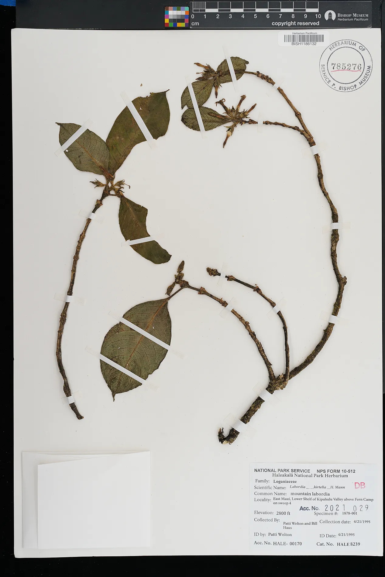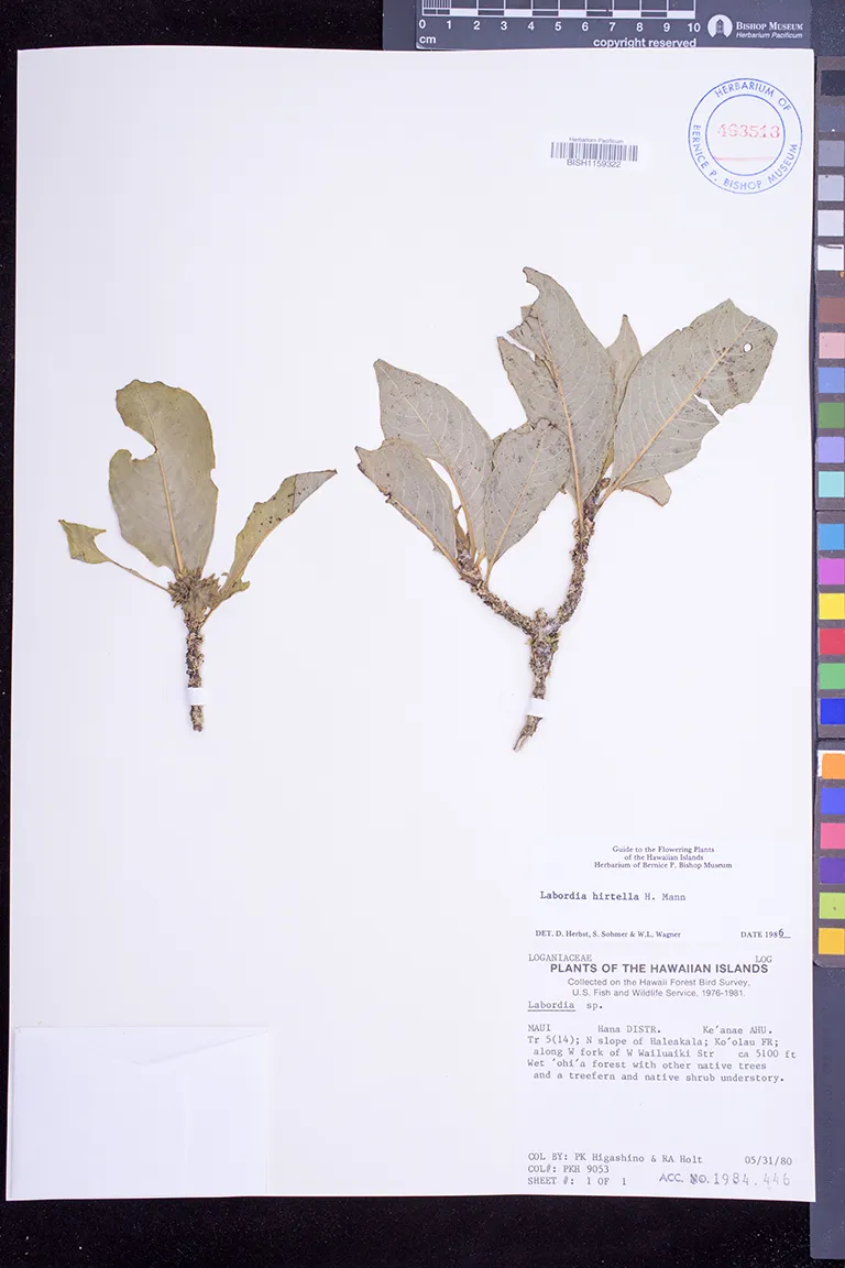 In Metrosideros-Cheirodendron montane wet forest with Broussaisia, Labordia hirtella, Clermontia micrantha, Phyllostegia ambigua, Lobelia gloria-montis, Sadleria, Cyrtandra grayi, Dubautia plantaginea, Machaerina angustifolia, Psychotria, Eragrostis grandis, Melicope |