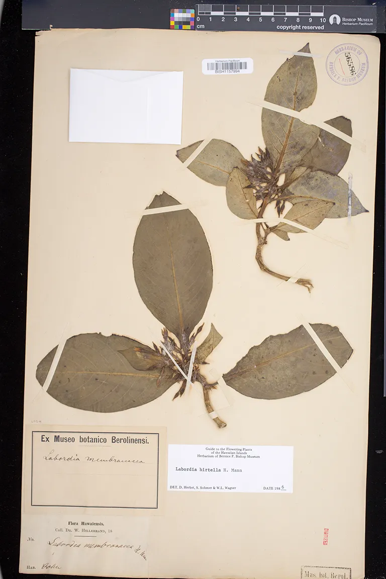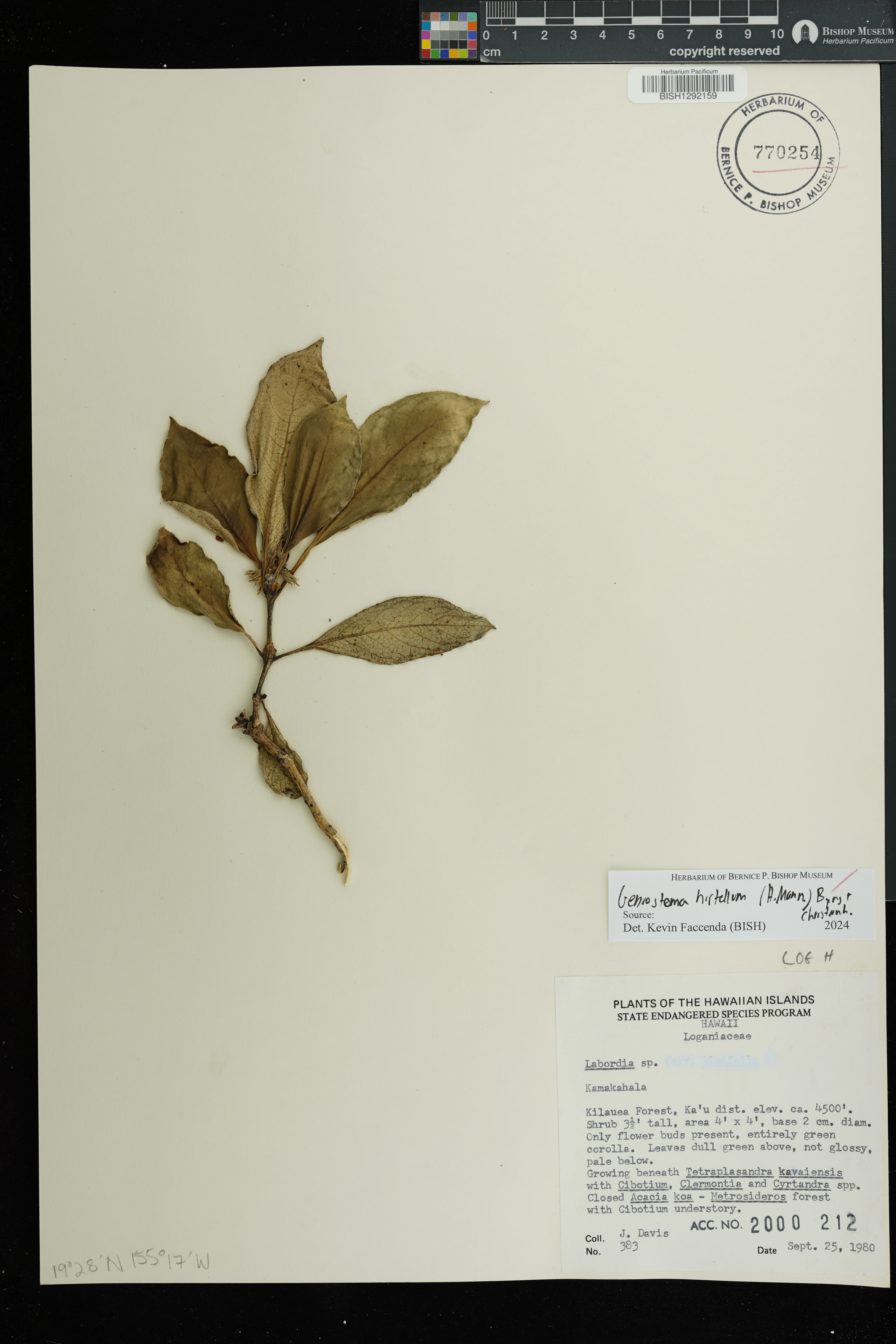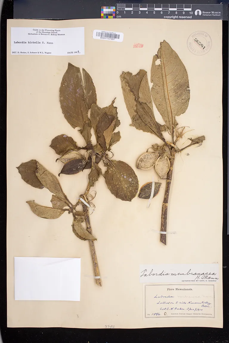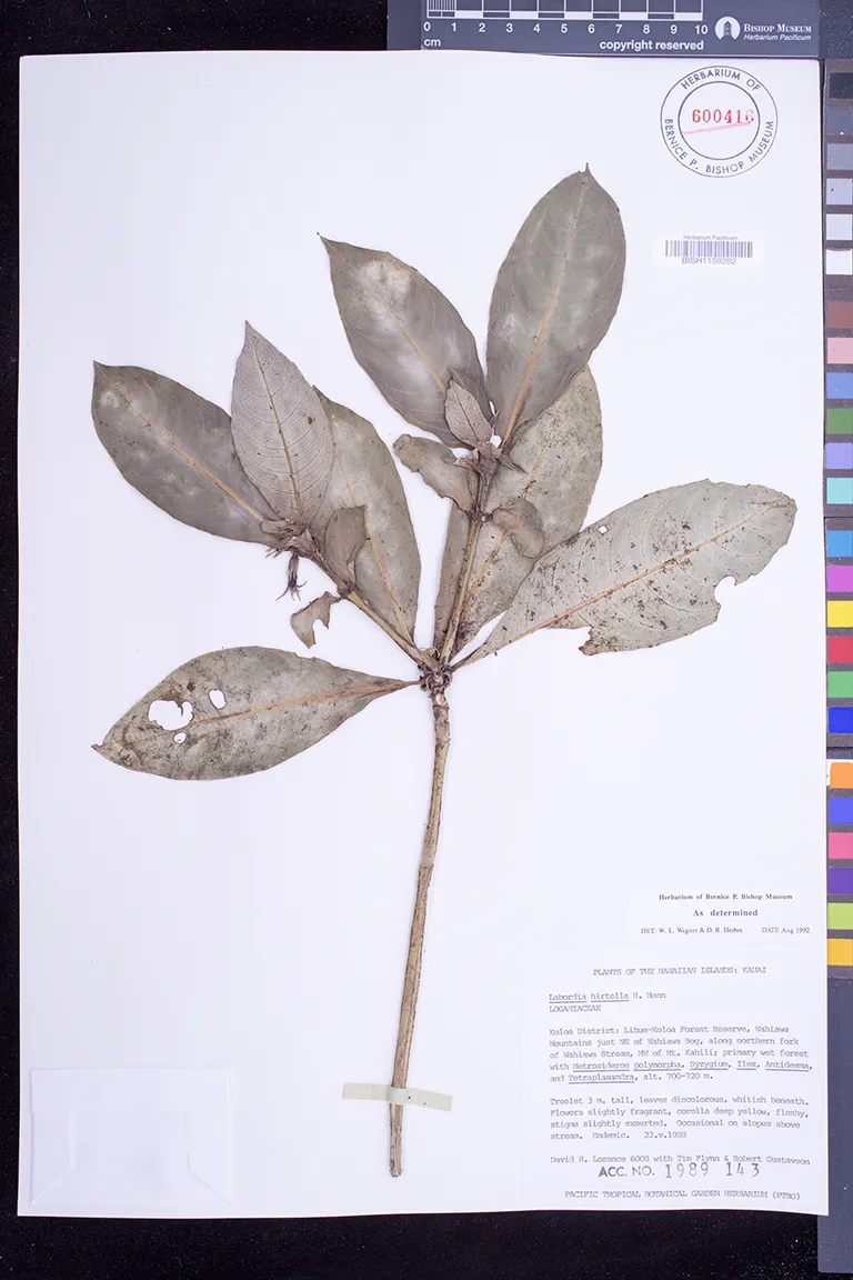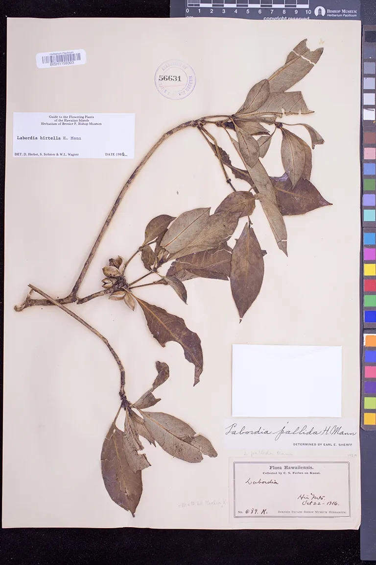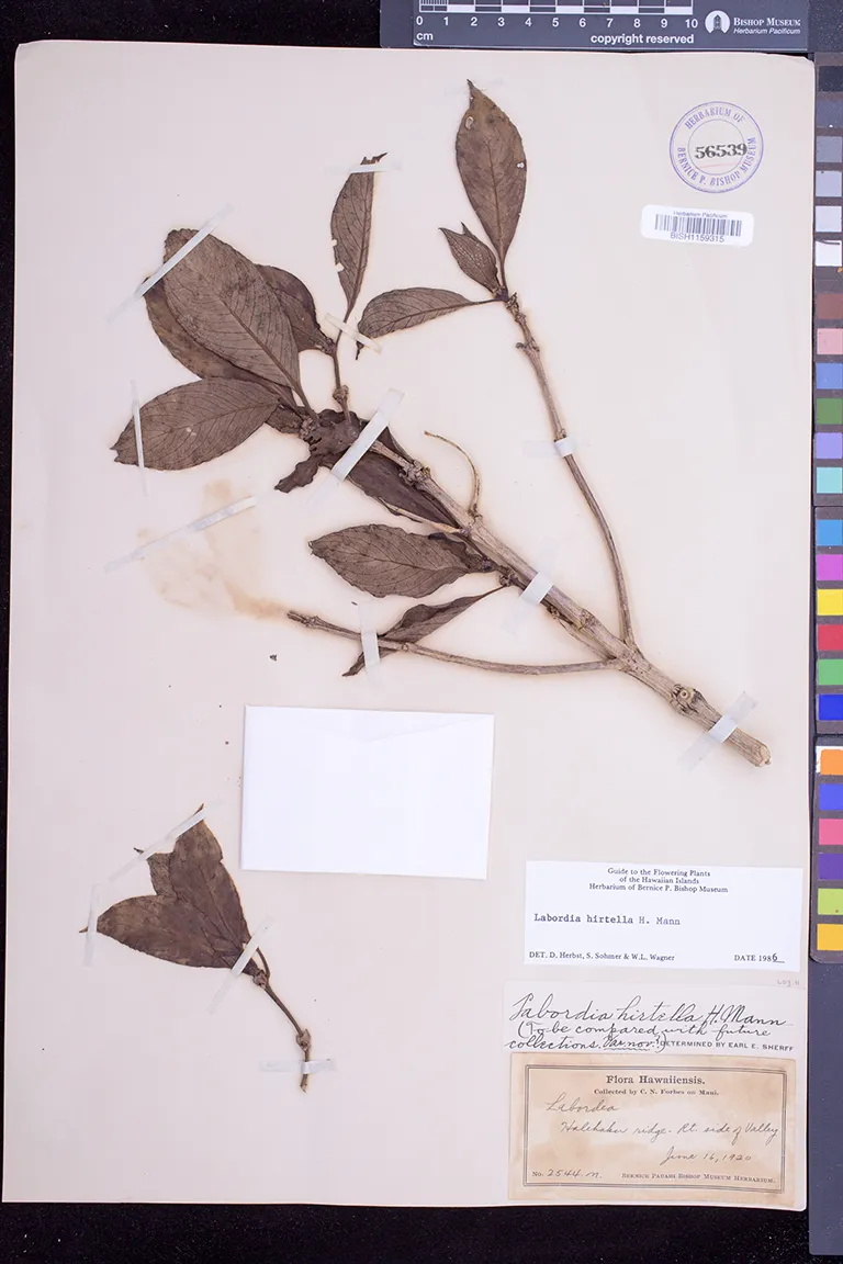 In Metrosideros-Cheirodendron montane wet forest with Broussaisia, Labordia hirtella, Clermontia micrantha, Phyllostegia ambigua, Lobelia gloria-montis, Sadleria, Cyrtandra grayi, Dubautia plantaginea, Machaerina angustifolia, Psychotria, Eragrostis grandis, Melicope |