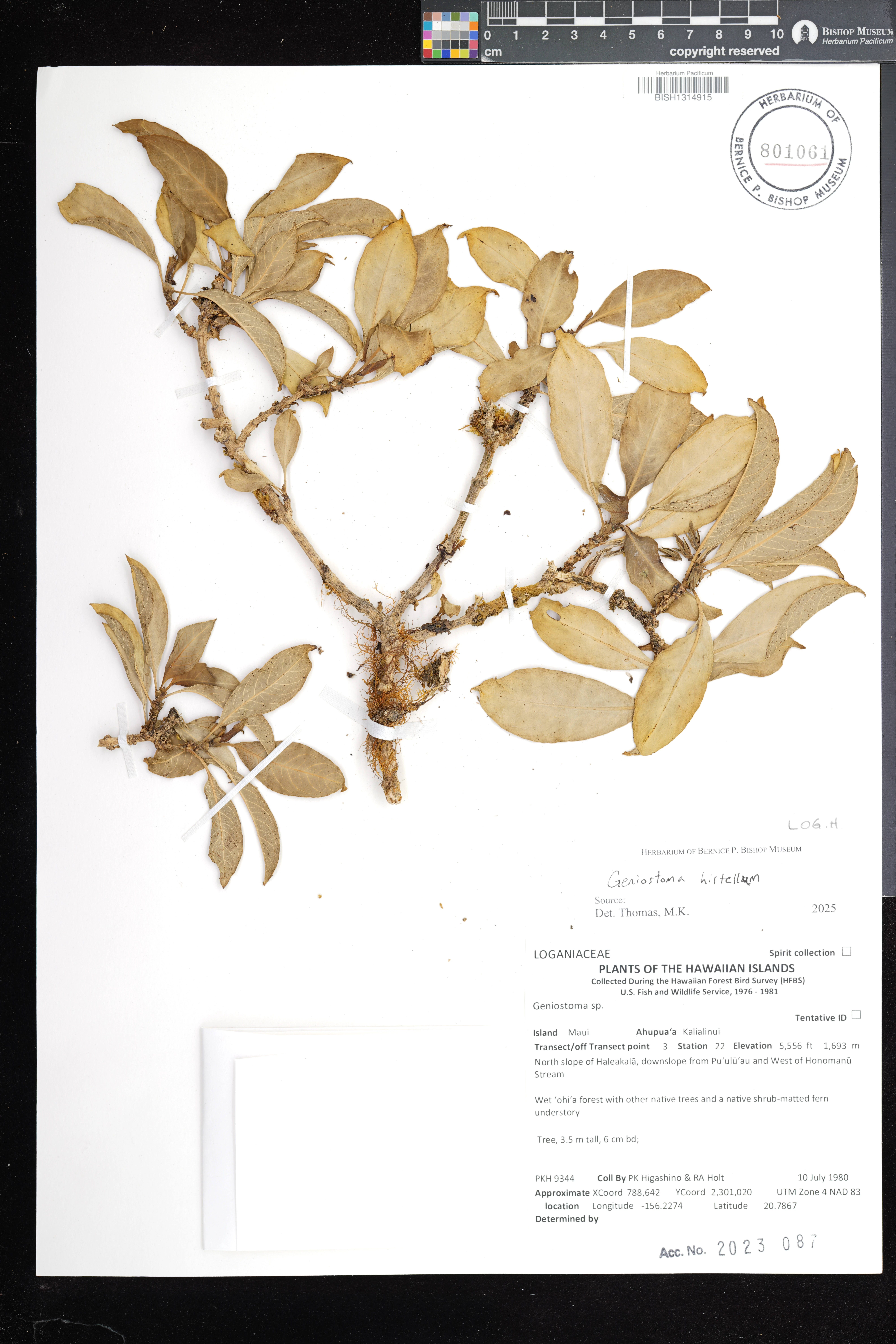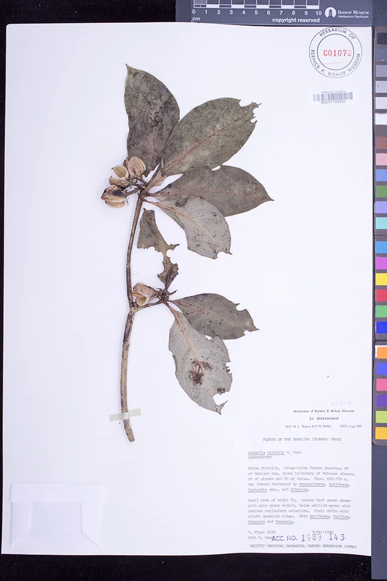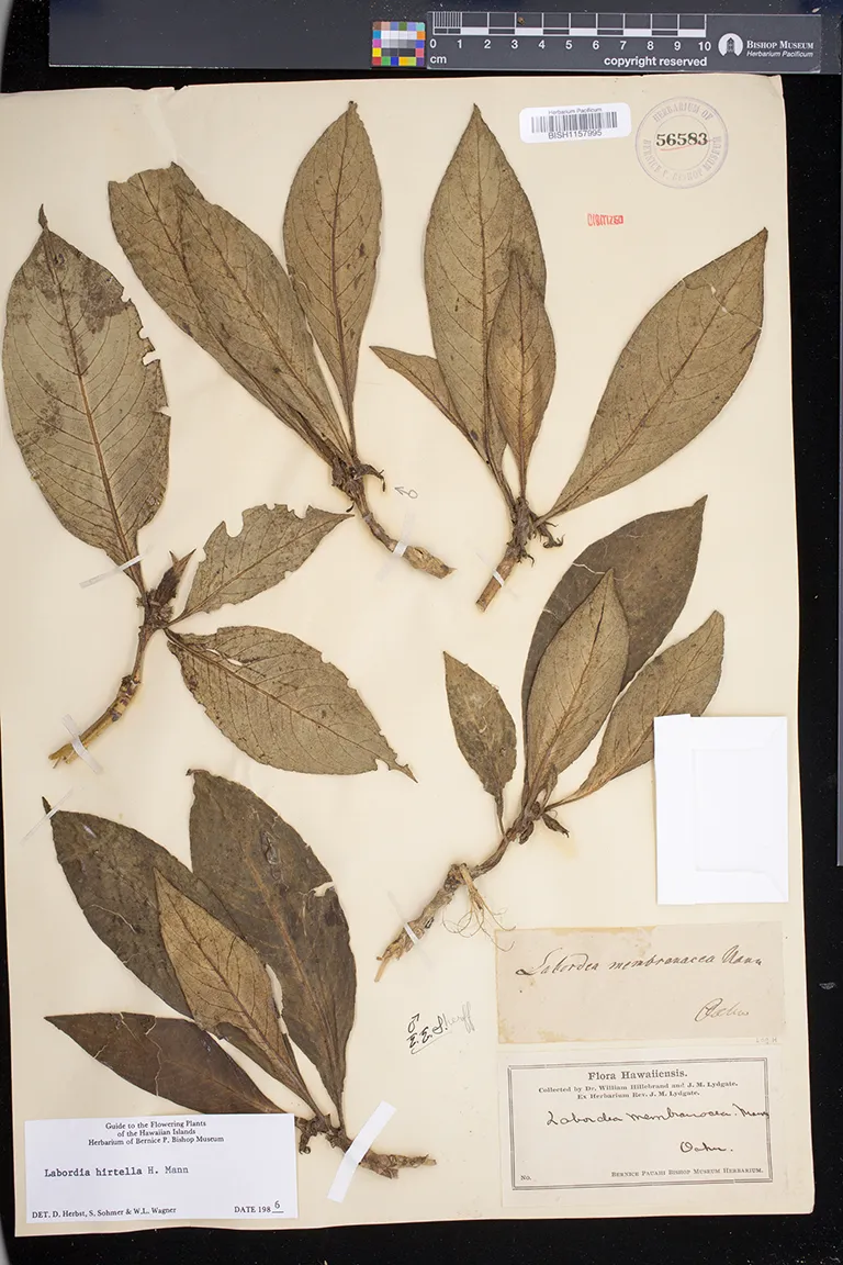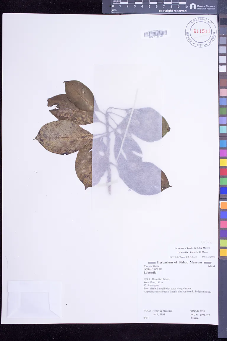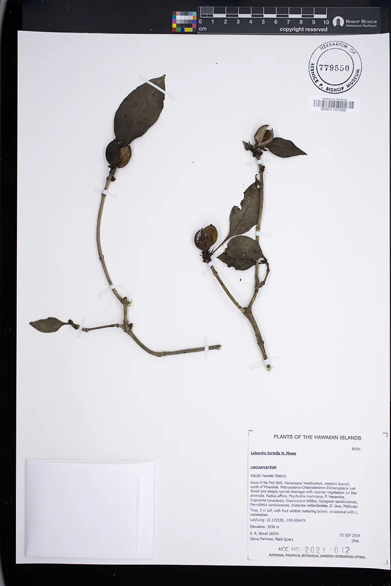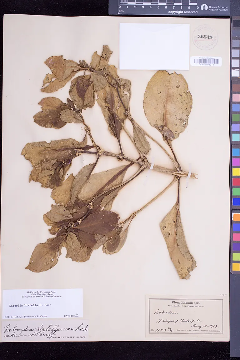 In Metrosideros-Cheirodendron montane wet forest with Broussaisia, Labordia hirtella, Clermontia micrantha, Phyllostegia ambigua, Lobelia gloria-montis, Sadleria, Cyrtandra grayi, Dubautia plantaginea, Machaerina angustifolia, Psychotria, Eragrostis grandis, Melicope |