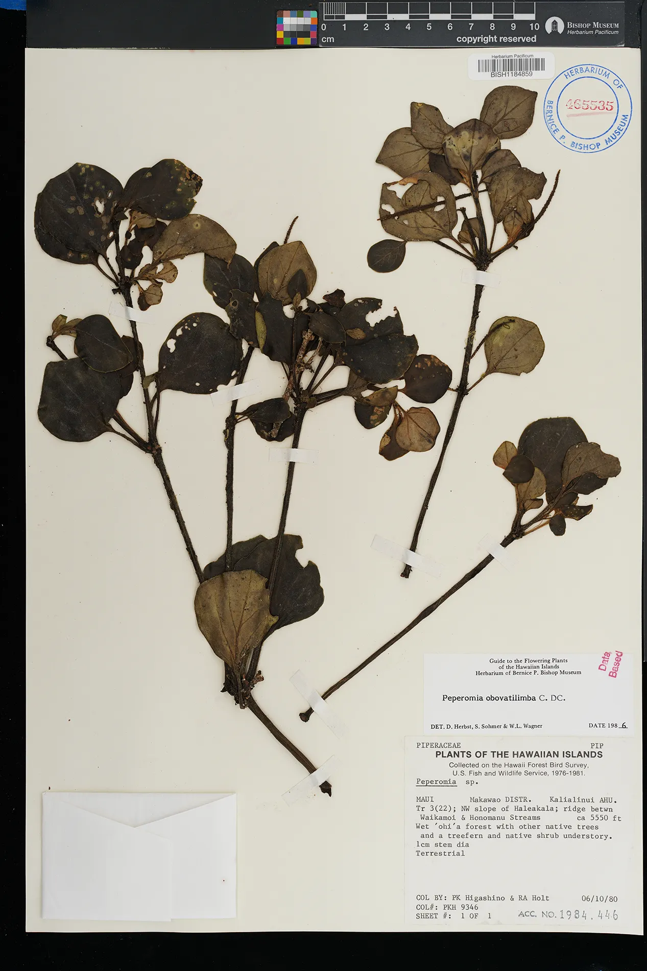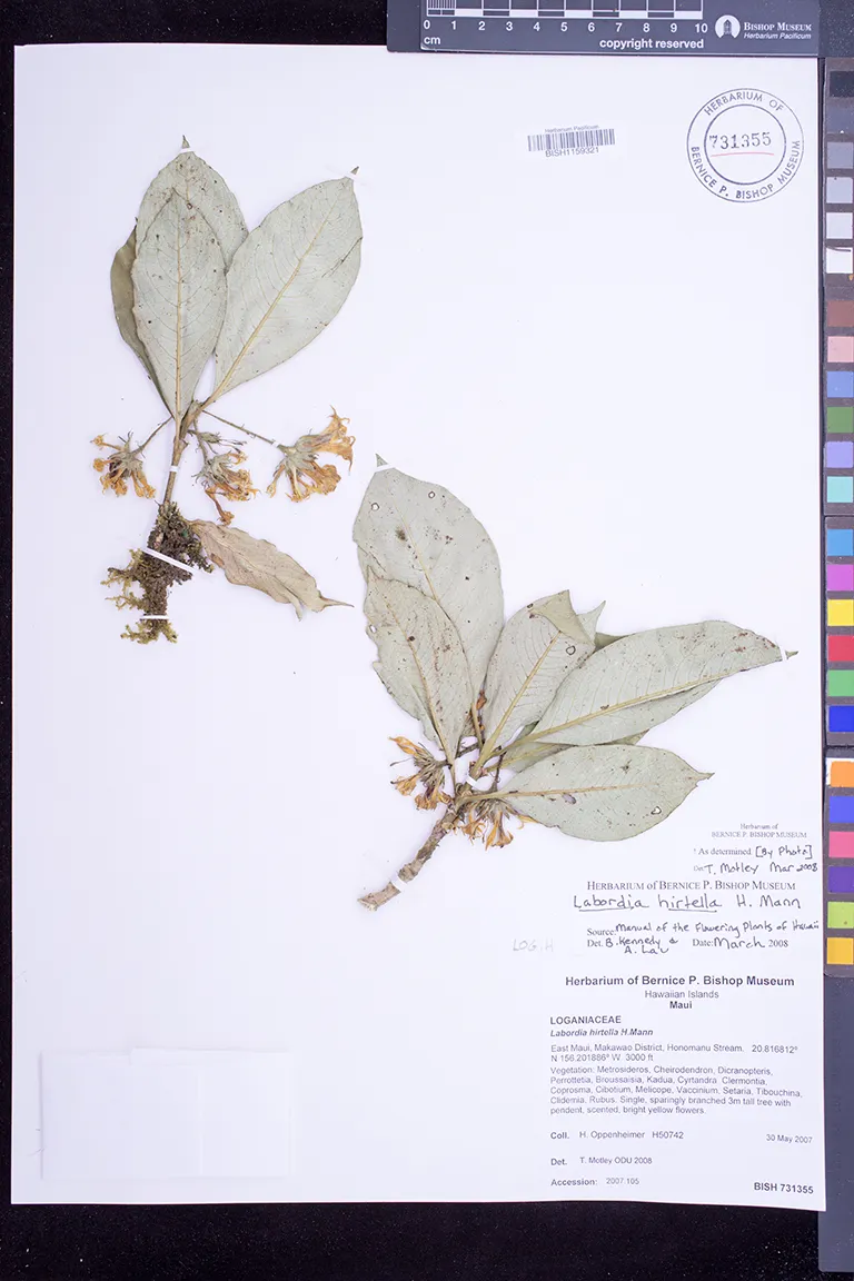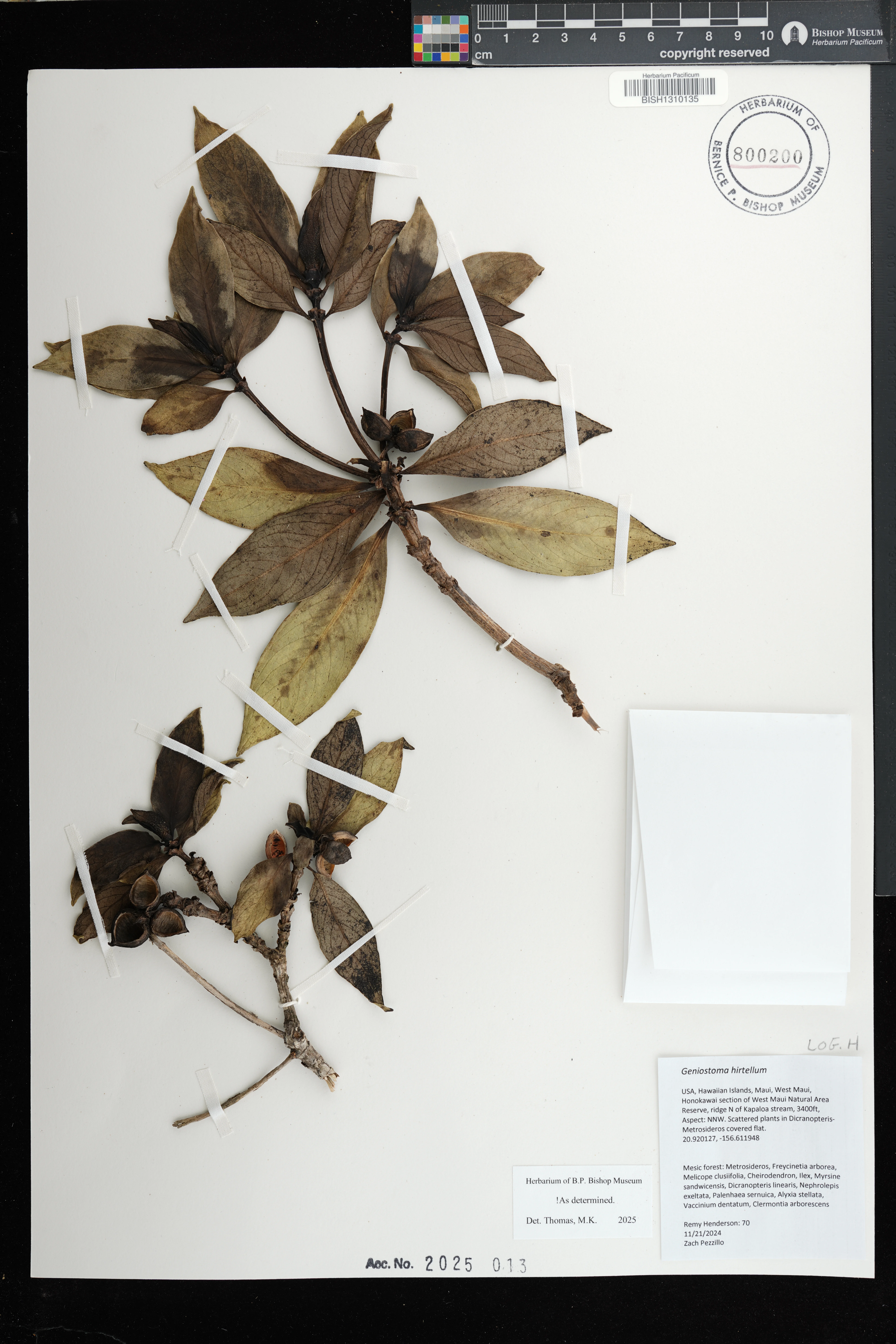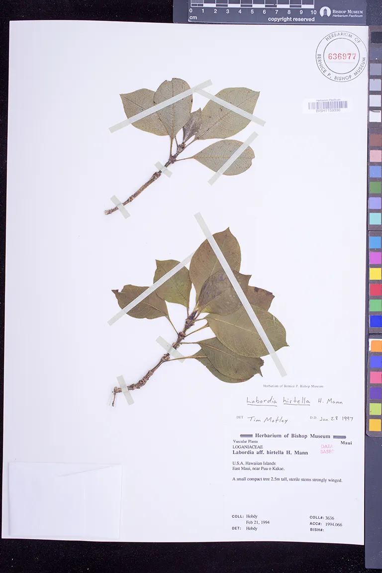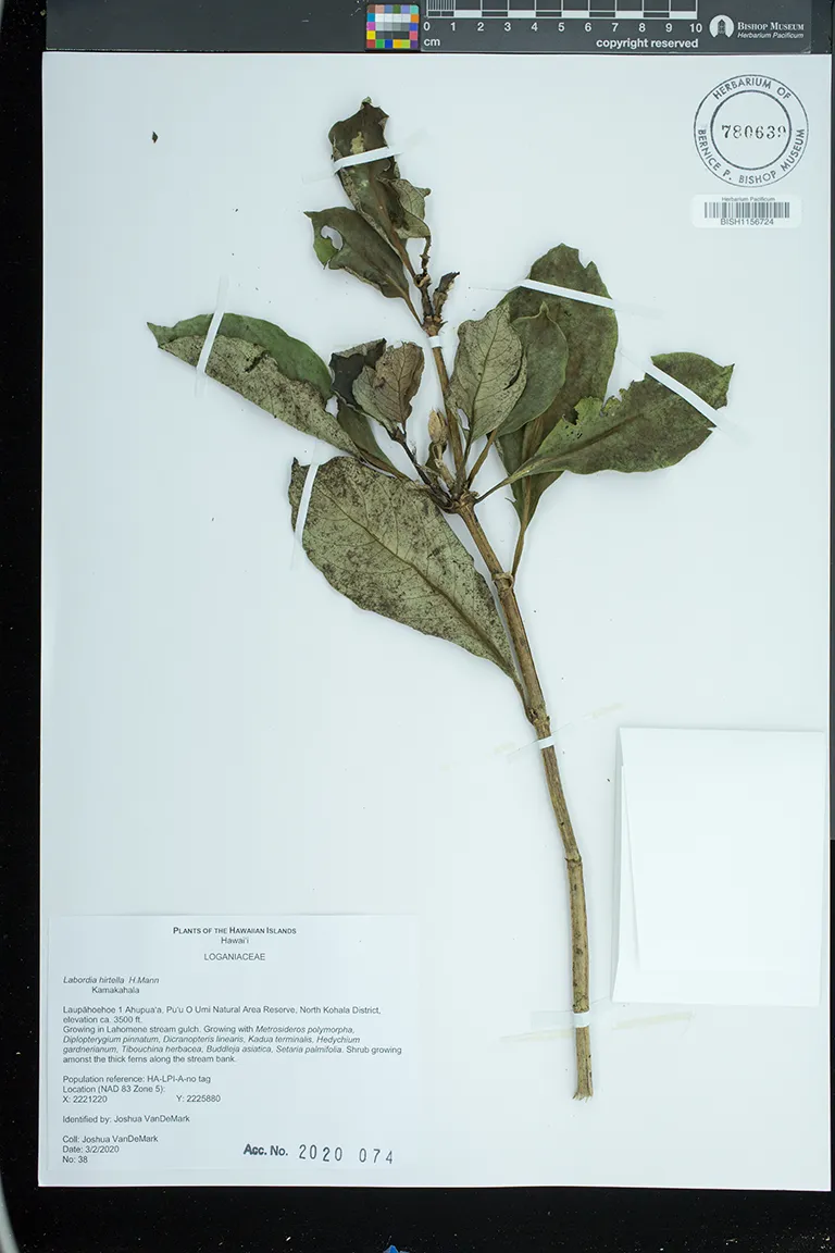 In Metrosideros-Cheirodendron montane wet forest with Broussaisia, Labordia hirtella, Clermontia micrantha, Phyllostegia ambigua, Lobelia gloria-montis, Sadleria, Cyrtandra grayi, Dubautia plantaginea, Machaerina angustifolia, Psychotria, Eragrostis grandis, Melicope |
