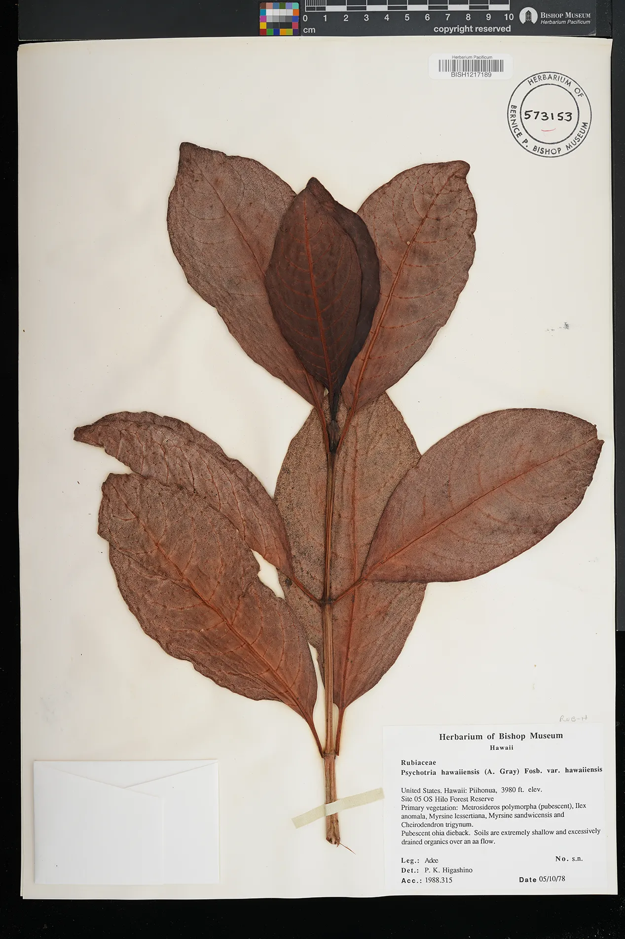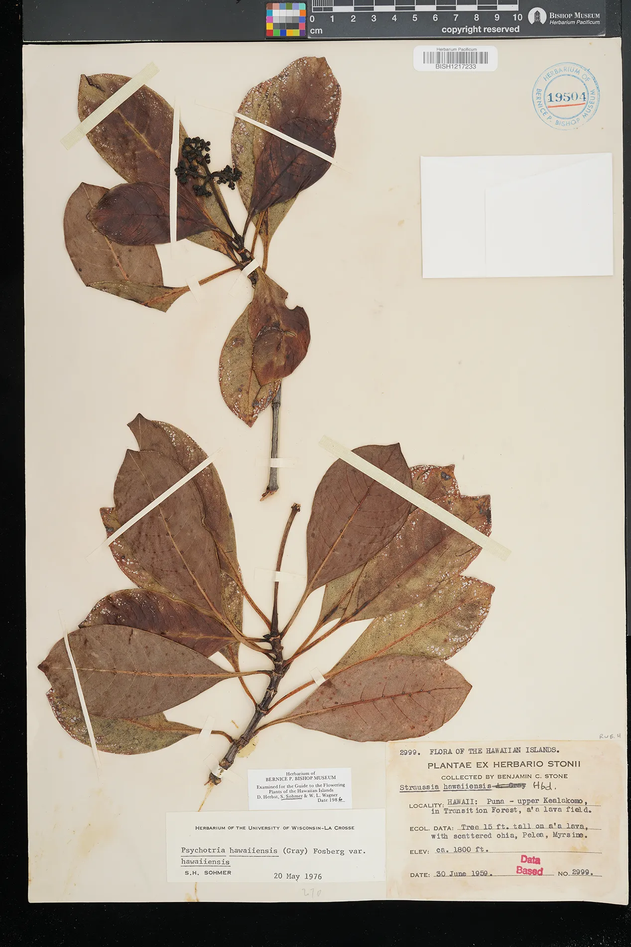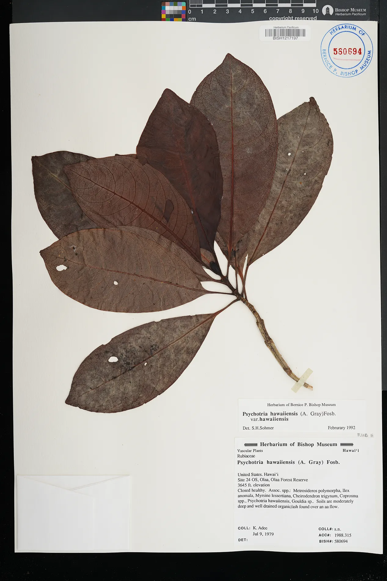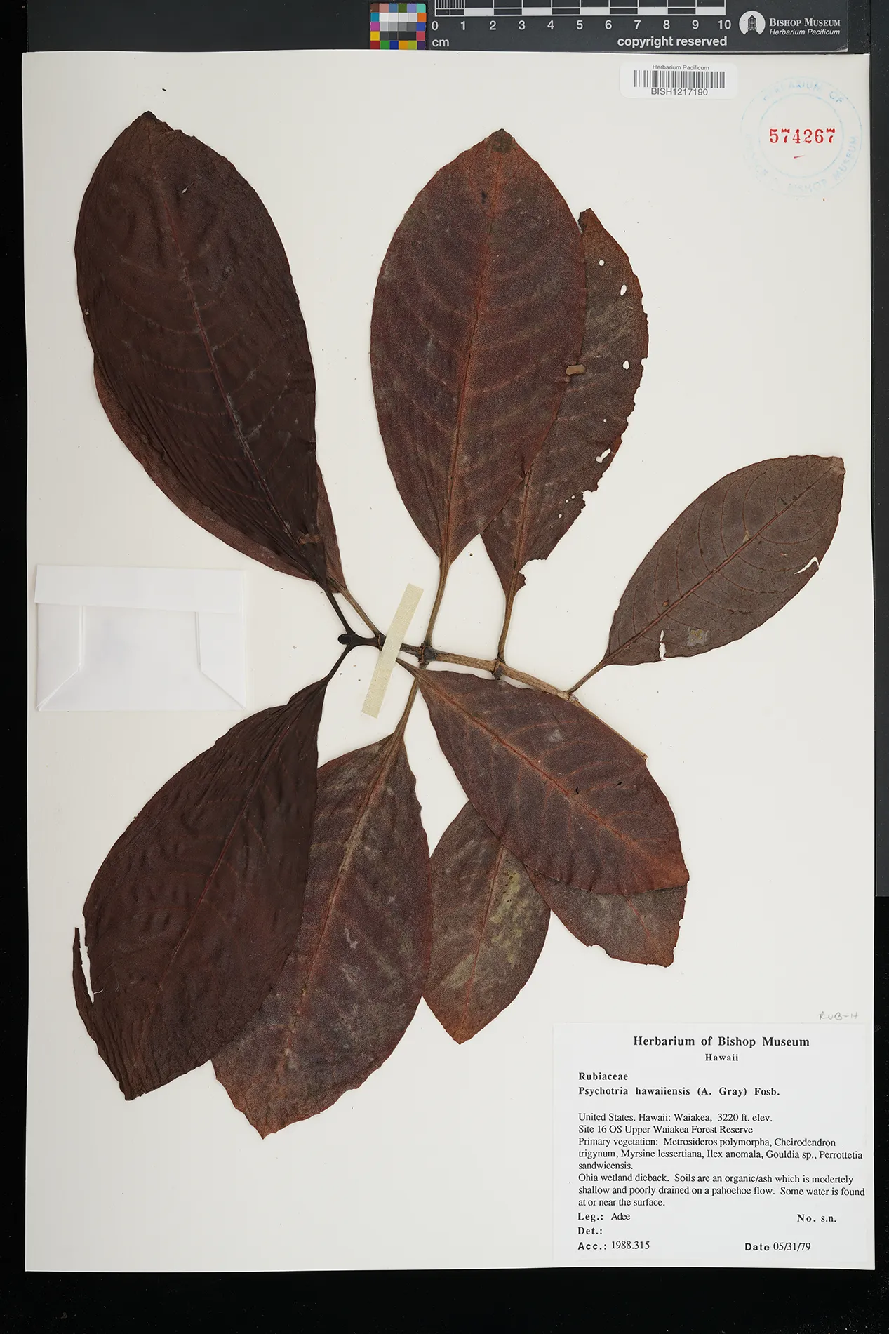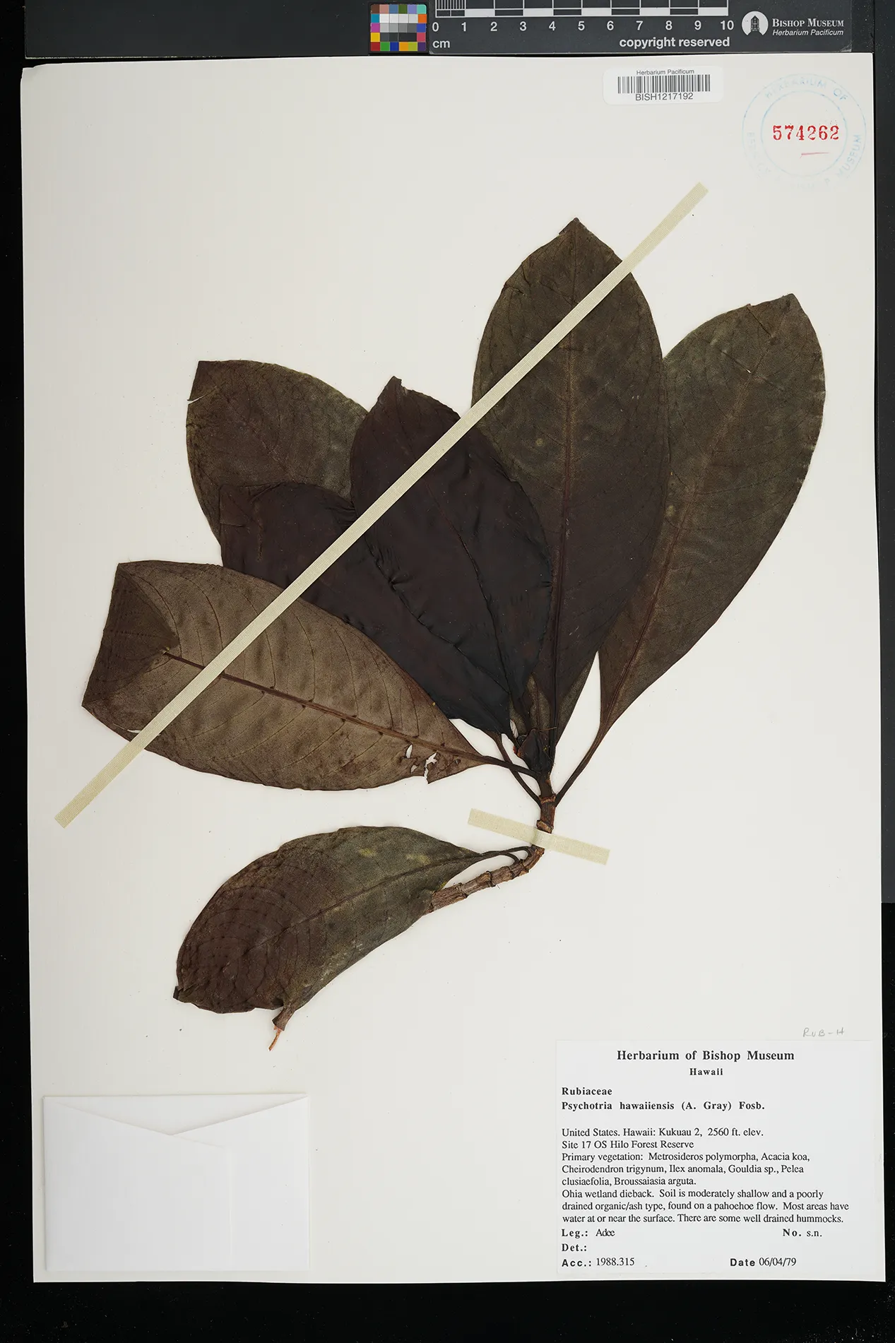 HAWAII: Kau District; Honomalino. 2300 ft. elev. transect for TNC survey (700 m); Metrosideros lowland mesic forest with Pisonia sandwicensis, Wikstroemia, Psychotria hawaiiensis vars. hawaiiensis & hillebrandii, Flueggea, Cyrtandra menziesii, Cyrtomium caryotidium & falcatum, Hedyotis acuminata, Stenogyne, Melicope, Pteris, Microlepia strigosa, Pittosporum hosmeri & hawaiiense. Elev. 700-750 m. |