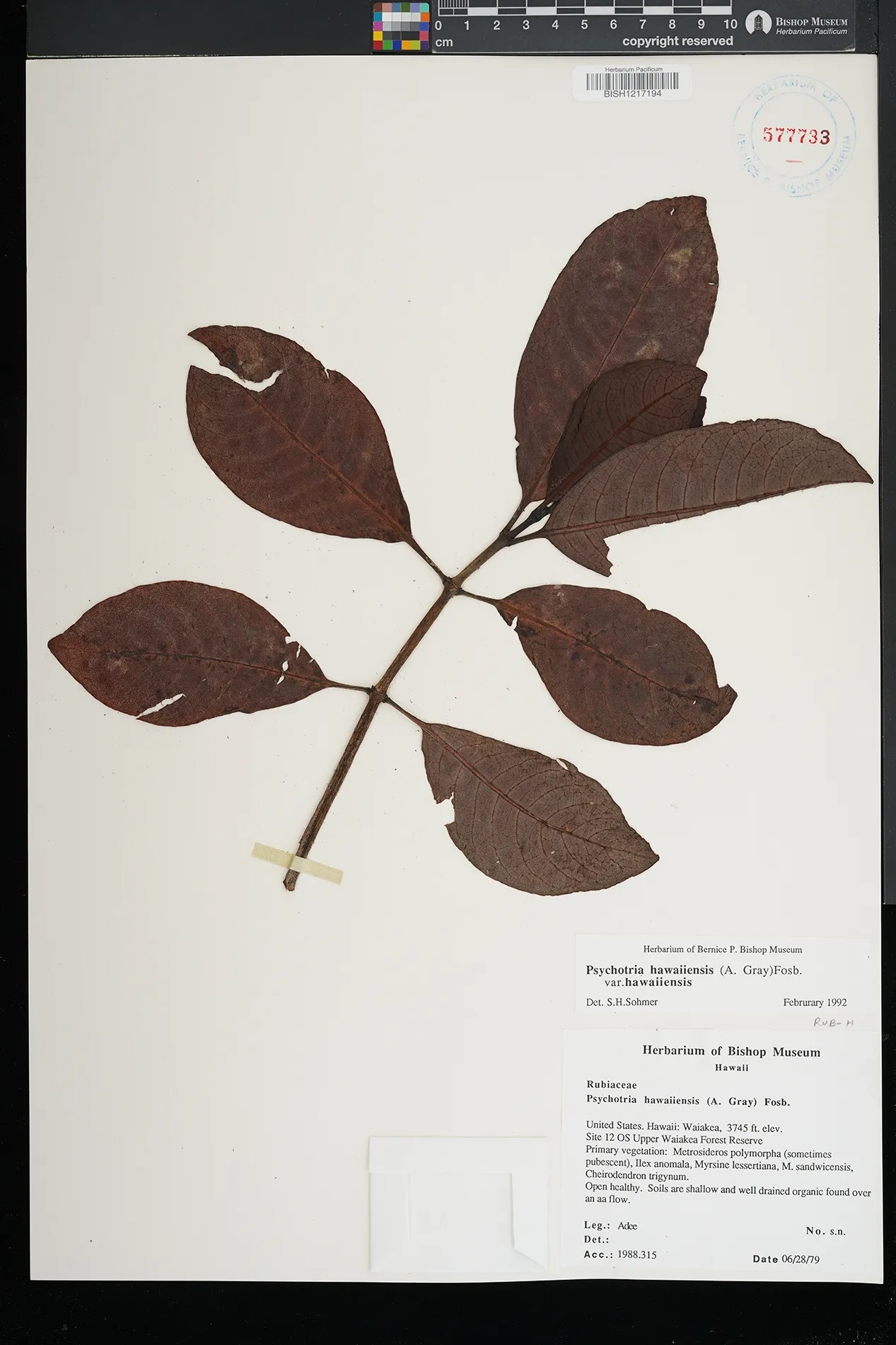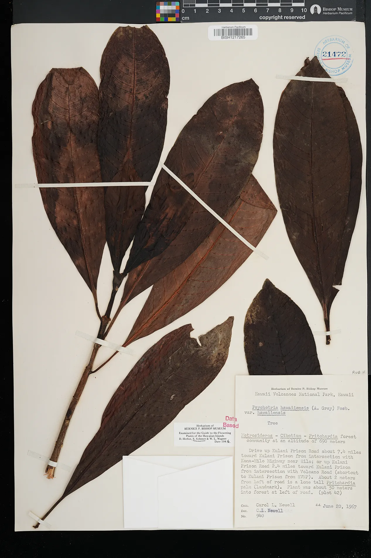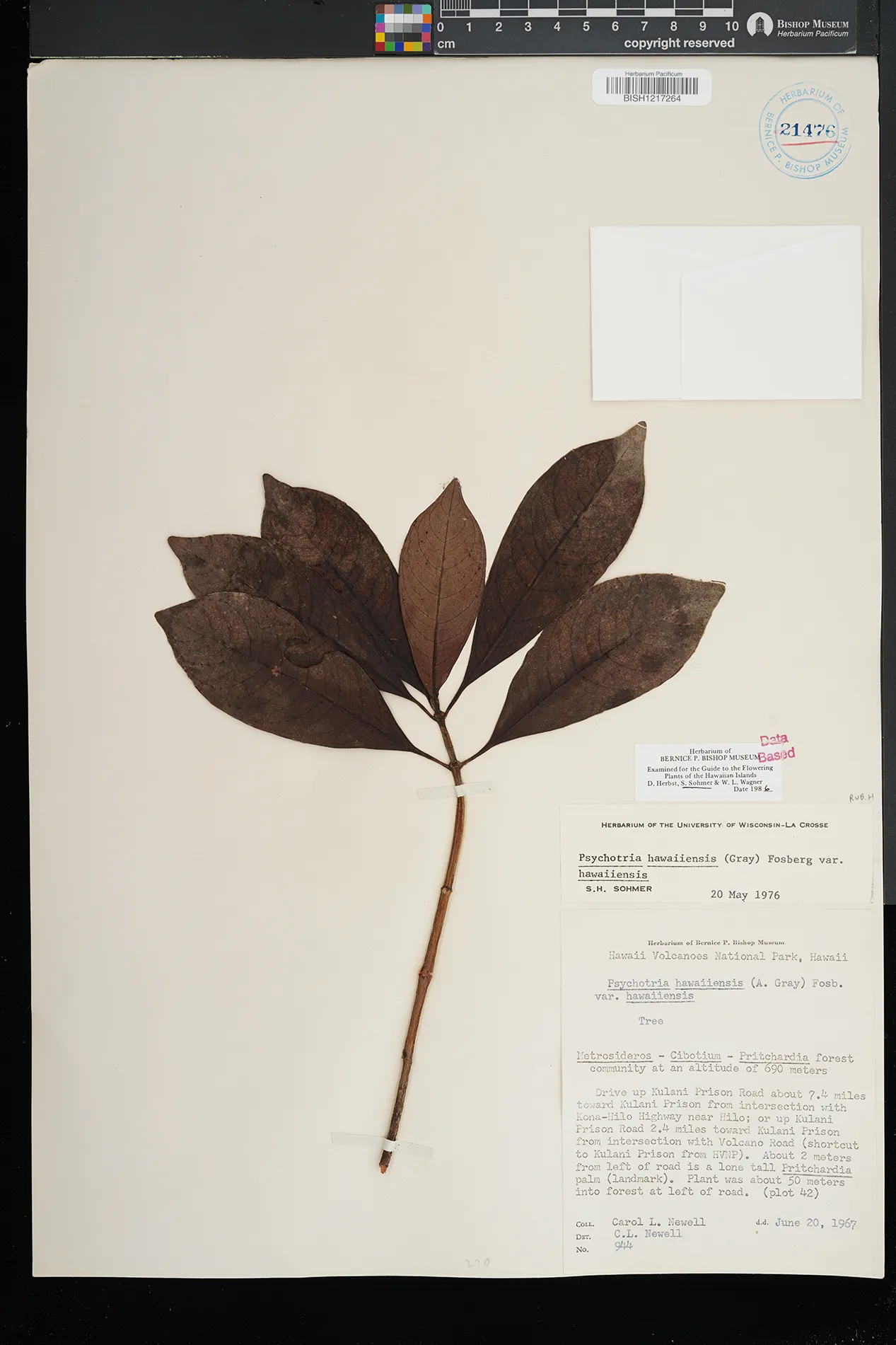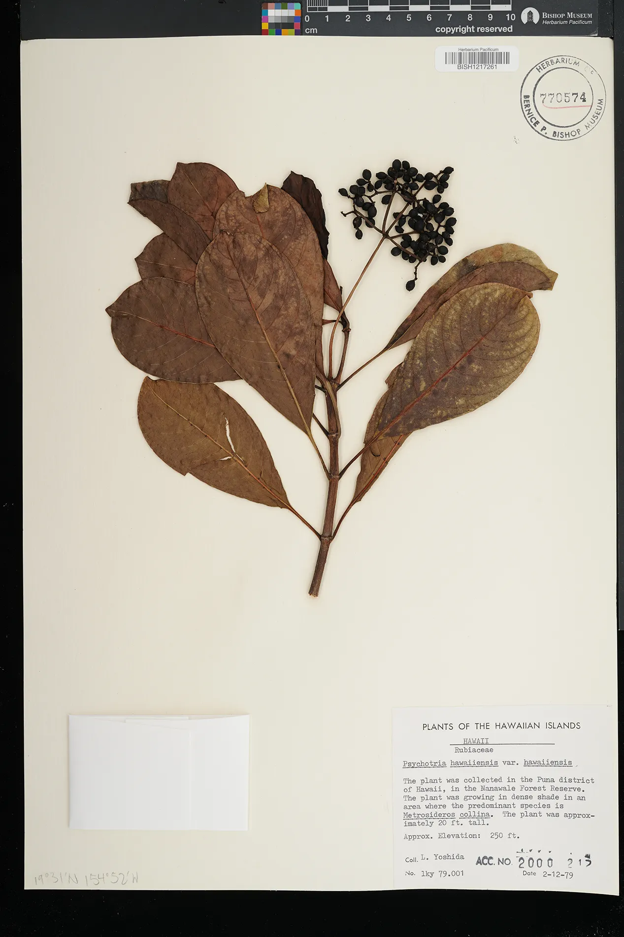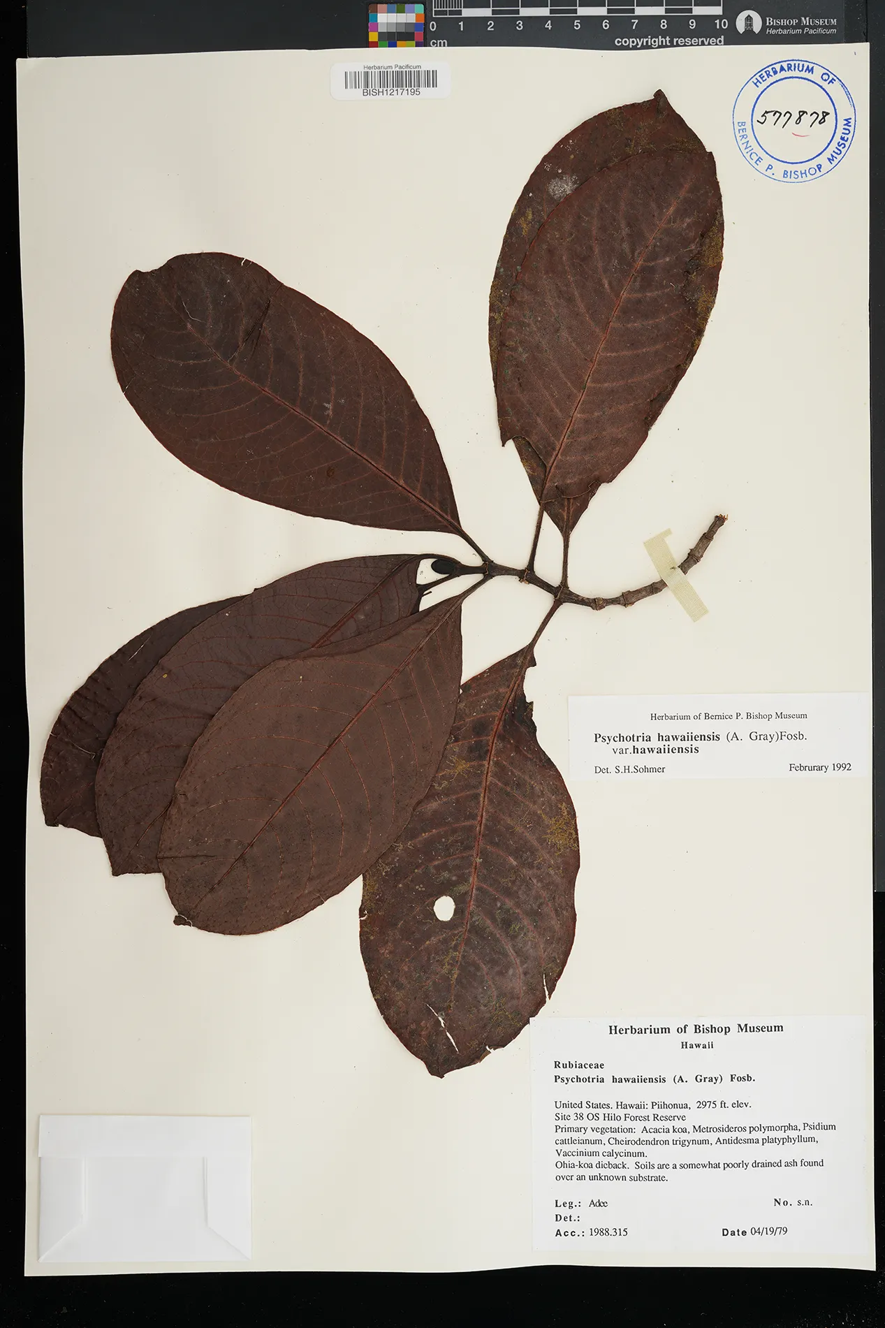 HAWAII: Kau District; Honomalino. 2300 ft. elev. transect for TNC survey (700 m); Metrosideros lowland mesic forest with Pisonia sandwicensis, Wikstroemia, Psychotria hawaiiensis vars. hawaiiensis & hillebrandii, Flueggea, Cyrtandra menziesii, Cyrtomium caryotidium & falcatum, Hedyotis acuminata, Stenogyne, Melicope, Pteris, Microlepia strigosa, Pittosporum hosmeri & hawaiiense. Elev. 700-750 m. |