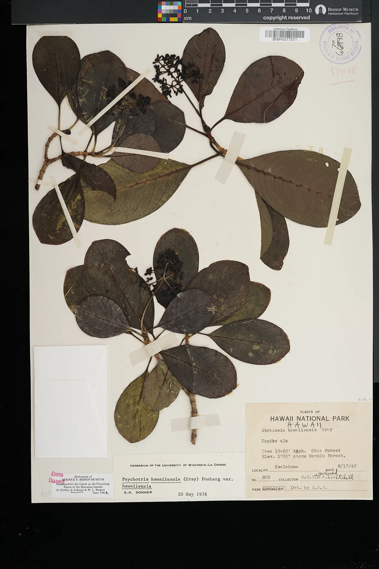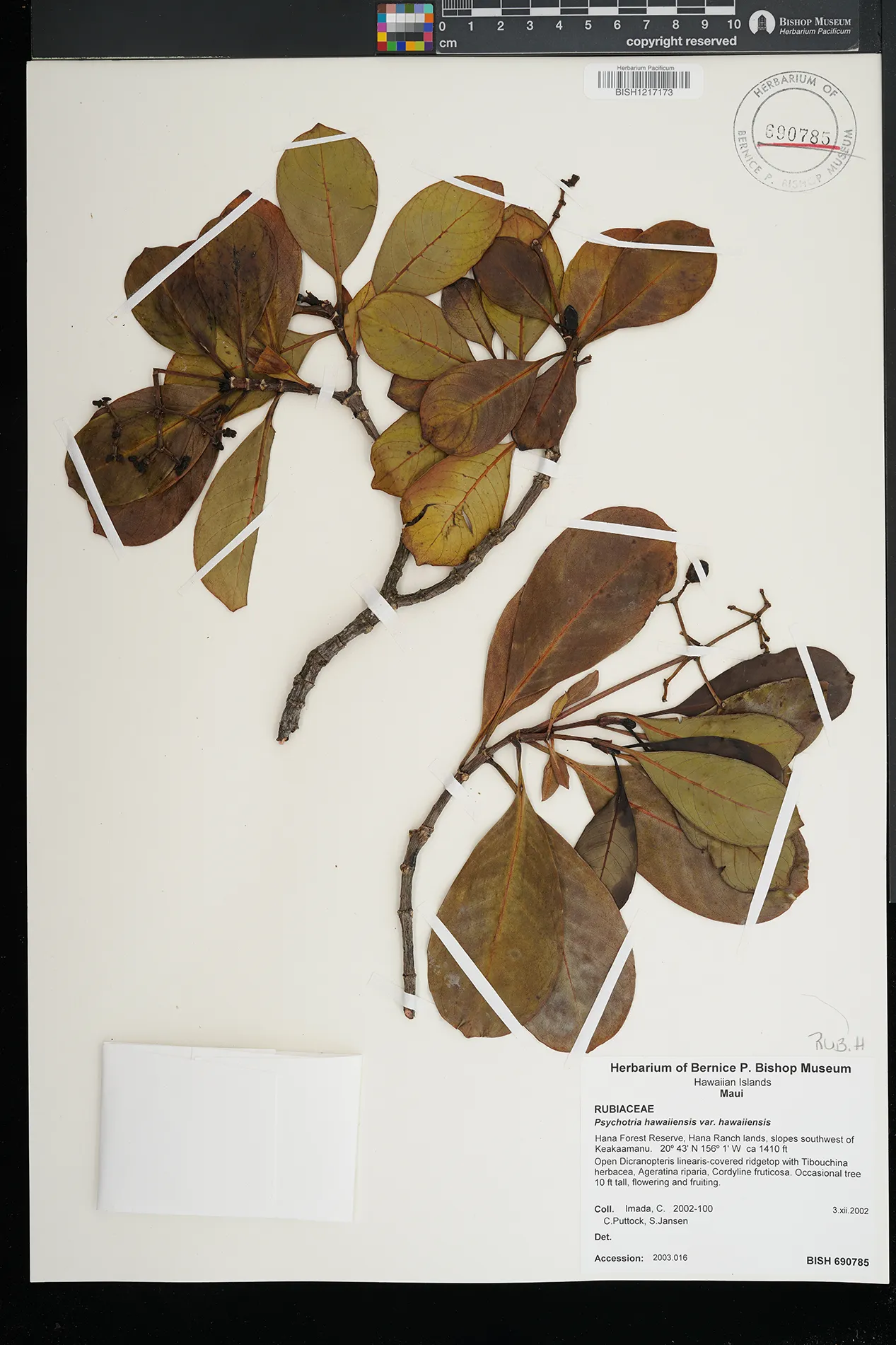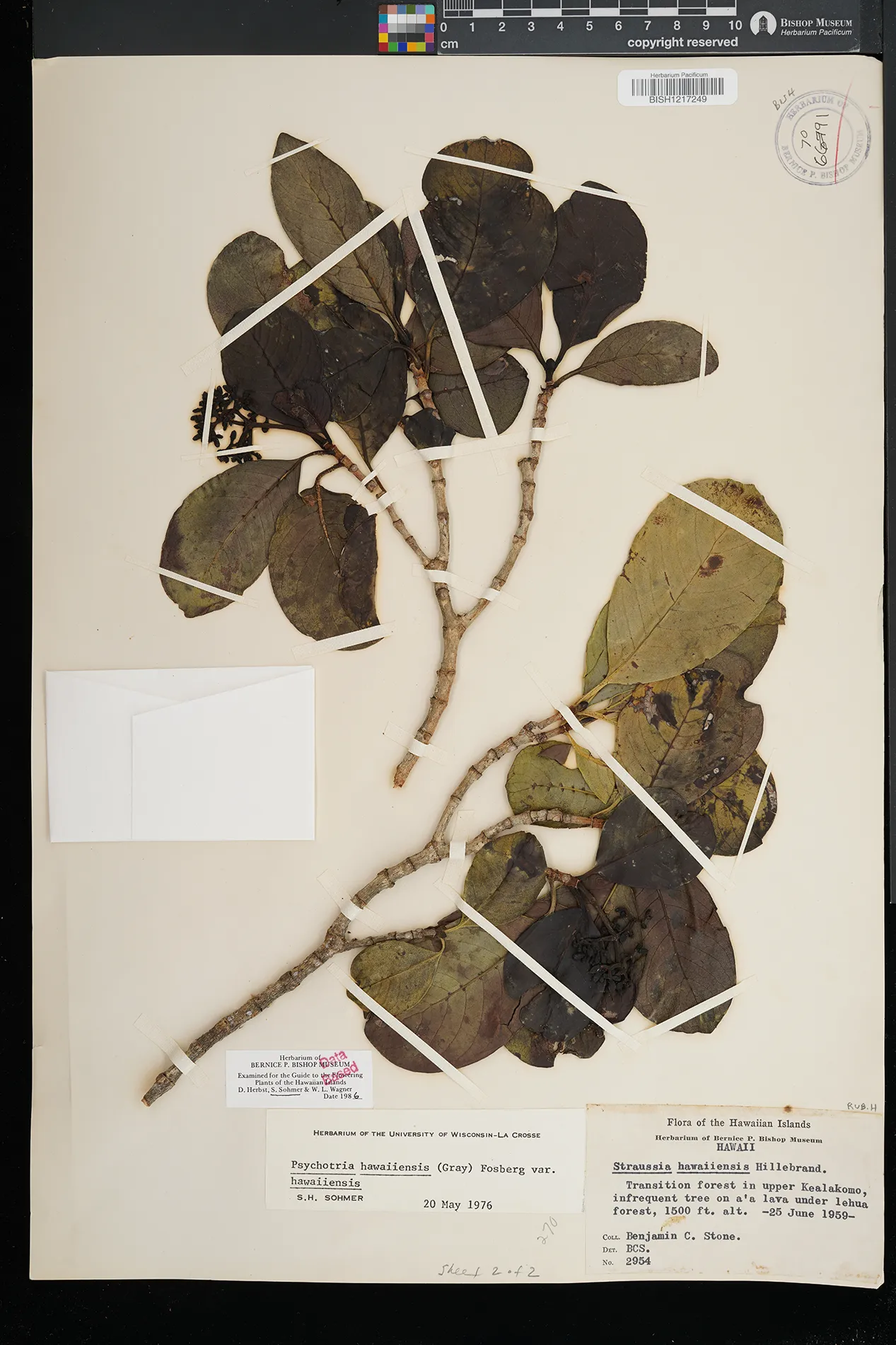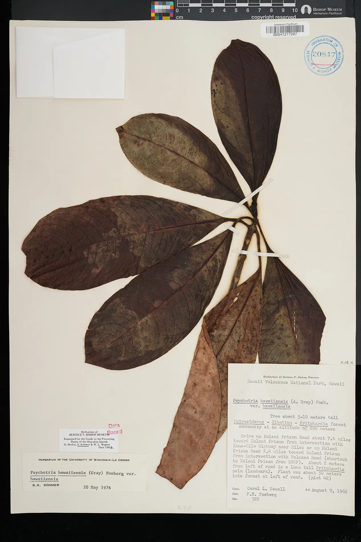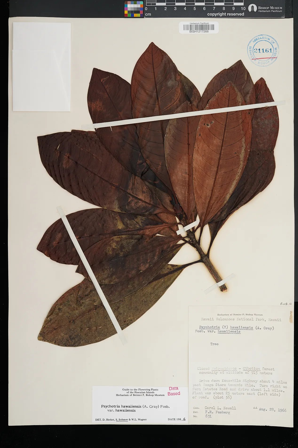 HAWAII: Kau District; Honomalino. 2300 ft. elev. transect for TNC survey (700 m); Metrosideros lowland mesic forest with Pisonia sandwicensis, Wikstroemia, Psychotria hawaiiensis vars. hawaiiensis & hillebrandii, Flueggea, Cyrtandra menziesii, Cyrtomium caryotidium & falcatum, Hedyotis acuminata, Stenogyne, Melicope, Pteris, Microlepia strigosa, Pittosporum hosmeri & hawaiiense. Elev. 700-750 m. |