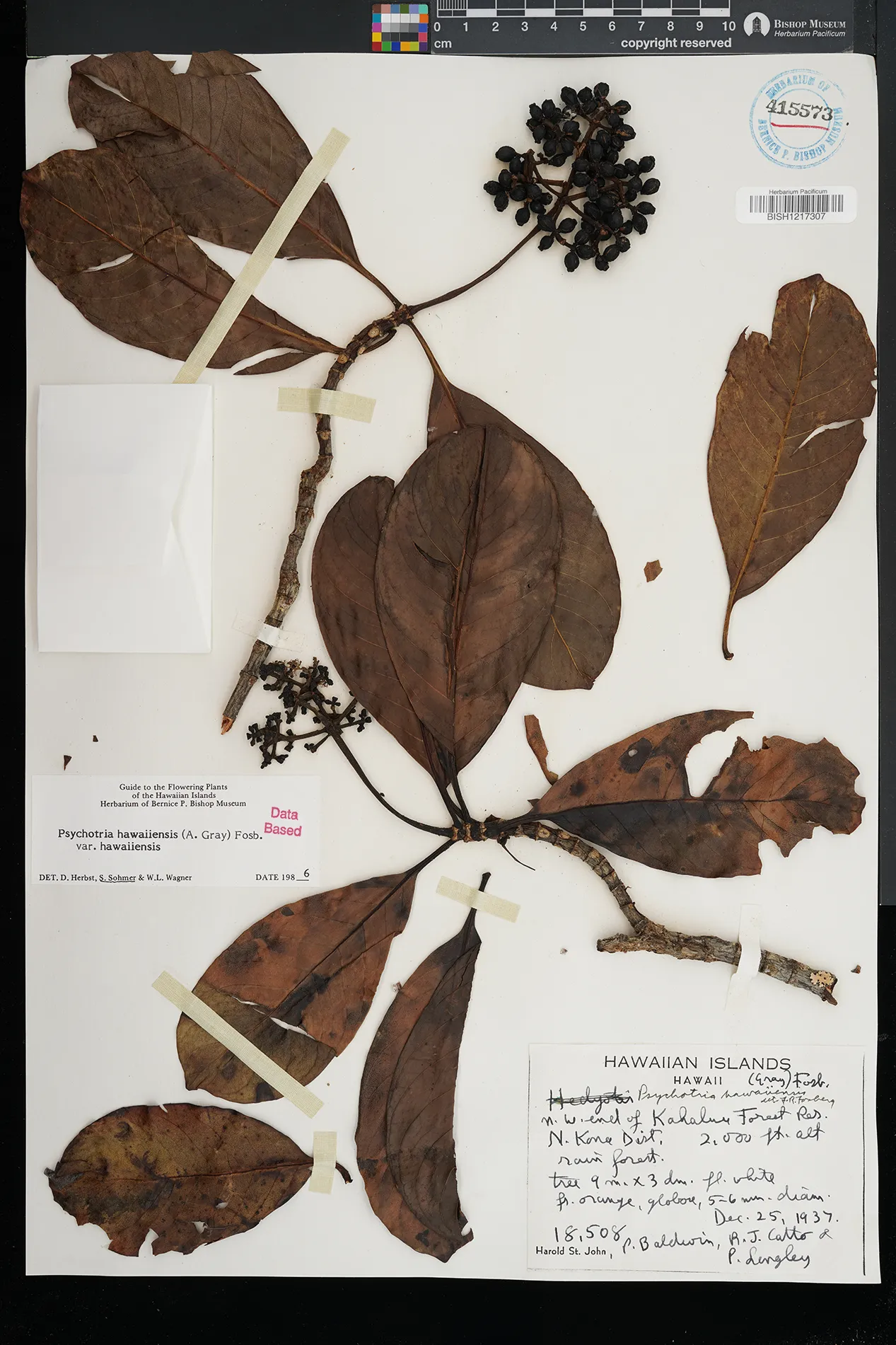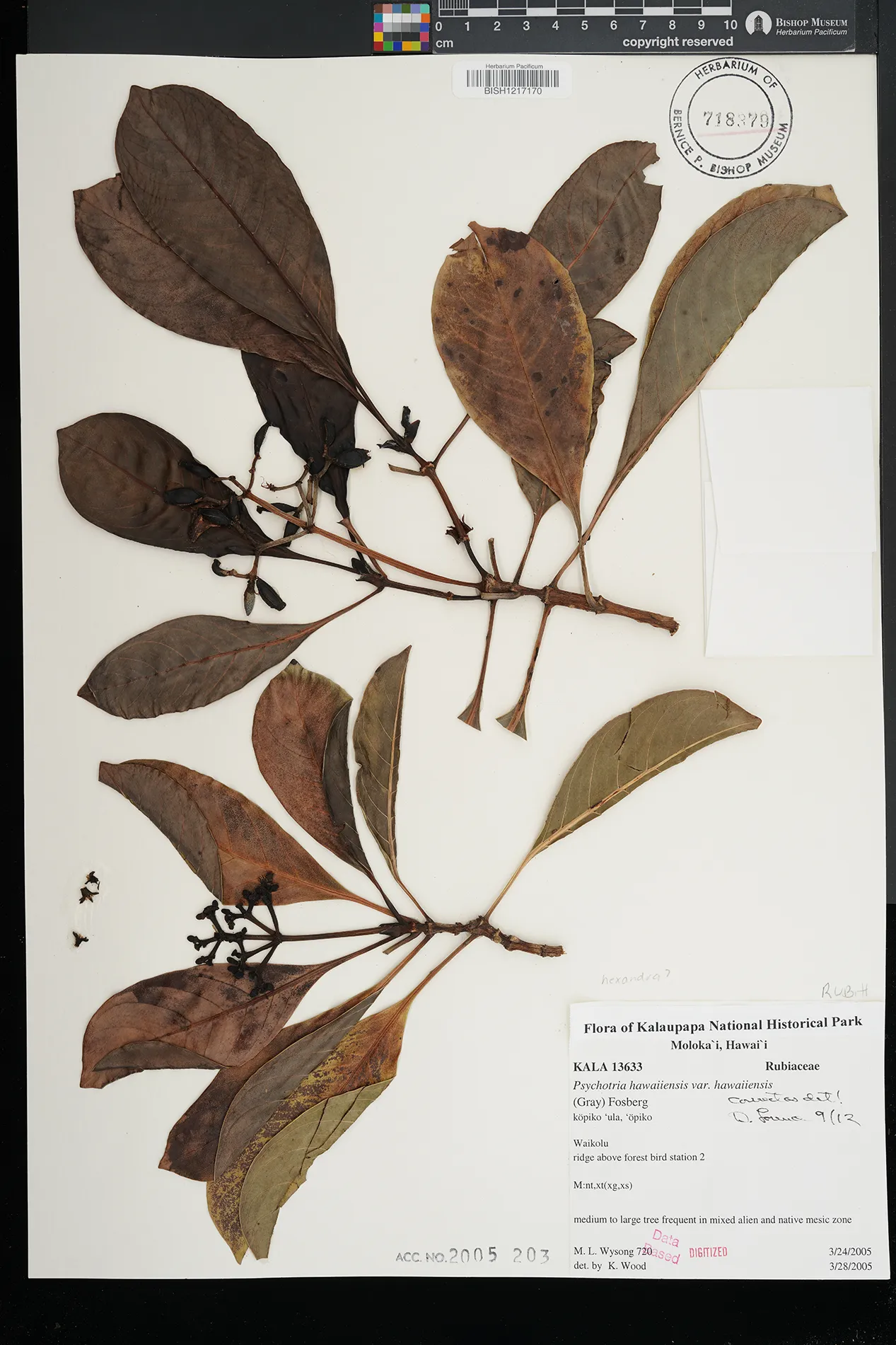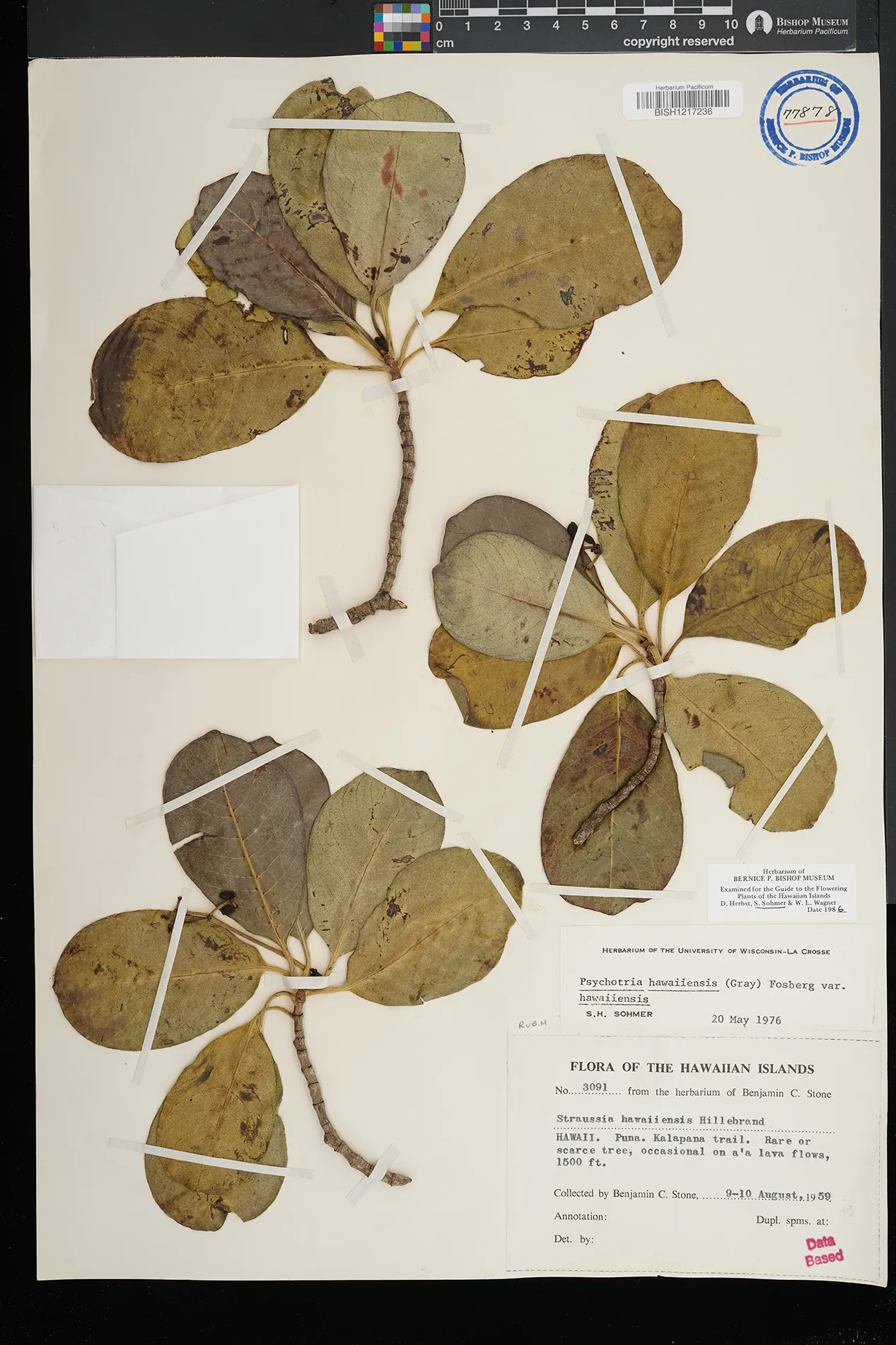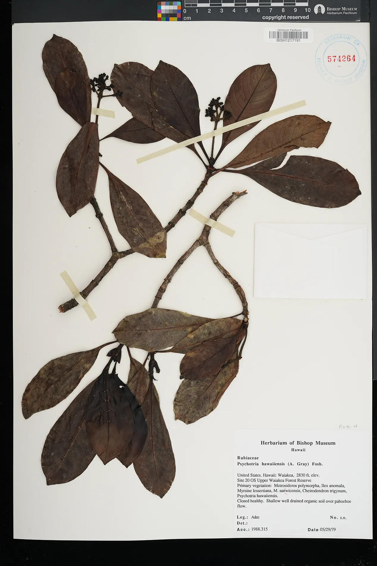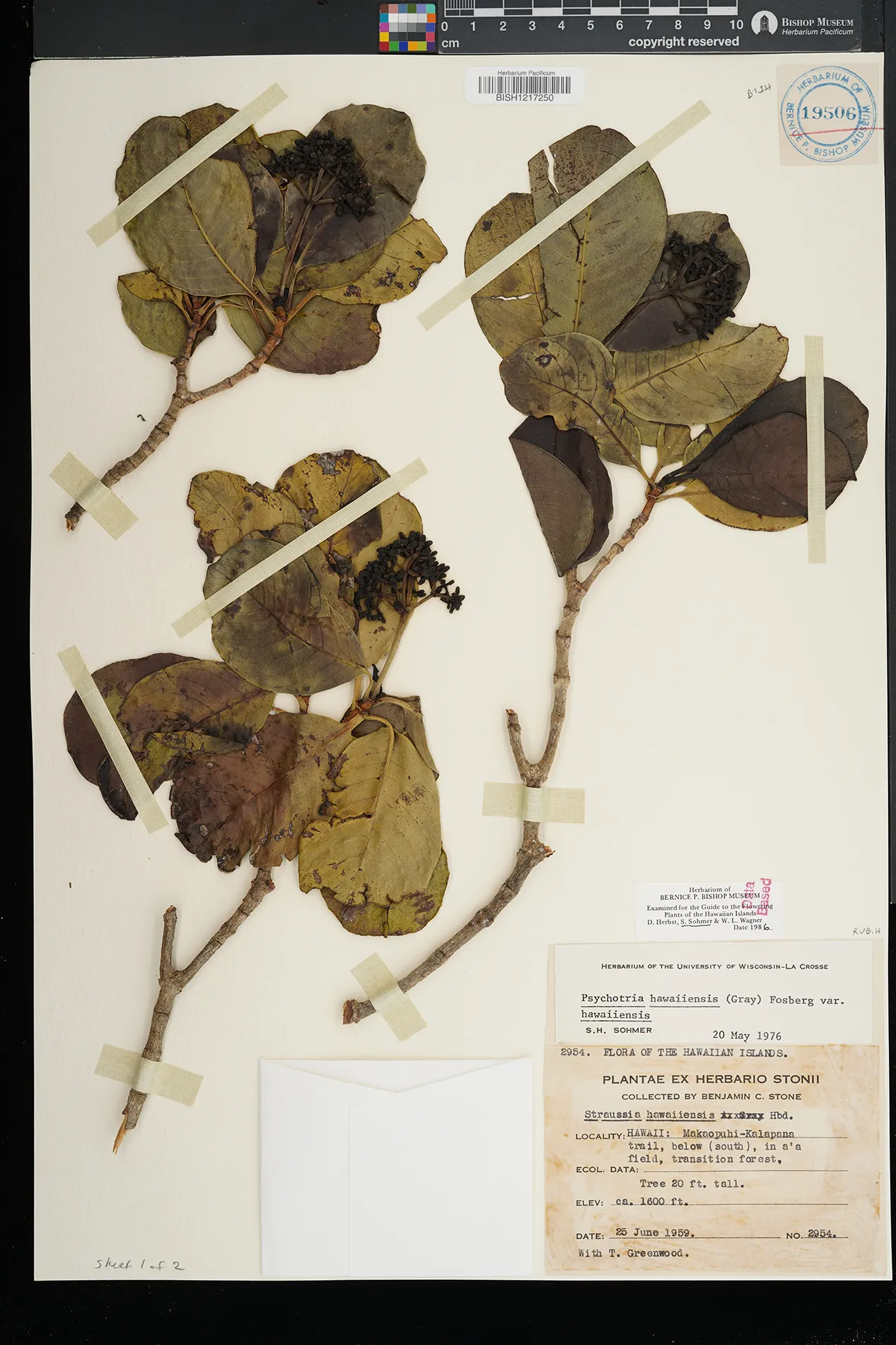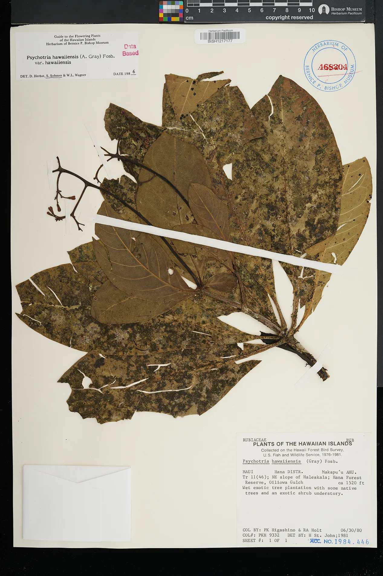 HAWAII: Kau District; Honomalino. 2300 ft. elev. transect for TNC survey (700 m); Metrosideros lowland mesic forest with Pisonia sandwicensis, Wikstroemia, Psychotria hawaiiensis vars. hawaiiensis & hillebrandii, Flueggea, Cyrtandra menziesii, Cyrtomium caryotidium & falcatum, Hedyotis acuminata, Stenogyne, Melicope, Pteris, Microlepia strigosa, Pittosporum hosmeri & hawaiiense. Elev. 700-750 m. |