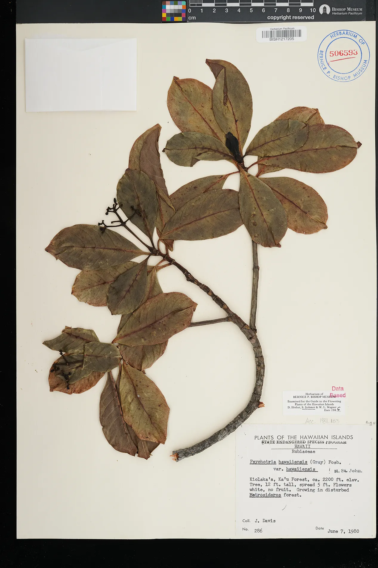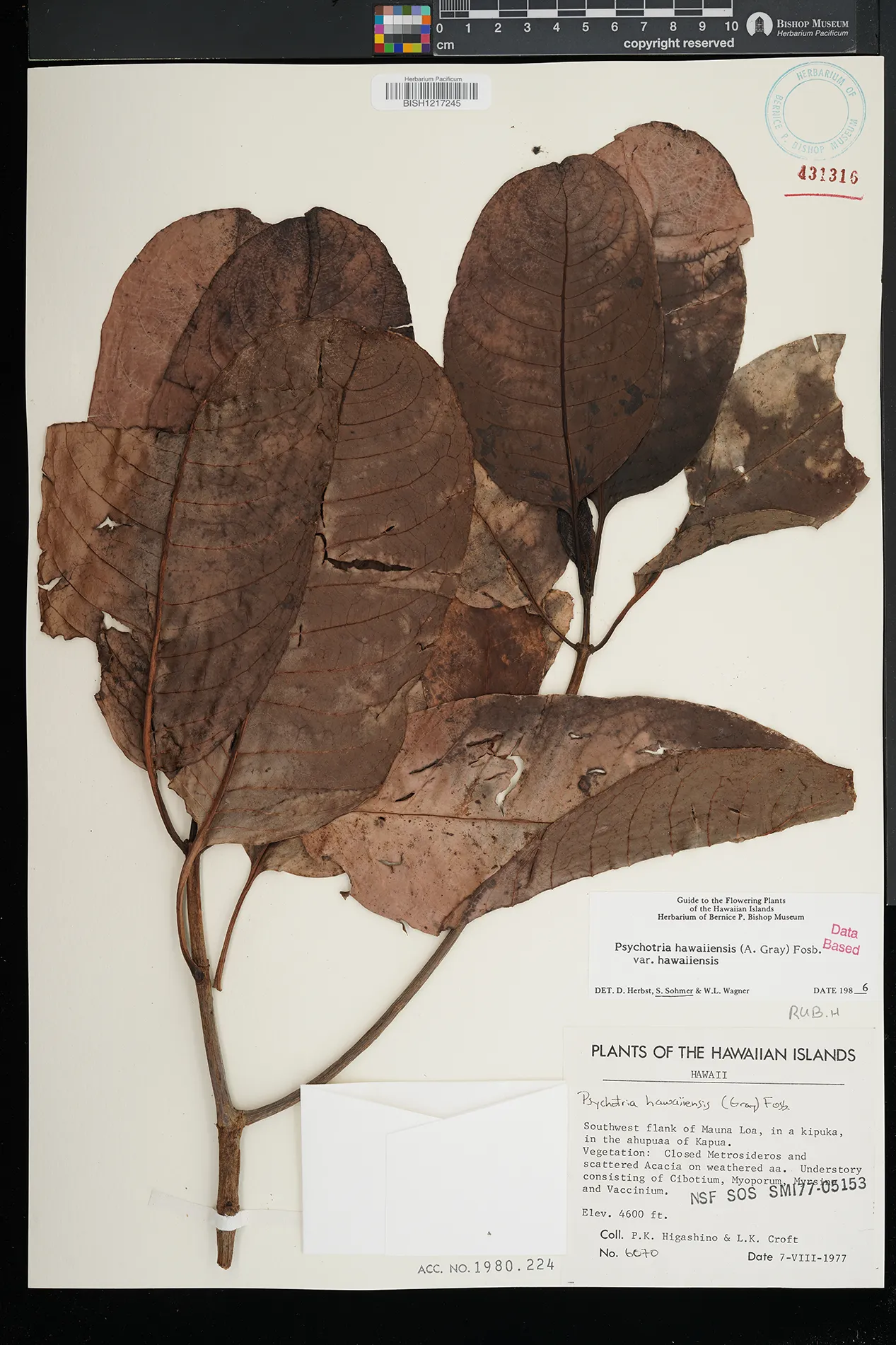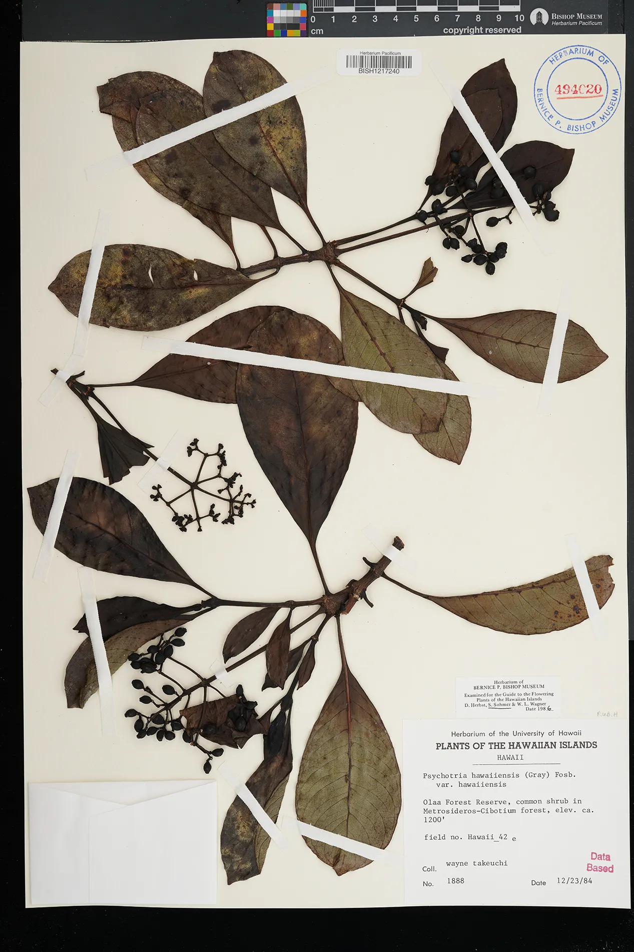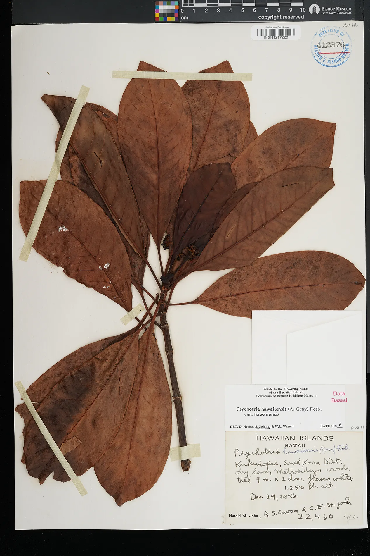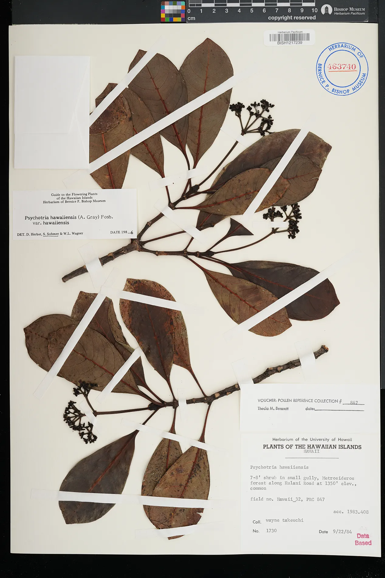 HAWAII: Kau District; Honomalino. 2300 ft. elev. transect for TNC survey (700 m); Metrosideros lowland mesic forest with Pisonia sandwicensis, Wikstroemia, Psychotria hawaiiensis vars. hawaiiensis & hillebrandii, Flueggea, Cyrtandra menziesii, Cyrtomium caryotidium & falcatum, Hedyotis acuminata, Stenogyne, Melicope, Pteris, Microlepia strigosa, Pittosporum hosmeri & hawaiiense. Elev. 700-750 m. |