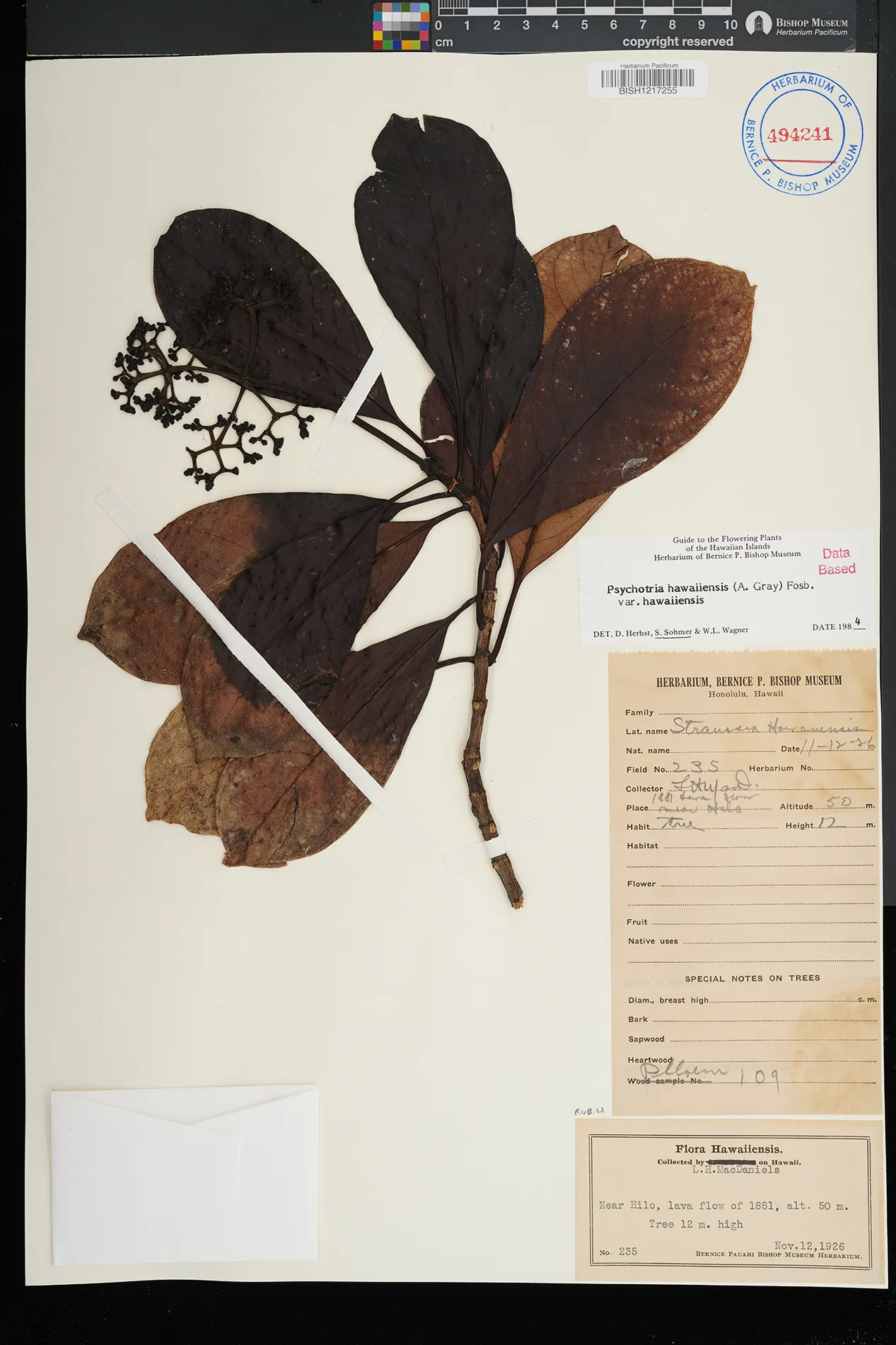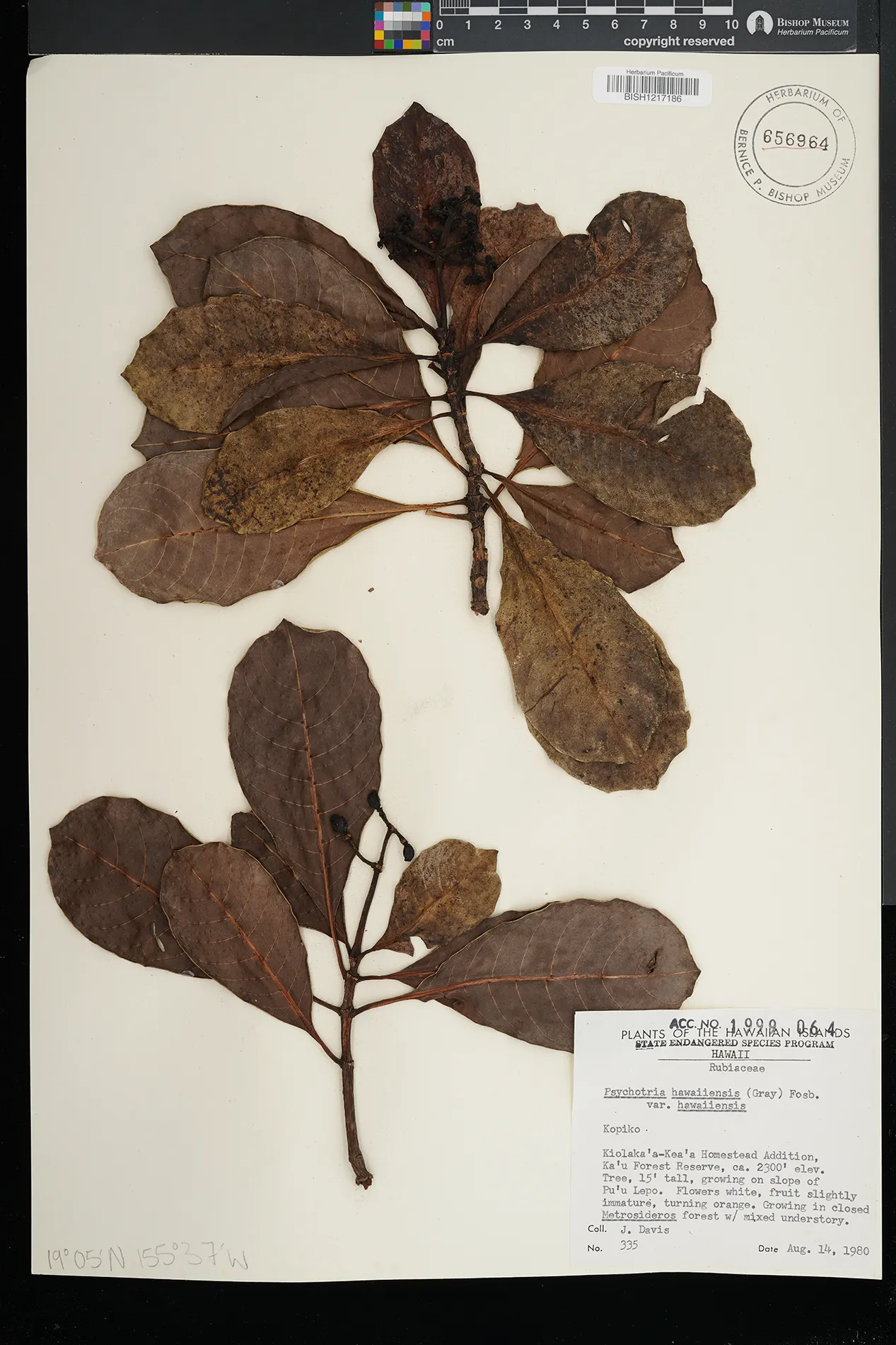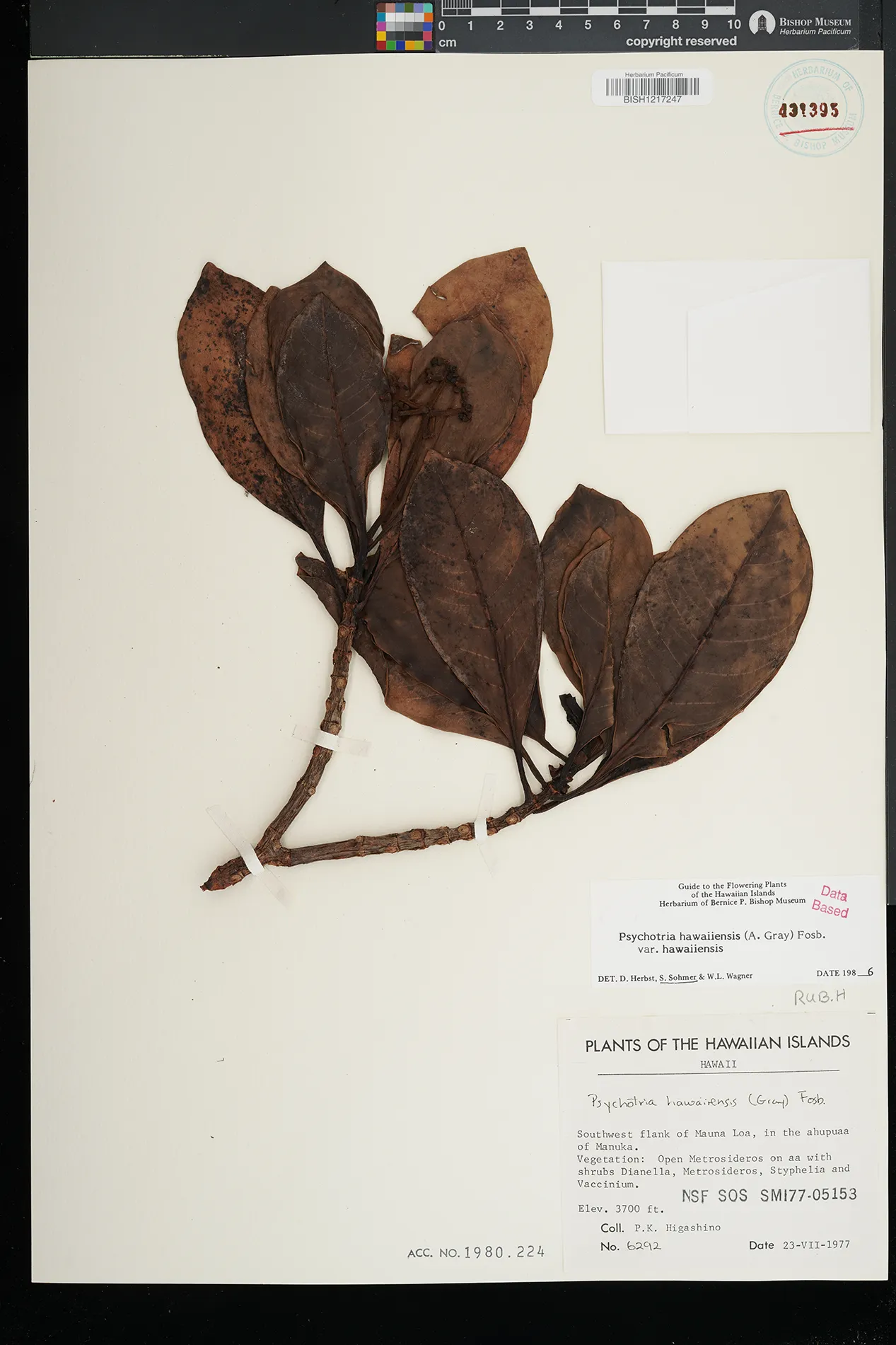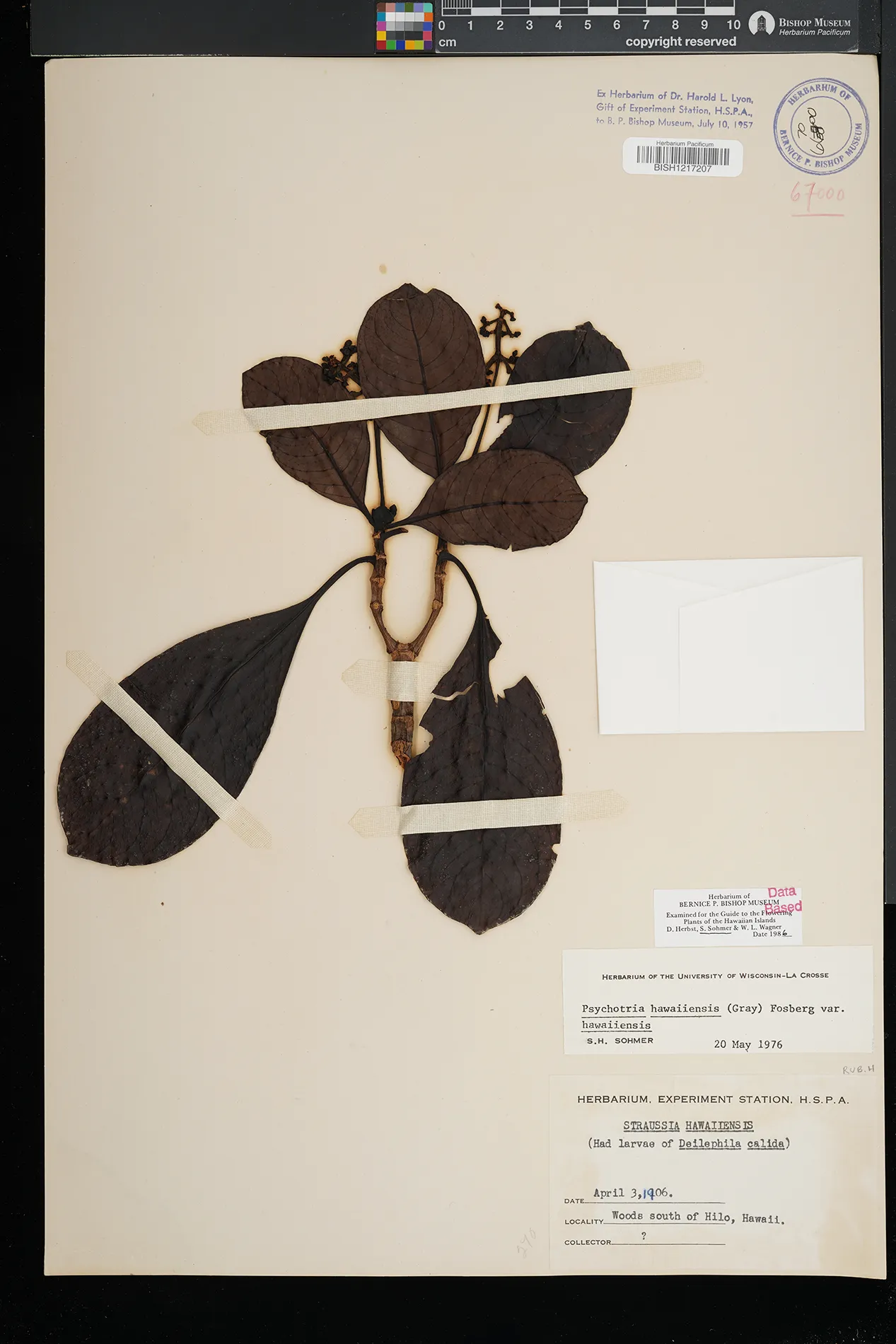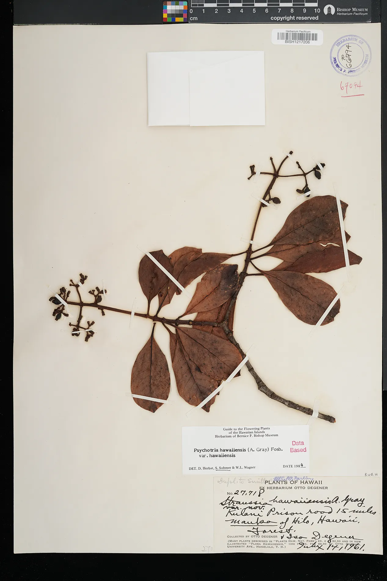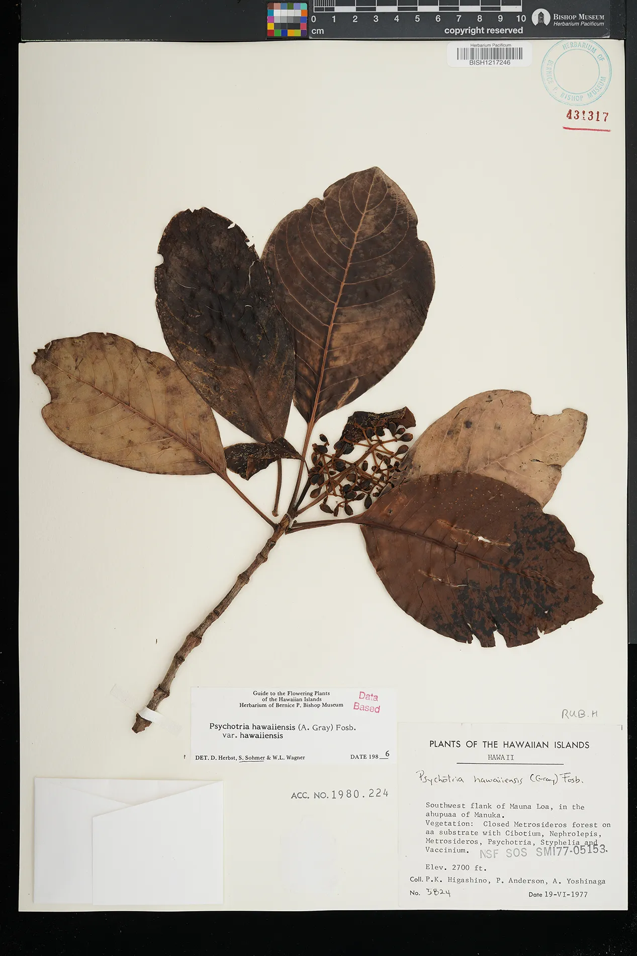 HAWAII: Kau District; Honomalino. 2300 ft. elev. transect for TNC survey (700 m); Metrosideros lowland mesic forest with Pisonia sandwicensis, Wikstroemia, Psychotria hawaiiensis vars. hawaiiensis & hillebrandii, Flueggea, Cyrtandra menziesii, Cyrtomium caryotidium & falcatum, Hedyotis acuminata, Stenogyne, Melicope, Pteris, Microlepia strigosa, Pittosporum hosmeri & hawaiiense. Elev. 700-750 m. |