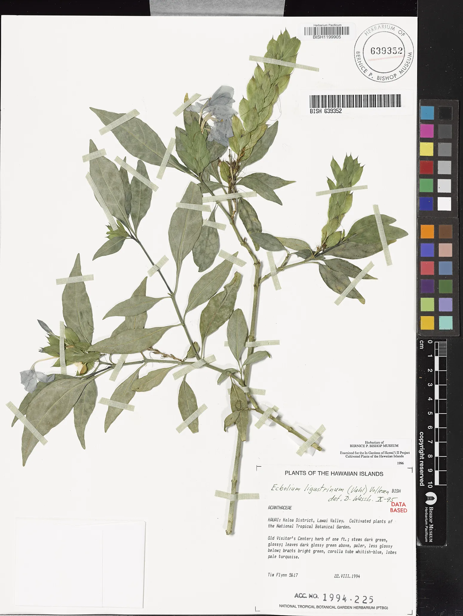 | 1 | Ecbolium ligustrinum | (Vahl) Vollesen | Lawai Valley. Cultivated plants of the National Tropical Botanical Garden. | PRESERVED_SPECIMEN | Tim Flynn | 5617 | Kauai | PTBG | 8/22/1994 | |