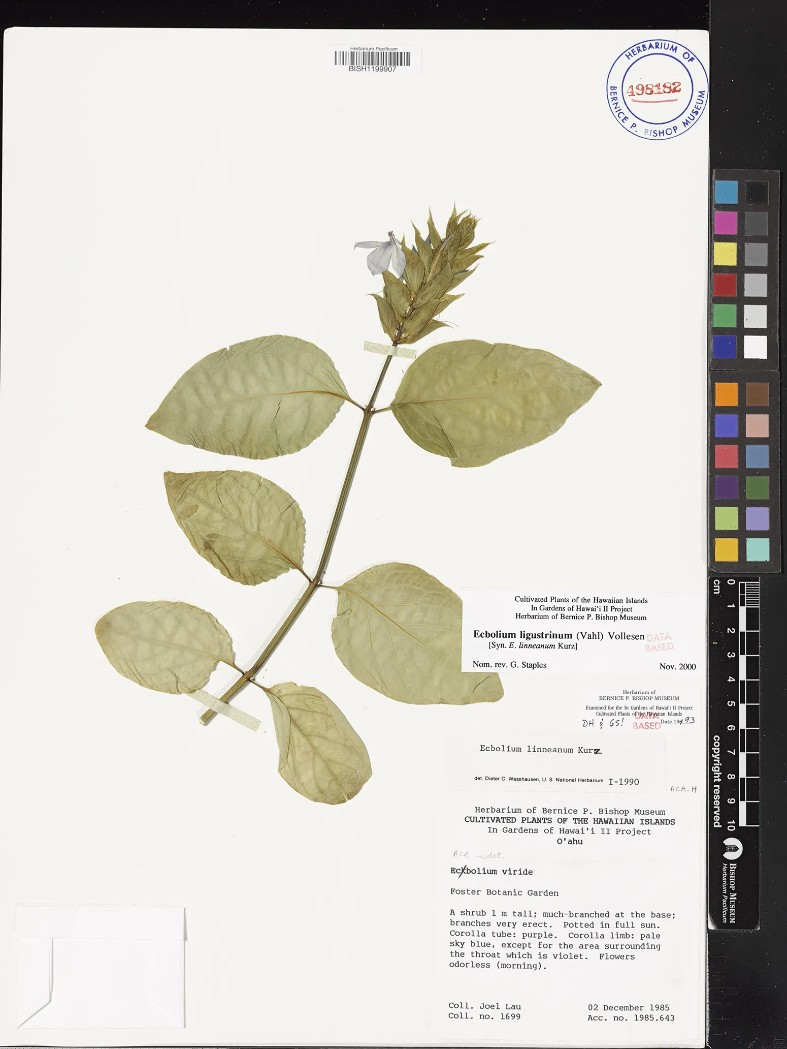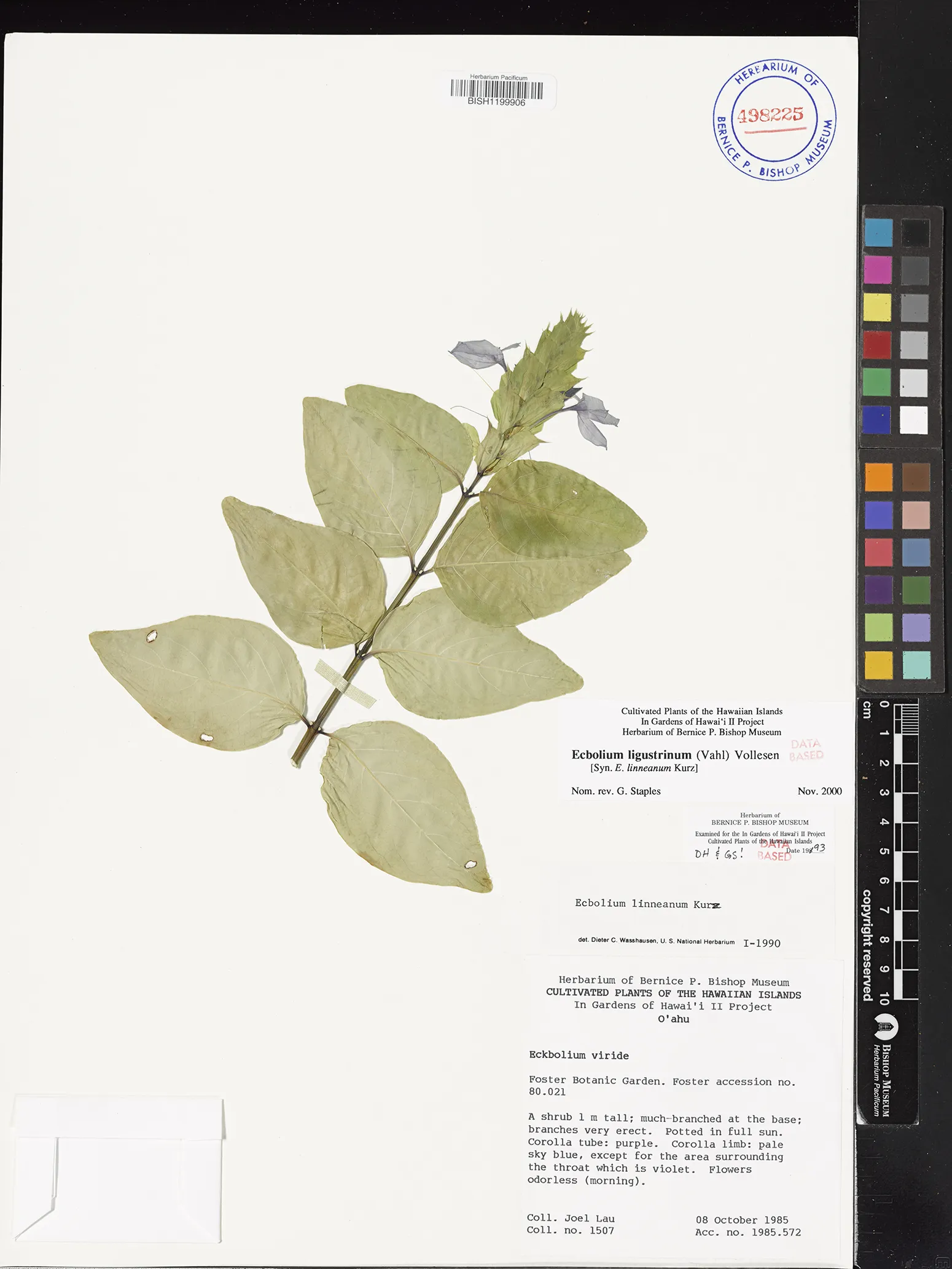 | 2 | Ecbolium ligustrinum | (Vahl) Vollesen | honolulu, foster botanic garden | Potted in full sun. | PRESERVED_SPECIMEN | lau, j. | collector number: 1507 | Oahu | BISH | 10/8/1985 |