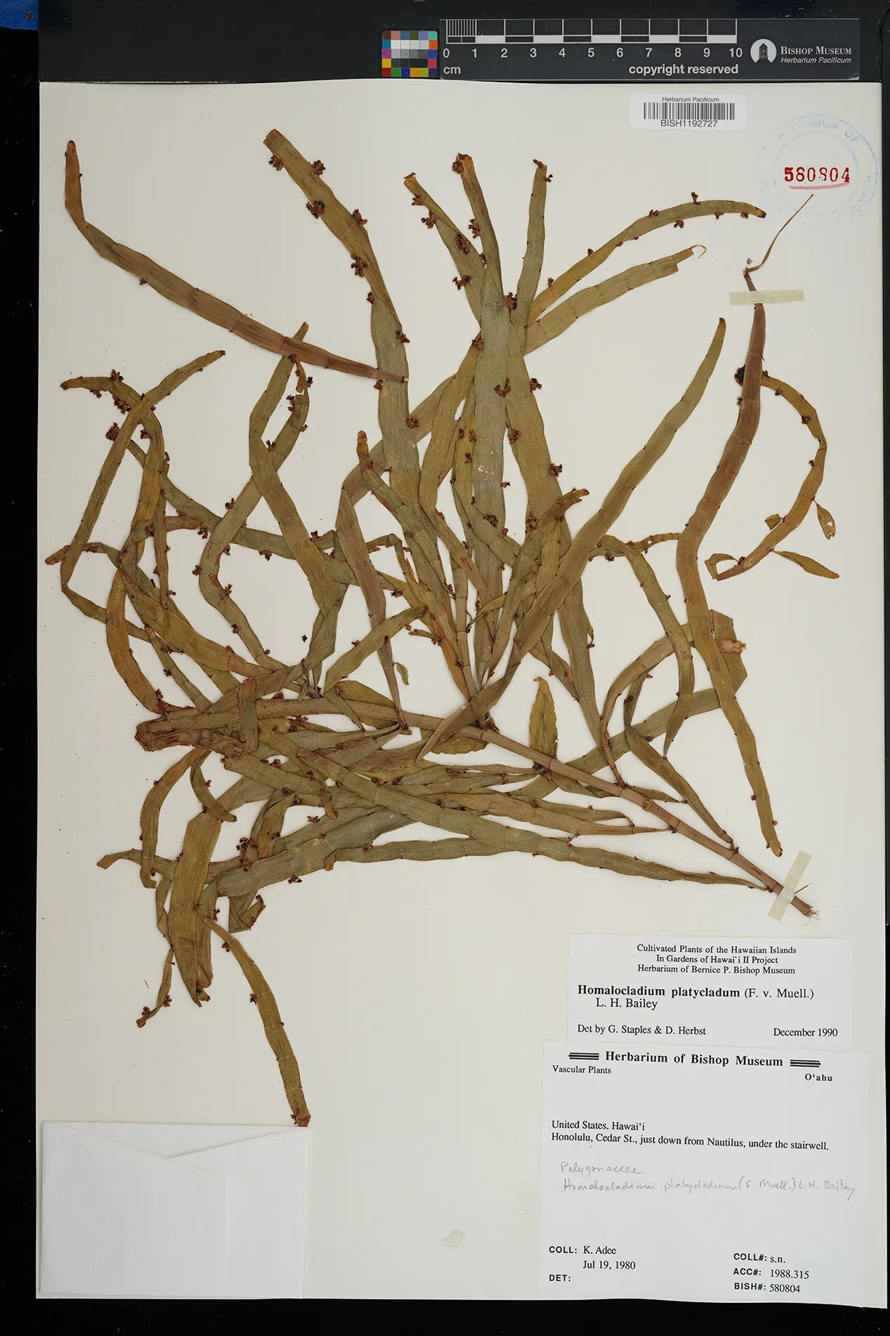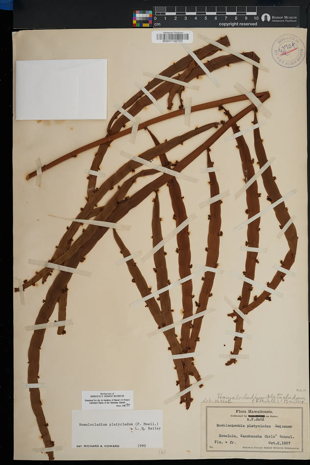 | 7 | Muehlenbeckia platyclada | (F.Muell.) Meisn. | Honolulu, Kamehameha Girls' School | PRESERVED_SPECIMEN | Judd Jr., A.F. | s.n. | Oahu | BISH | 10/2/1937 | |