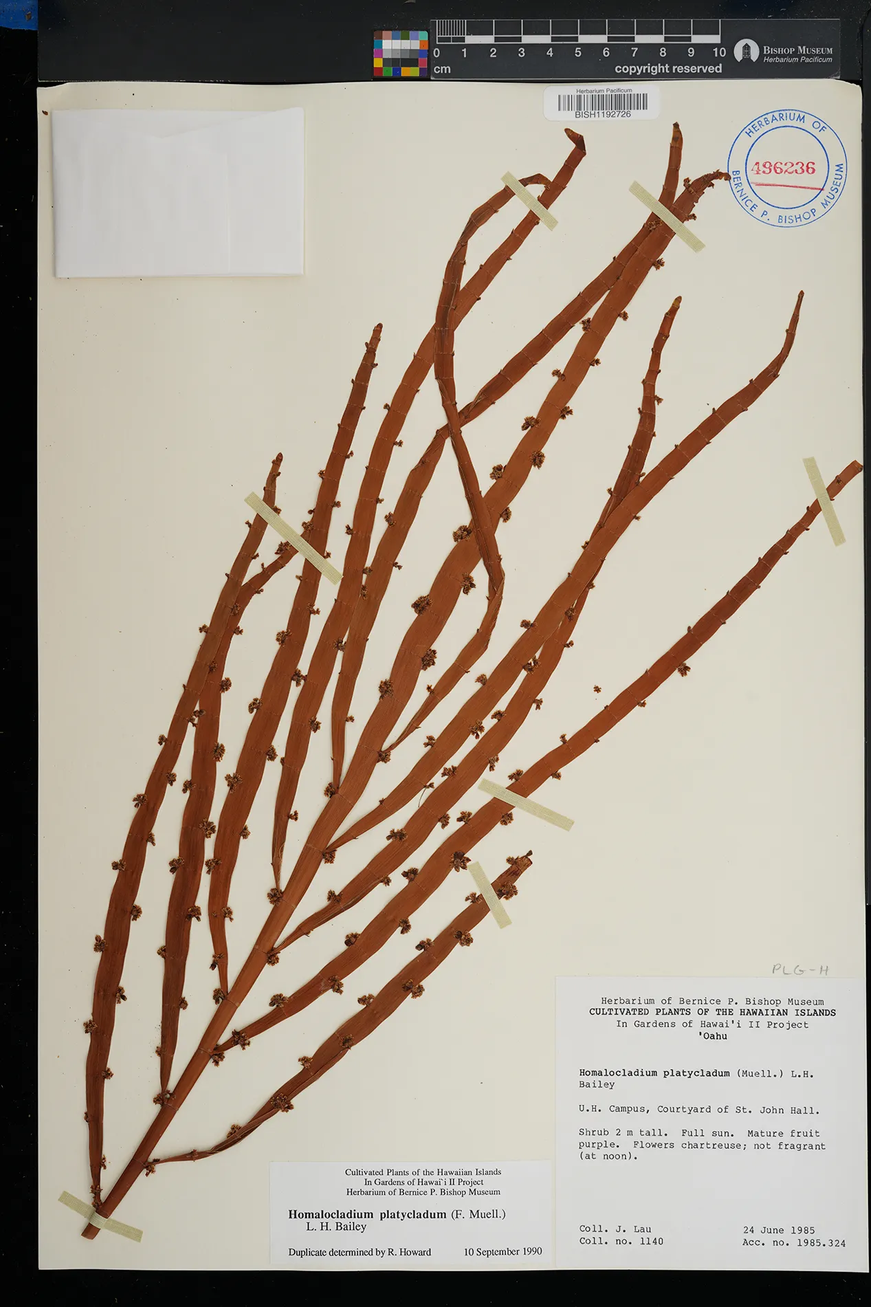 | 4 | Muehlenbeckia platyclada | (F.Muell.) Meisn. | UH campus, courtyard of St.John Hall | full sun | PRESERVED_SPECIMEN | Lau, J. | 1140 | Oahu | BISH | 6/24/1985 |