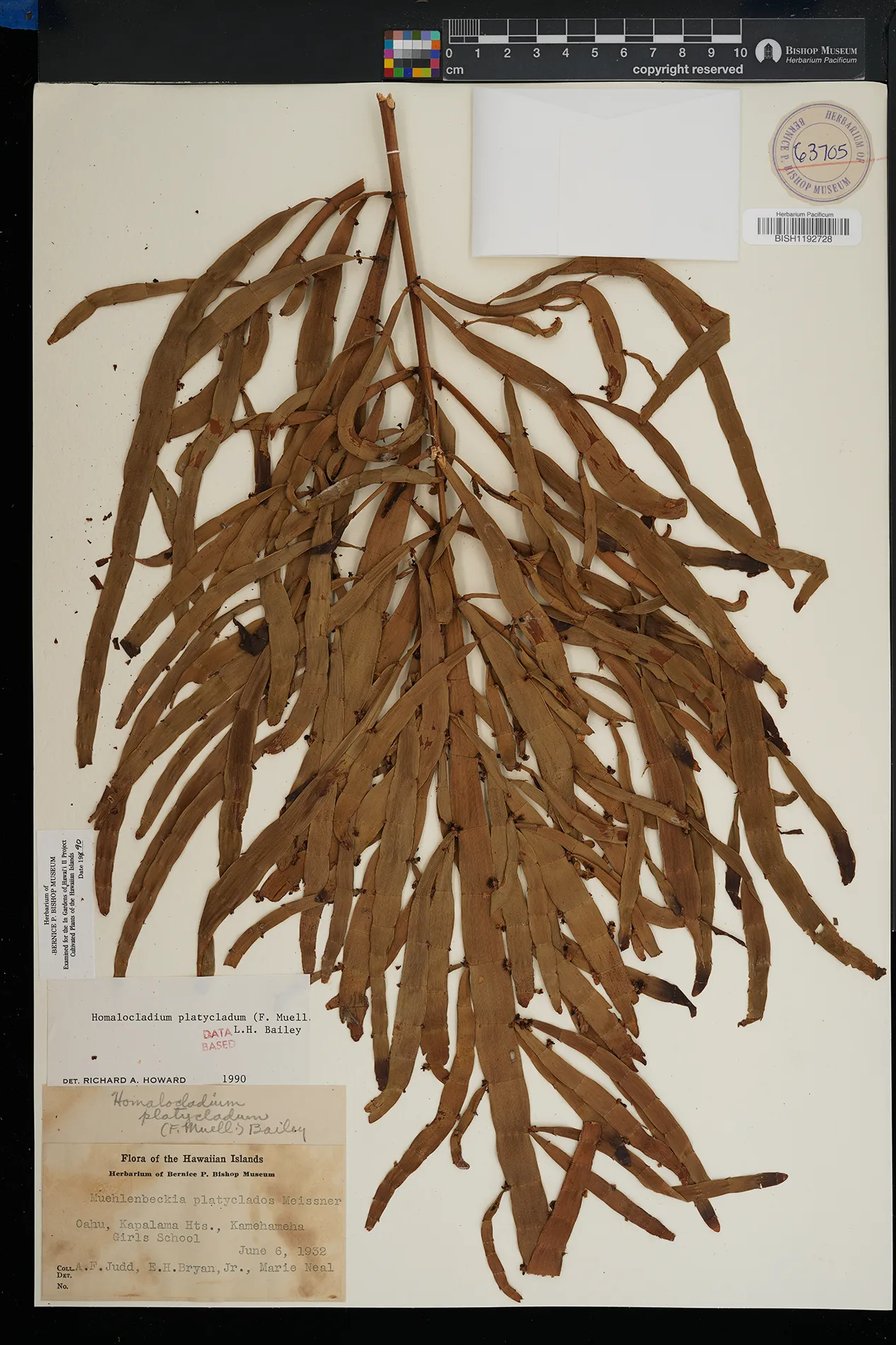 | 6 | Muehlenbeckia platyclada | (F.Muell.) Meisn. | honolulu, kamehameha girls' school, kapalama hts | PRESERVED_SPECIMEN | judd jr., a.f. bryan jr., e.h.; neal, m.c. | Oahu | BISH | 6/6/1932 | ||