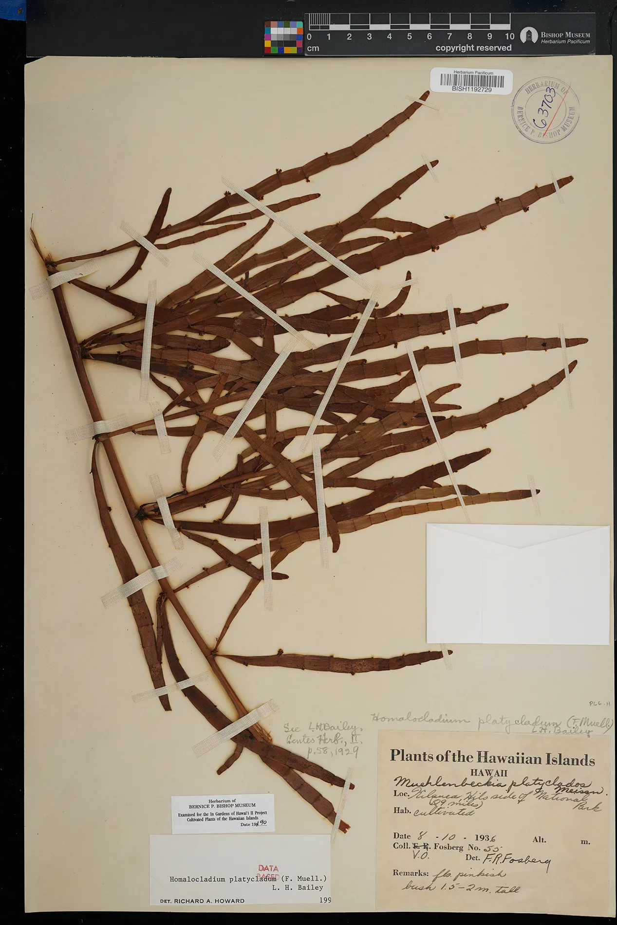| 3 | Muehlenbeckia platyclada | (F.Muell.) Meisn. | kilauea, hilo side of national park | PRESERVED_SPECIMEN | fosberg, v.o. | collector number: 55 | Hawaii | BISH | 8/10/1936 | |