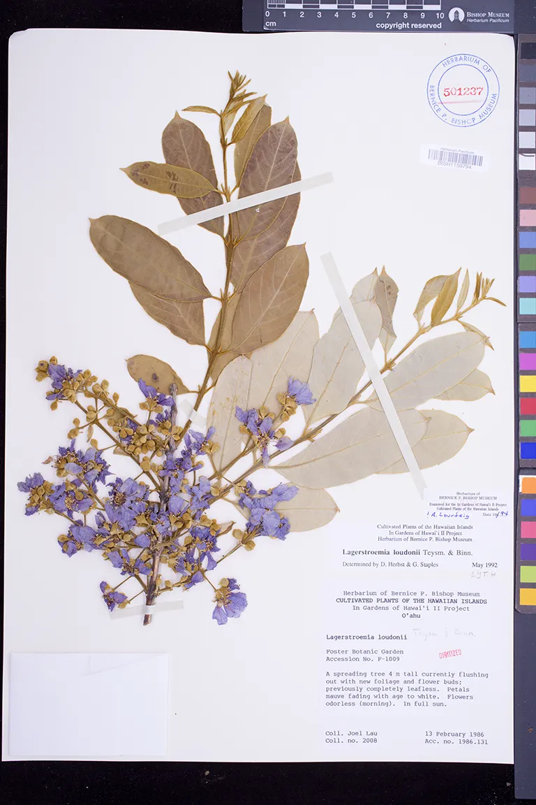 | 2 | Lagerstroemia loudonii | Teijsm. & Binn. | foster botanic garden | full sun | PRESERVED_SPECIMEN | lau, j. | collector number: 2008 | Oahu | BISH | 2/13/1986 |
