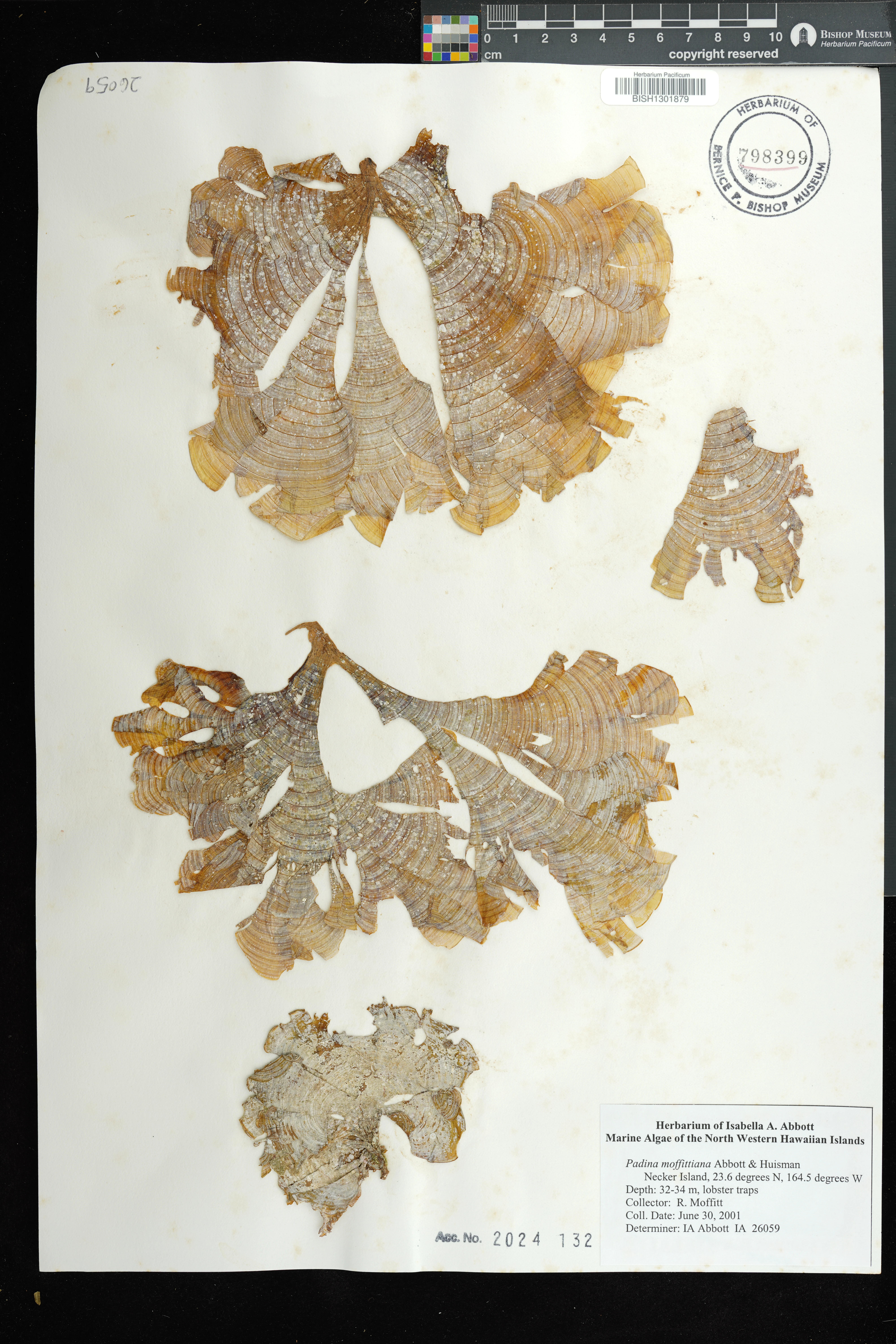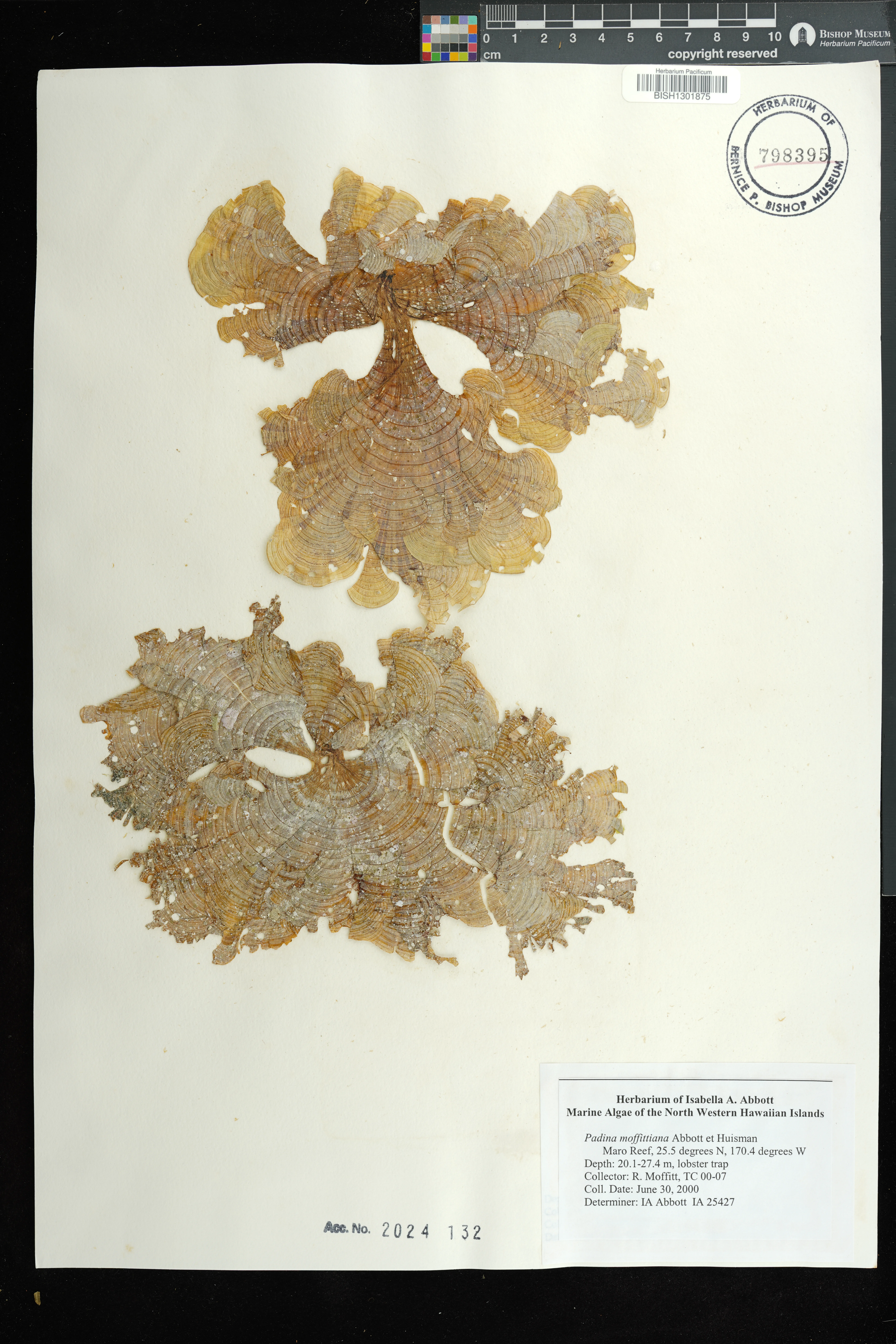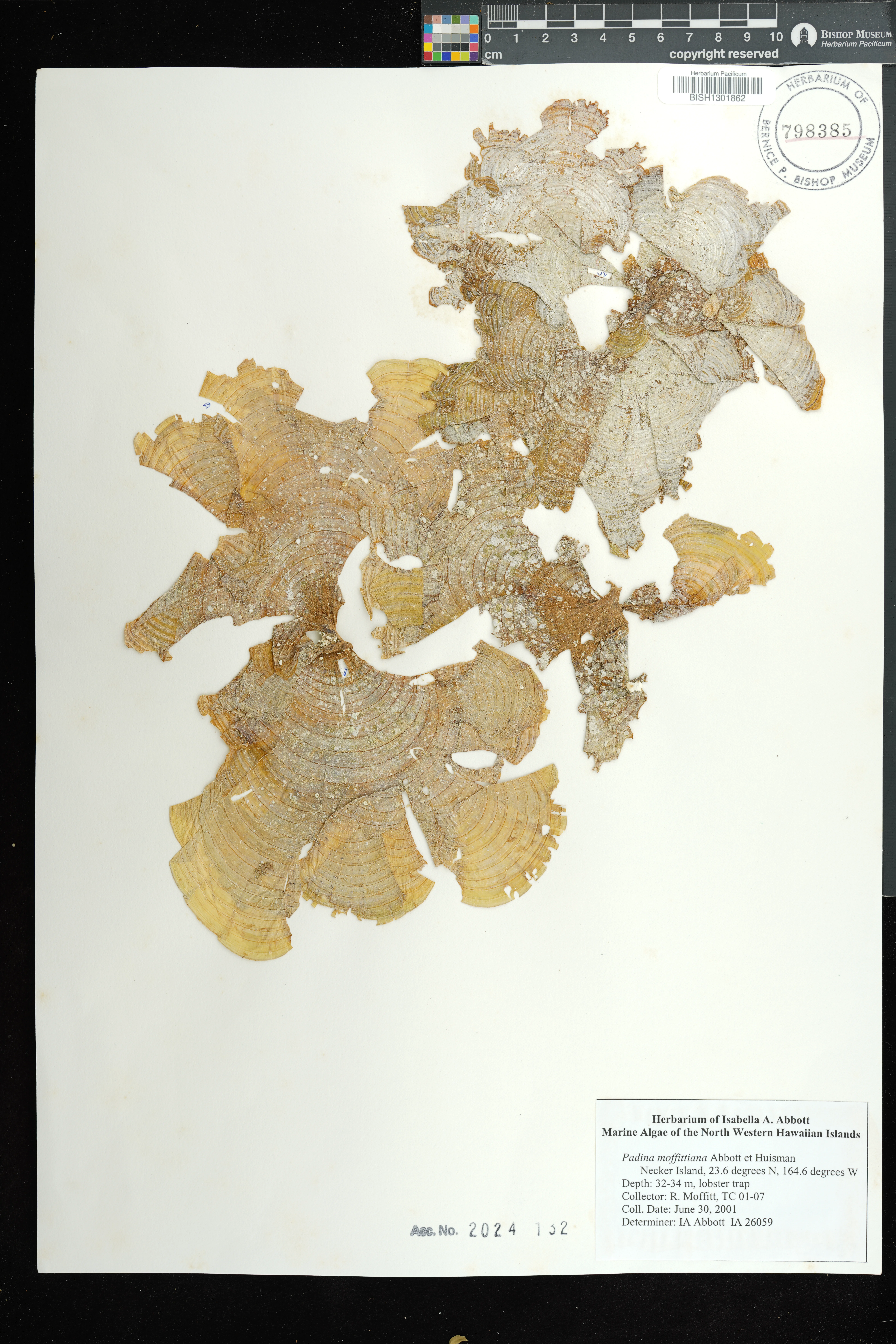 | 58 | Padina moffittiana | Maro Reef | Lobster traps | Preserved_Specimen | Moffitt, R. | 31669 | Maro Reef | BISH | 2006-06-21 | |