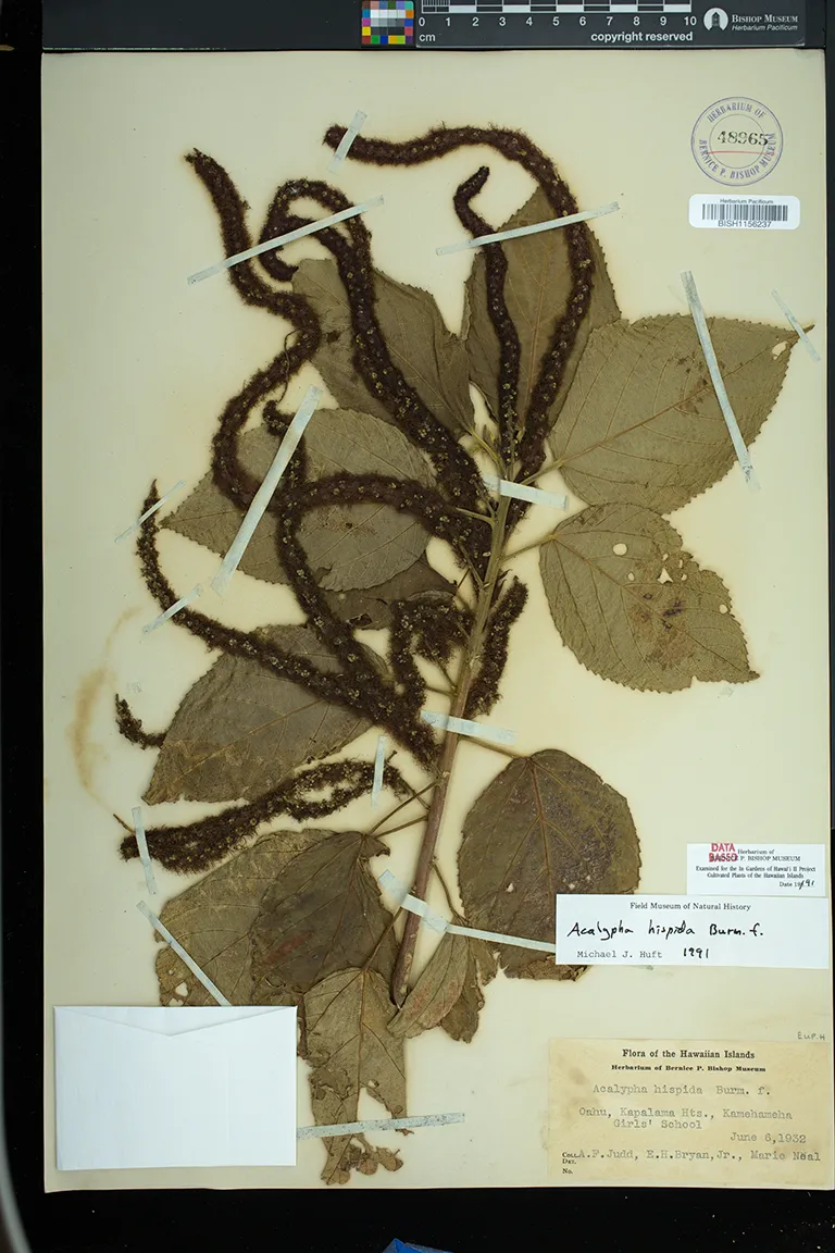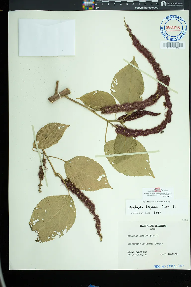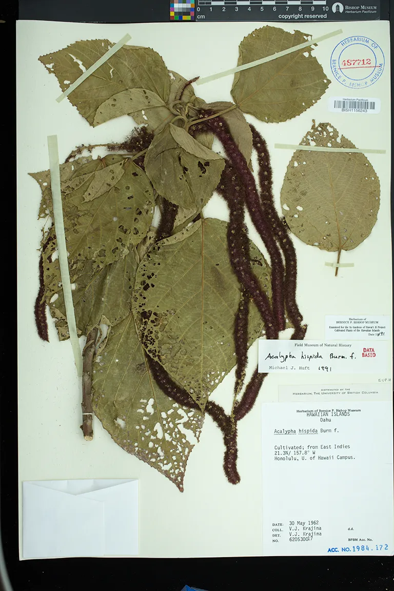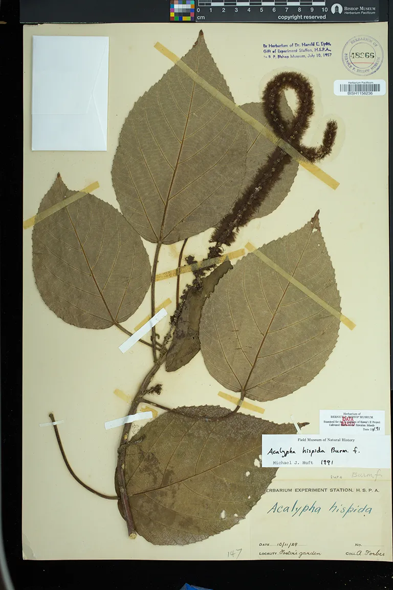 | 7 | Acalypha hispida | Burm.f. | Foster's Garden | PRESERVED_SPECIMEN | Forbes, A. | s.n. | Oahu | BISH | 10/11/1929 | |