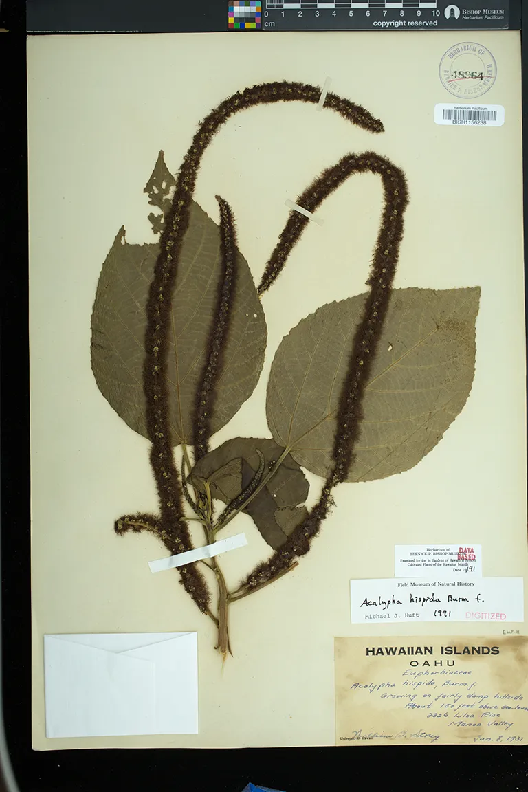 | 8 | Acalypha hispida | Burm.f. | 2336 liloa rise, manoa valley | Growing on fairly damp hillside. | PRESERVED_SPECIMEN | storey, w.b. | collector number: s.n. | Oahu | BISH | 1/8/1931 |