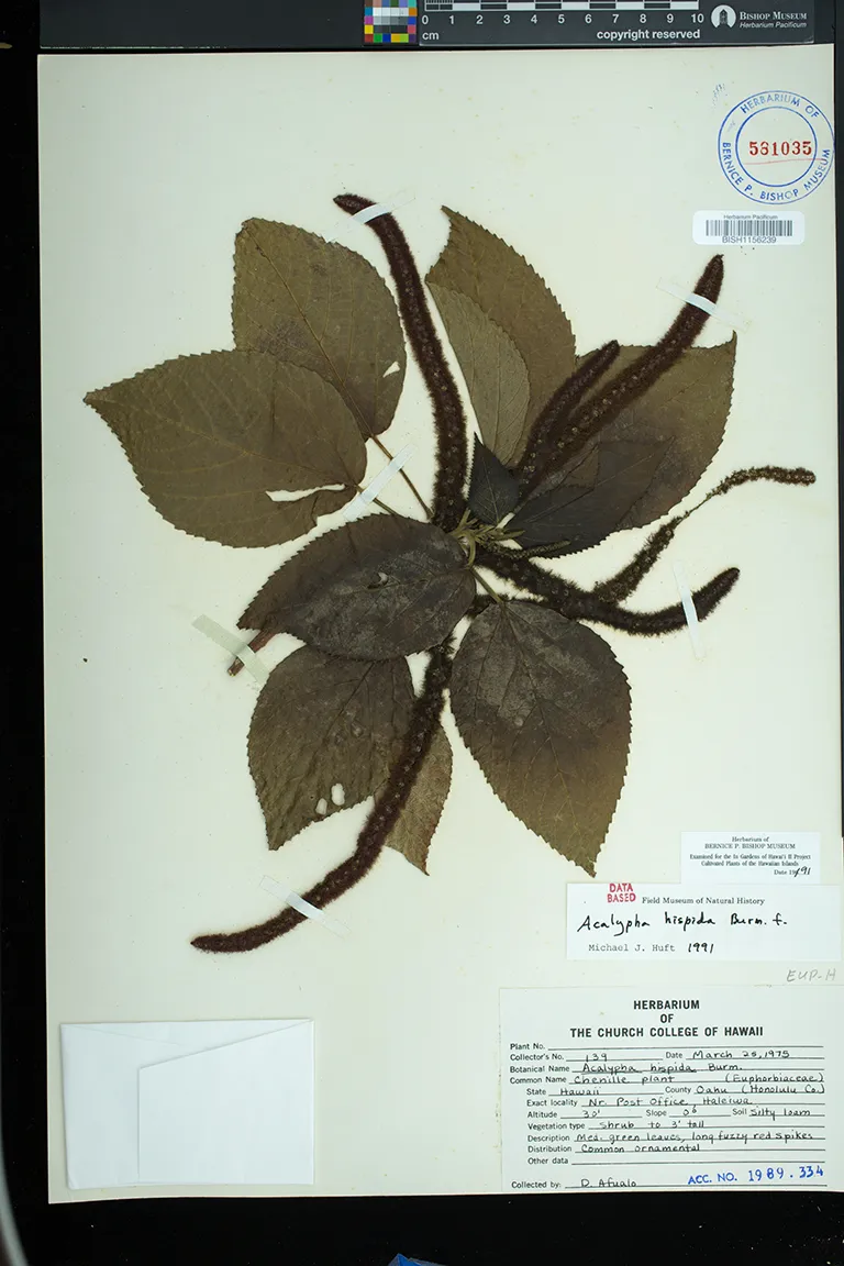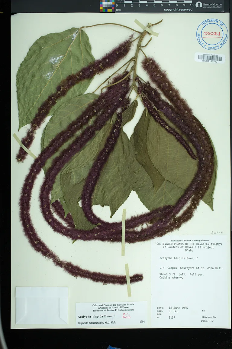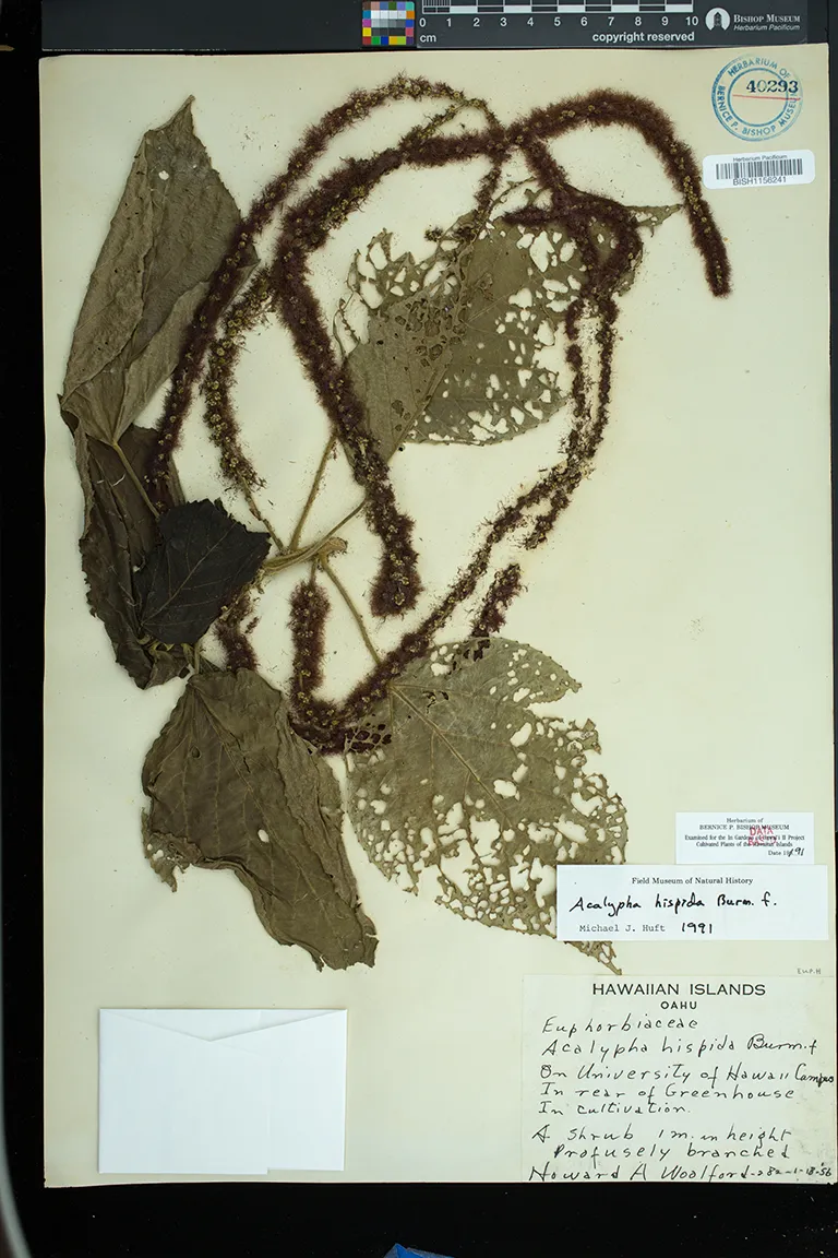 | 13 | Acalypha hispida | Burm.f. | foster's garden | PRESERVED_SPECIMEN | forbes, a. | collector number: s.n. | Oahu | BISH | 10/11/1929 | |