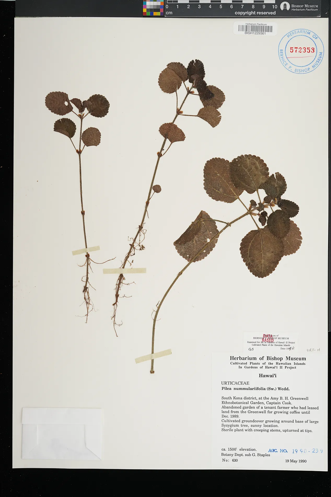 Abandoned garden of tenant farmer who had leased land from the Greenwell for growing coffee until Dec. 1989. Groundcover, base of large Syzygium tree, sunny |