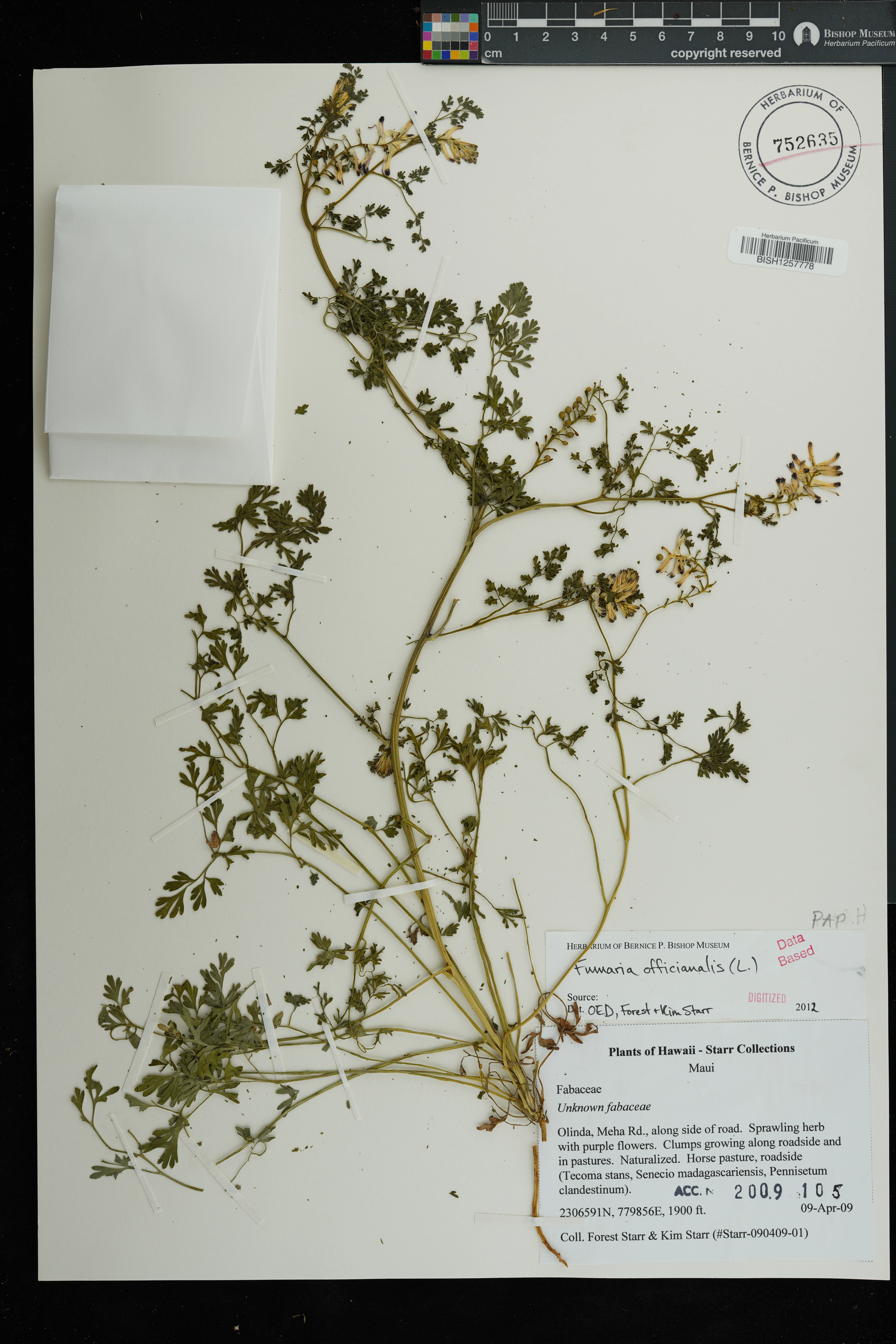 | 3 | Fumaria officinalis | L. | Olinda, Meha Road, along side of road. | Clumps growing along roadside and in pastures. Naturalized. Horse pasture, roadside (Tecoma stans, Senecio madagascariensis, Pennisetum clandestinum.) | PRESERVED_SPECIMEN | Starr, F. | 090409-01 | Maui | BISH | 4/9/2009 |