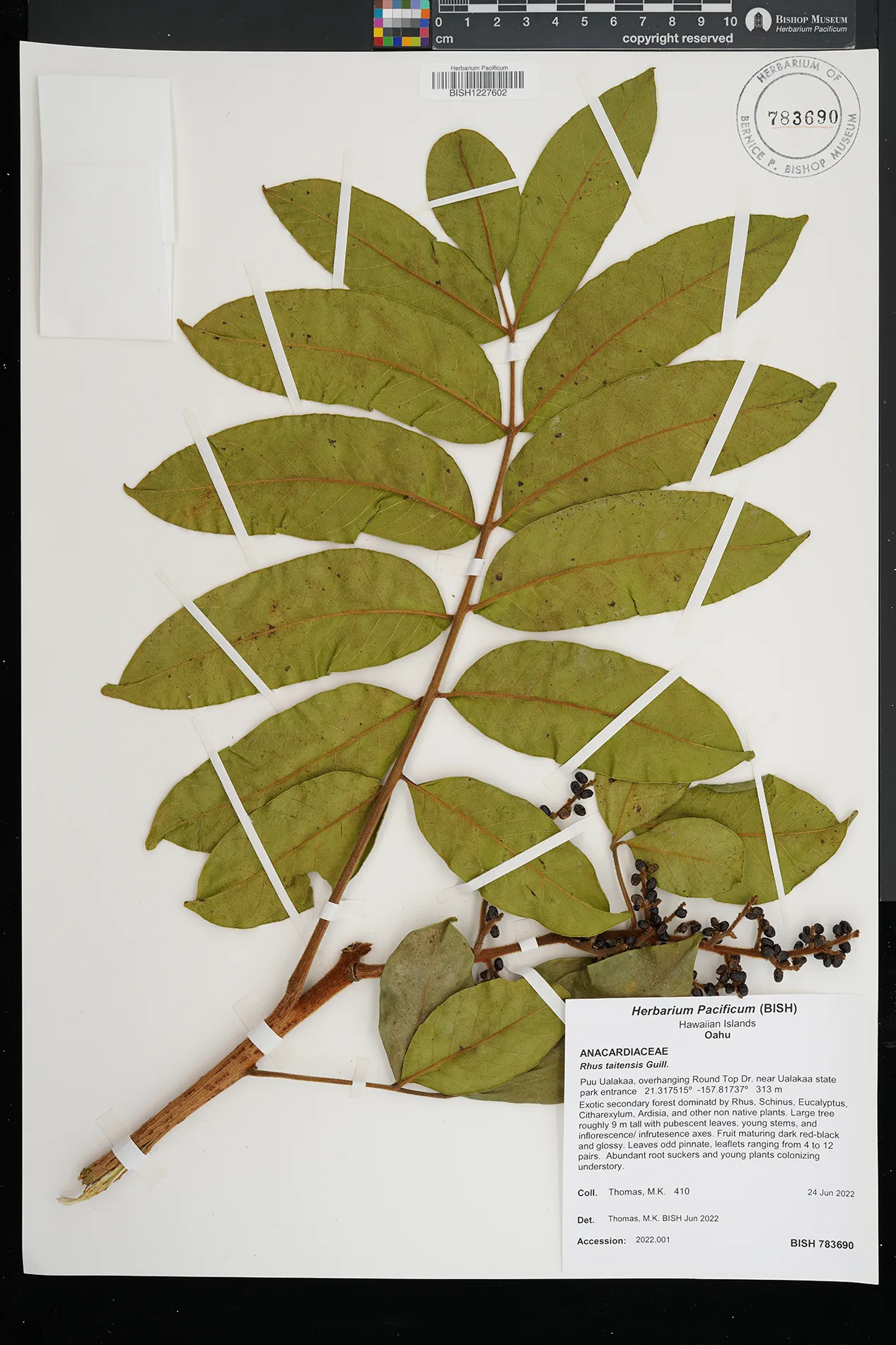 | 13 | Rhus taitensis | Guill. | Hoomaluhia Botanical Garden, along main road. | PRESERVED_SPECIMEN | N. Hoffman | s.n. | Oahu | PTBG | 12/11/2006 | |