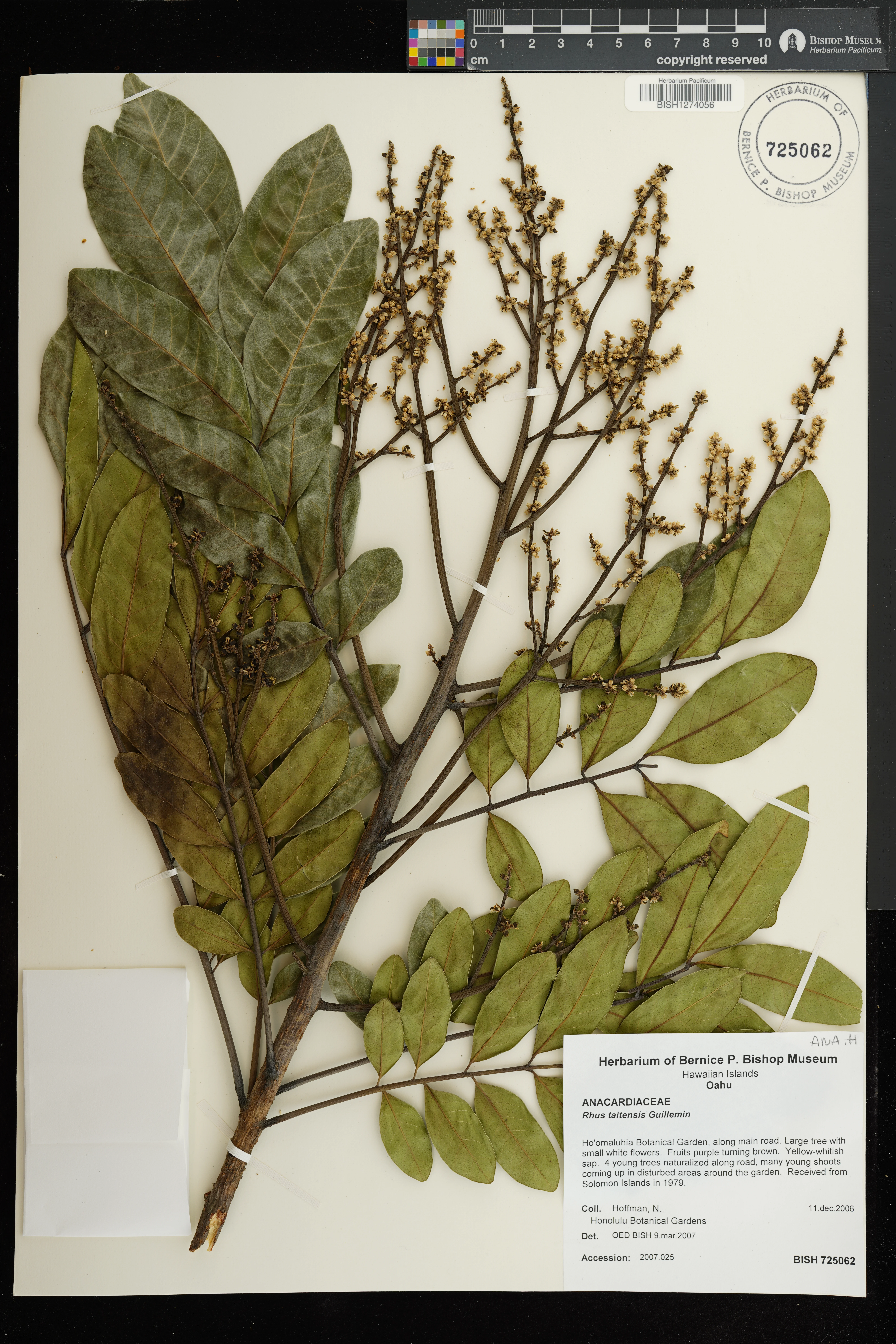 | 12 | Rhus taitensis | Guill. | honolulu, manoa valley, lyon arboretum | PRESERVED_SPECIMEN | d. anderson | s.n. | Oahu | US | 3/9/1960 | |
