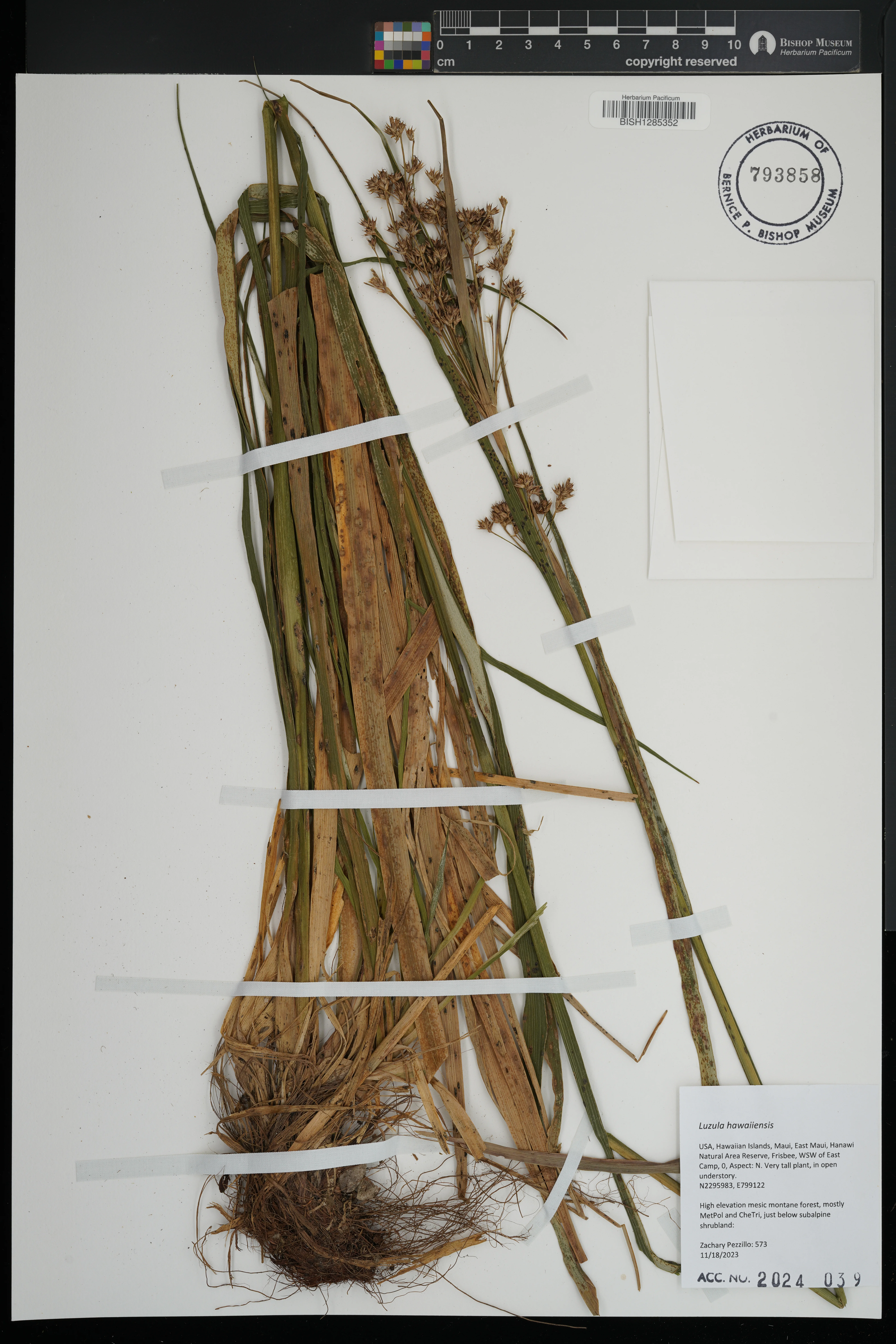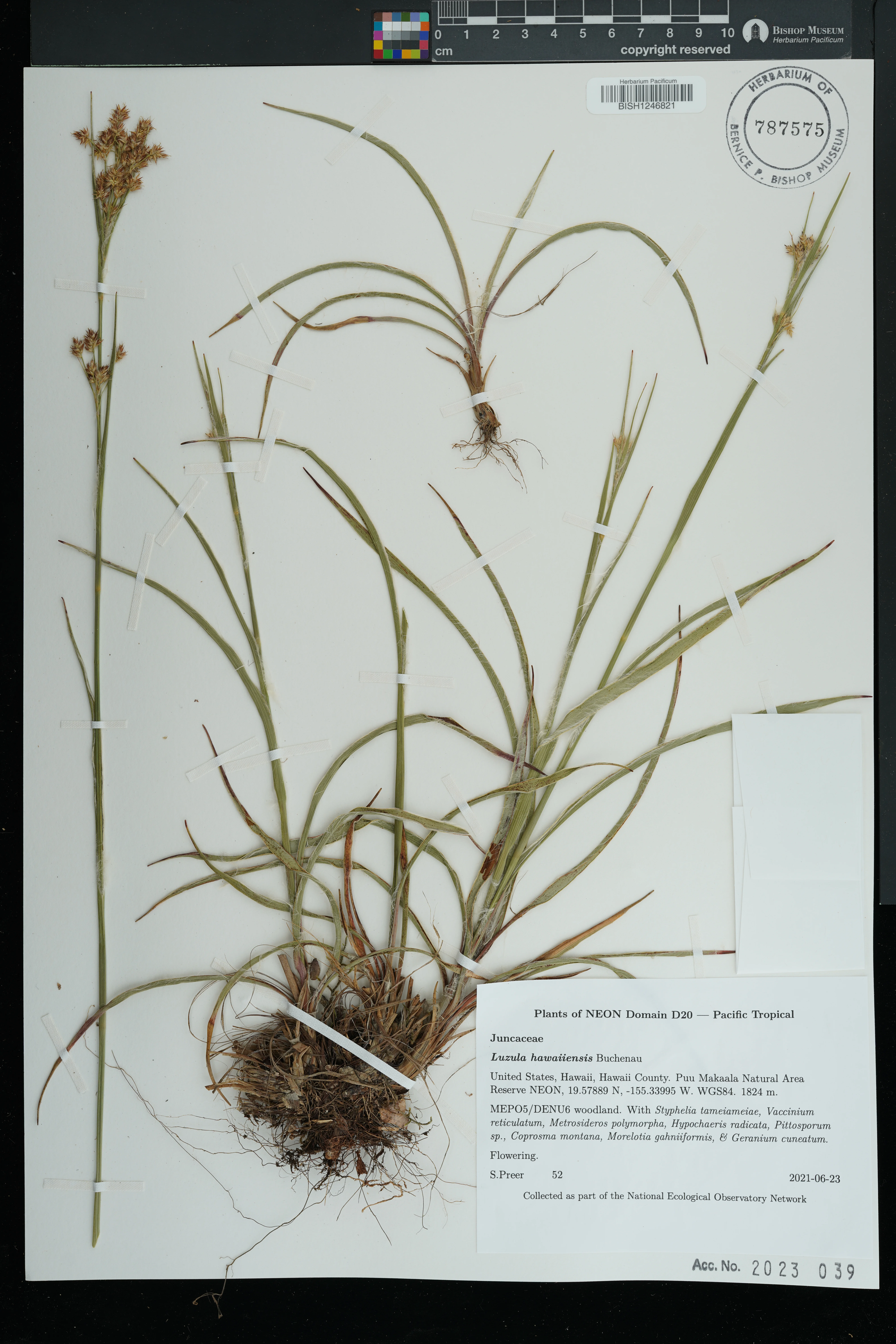 In Metrosideros polymorpha montane wet forest with Athyrium sandwichianum, Cyrtandra, Broussaisia, Cibotium, Clermontia, Cyanea, Eurya, Hedyotis terminalis, Ilex, Melicope, Plantago, Labordia, Stenogyne, Wikstroemia, many ferns |
