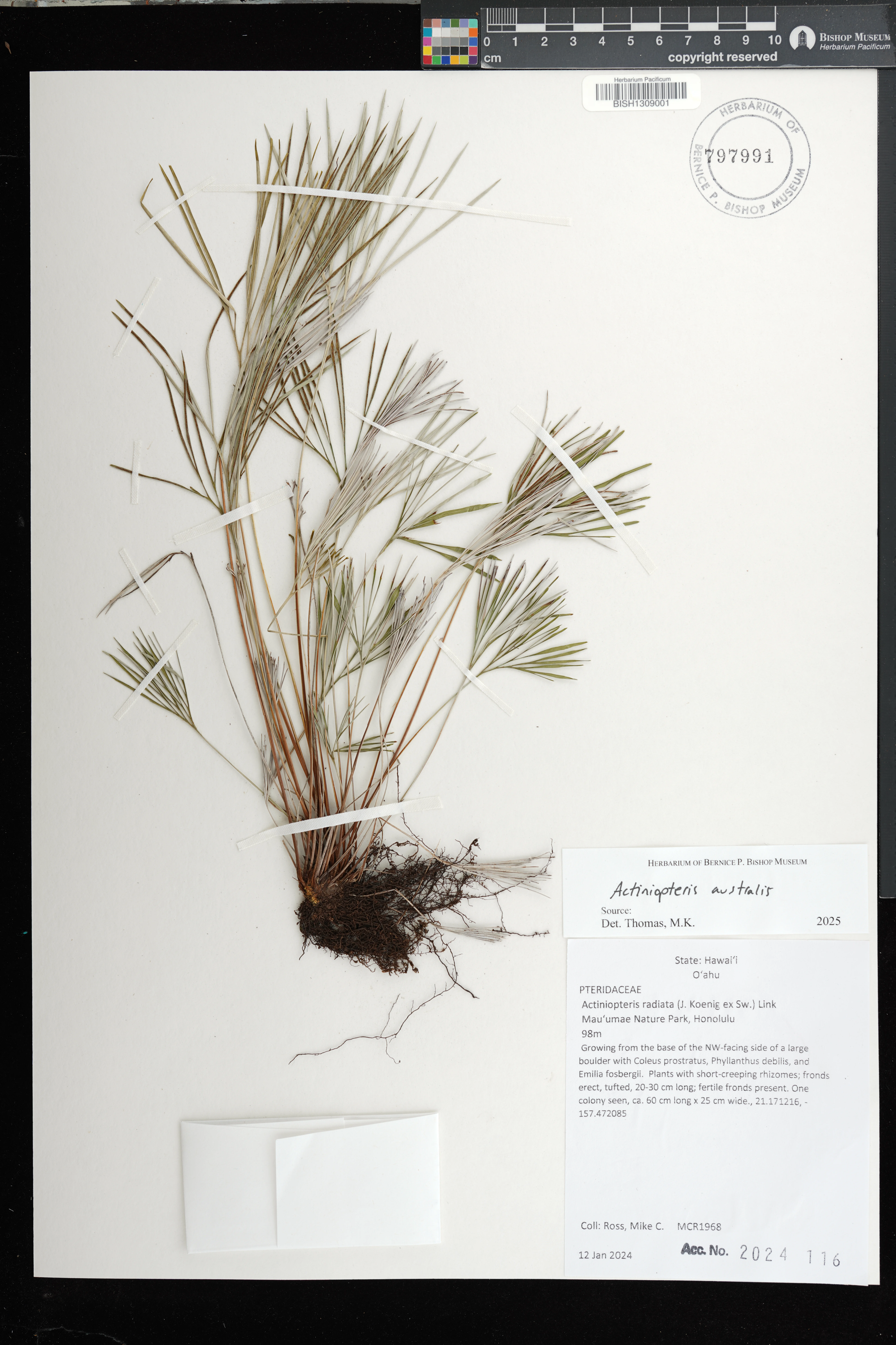 Kingdom: Viridiplantae Phylum: Pteridophyta Class/Clade: Polypodiopsida Order: Polypodiales Family: Pteridaceae Genus: Actiniopteris