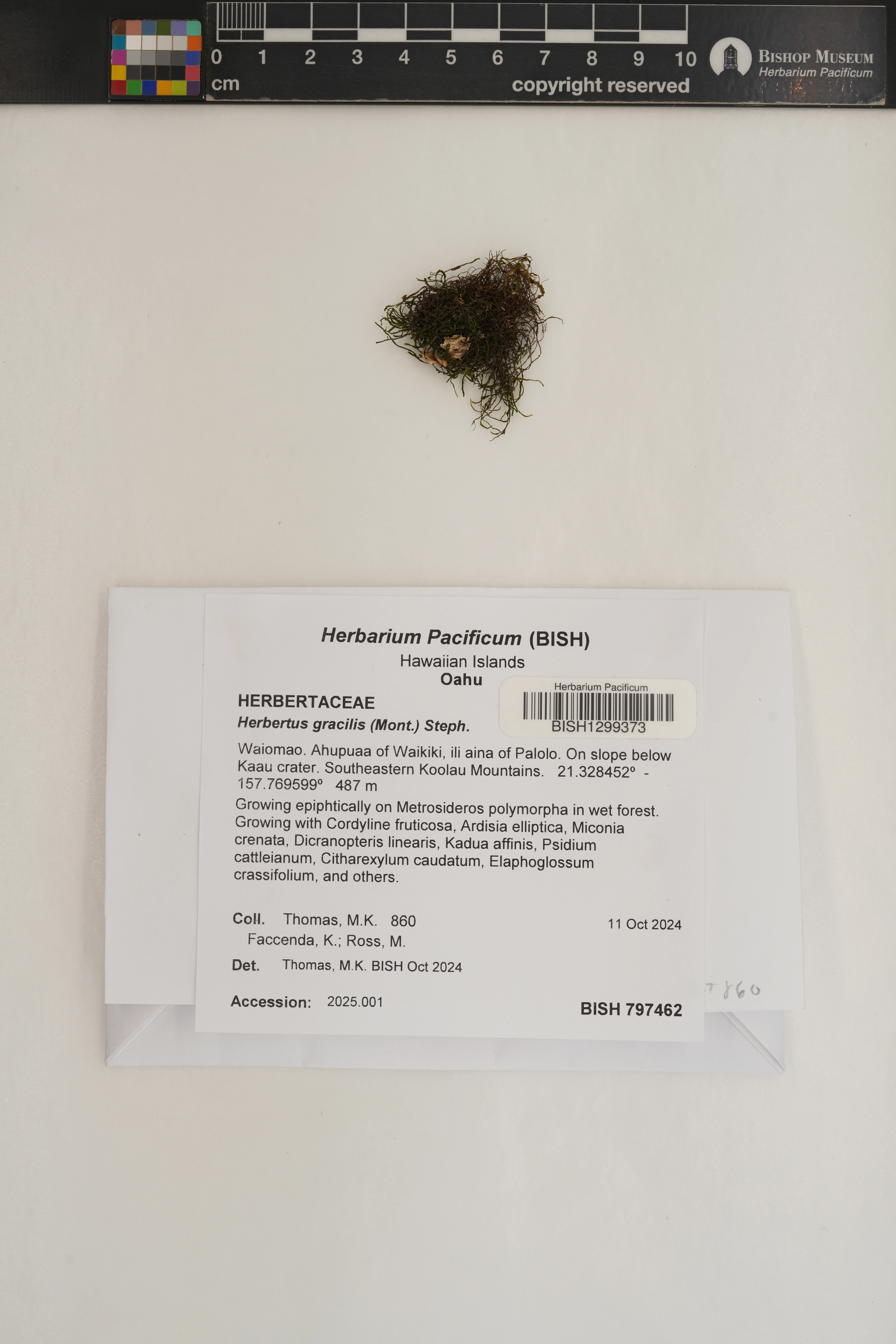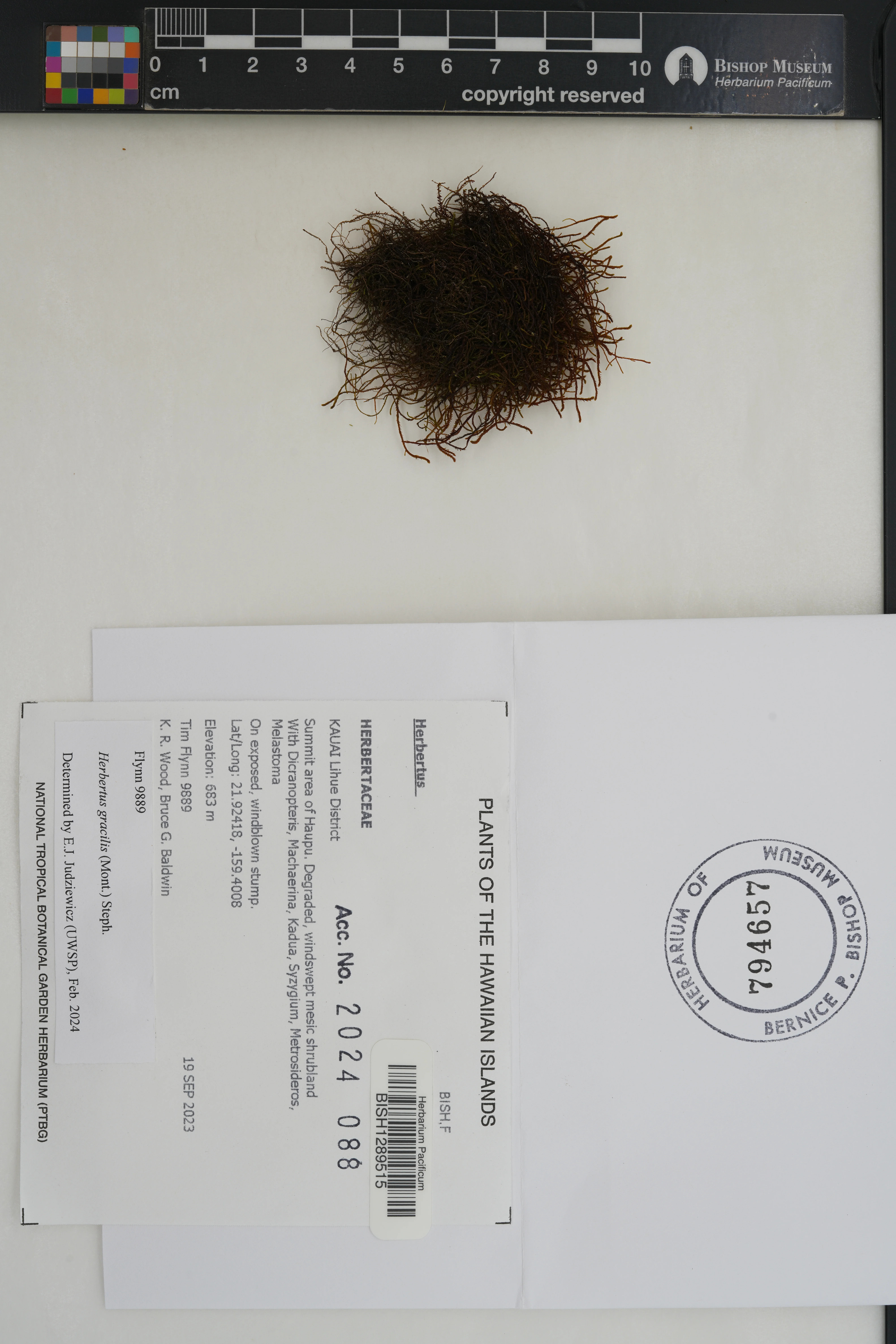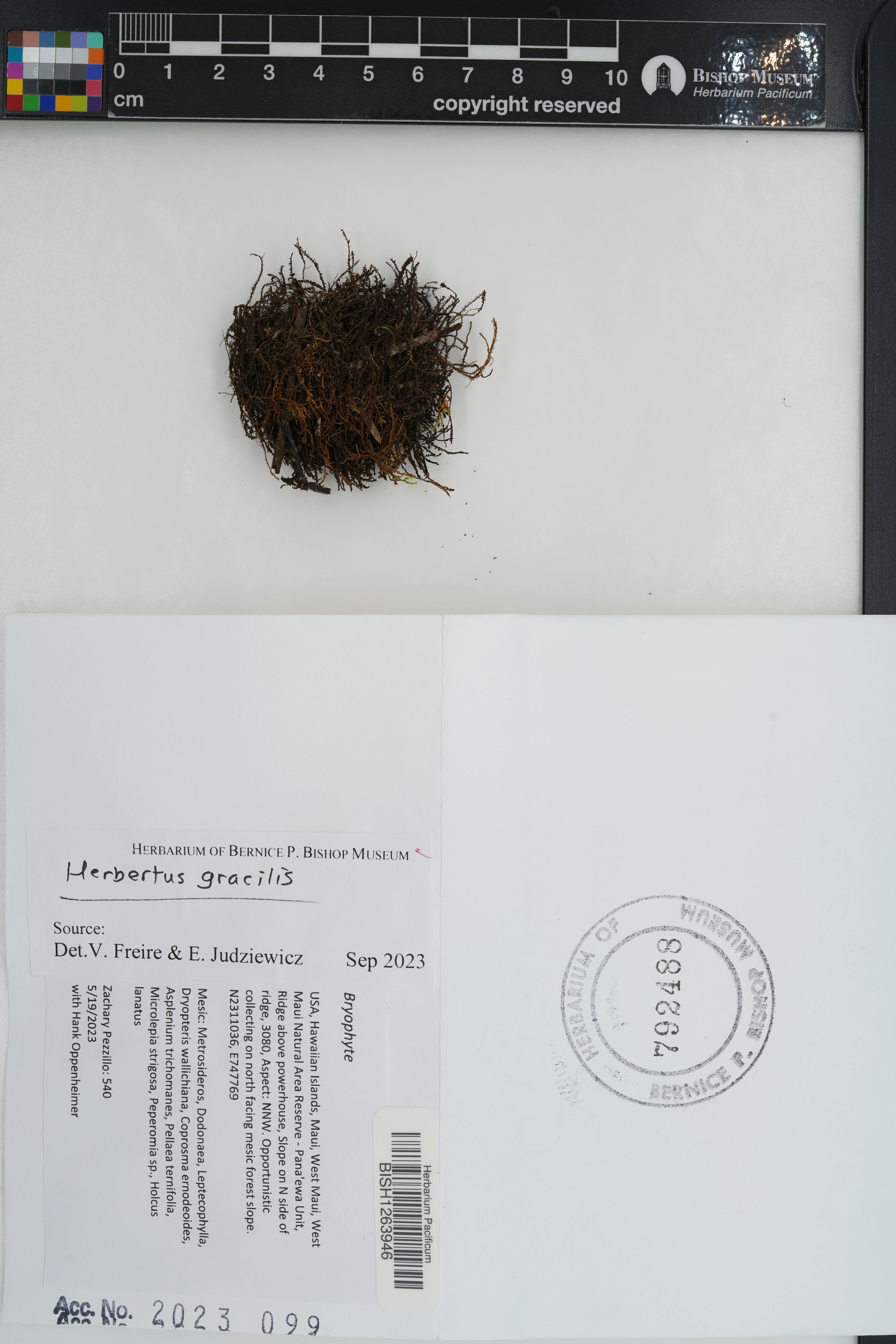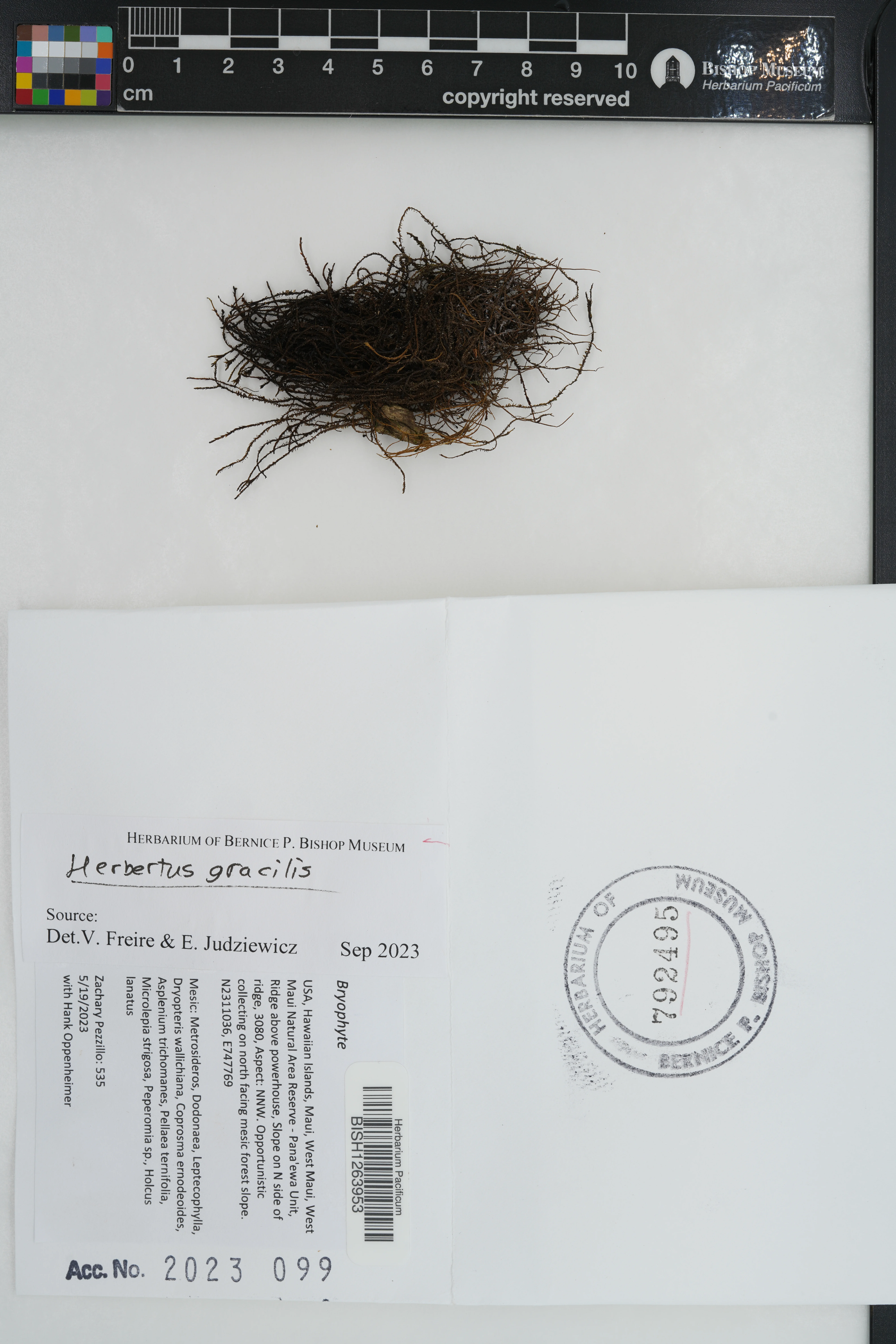 Kingdom: Viridiplantae Phylum: Marchantiophyta Class/Clade: Jungermanniopsida Order: Jungermanniales Family: Herbertaceae Genus: Herbertus