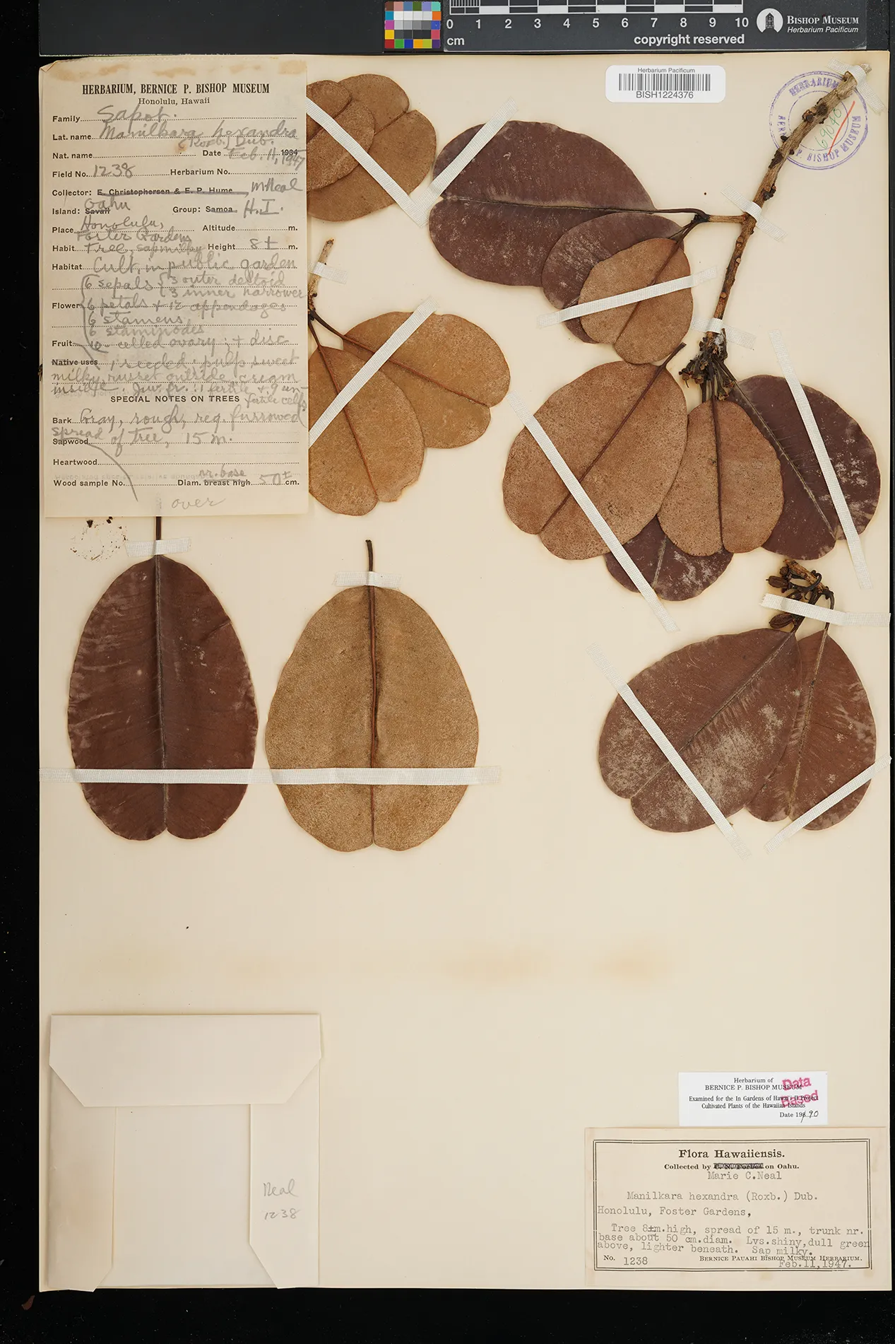 | 4 | Manilkara hexandra | (Roxb.) Dubard | Honolulu, Foster Gardens | PRESERVED_SPECIMEN | Neal, M.C. | 1238 | Oahu | BISH | 2/11/1947 | |