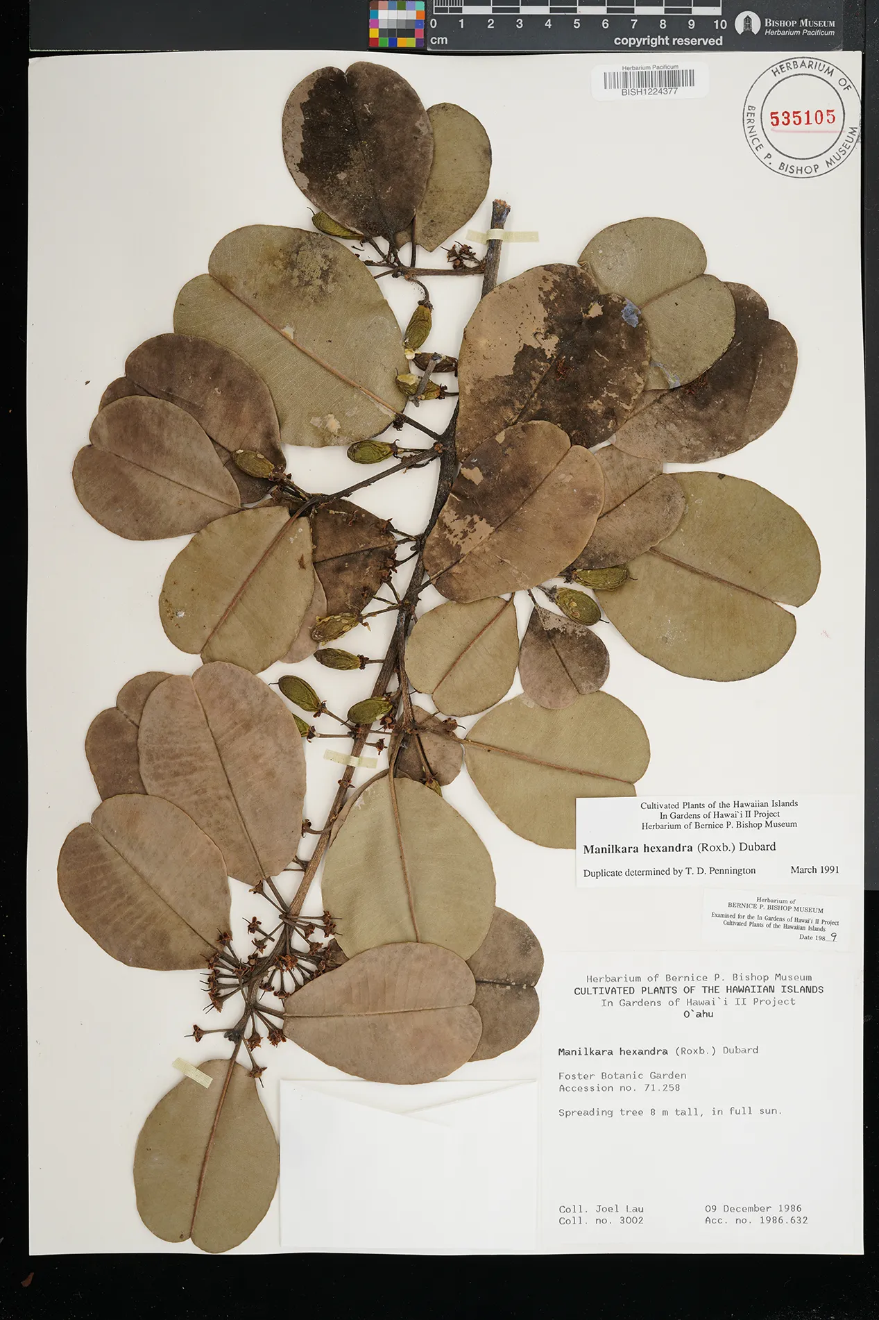 | 6 | Manilkara hexandra | (Roxb.) Dubard | honolulu, foster gardens | PRESERVED_SPECIMEN | neal, m.c. | collector number: 1238 | BISH | 2/11/1947 | ||