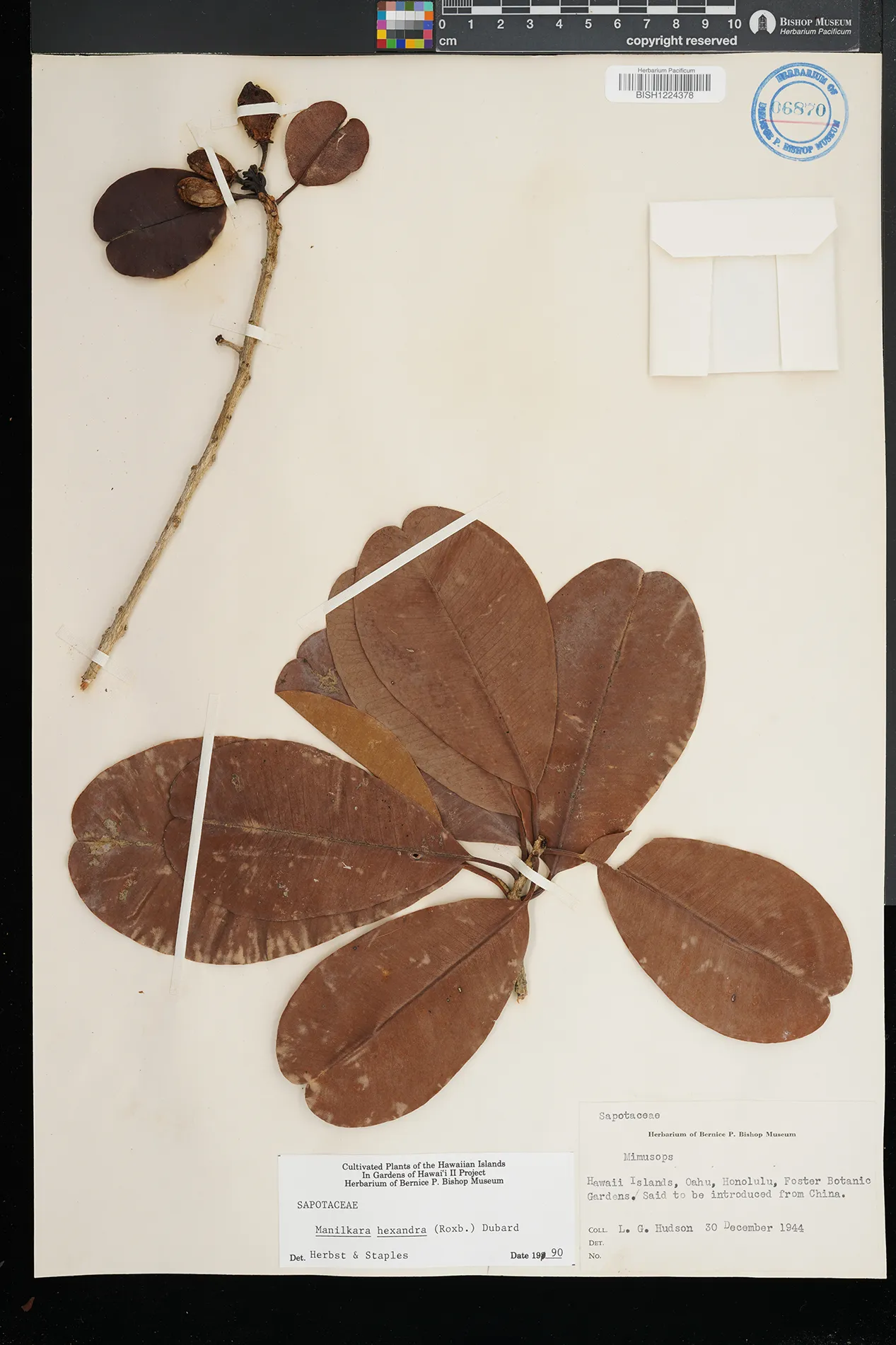 | 5 | Manilkara hexandra | (Roxb.) Dubard | Honolulu, Foster Botanic Gardens | PRESERVED_SPECIMEN | Hudson, L.G. | s.n. | Oahu | BISH | 12/30/1944 | |