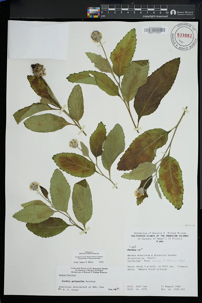 | 1 | Varronia macrocephala | Desv. | waimea arboretum and botanical garden | PRESERVED_SPECIMEN | lau, j. | collector number: 2731 | Oahu | BISH | 8/11/1986 | |