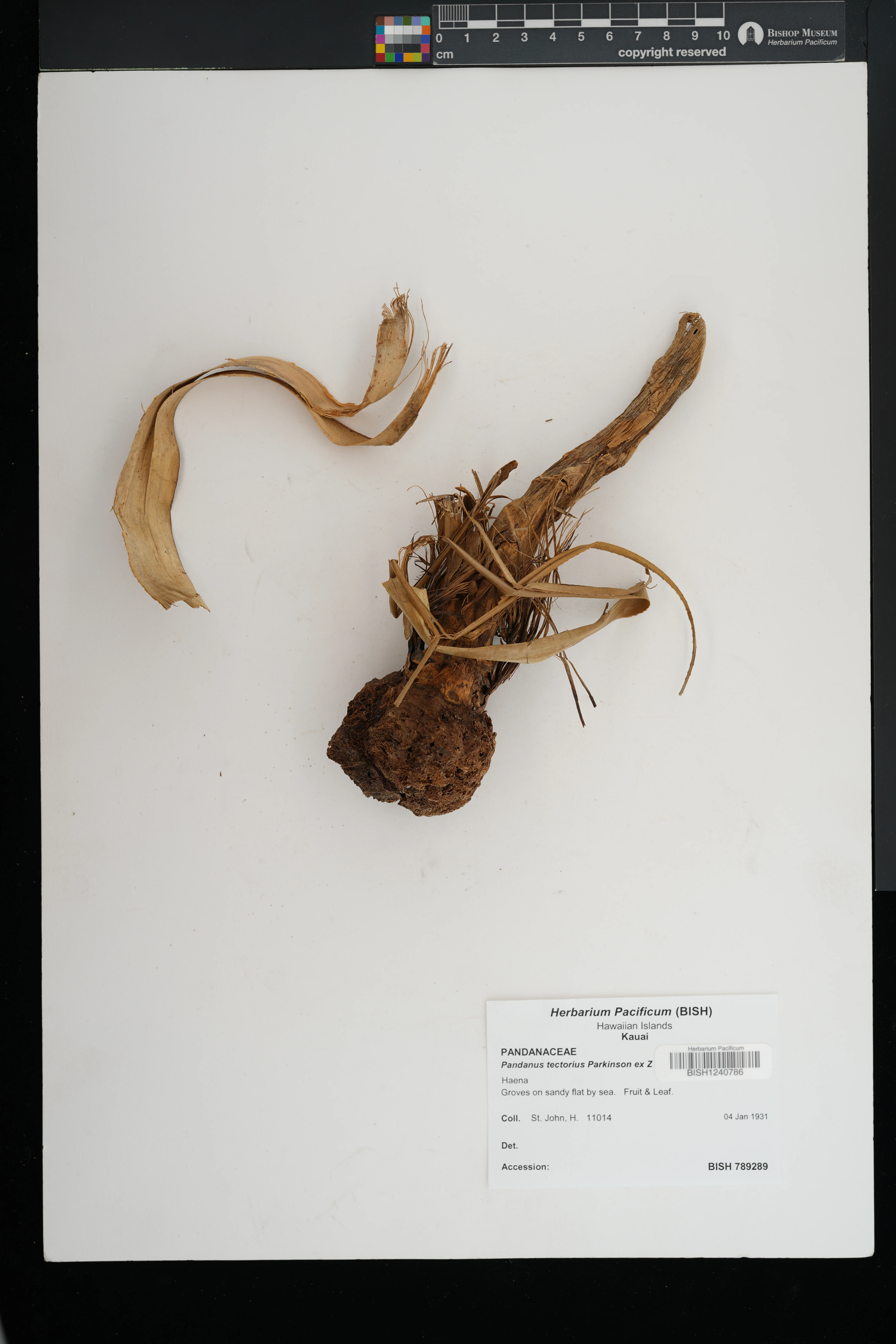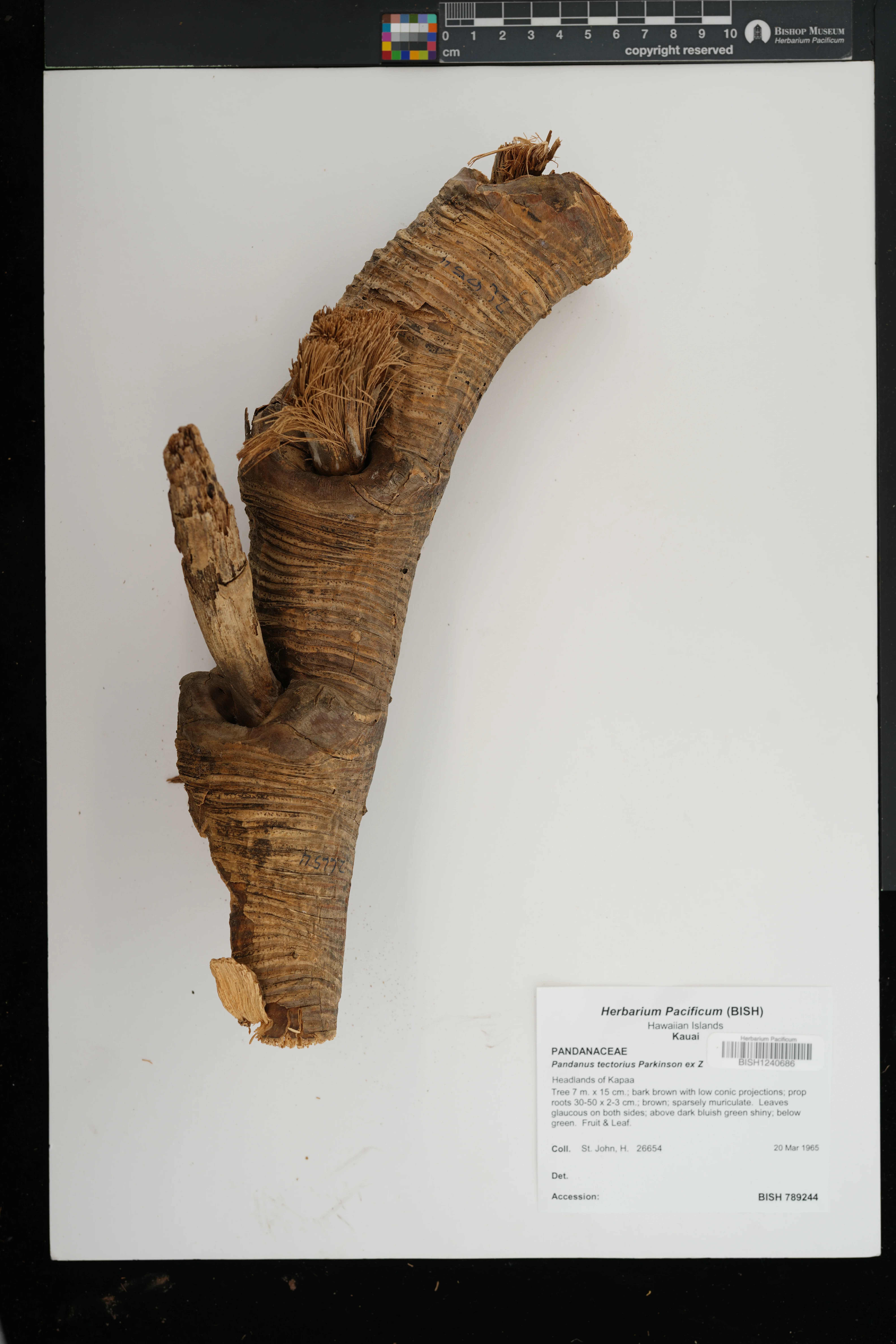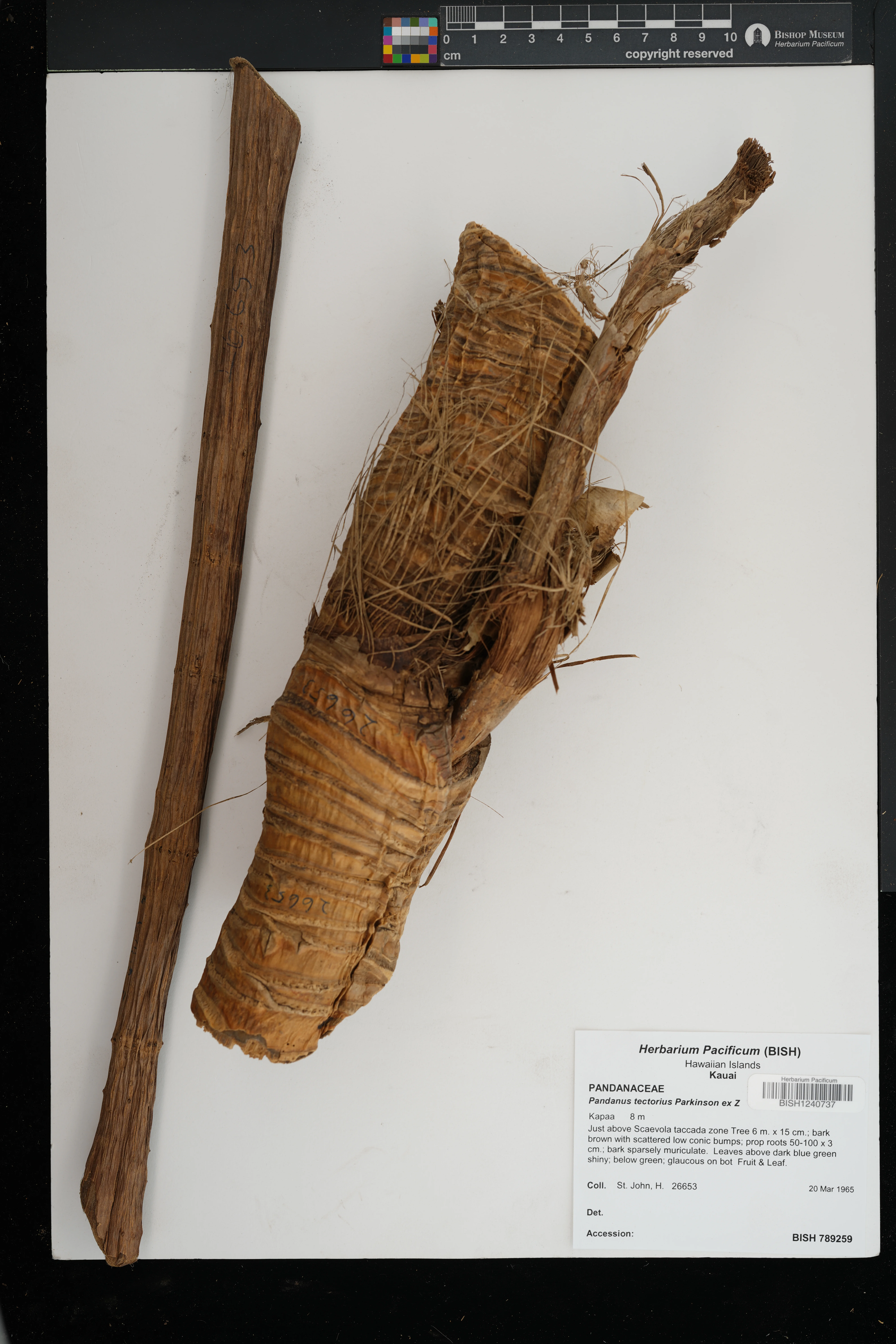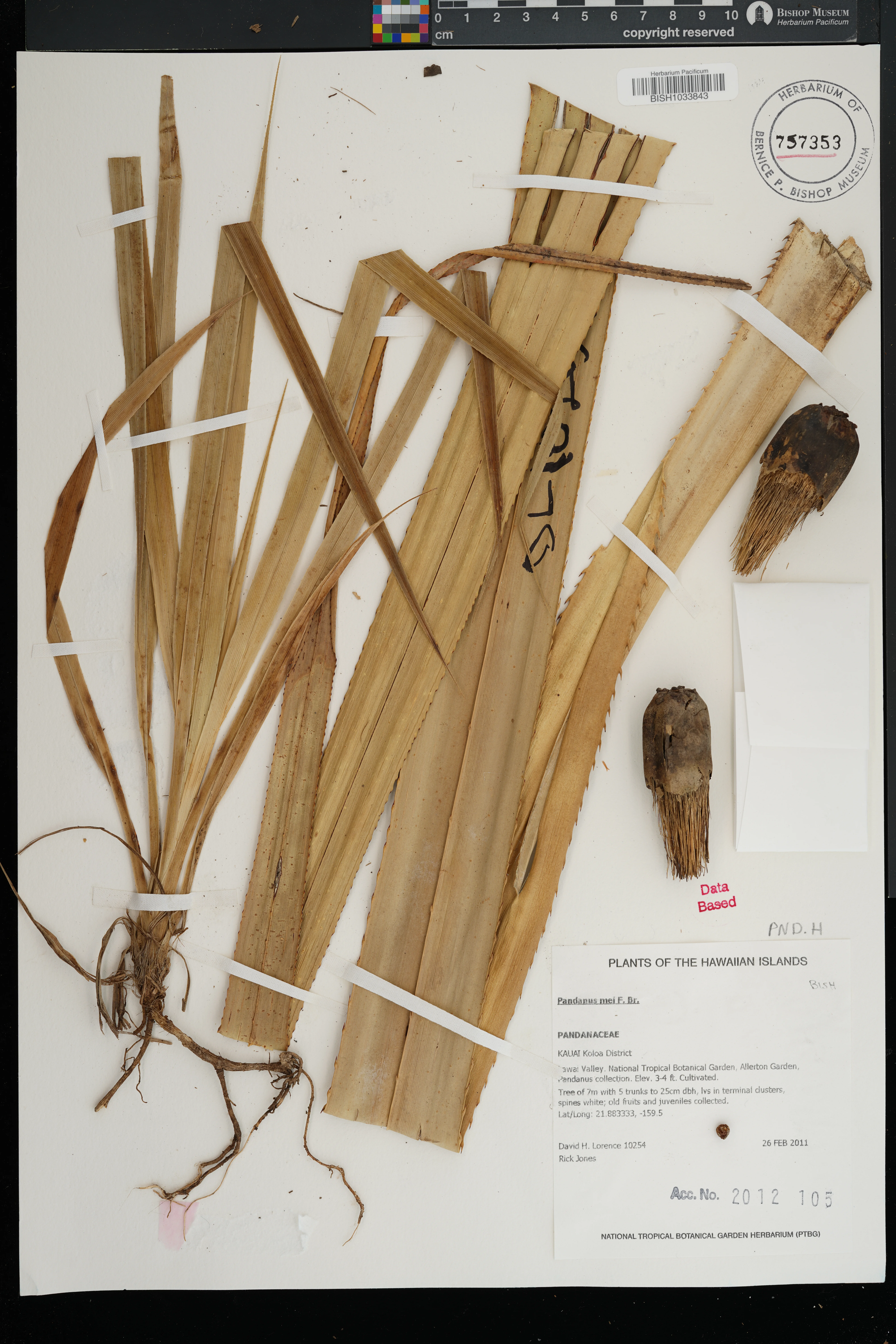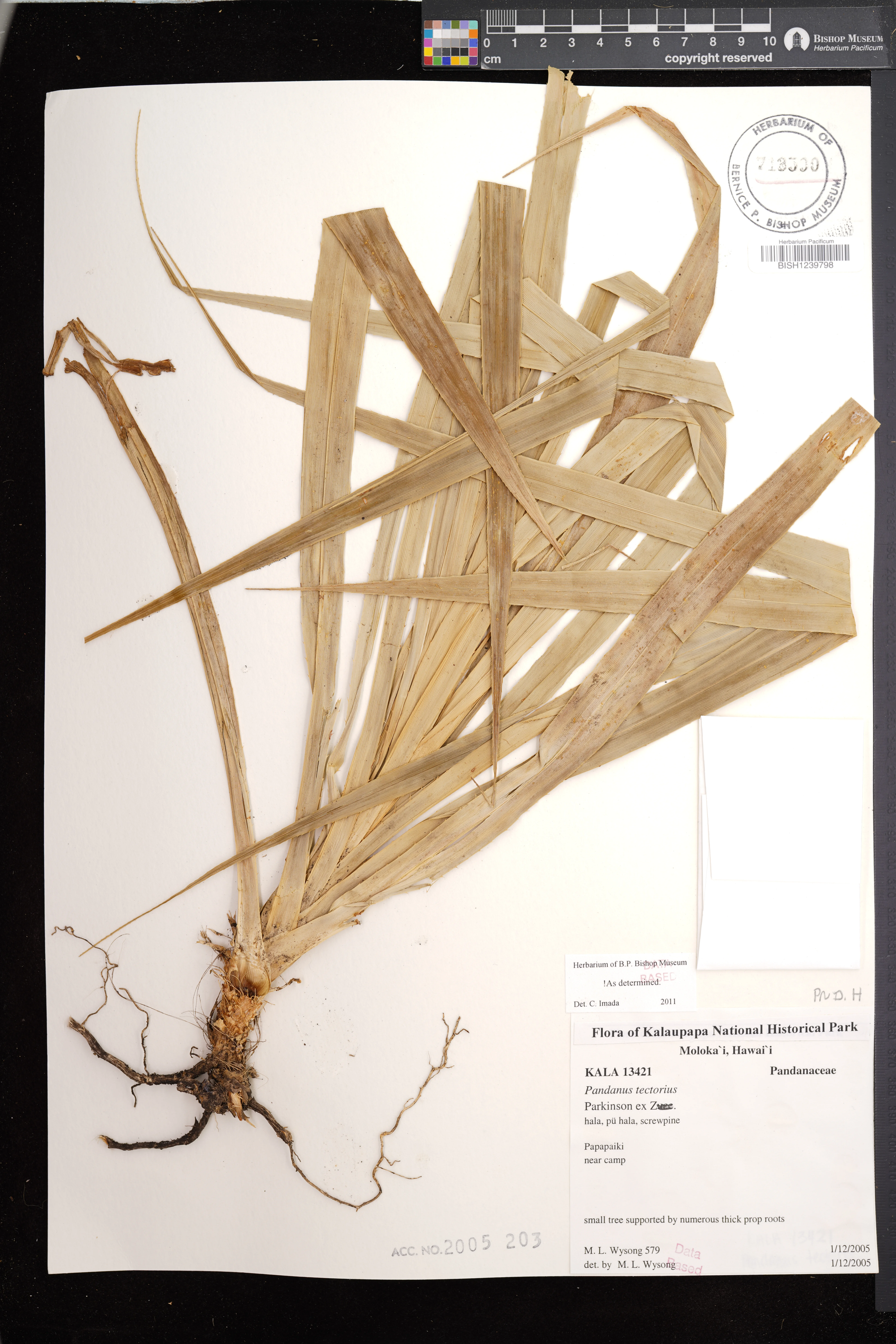 Tree about 20 ft. high; spreading about 20 ft.; shrubby; branching immediately where main aerial roots begin to radiate downward; brs. ending in large tufts of long lvs. which have wide white band down |