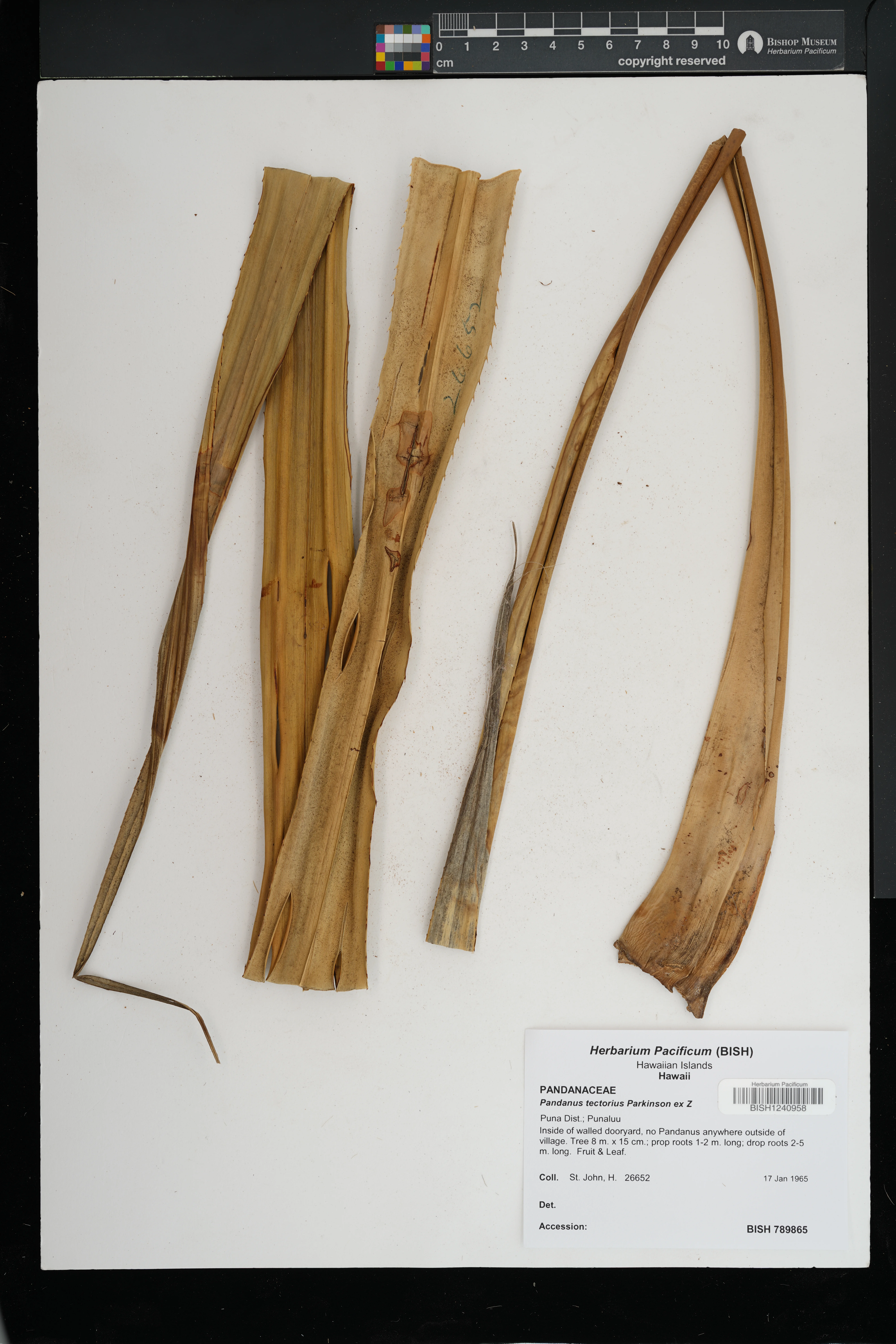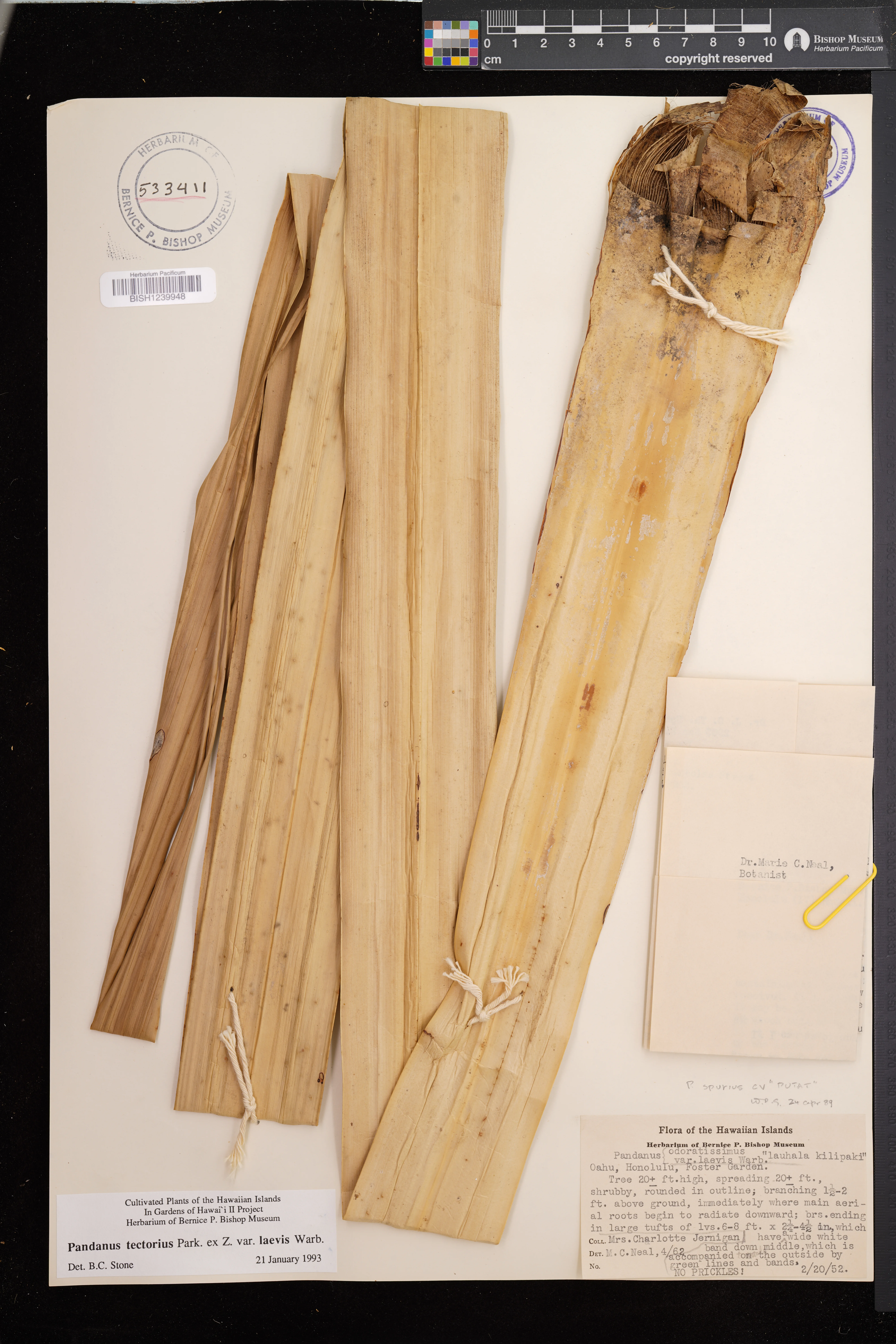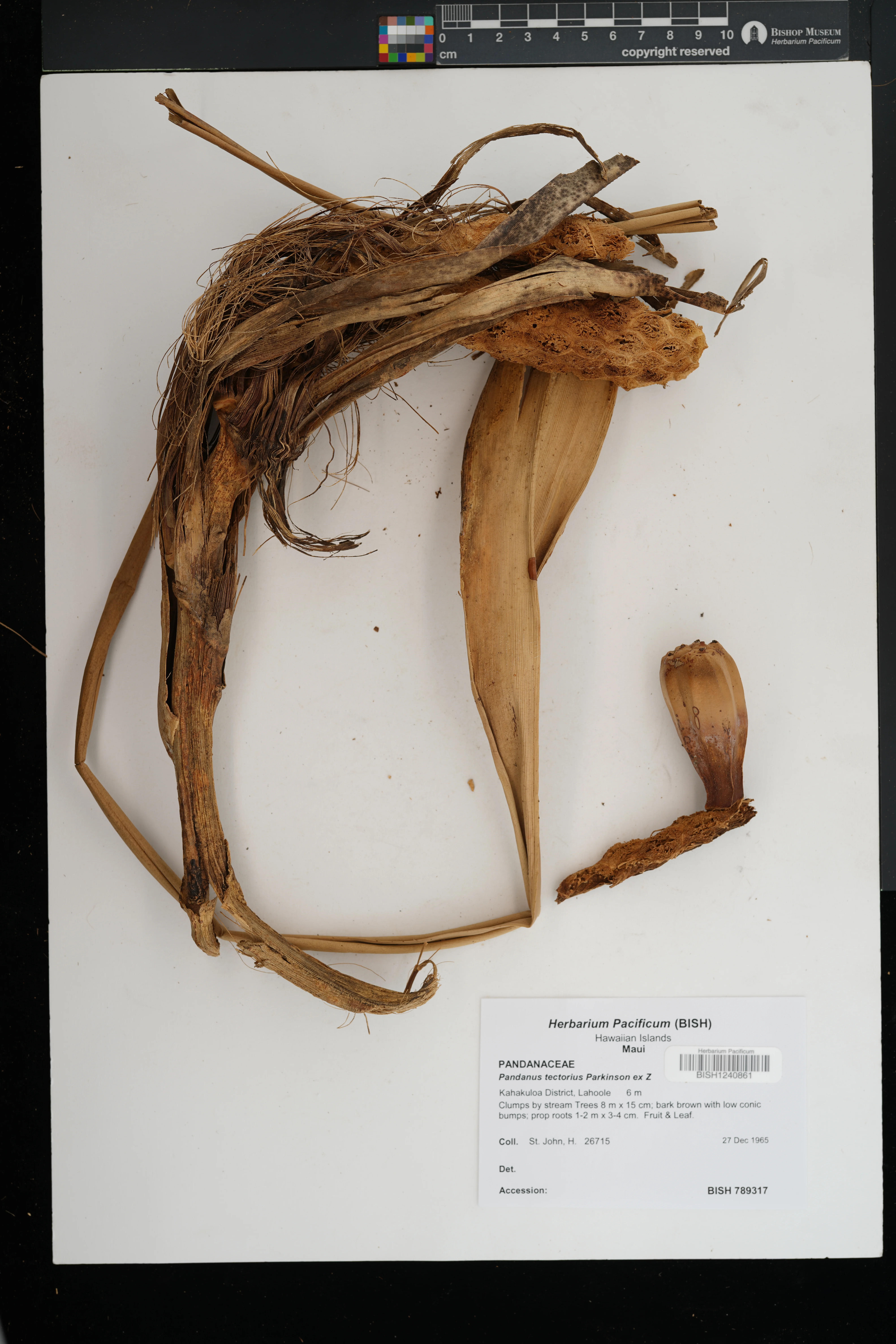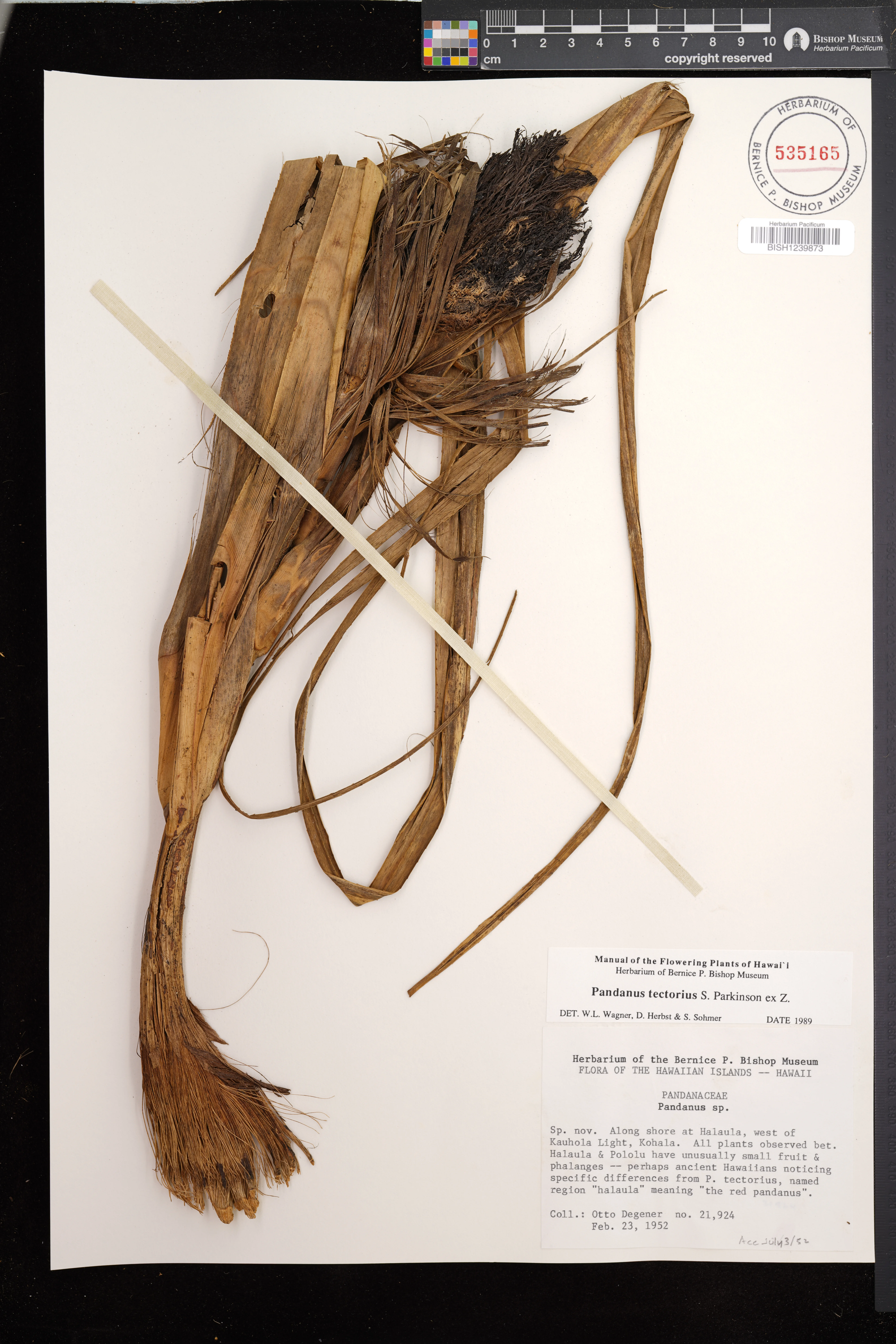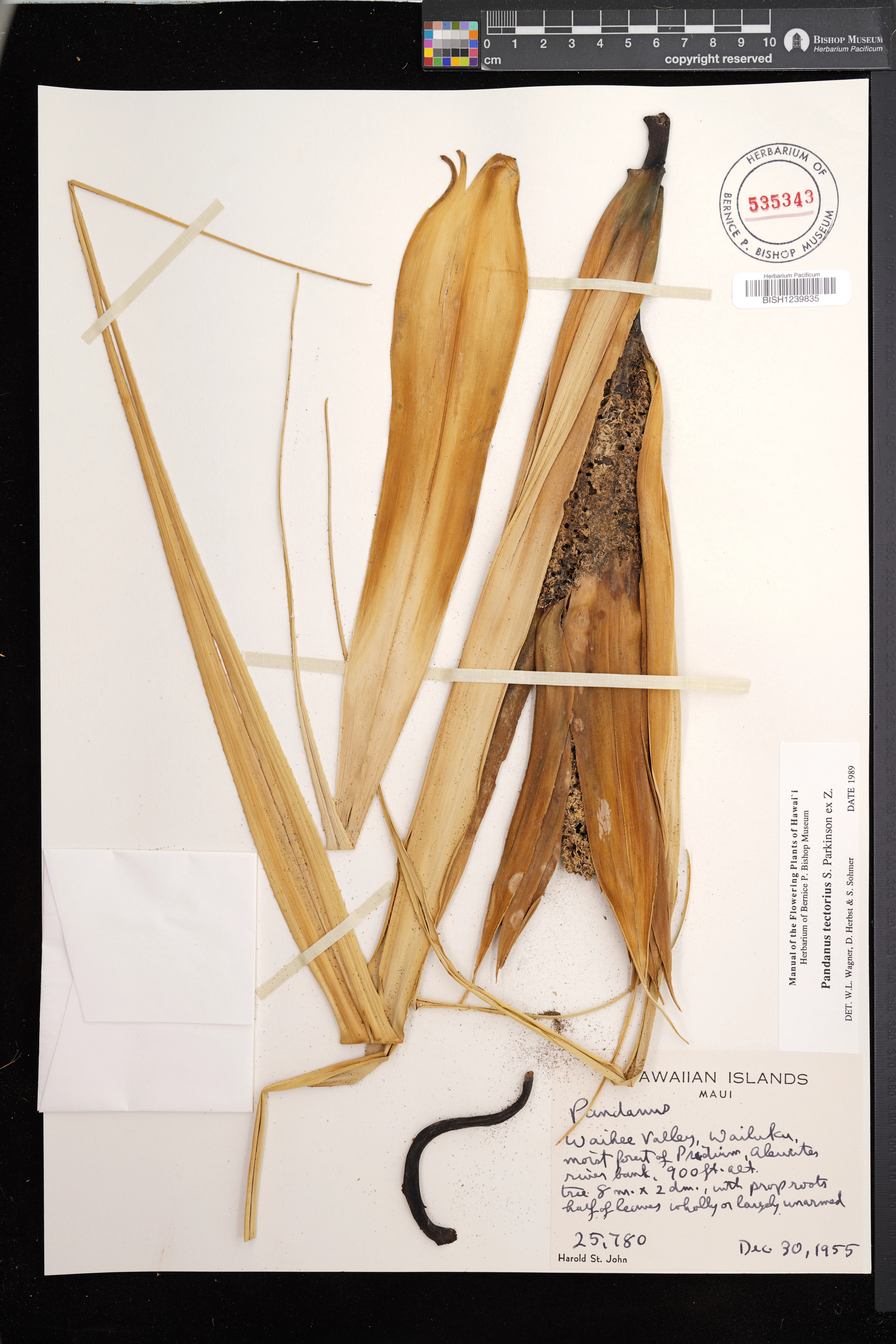 Tree about 20 ft. high; spreading about 20 ft.; shrubby; branching immediately where main aerial roots begin to radiate downward; brs. ending in large tufts of long lvs. which have wide white band down |