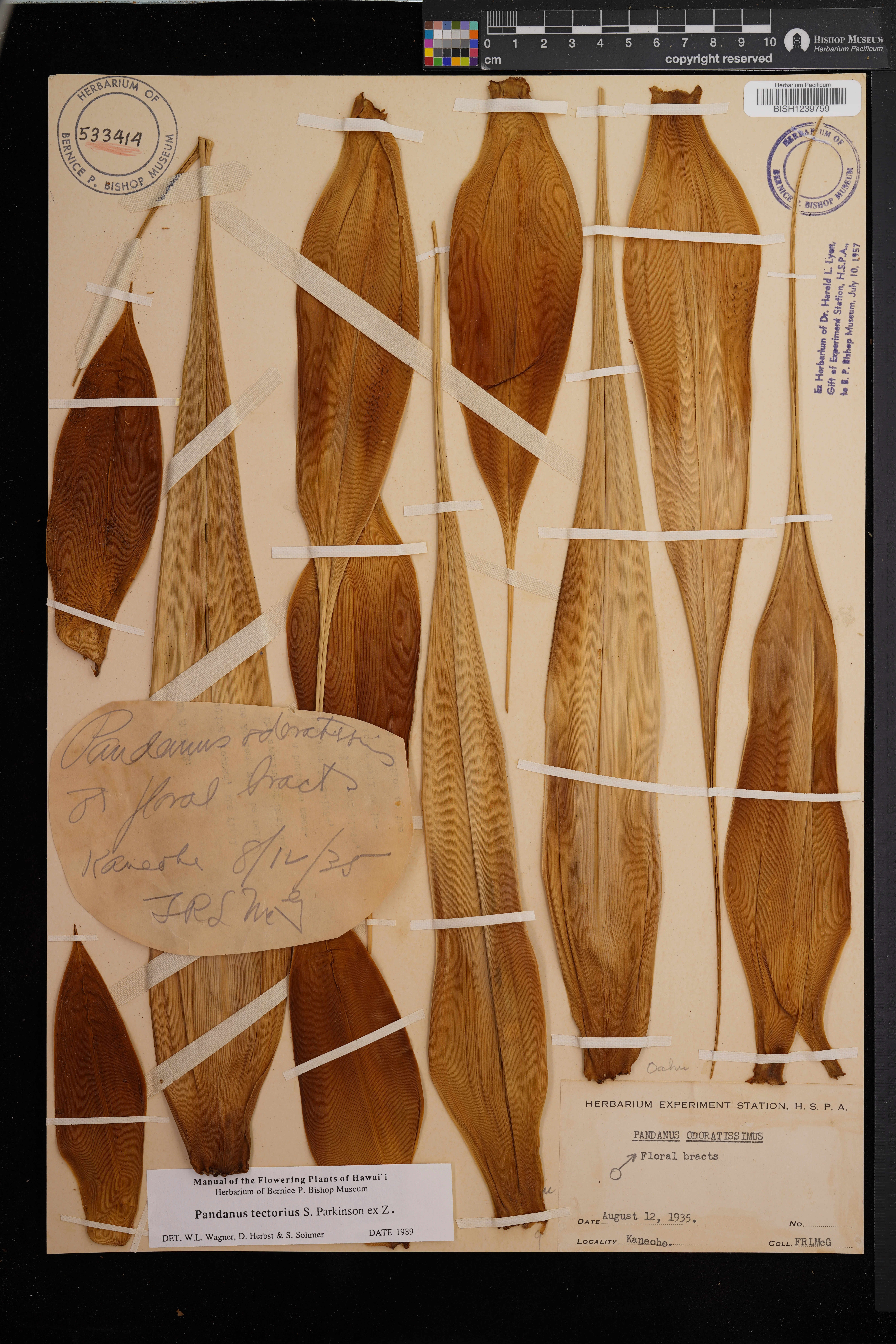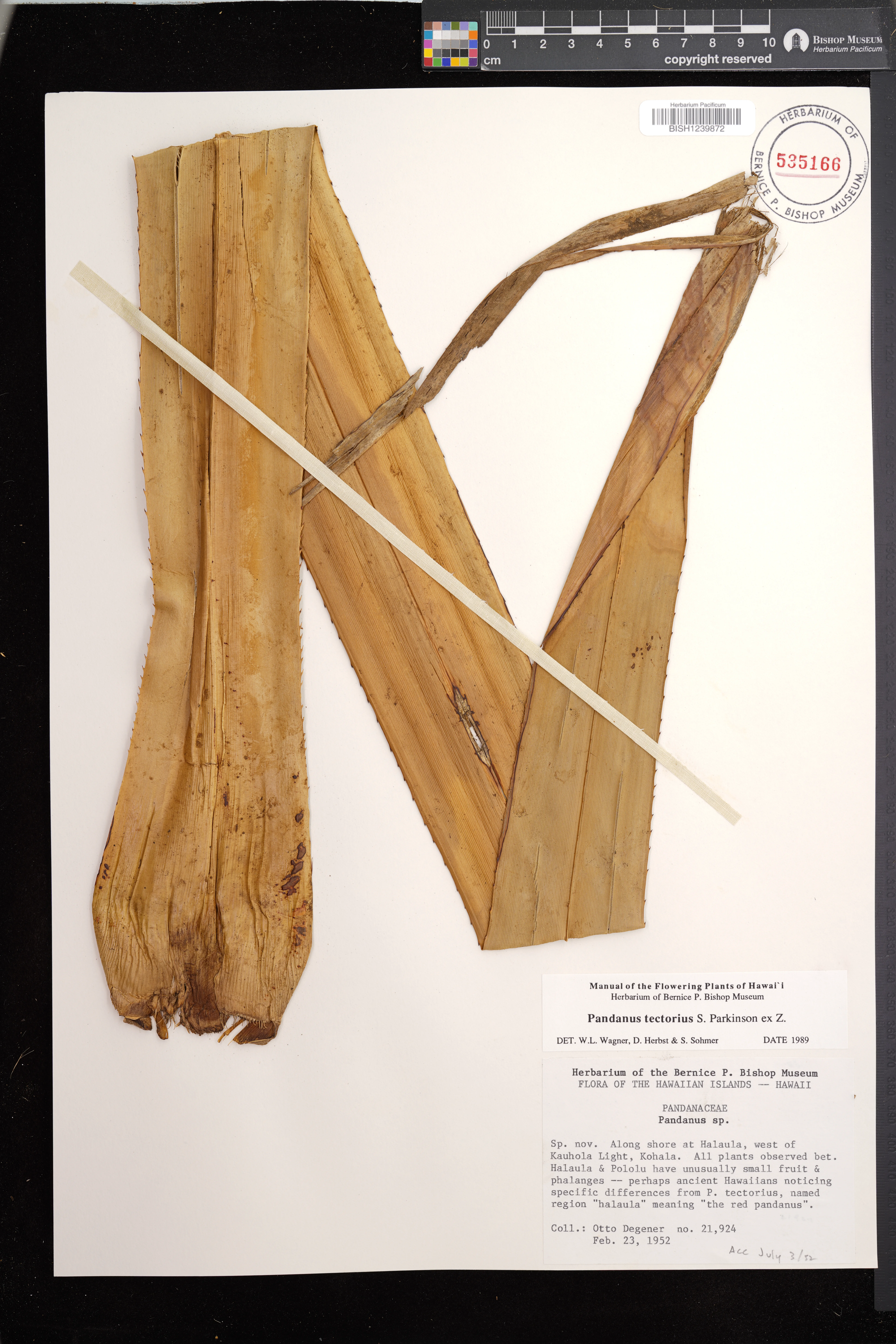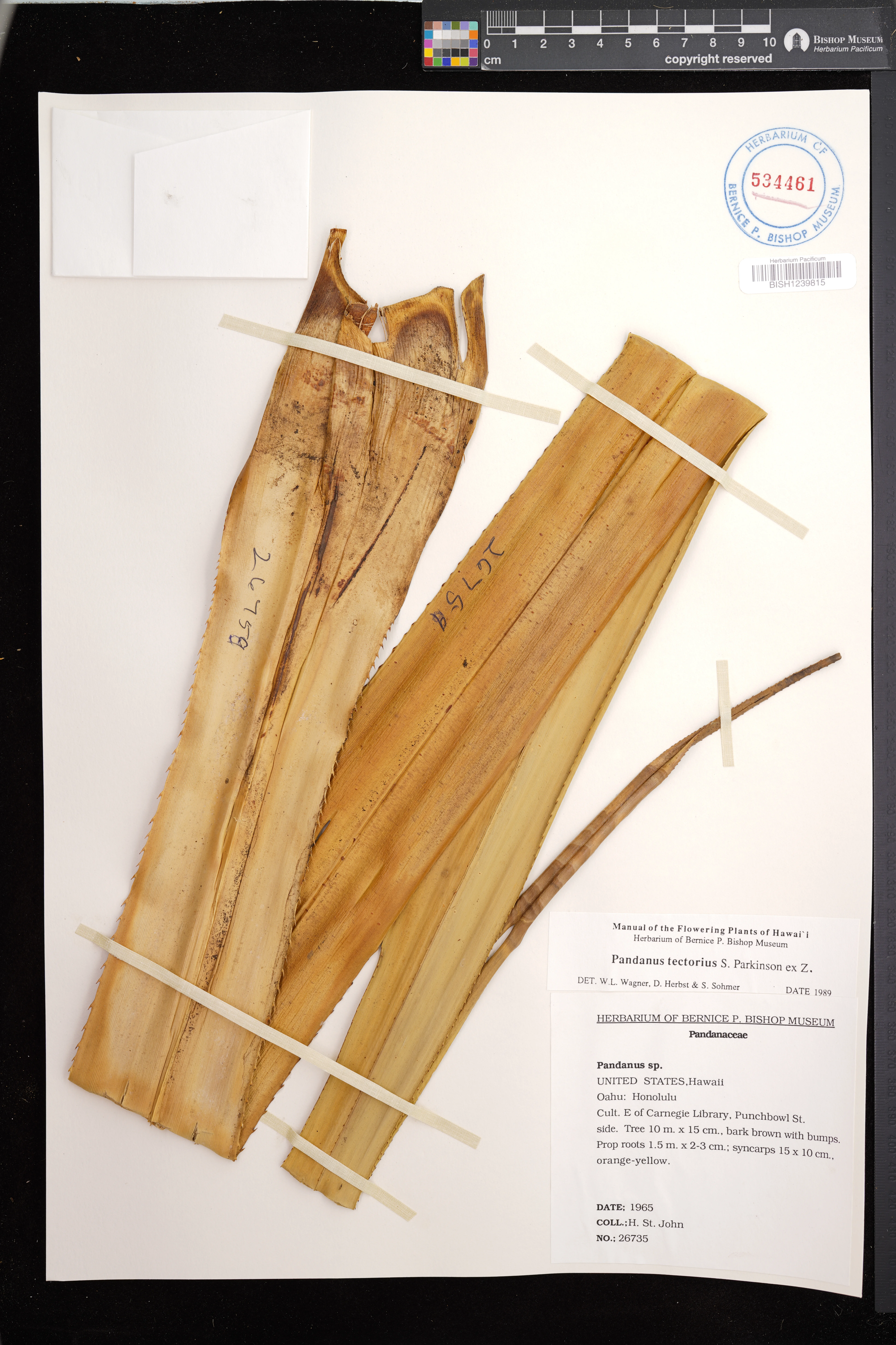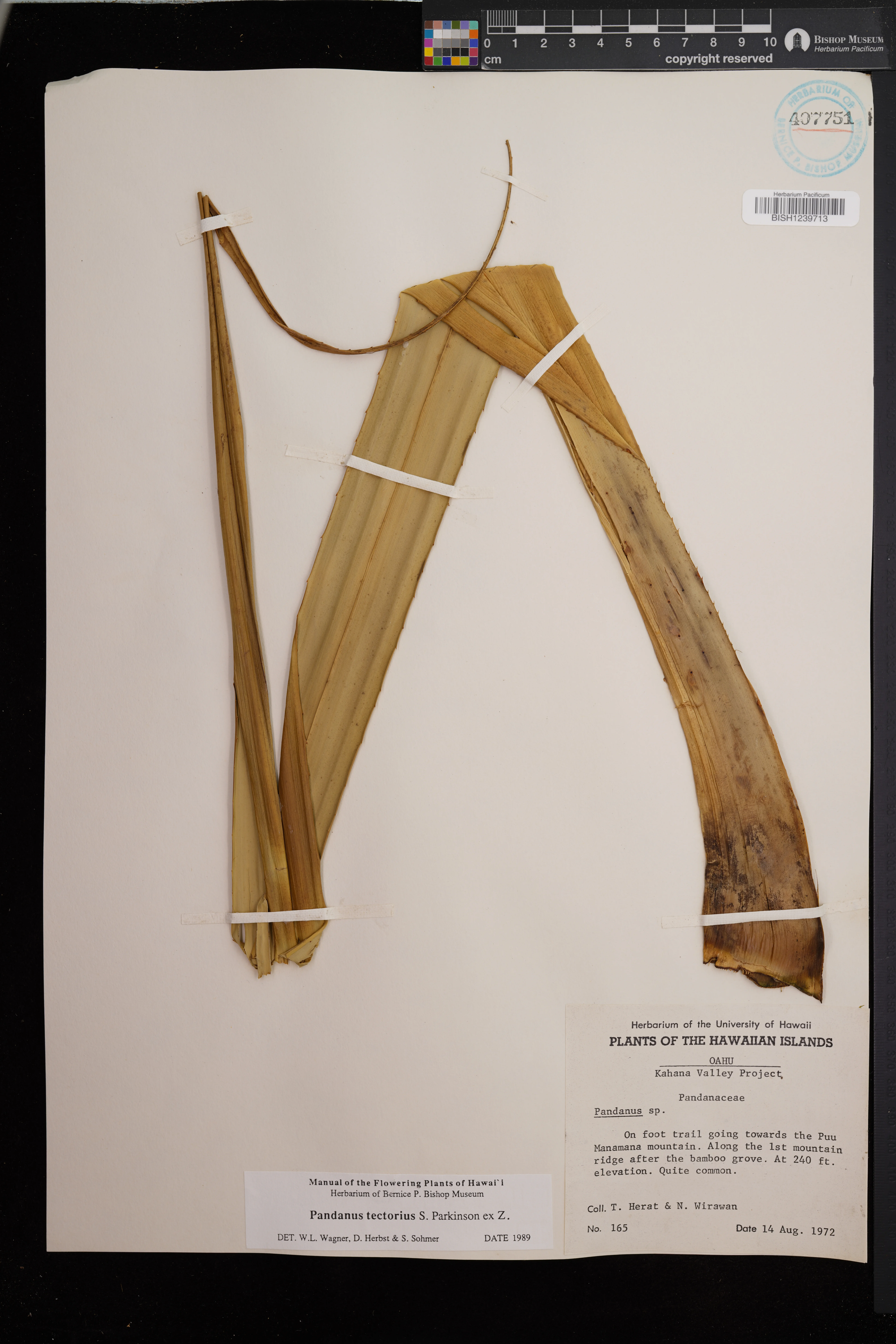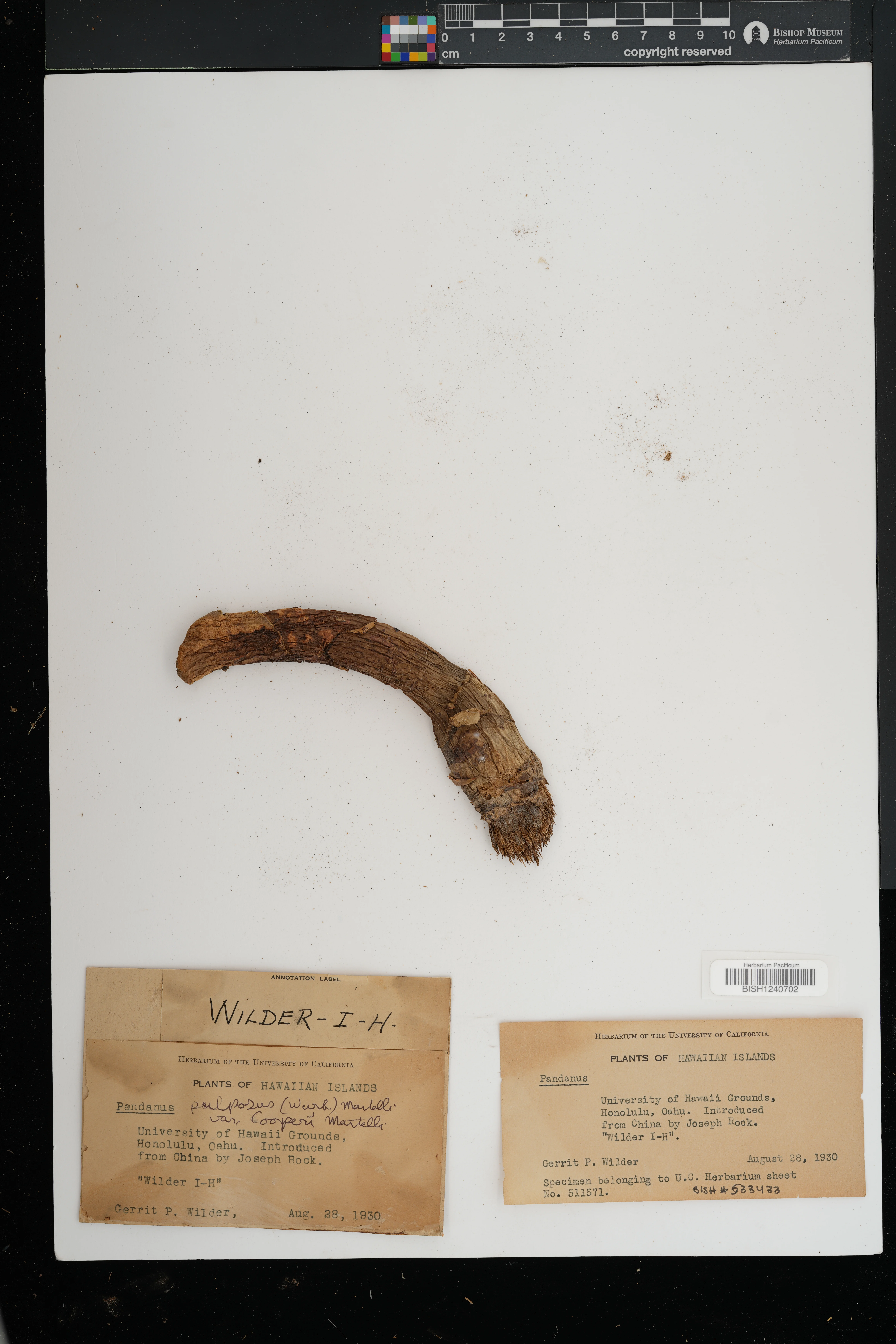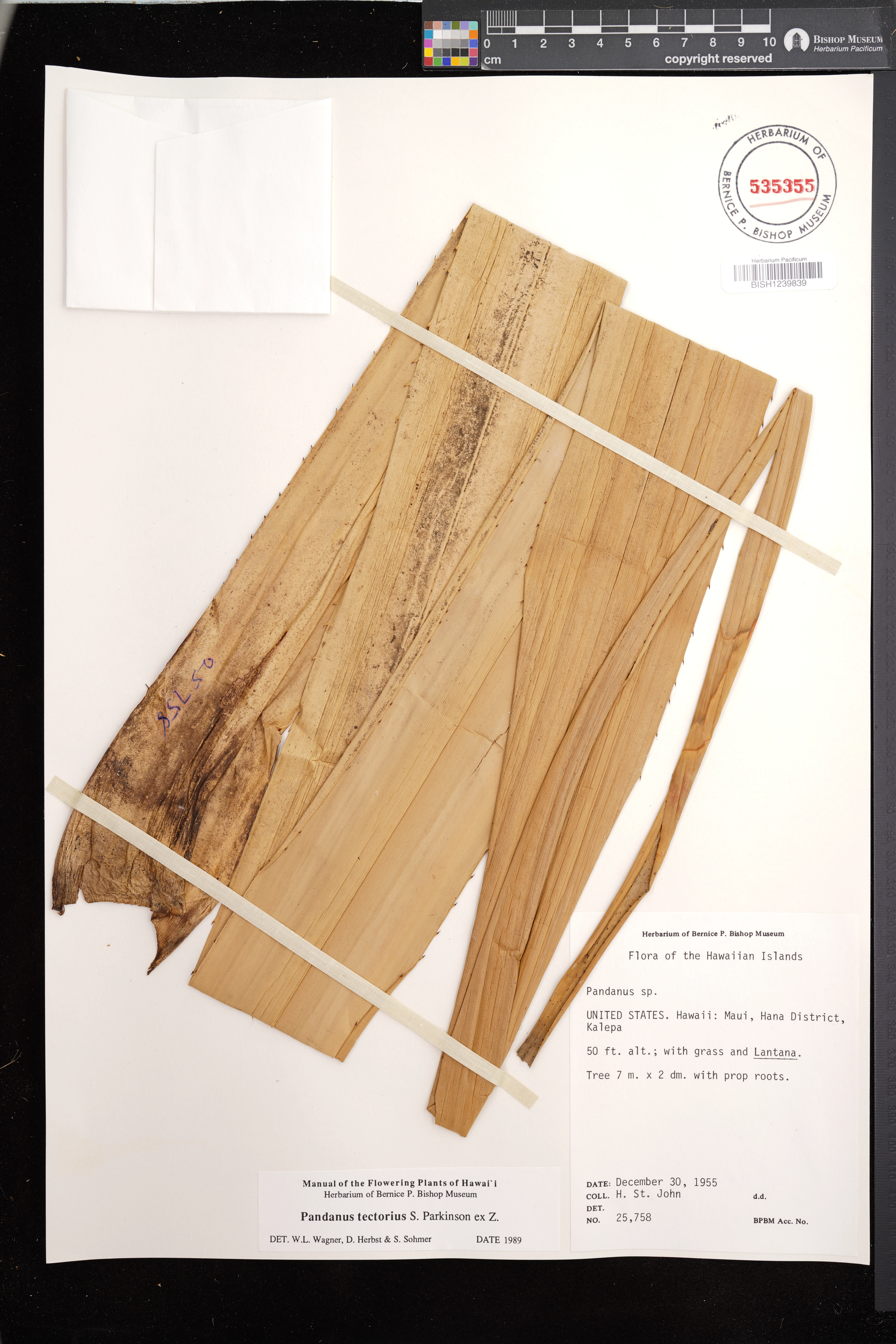 Tree about 20 ft. high; spreading about 20 ft.; shrubby; branching immediately where main aerial roots begin to radiate downward; brs. ending in large tufts of long lvs. which have wide white band down |