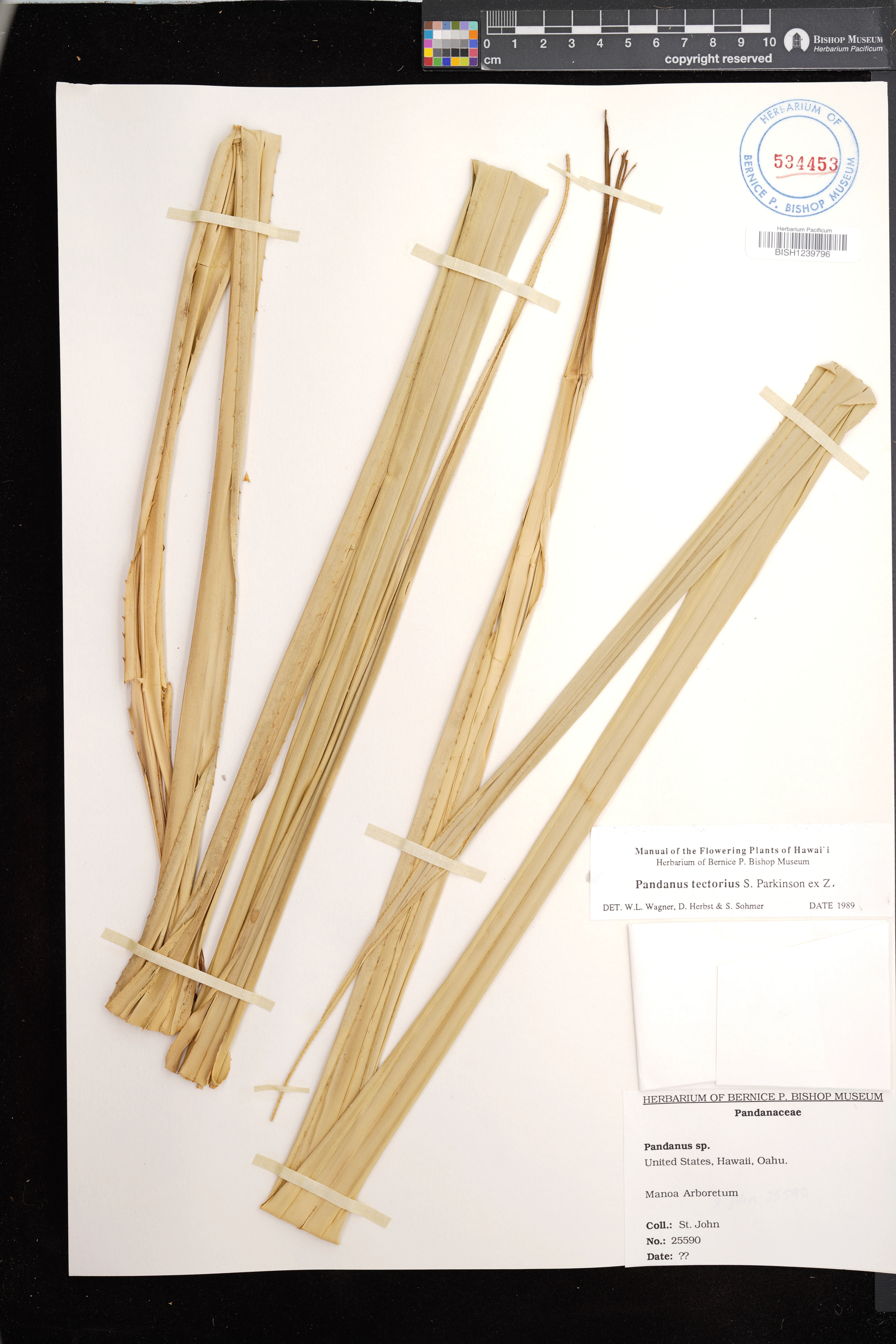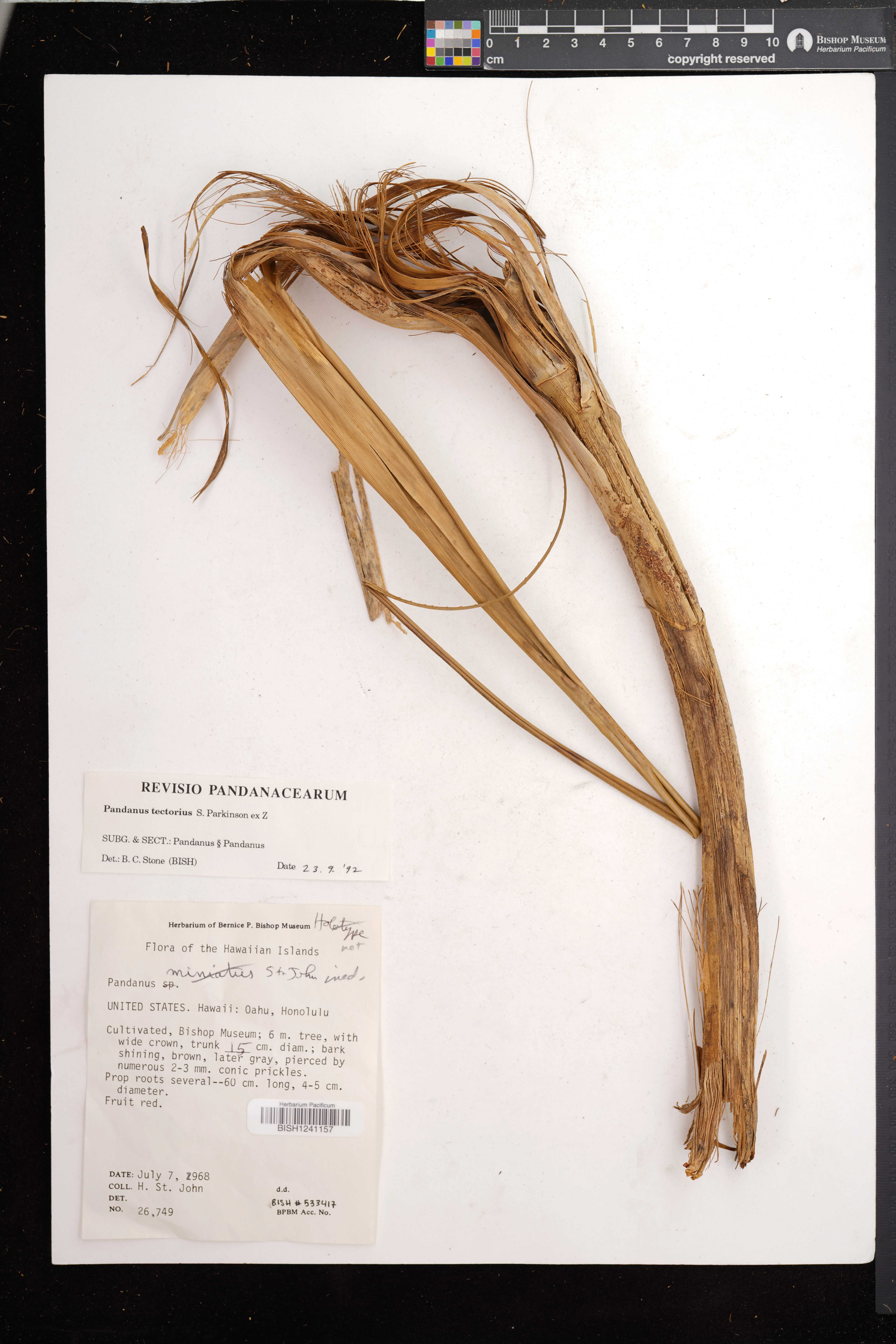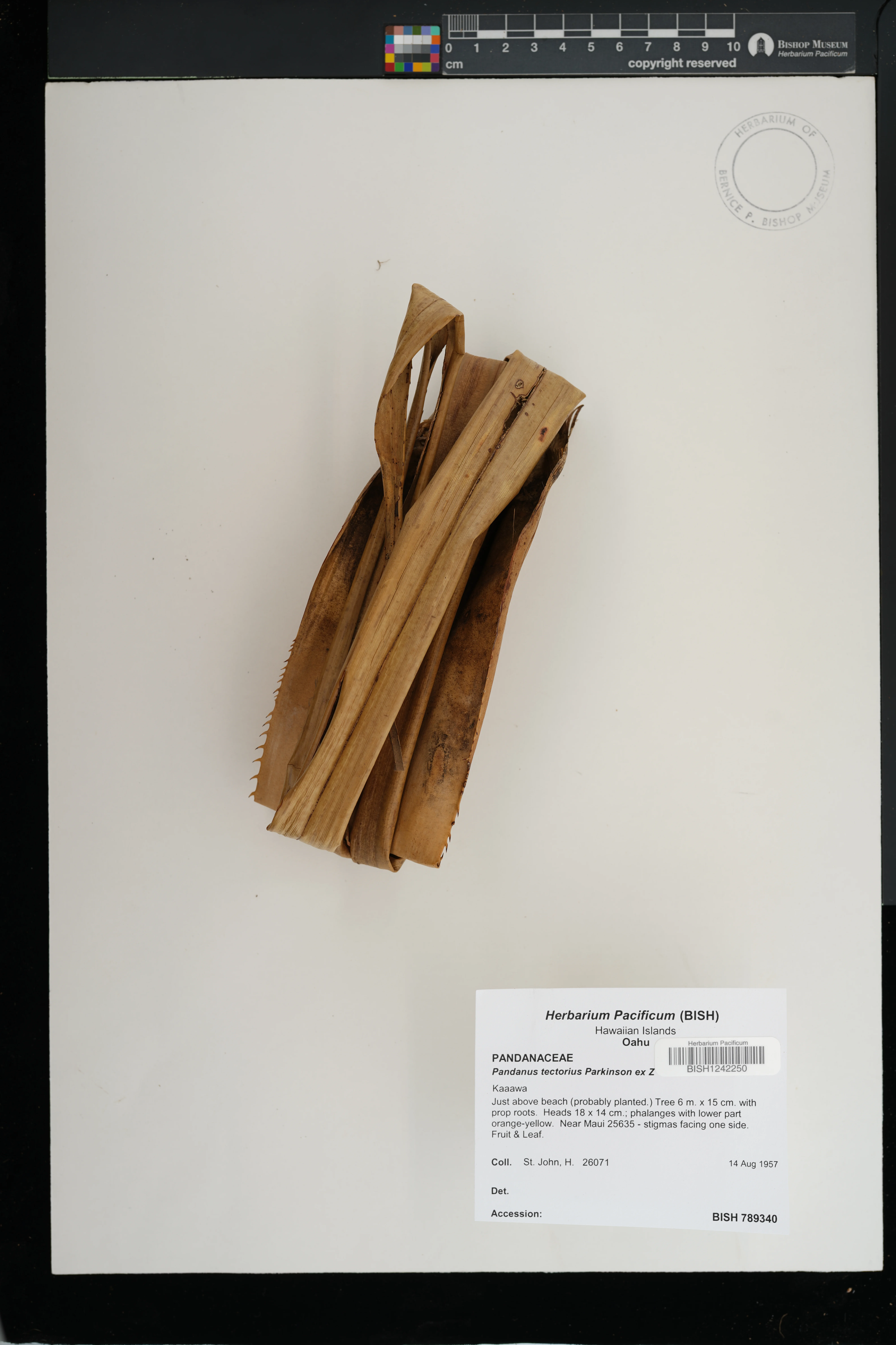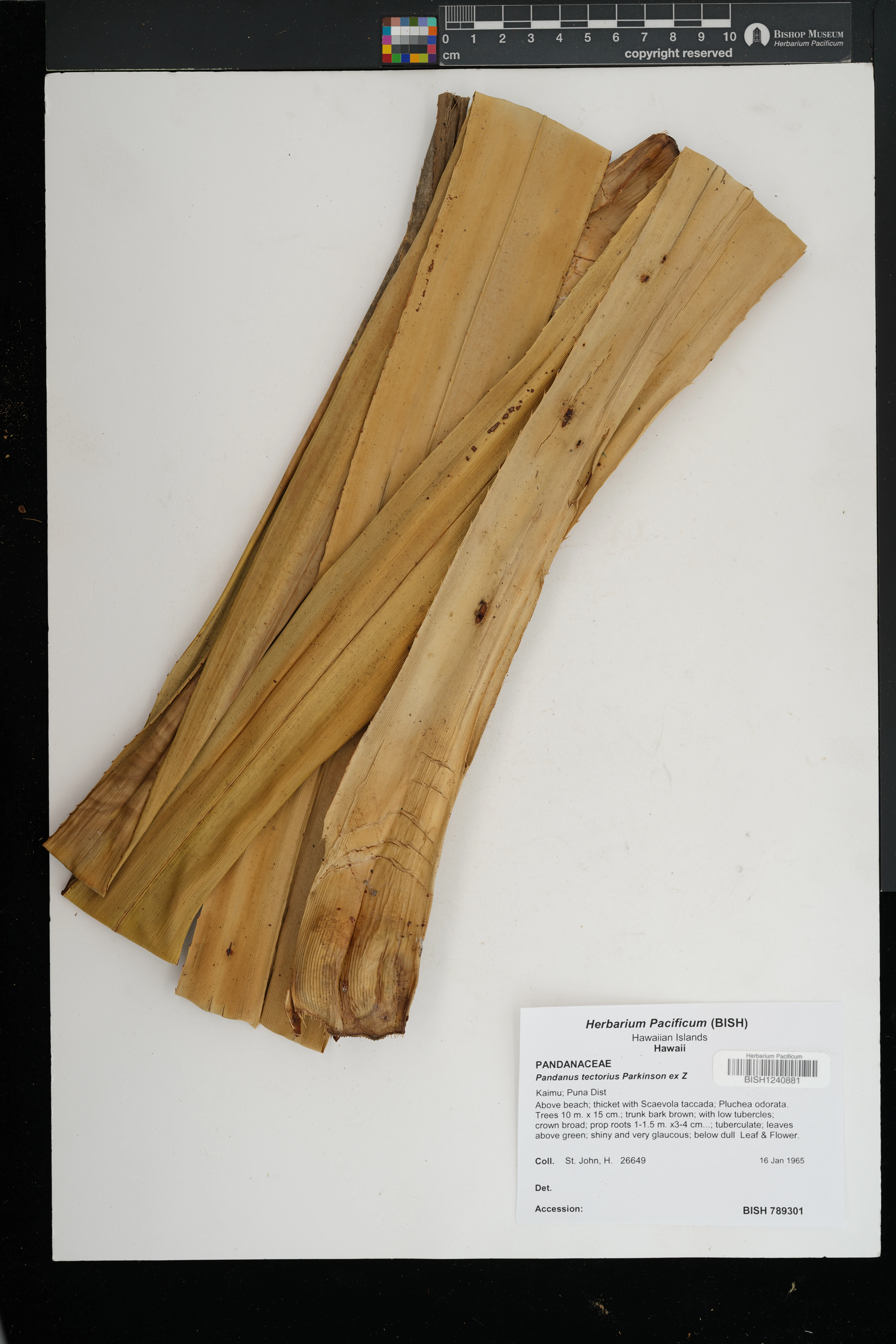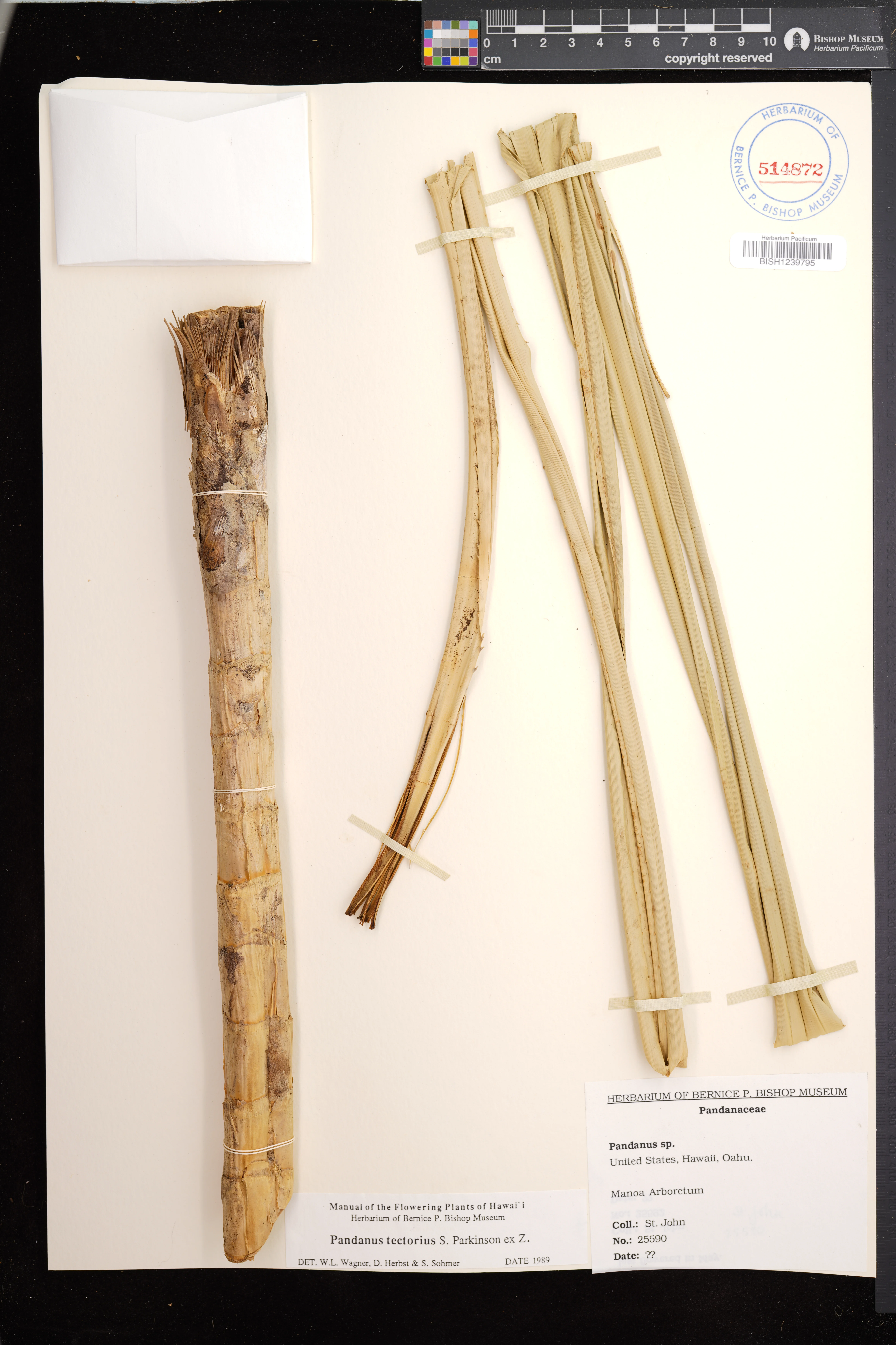 Tree about 20 ft. high; spreading about 20 ft.; shrubby; branching immediately where main aerial roots begin to radiate downward; brs. ending in large tufts of long lvs. which have wide white band down |
