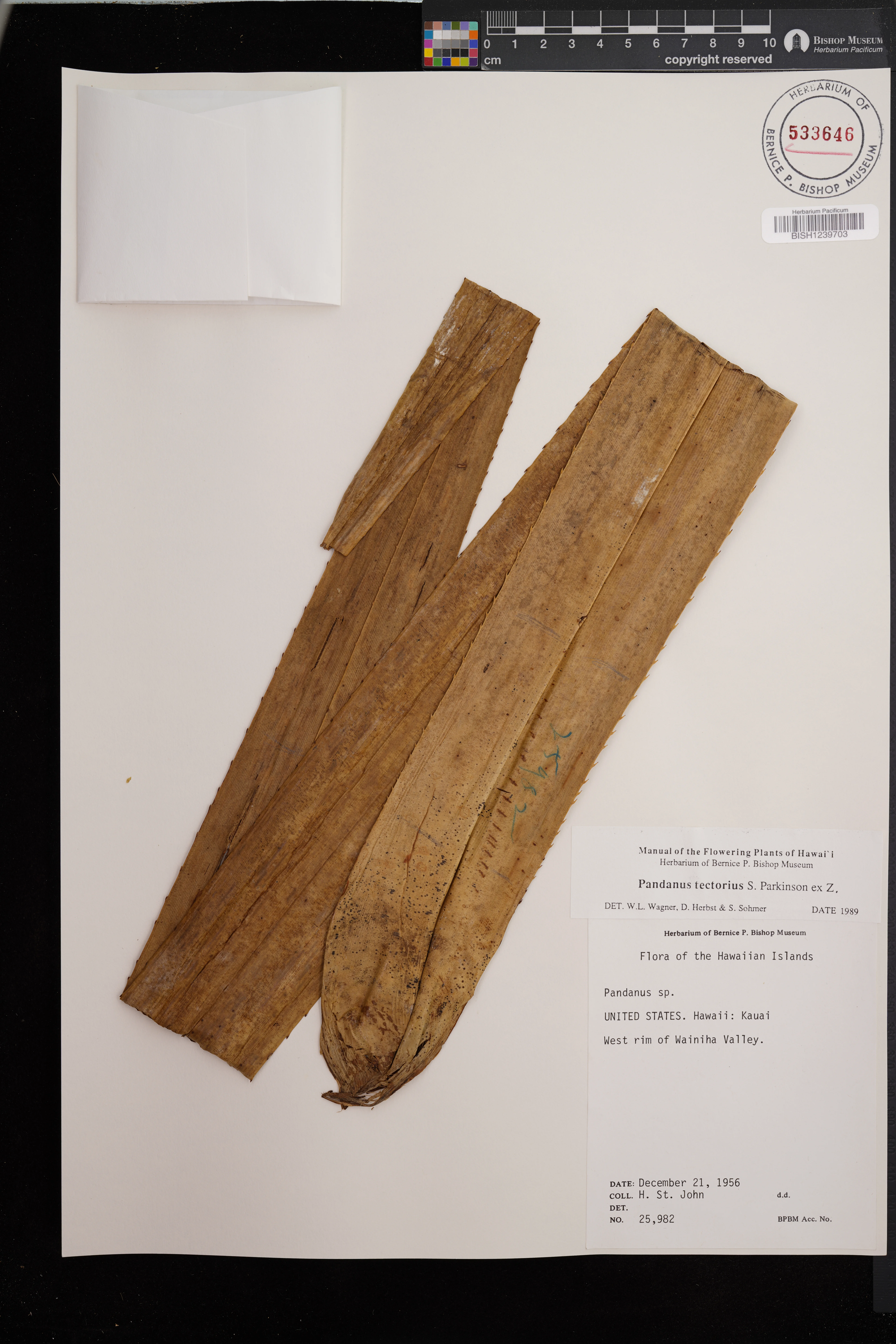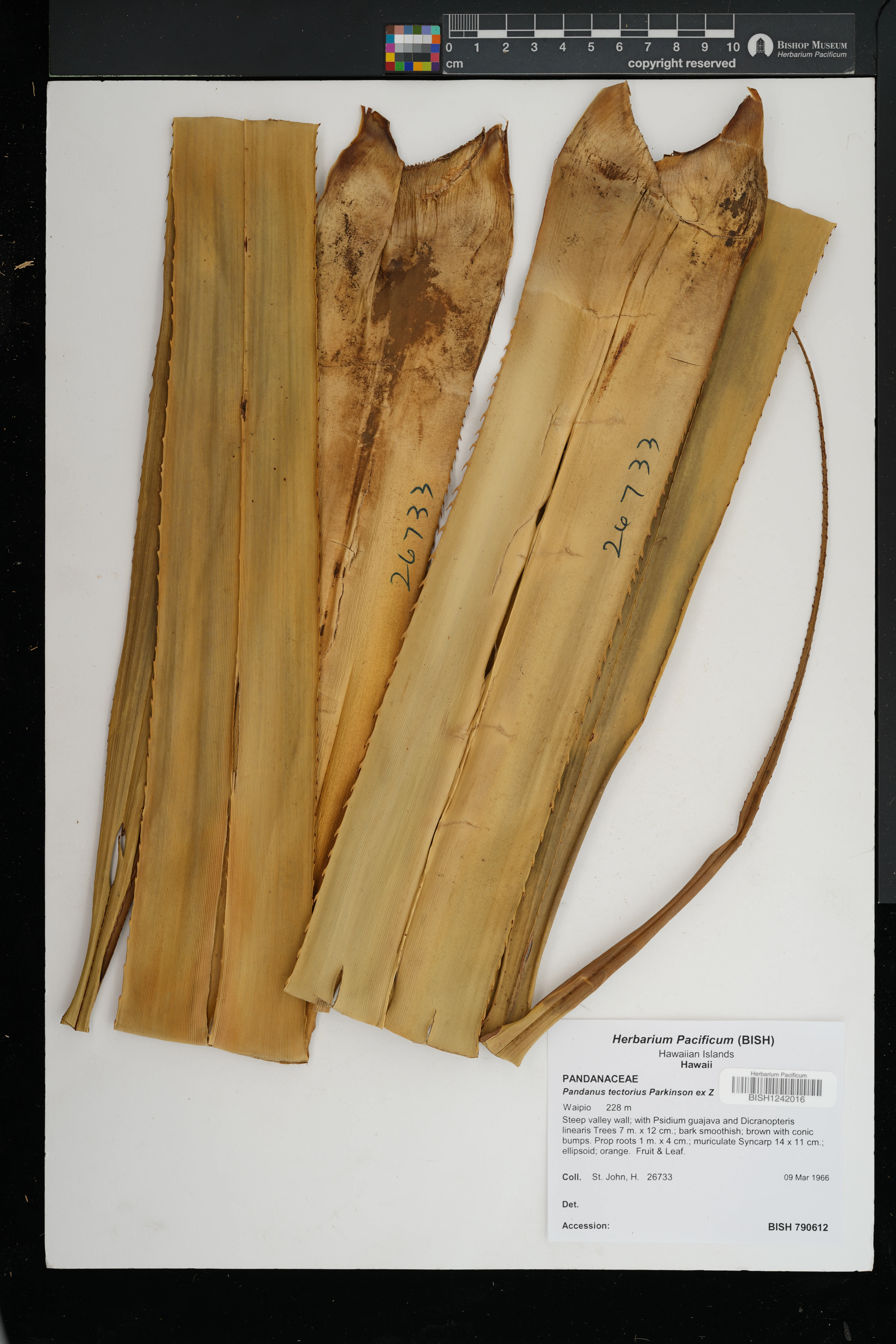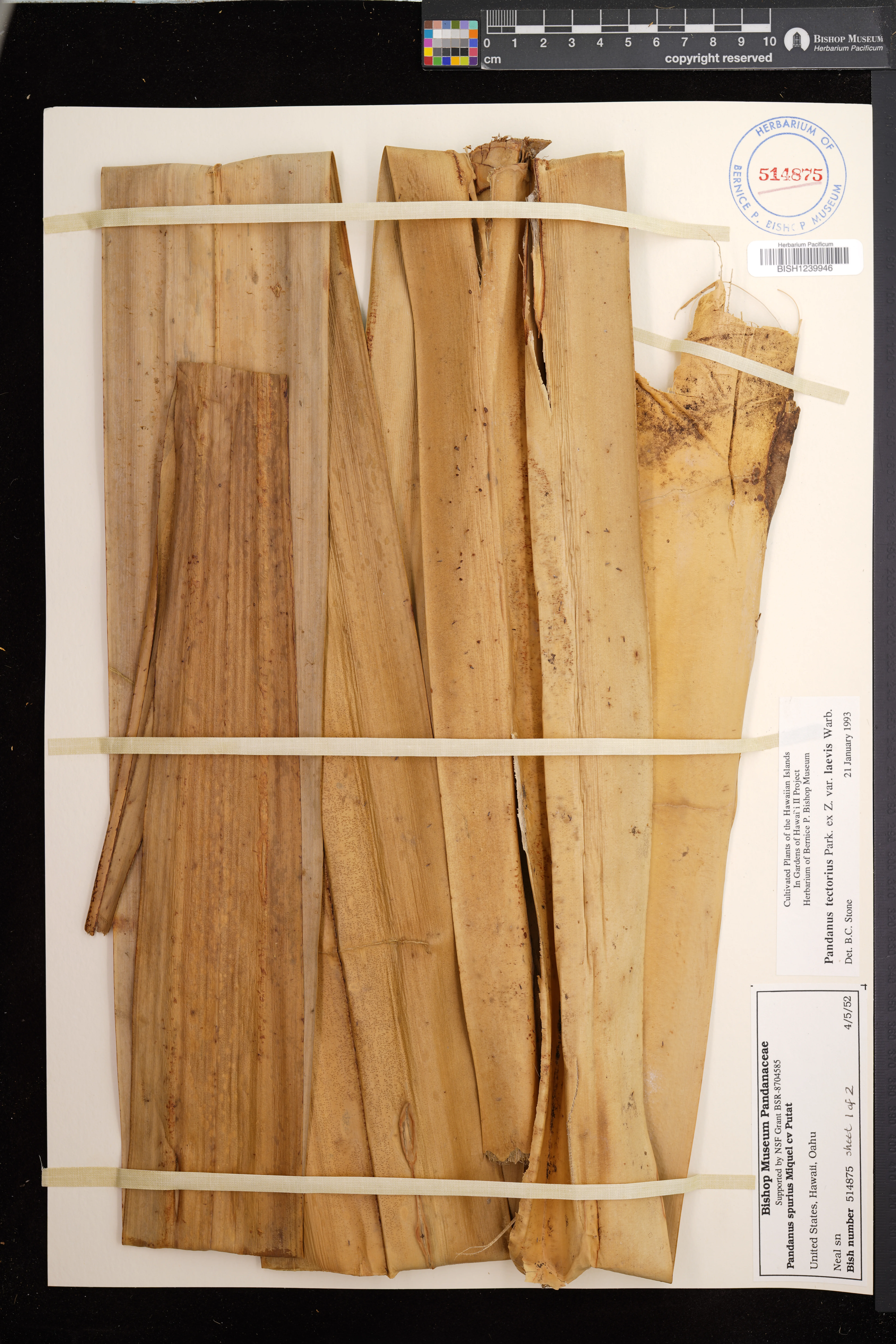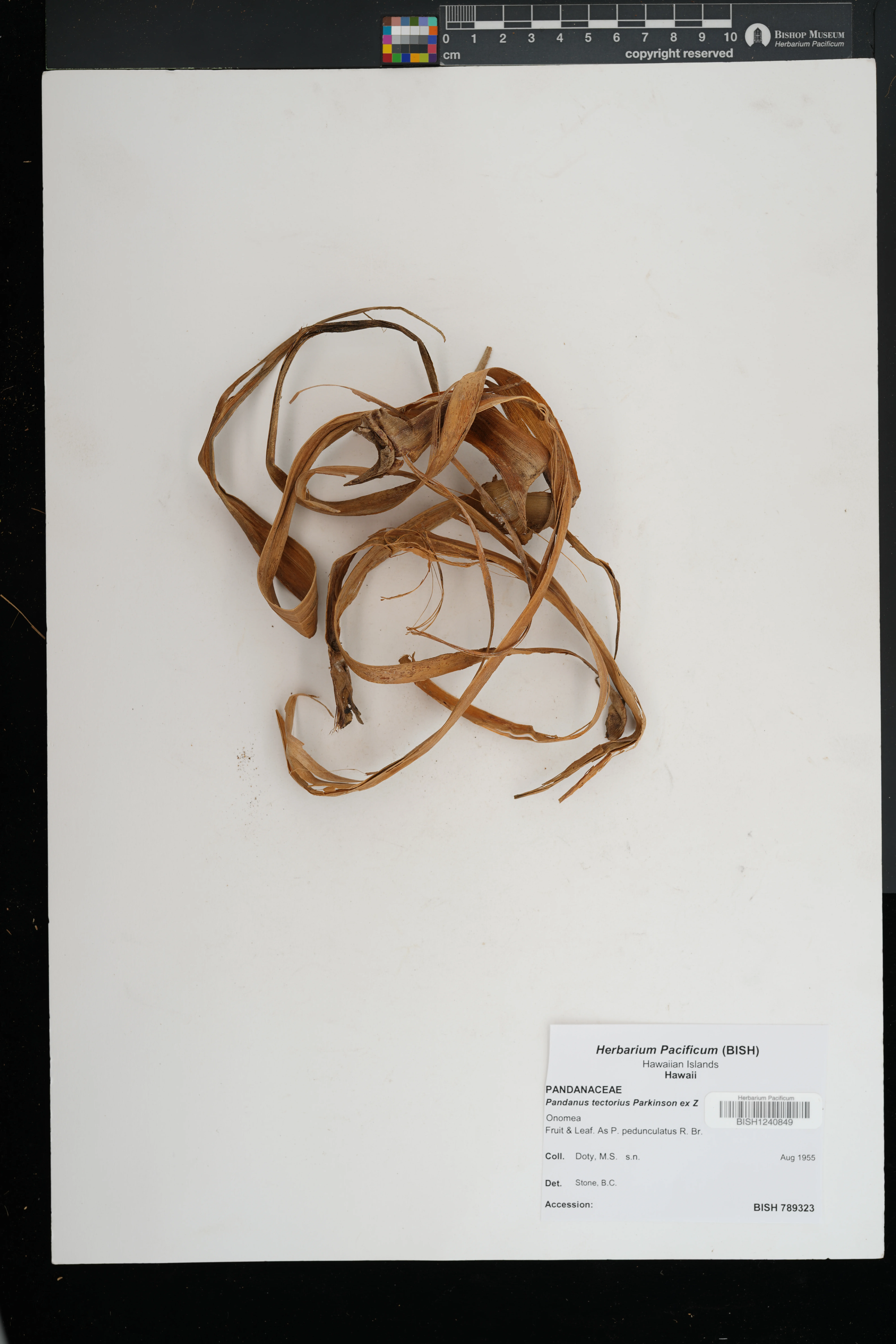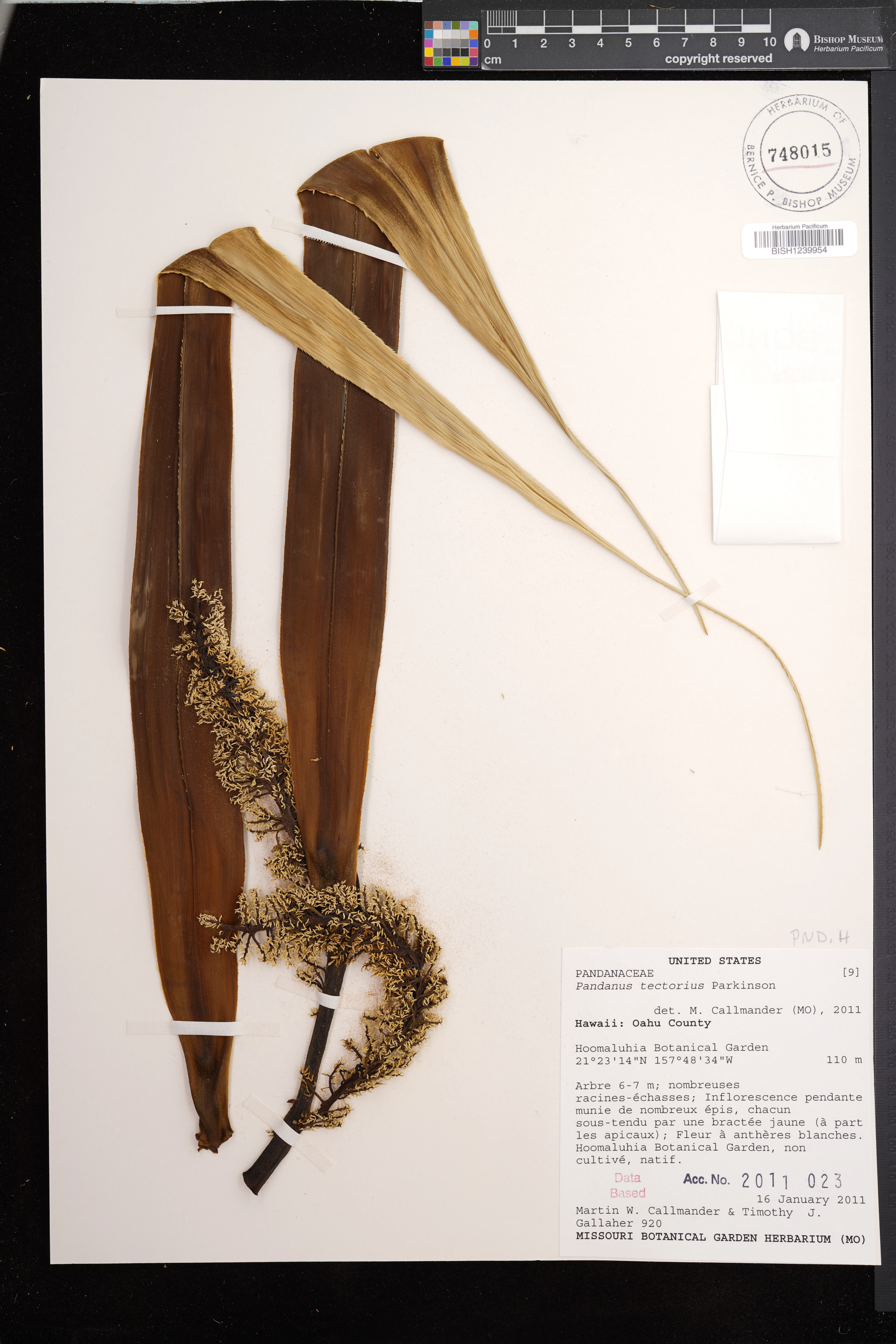 Tree about 20 ft. high; spreading about 20 ft.; shrubby; branching immediately where main aerial roots begin to radiate downward; brs. ending in large tufts of long lvs. which have wide white band down |