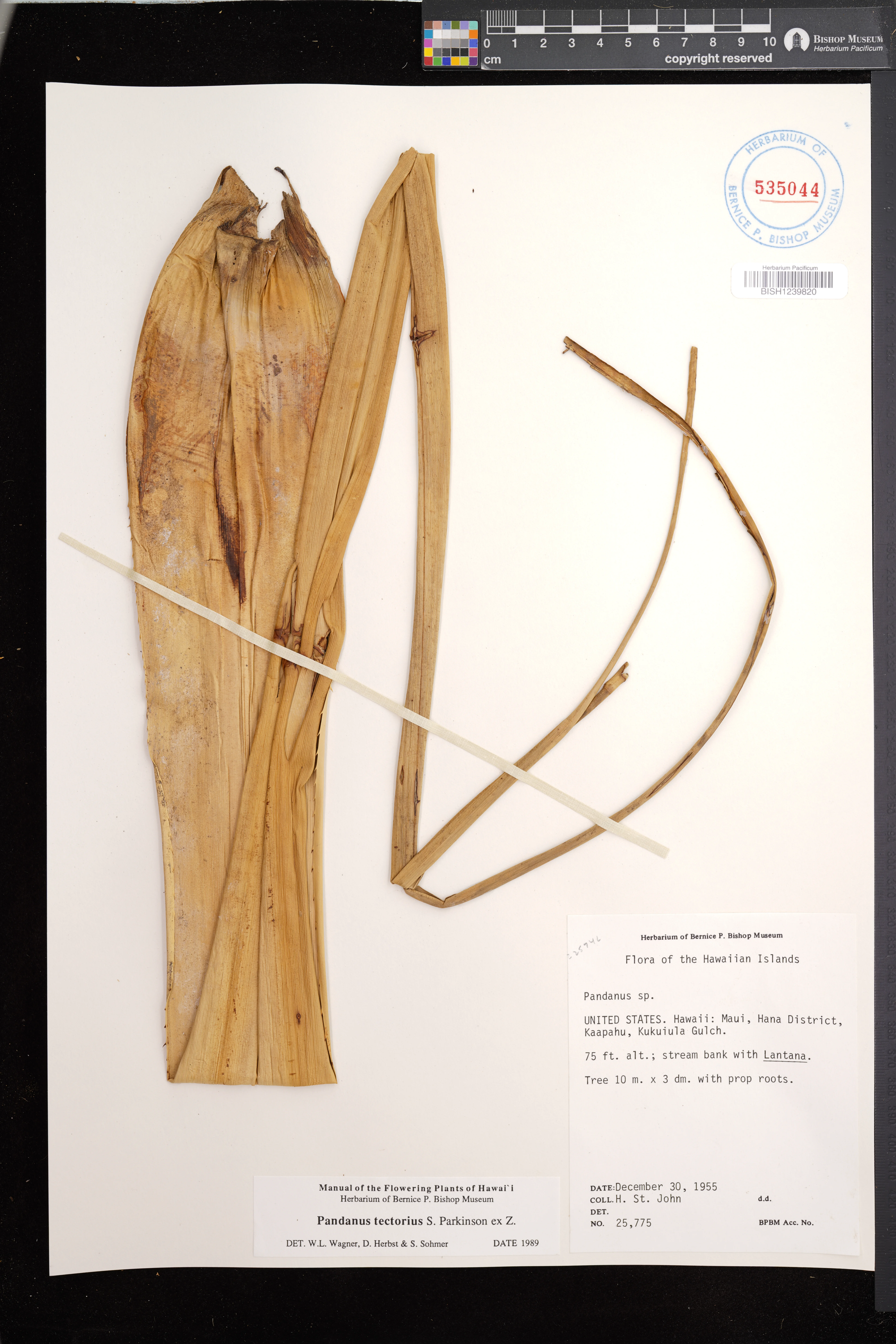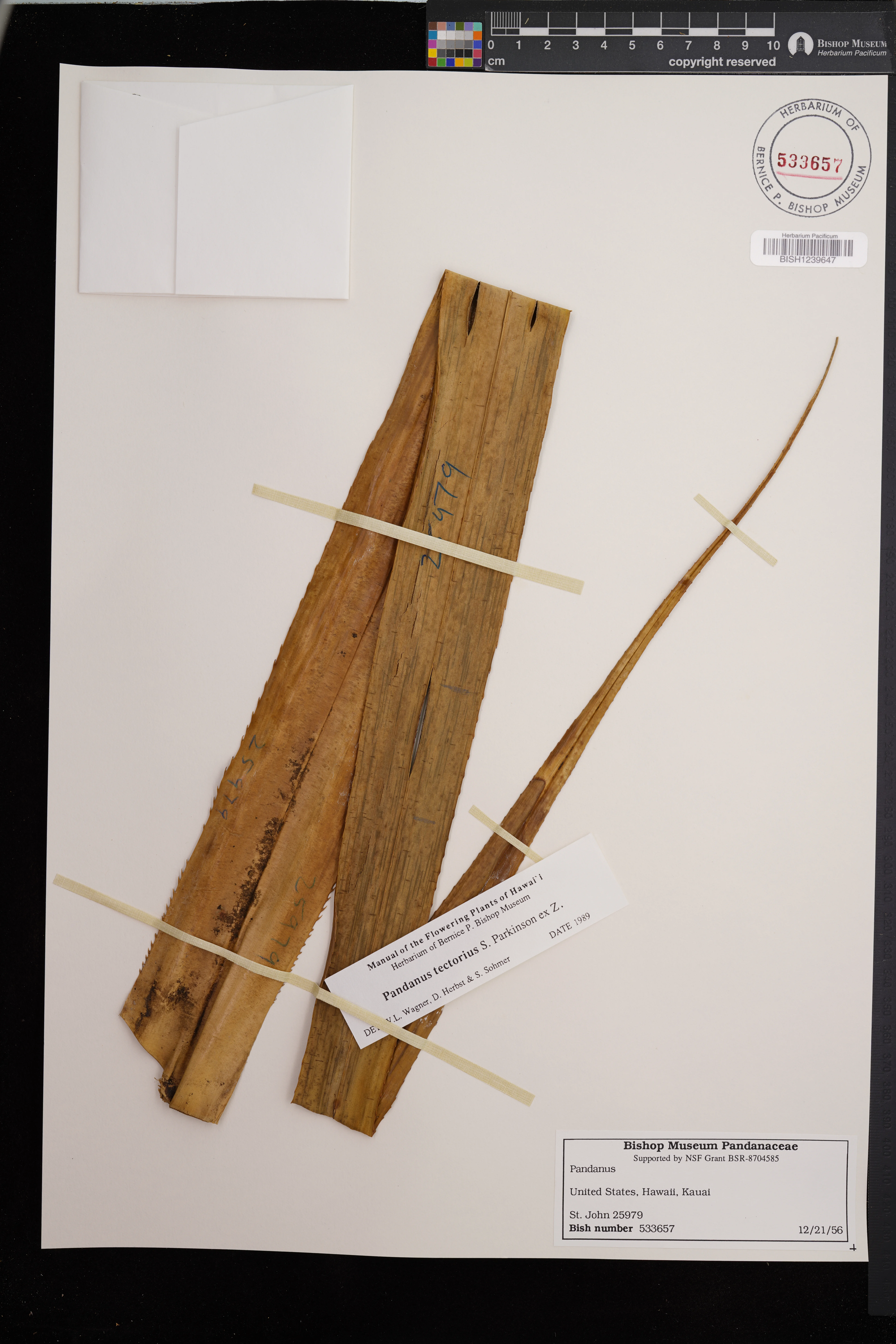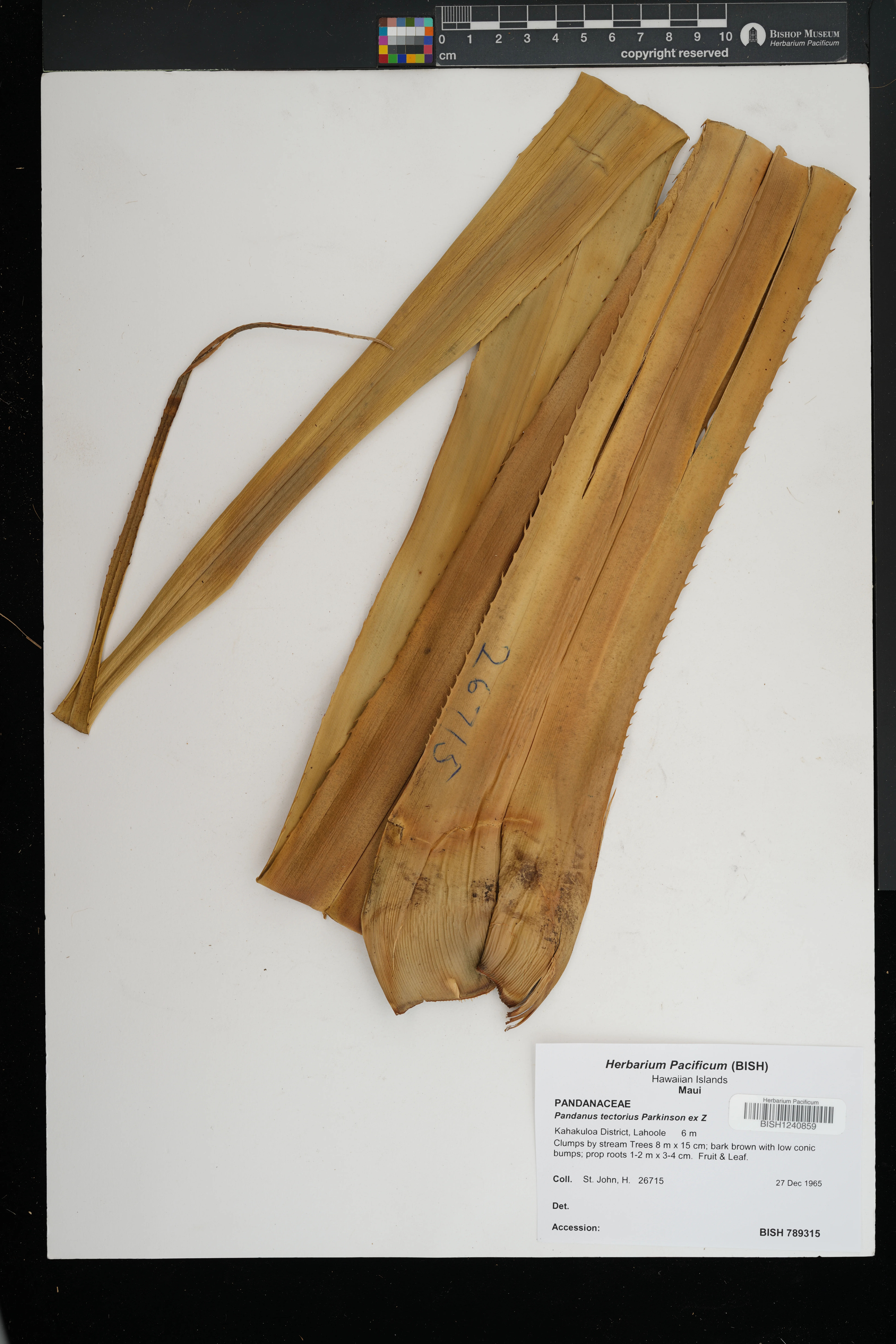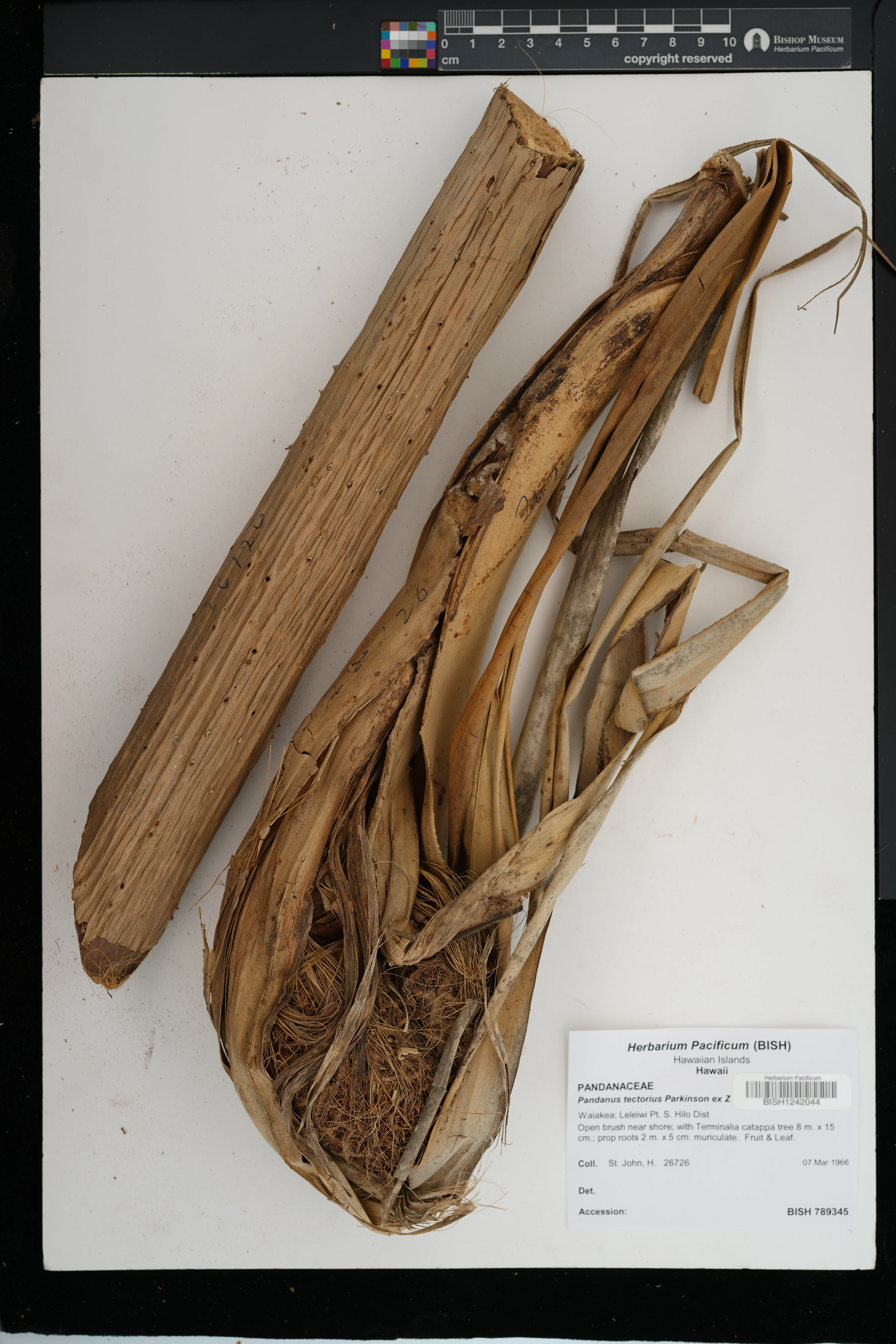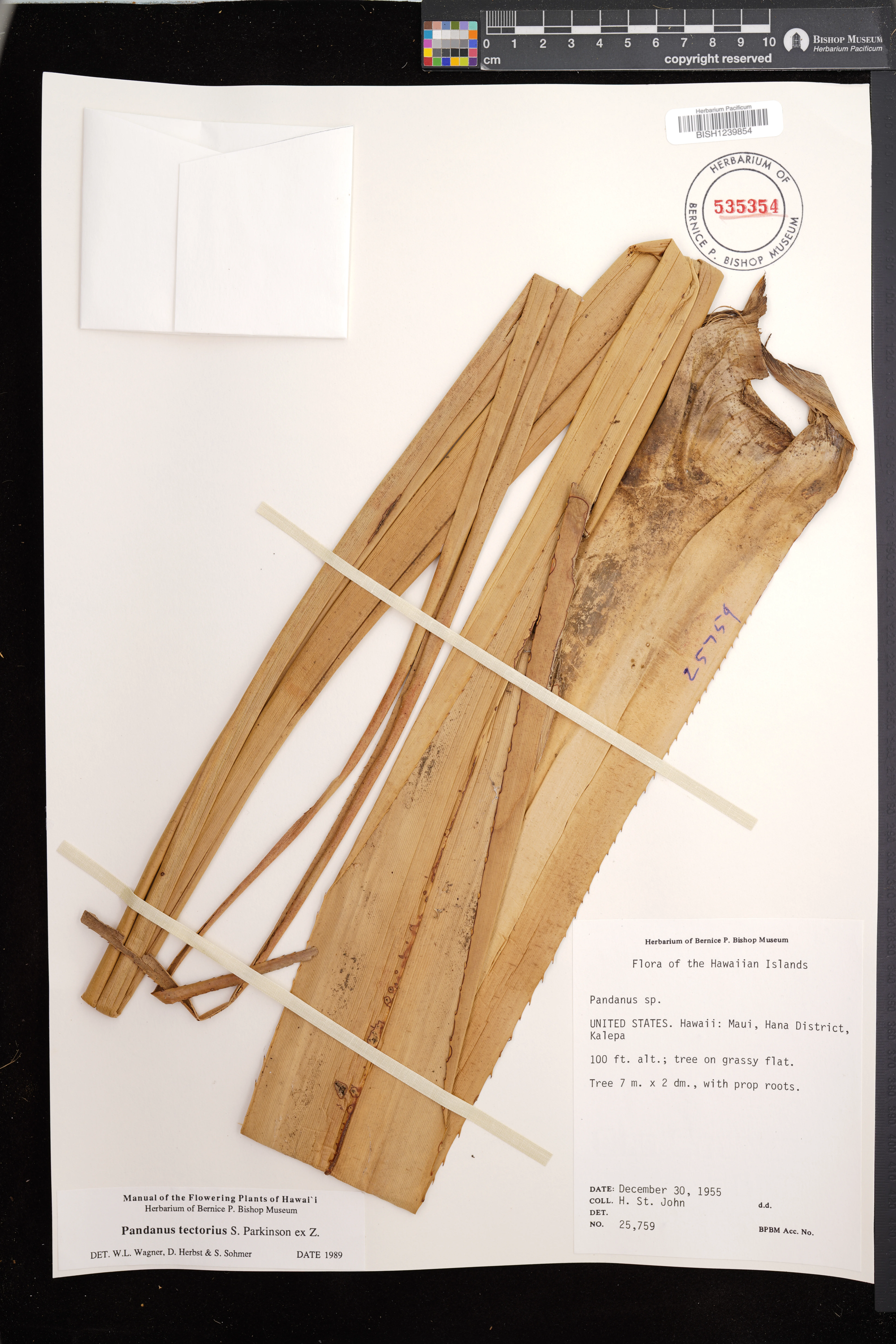 Tree about 20 ft. high; spreading about 20 ft.; shrubby; branching immediately where main aerial roots begin to radiate downward; brs. ending in large tufts of long lvs. which have wide white band down |