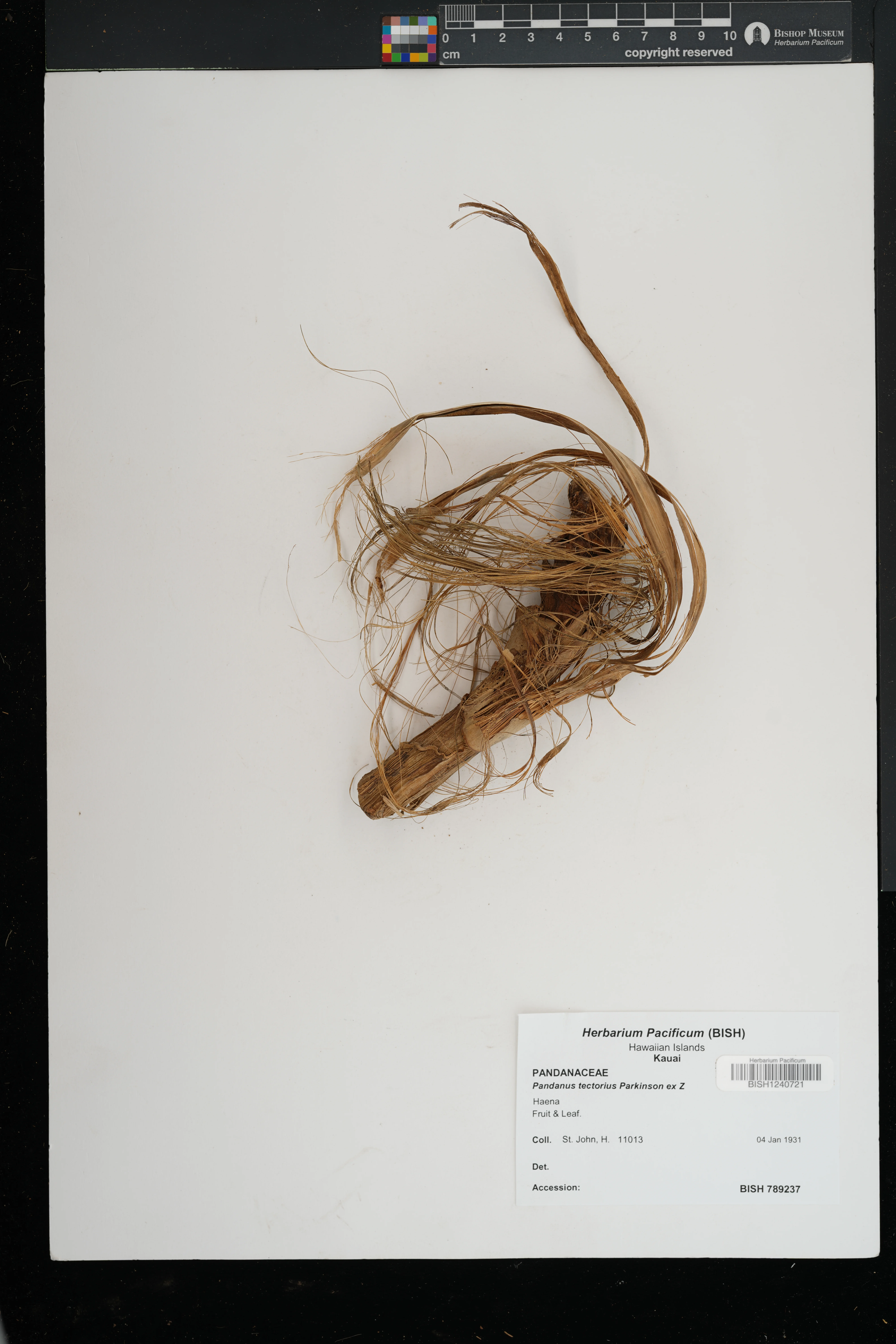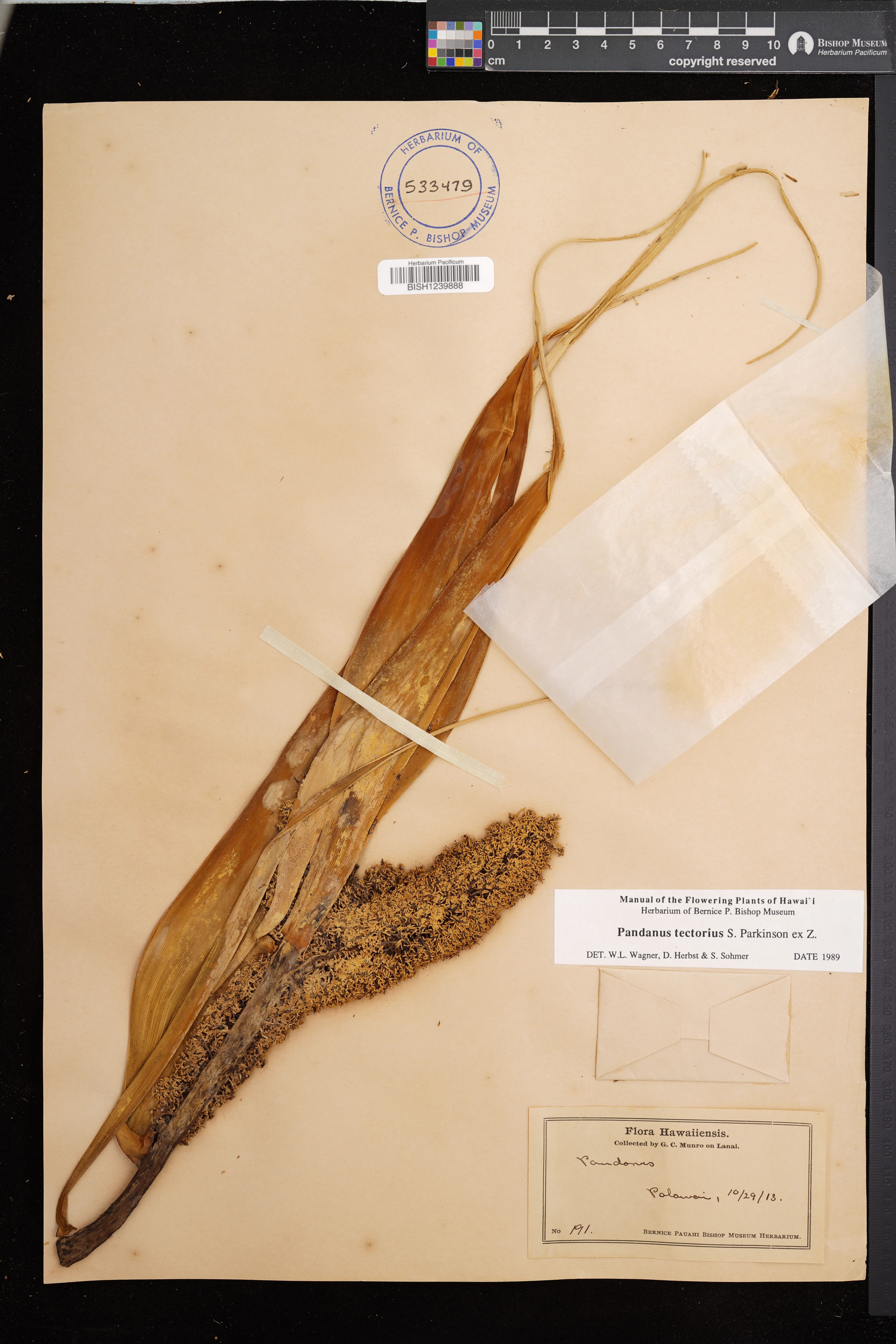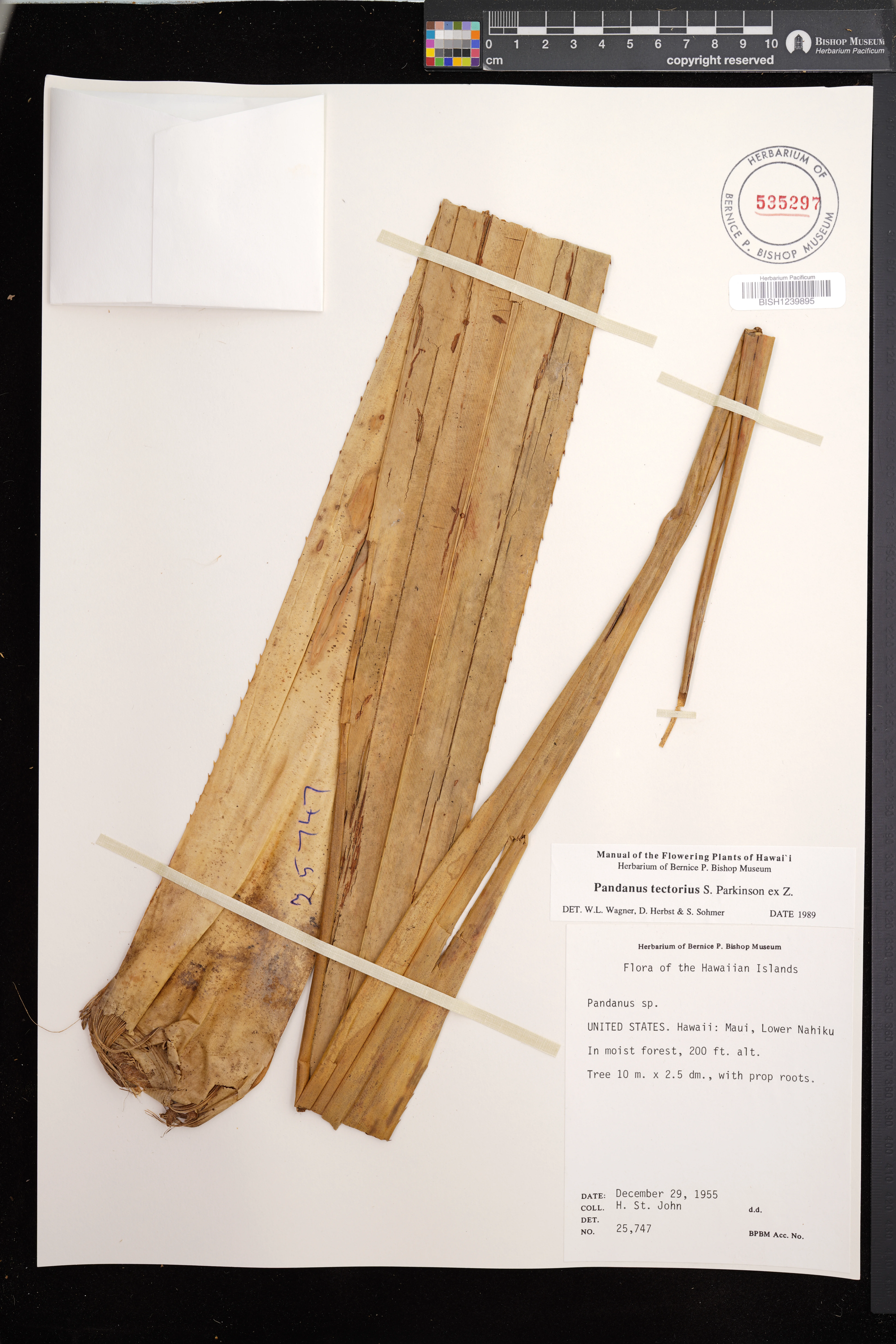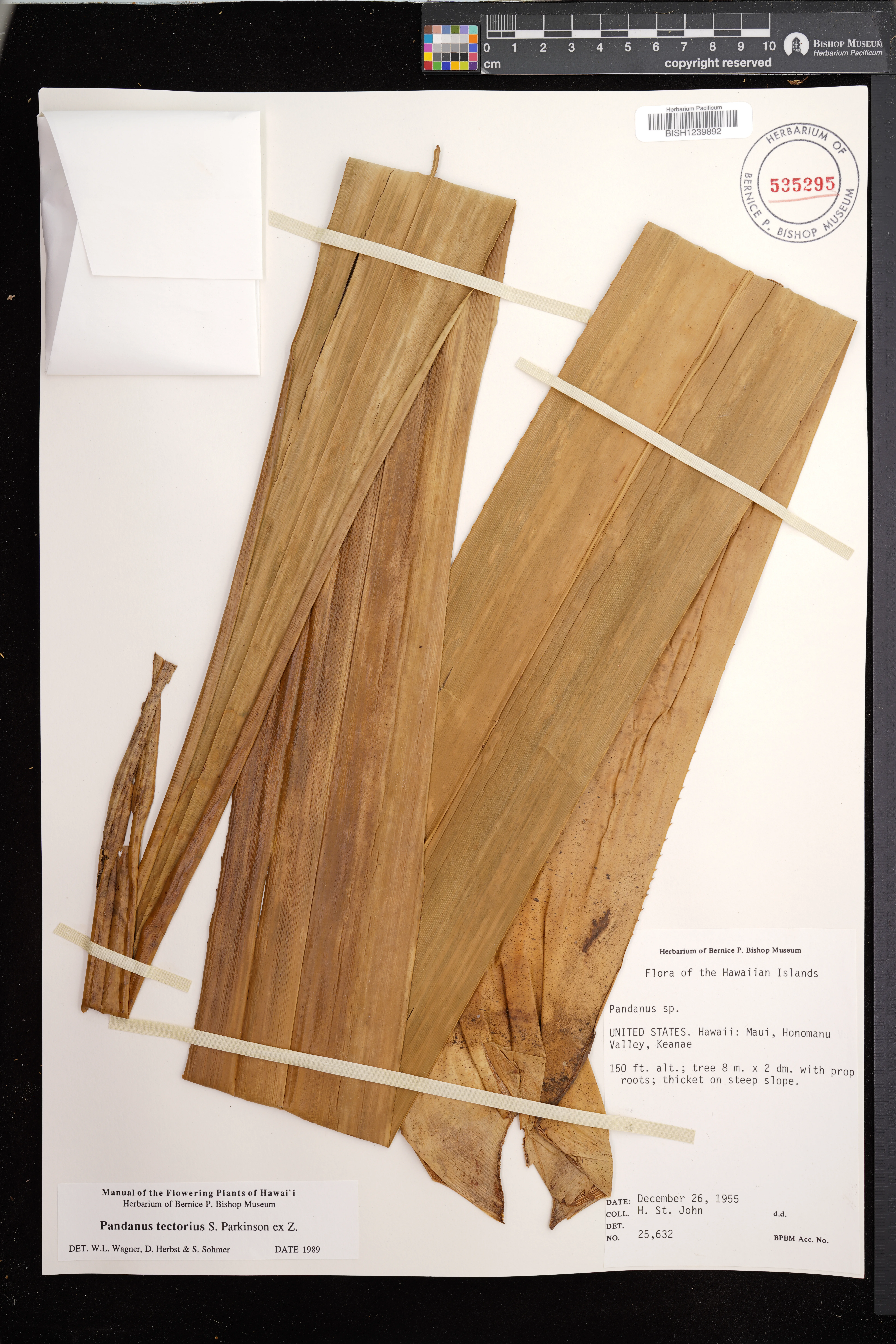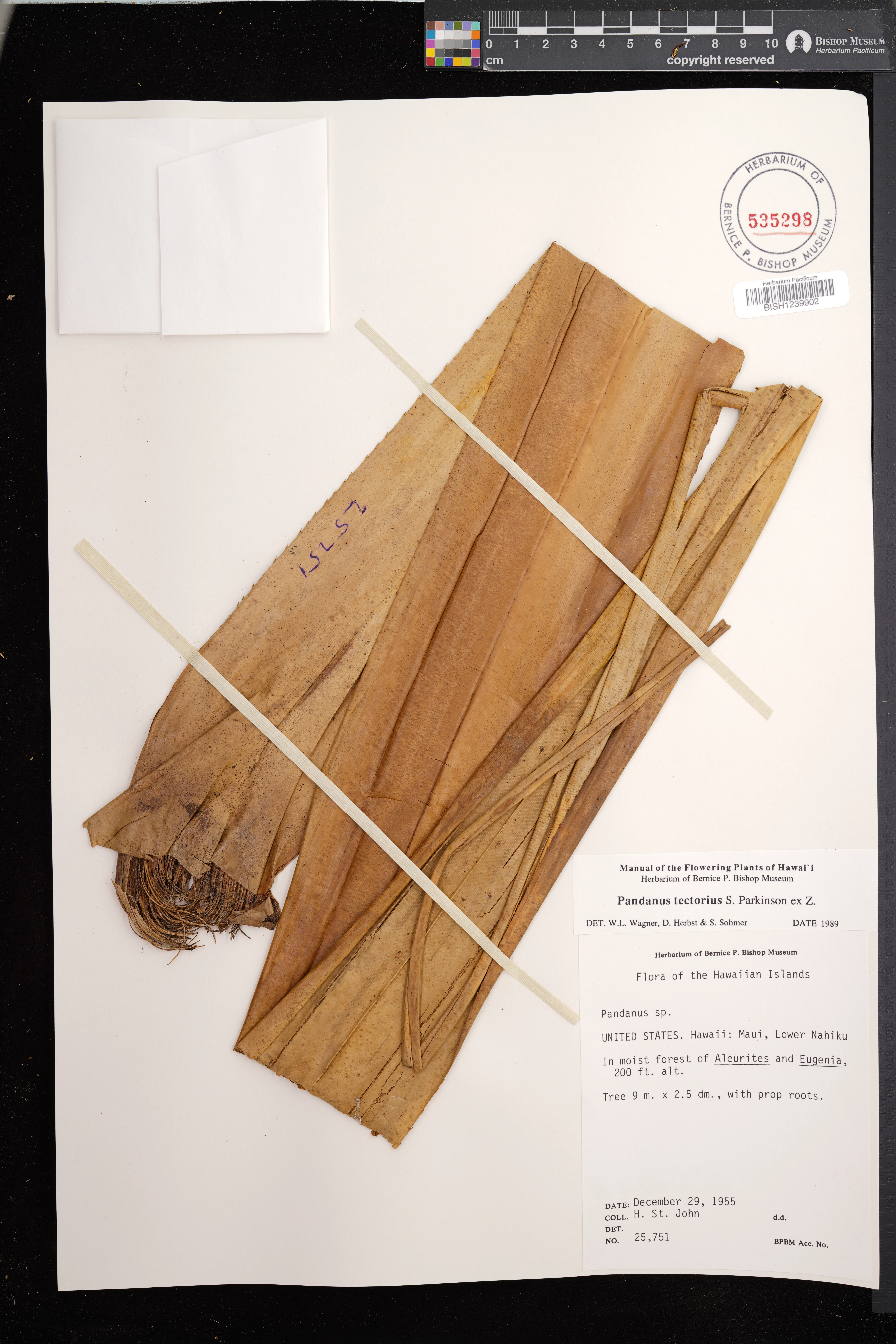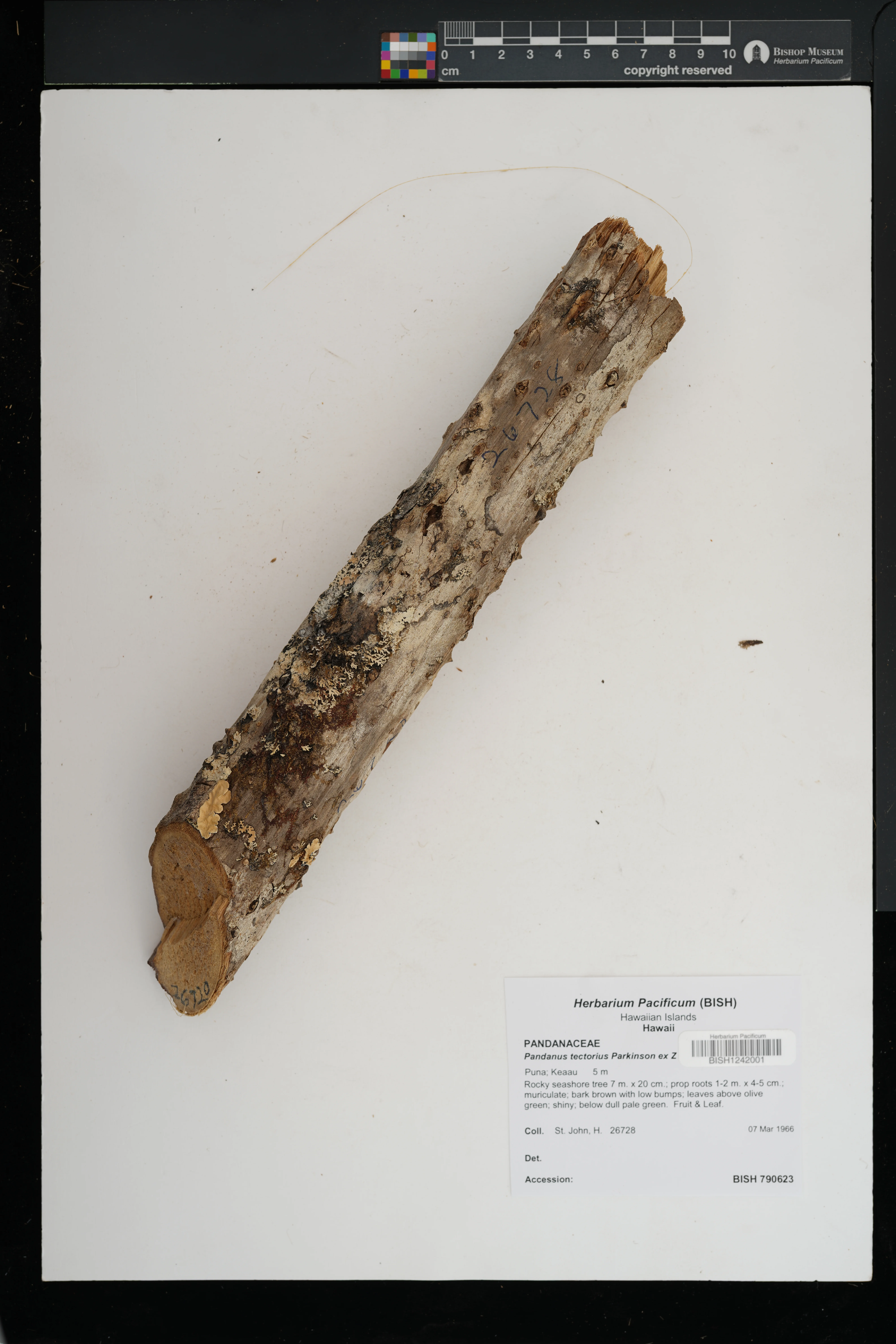 Tree about 20 ft. high; spreading about 20 ft.; shrubby; branching immediately where main aerial roots begin to radiate downward; brs. ending in large tufts of long lvs. which have wide white band down |