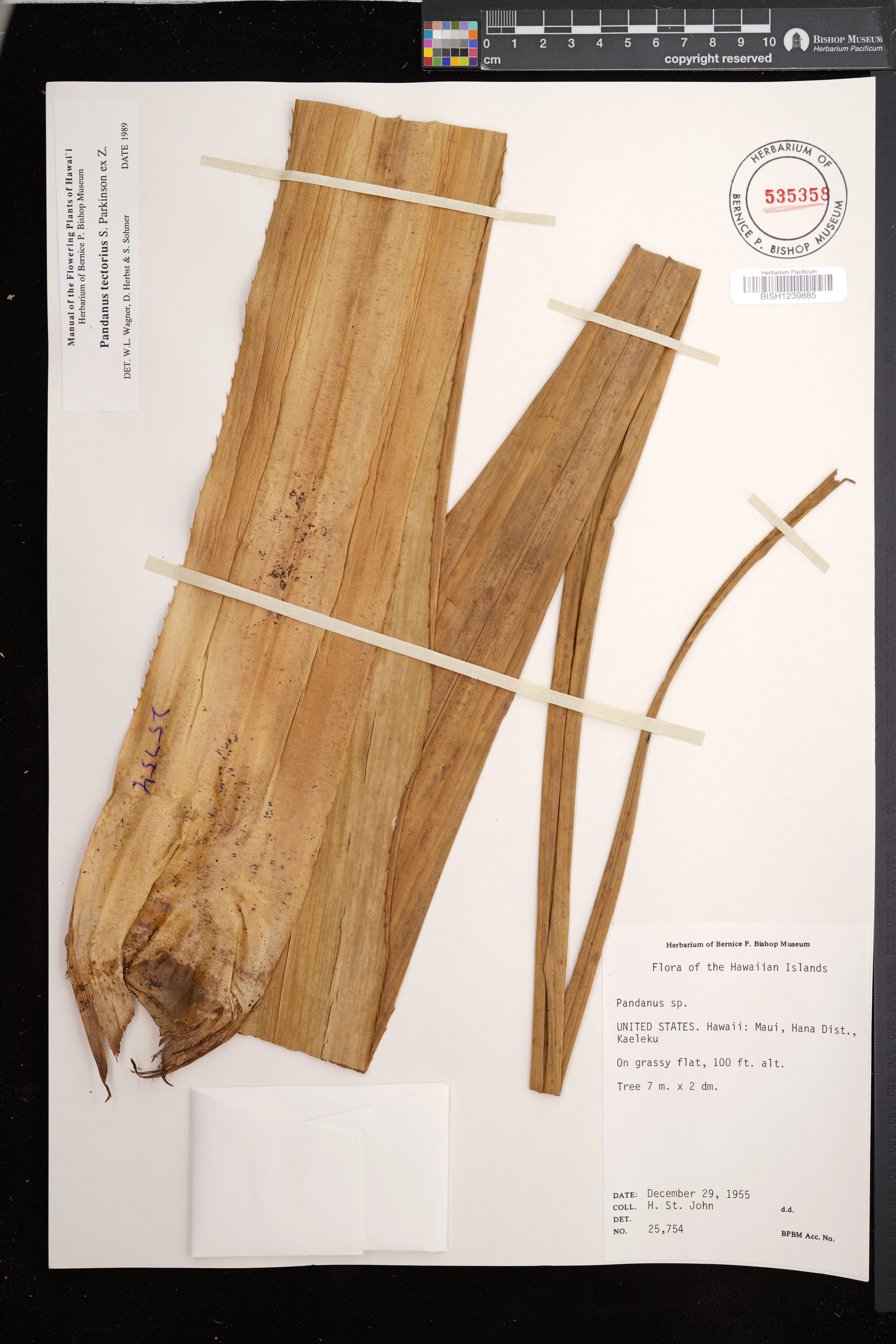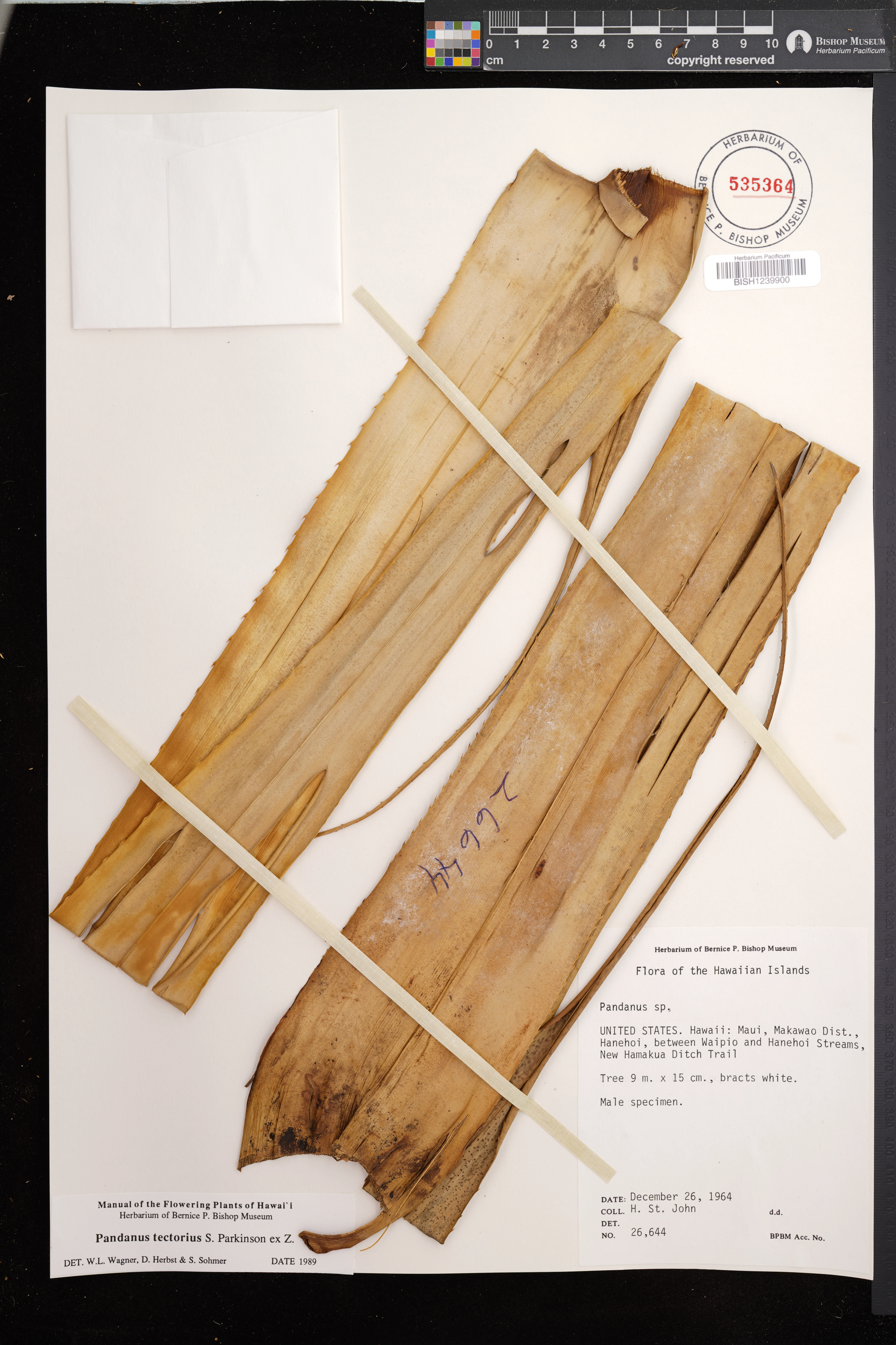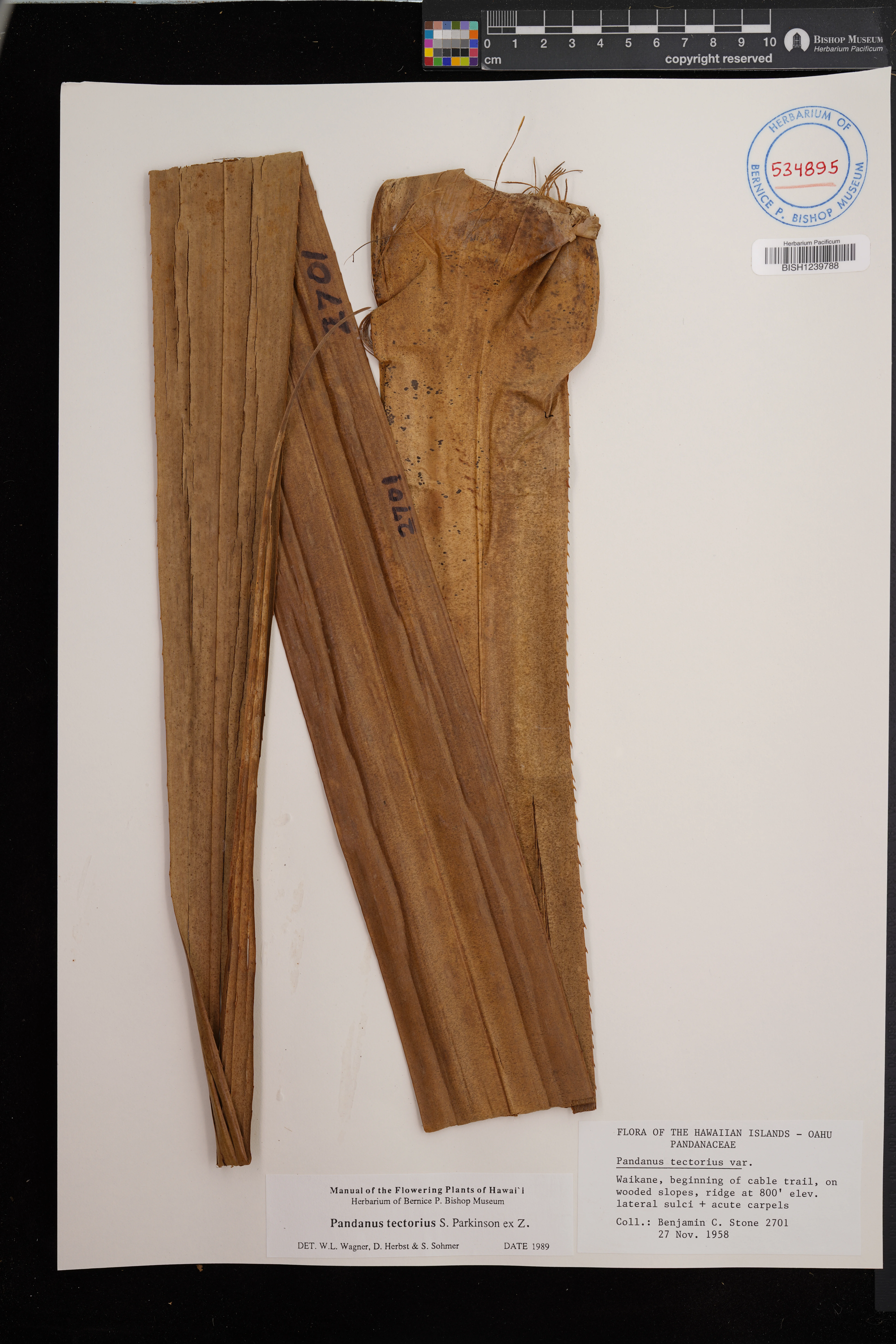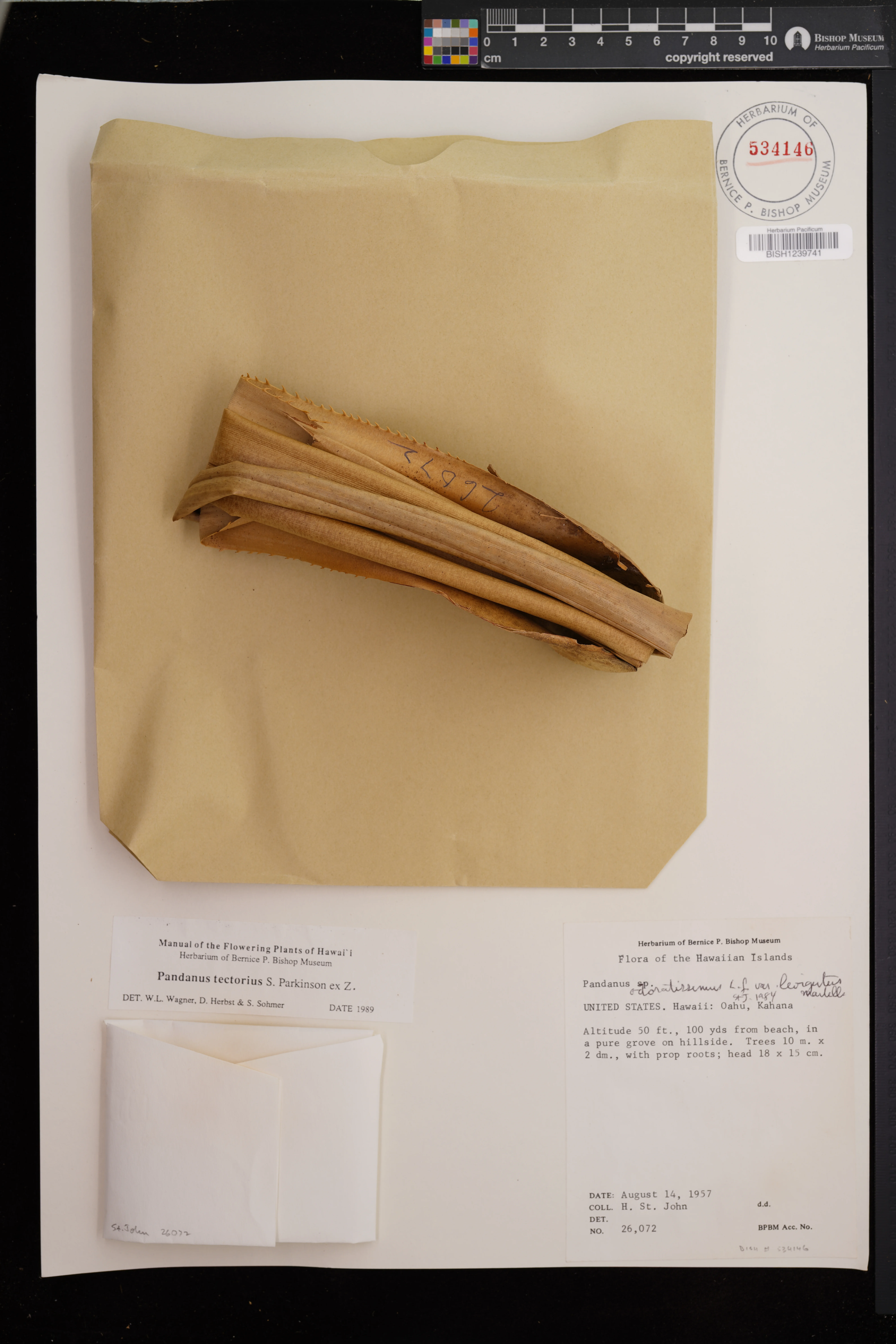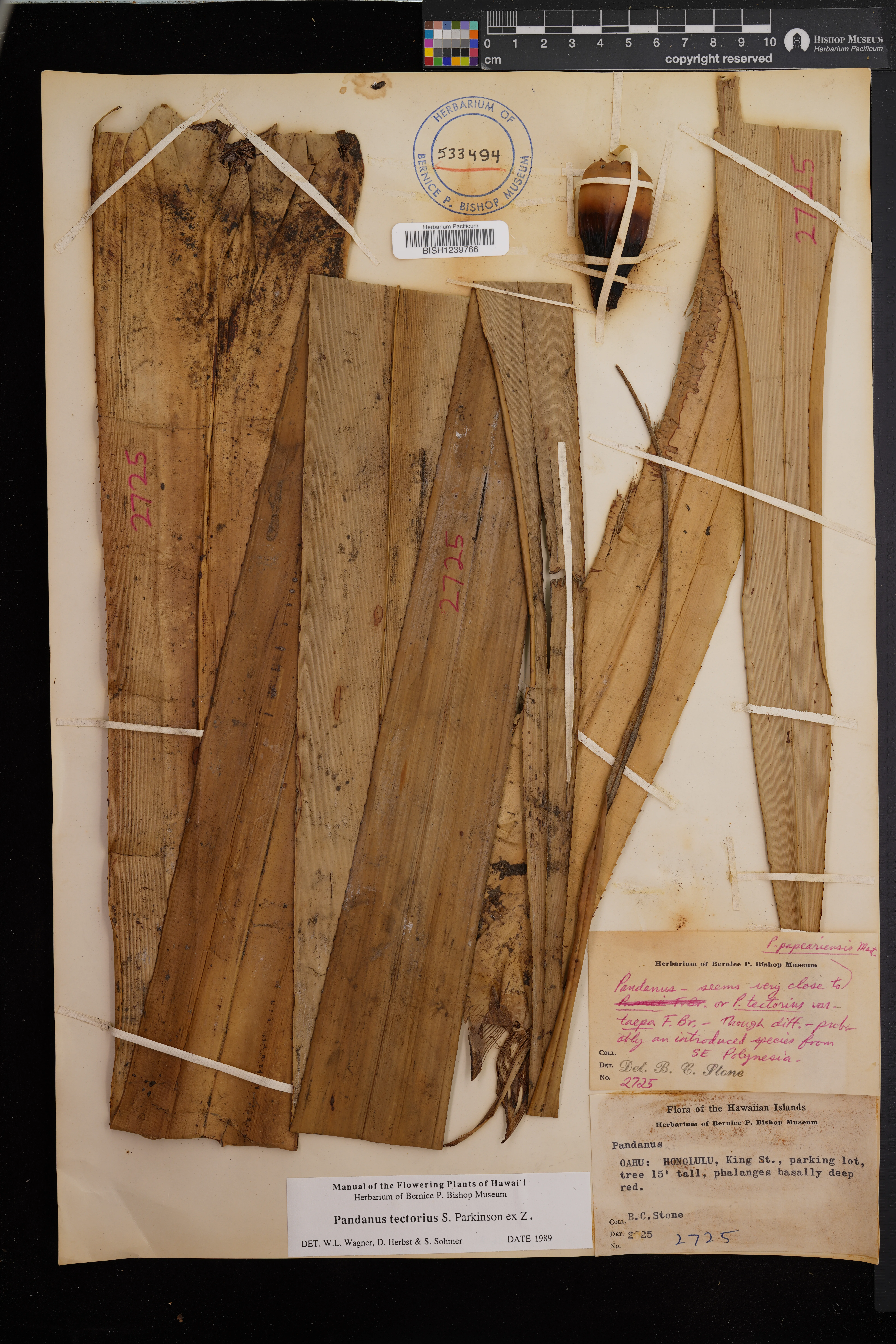 Tree about 20 ft. high; spreading about 20 ft.; shrubby; branching immediately where main aerial roots begin to radiate downward; brs. ending in large tufts of long lvs. which have wide white band down |