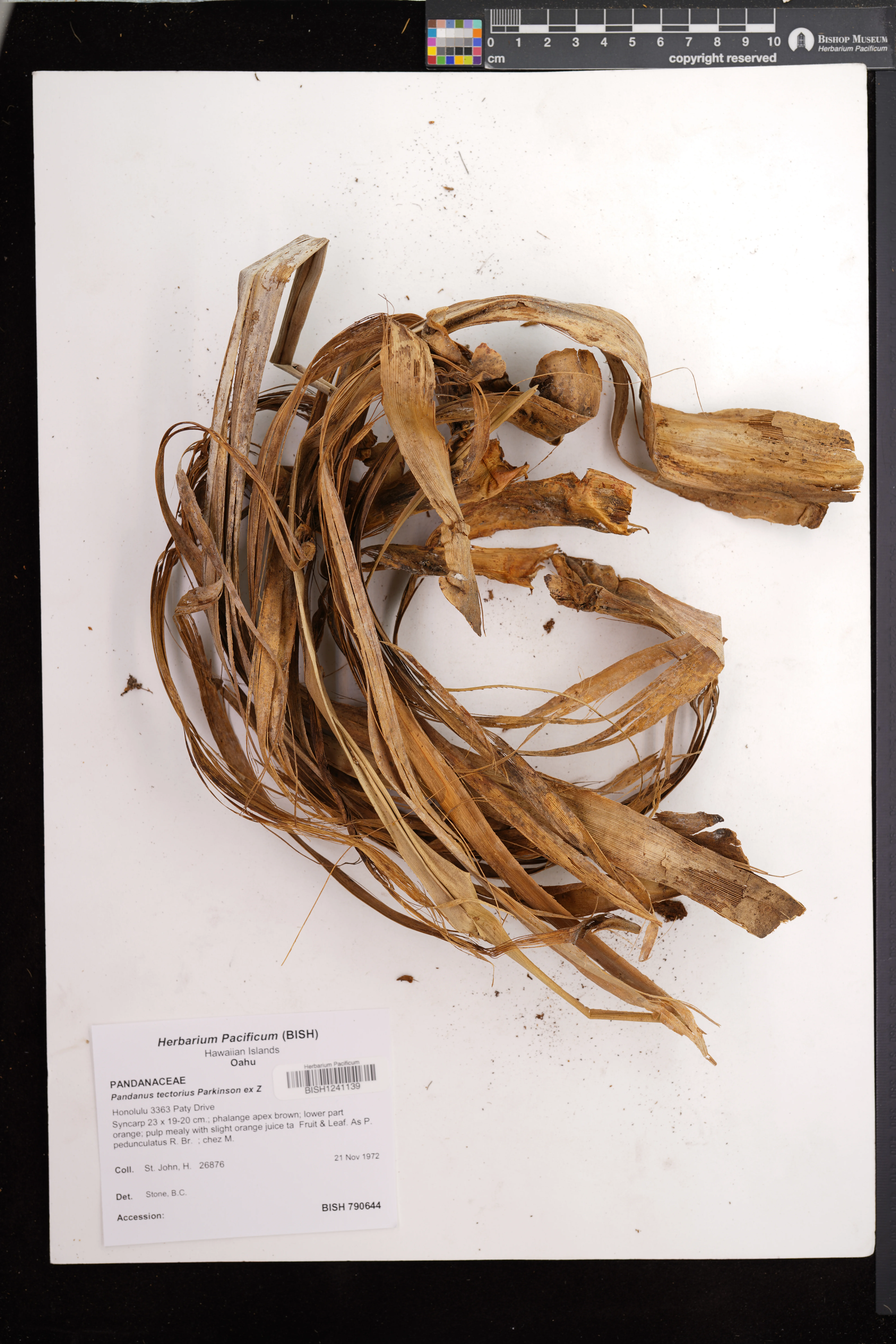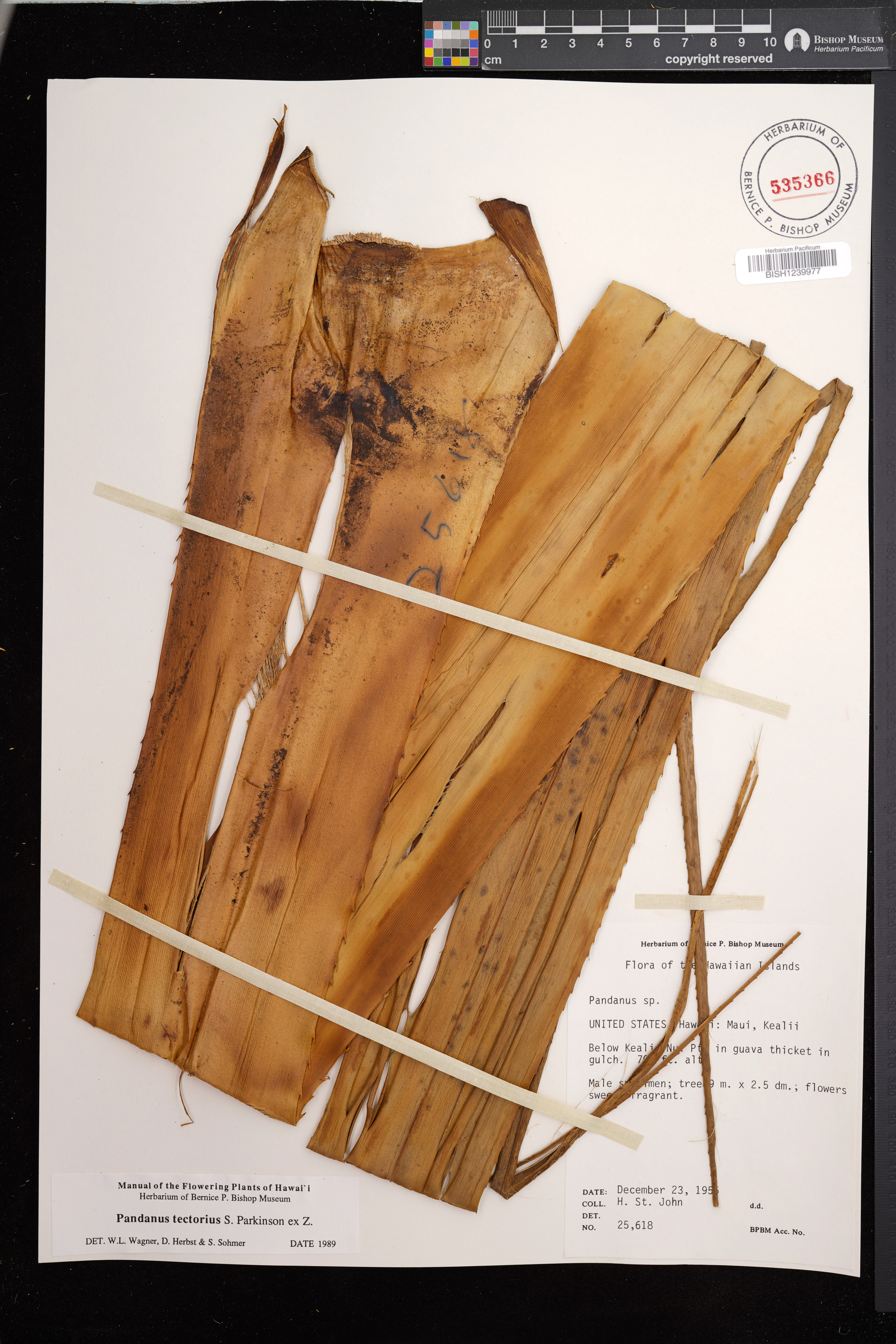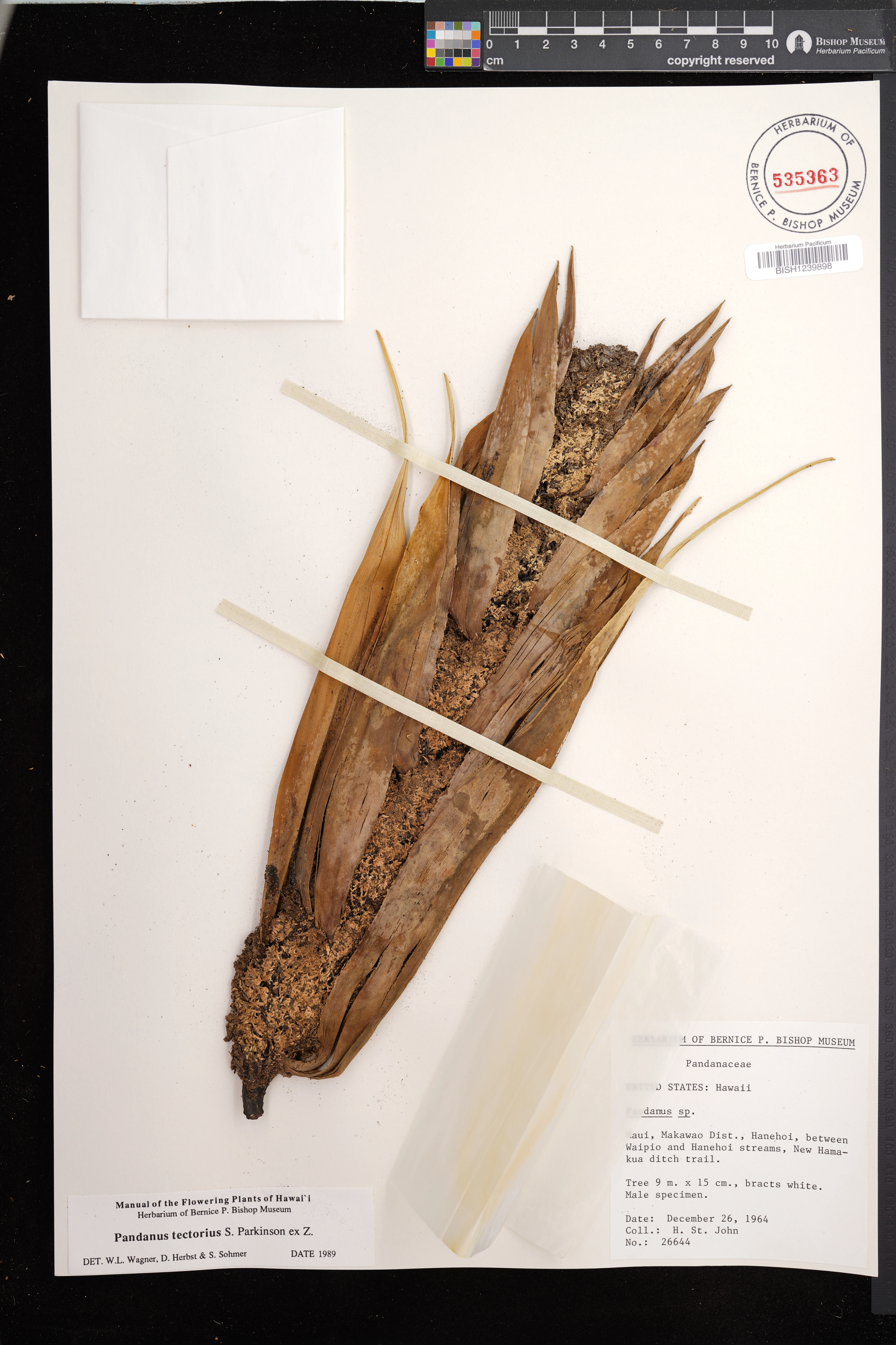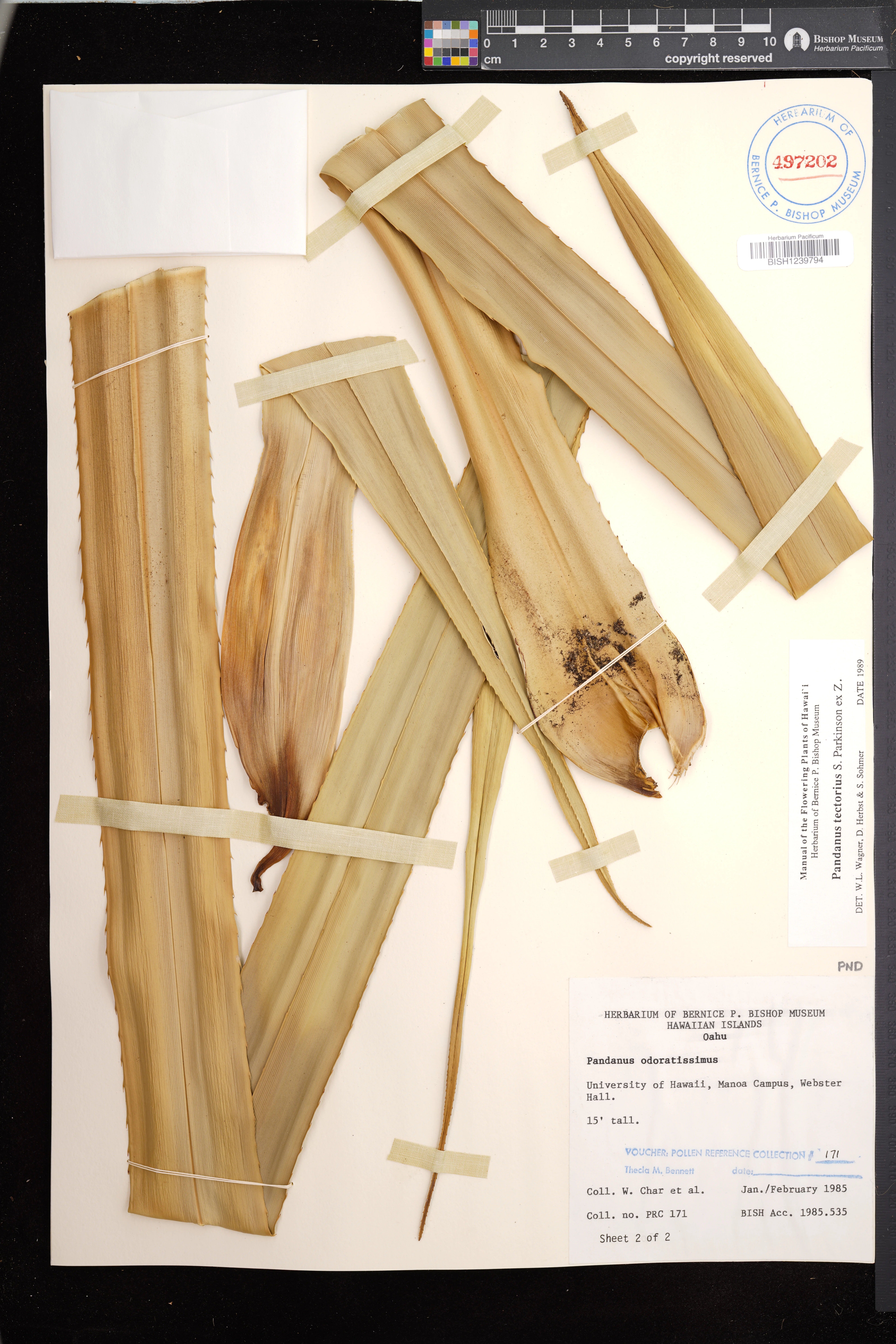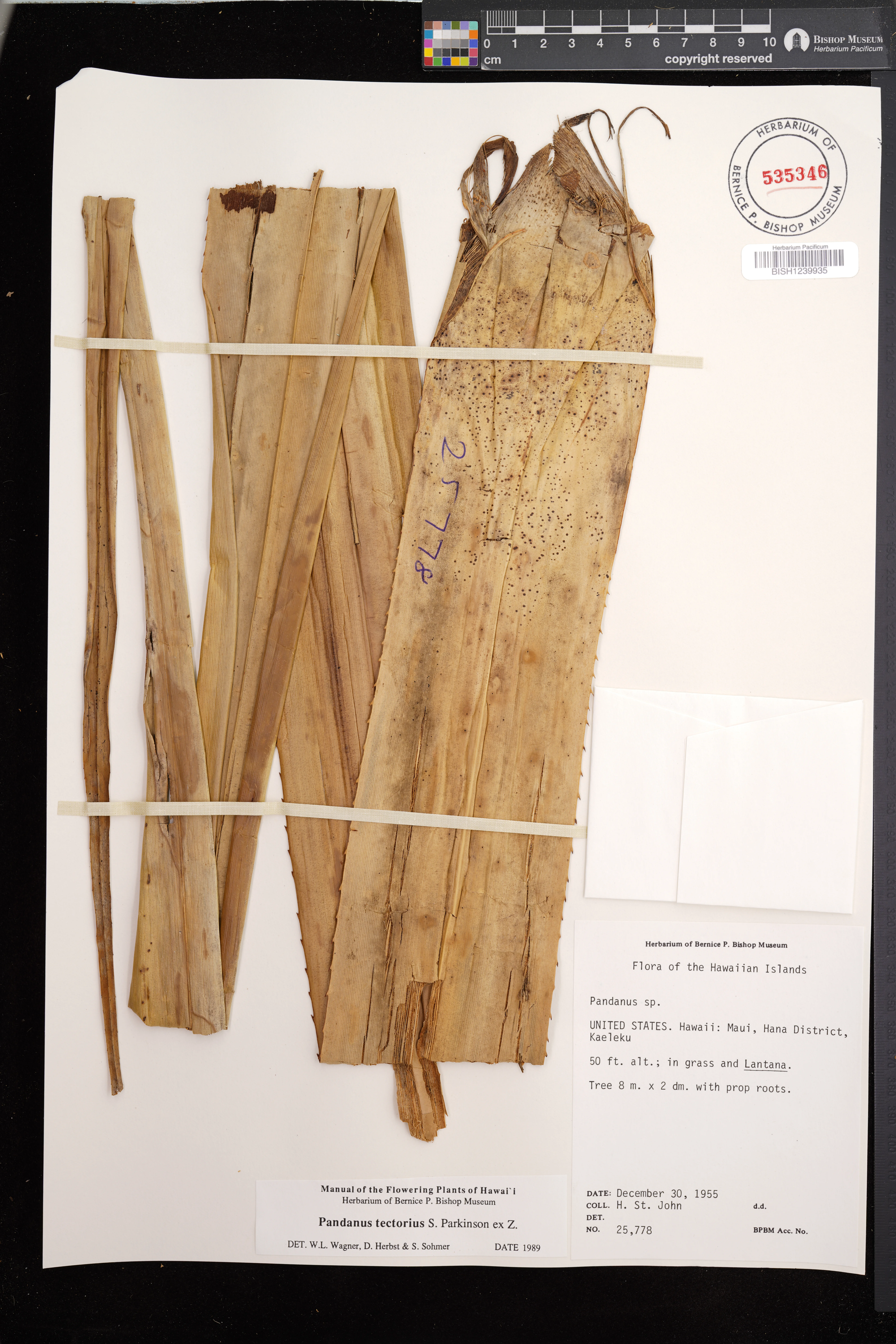 Tree about 20 ft. high; spreading about 20 ft.; shrubby; branching immediately where main aerial roots begin to radiate downward; brs. ending in large tufts of long lvs. which have wide white band down |
