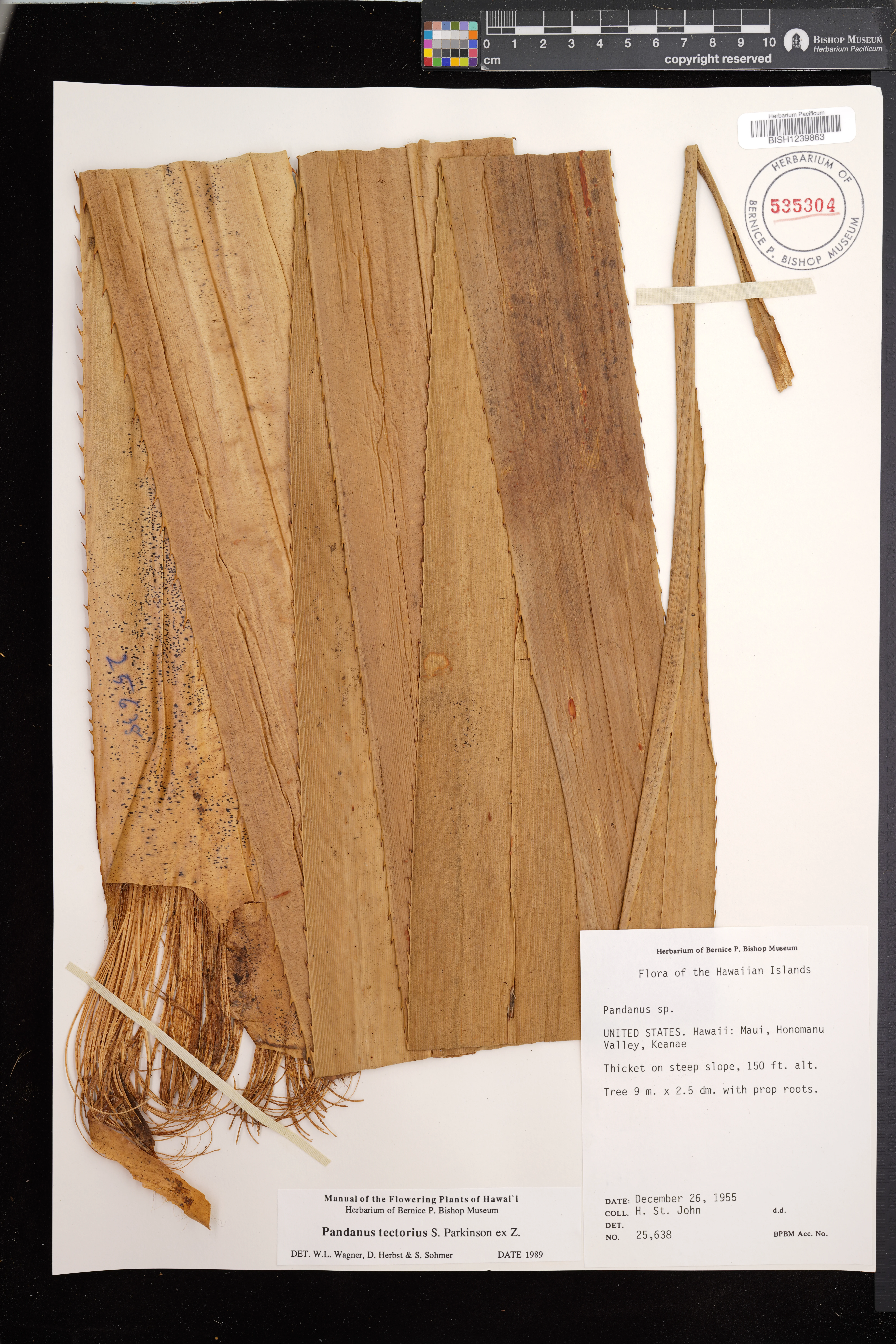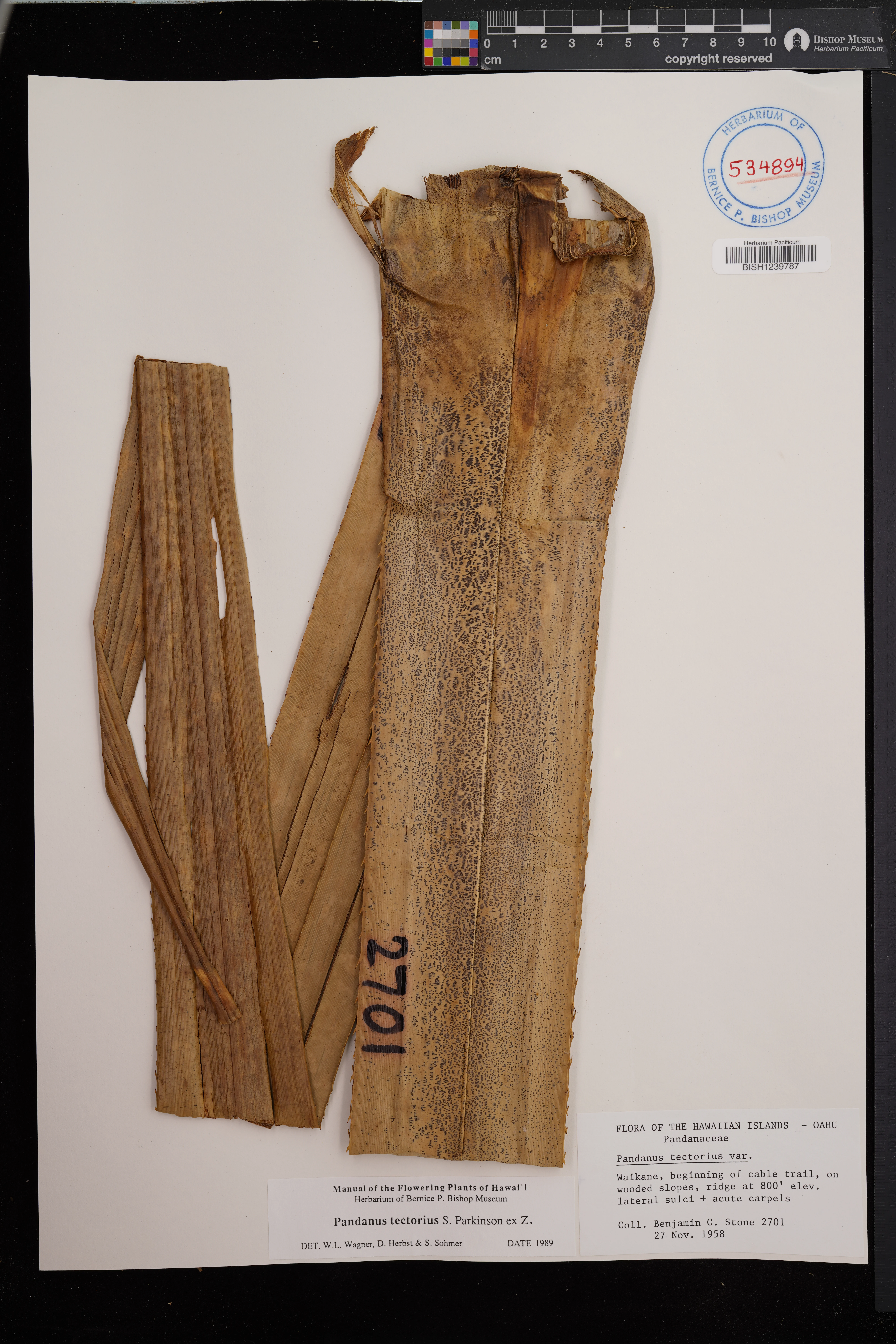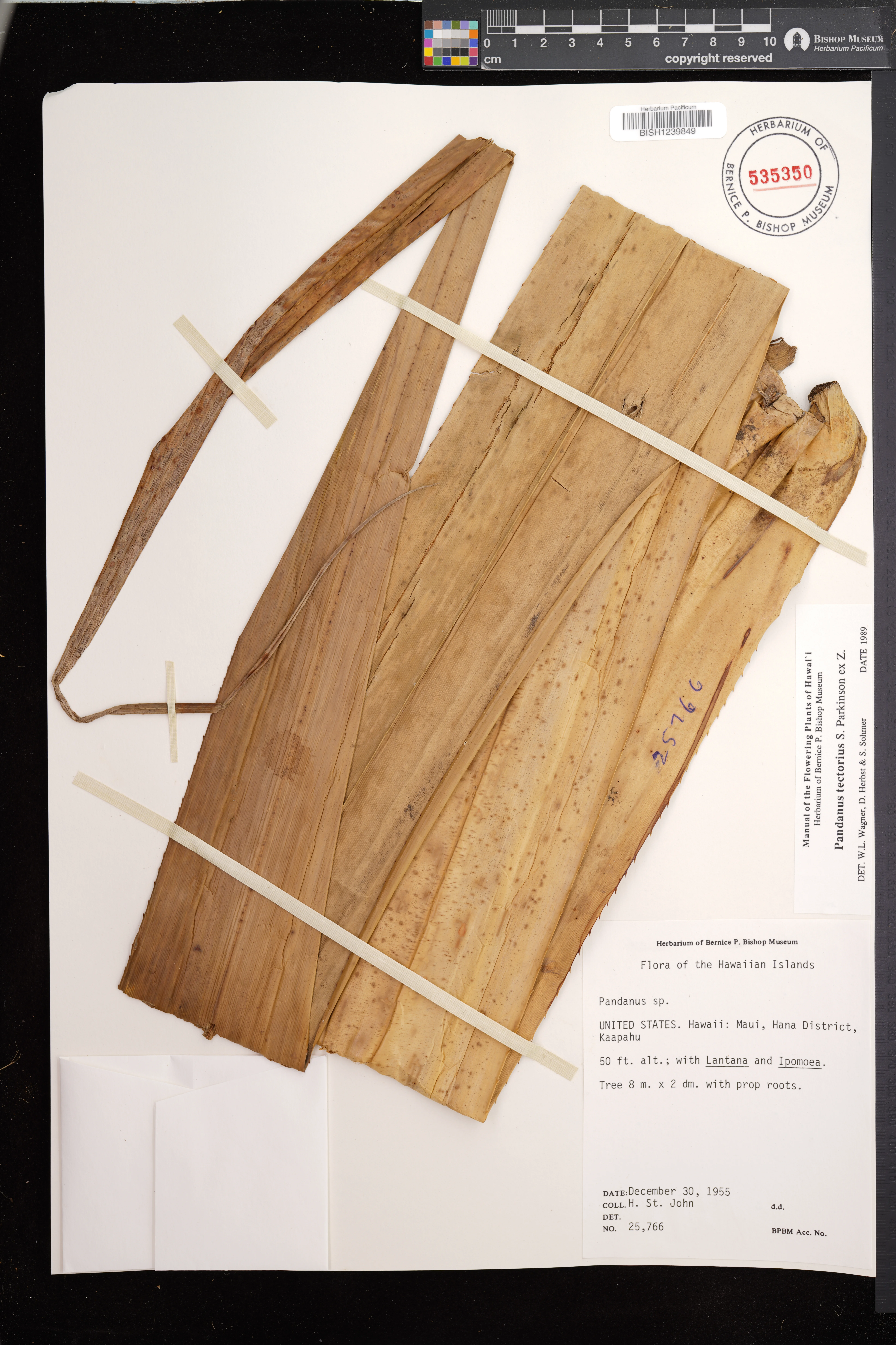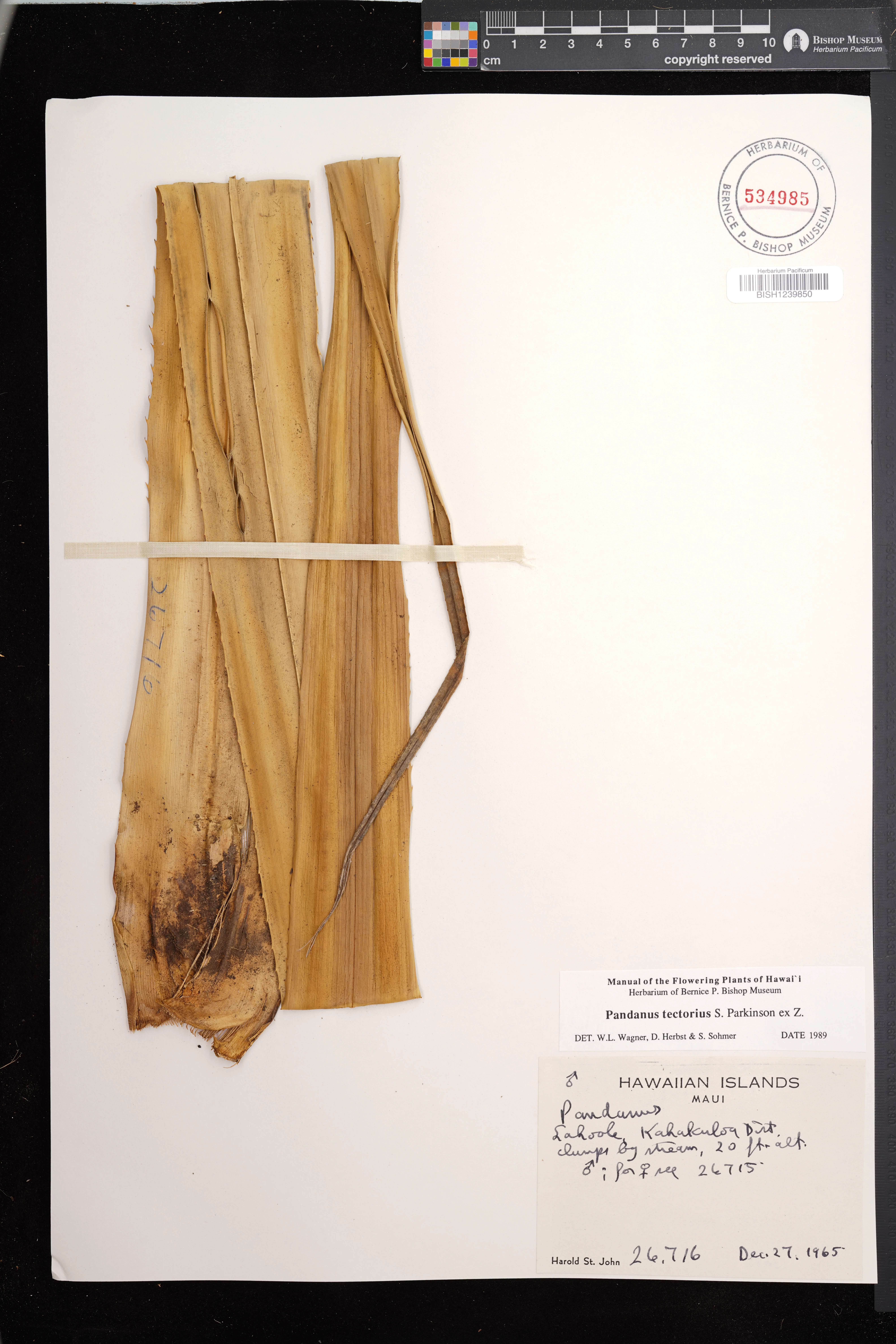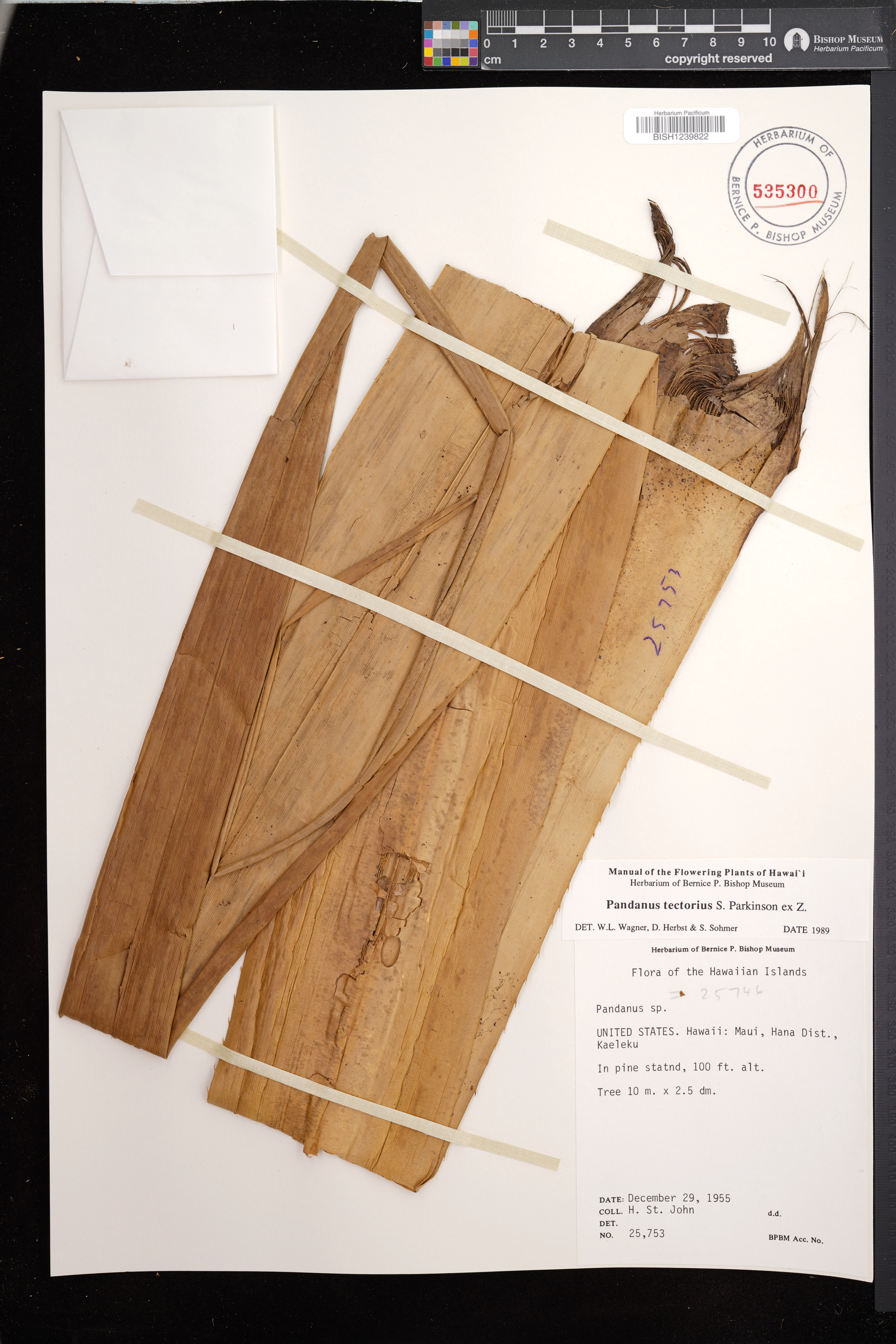 Tree about 20 ft. high; spreading about 20 ft.; shrubby; branching immediately where main aerial roots begin to radiate downward; brs. ending in large tufts of long lvs. which have wide white band down |